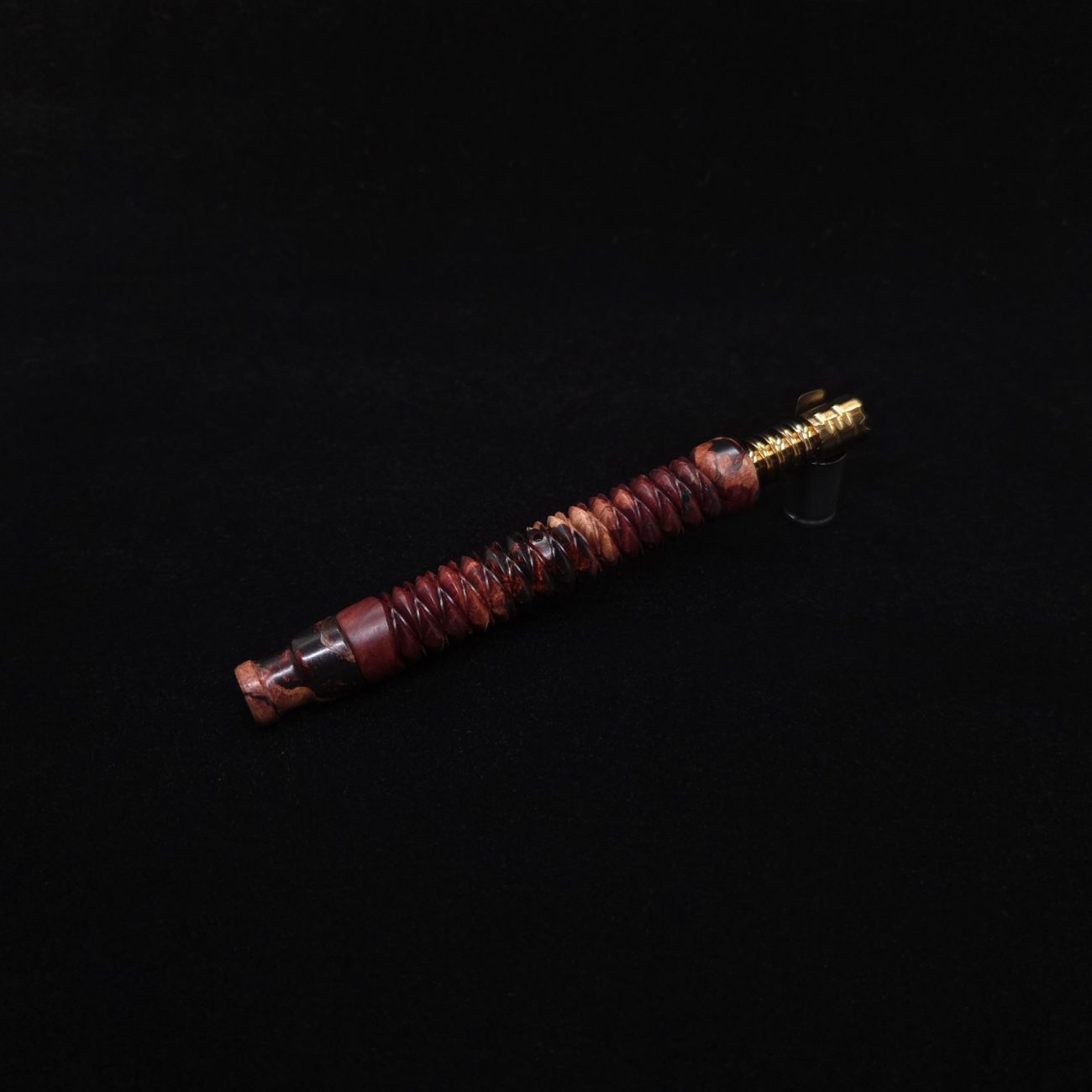 High quality manzanita burl wood hybrid XL length stem for Dynavap components. Along with a book-matched mouthpiece. The hybrid coloring on this stem is done in a molten lava theme with metallic fire and metallic blacks. This is a specialty stem with a 14mm taper on the mouthpiece end with a 3D spiral weave design cut into the main portion of the stem. All of our stems function with or without mouthpiece attached. Stem has been finished with a semi-gloss finish polishing which is all natural.