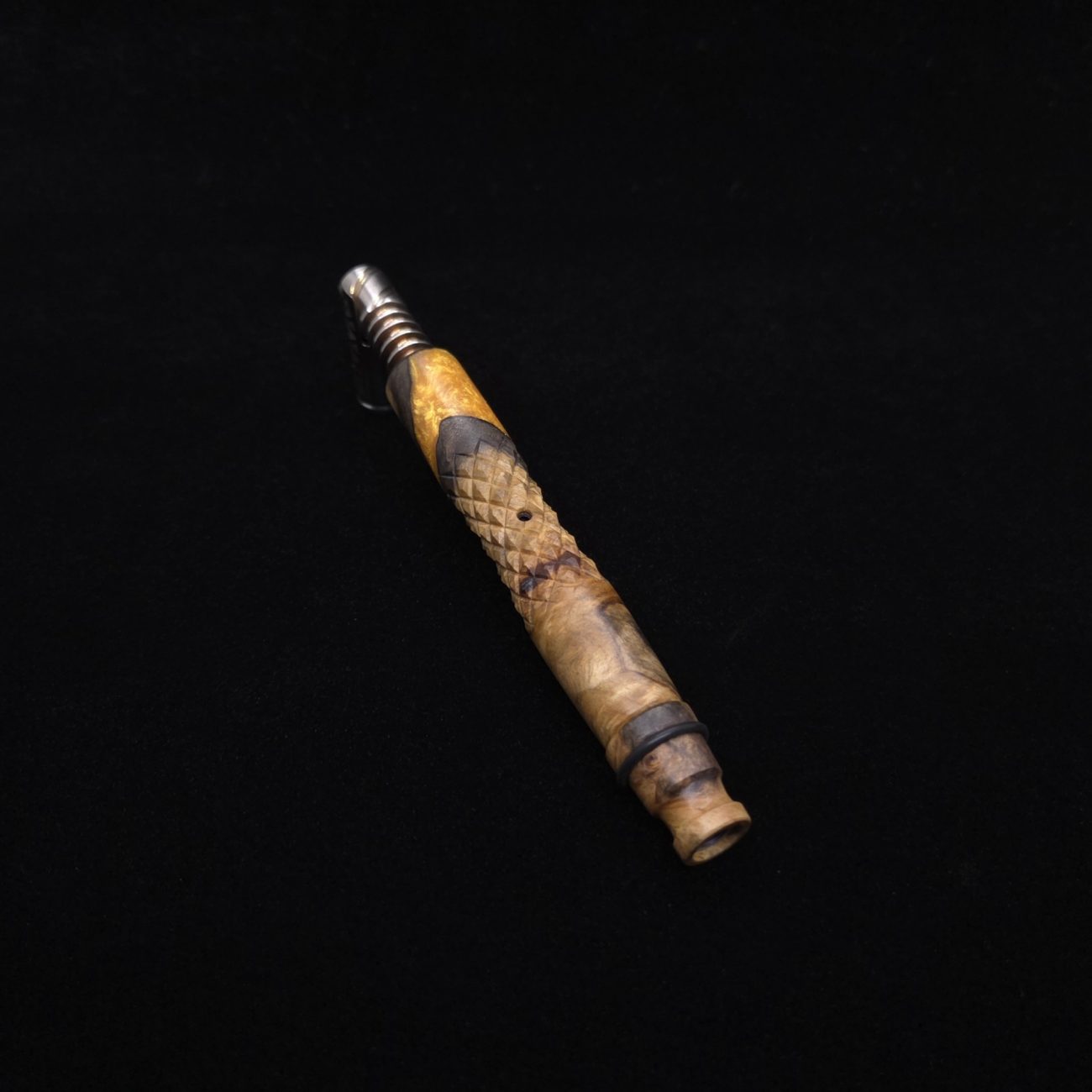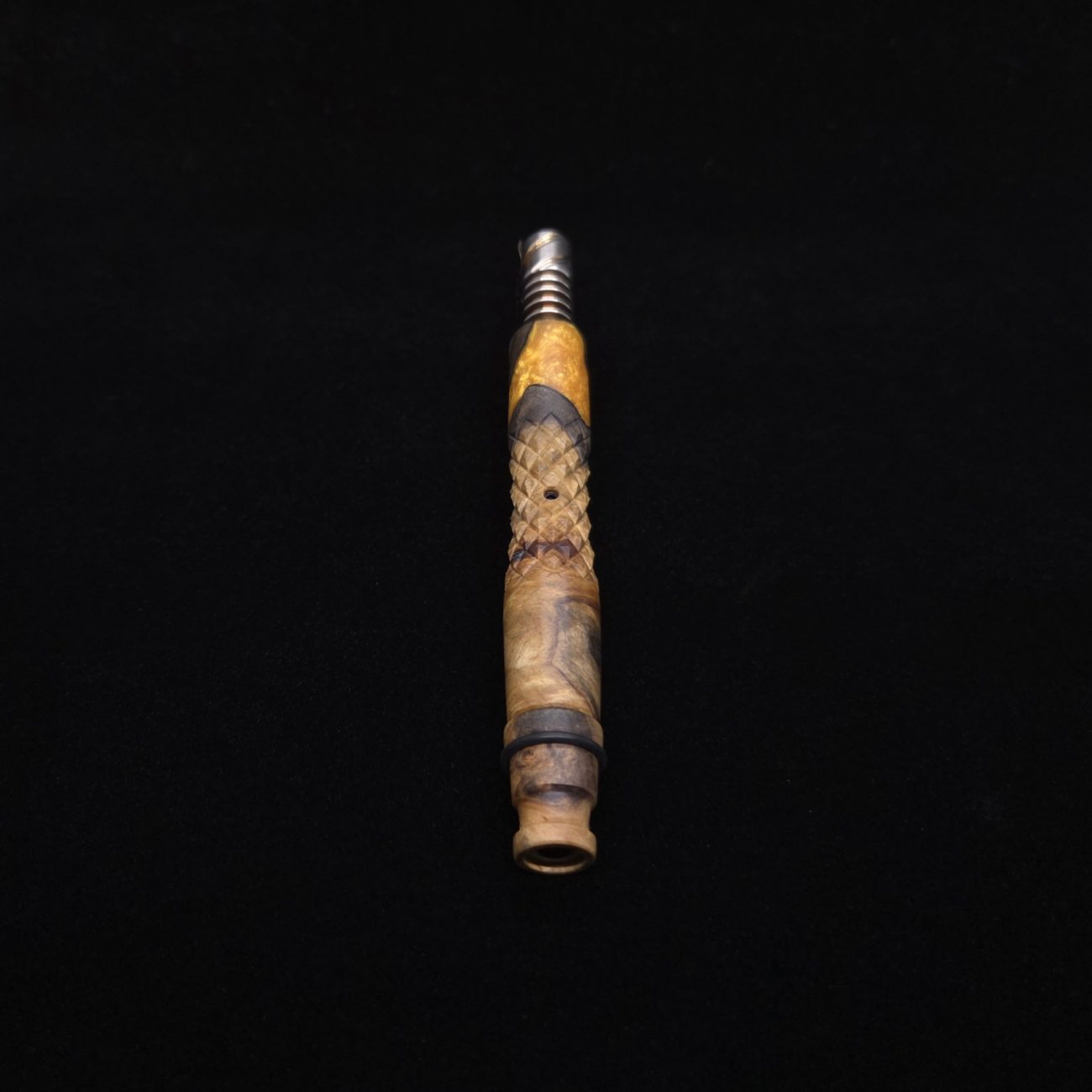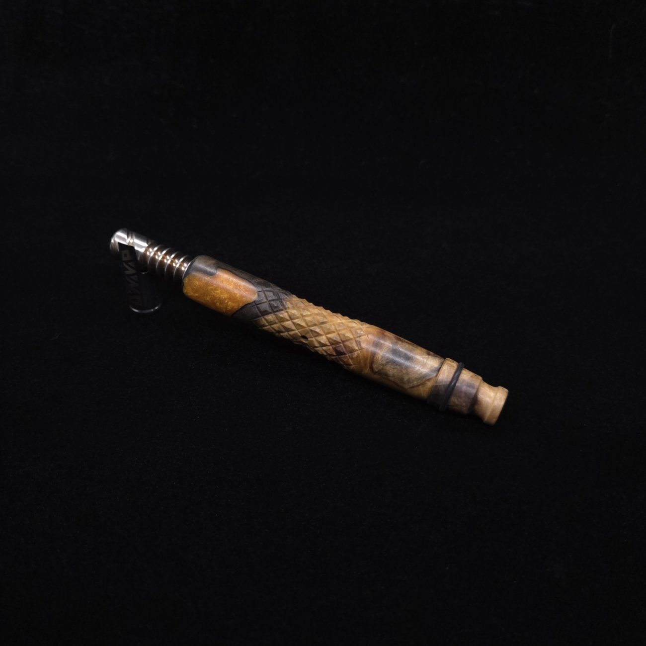 High quality buckeye burl wood hybrid XL length stem for Dynavap components. Along with a book-matched mouthpiece that can allow stem to be used on the fly with any 14mm water pipe. Burl wood has natural coloring with the hybrid section in metallic gold. This stem design has a concave middle section with 3D diamonds cut into the curvature. It has centered air-port to allow for tactile air-port locating within the diamond section. All of our stems function with or without mouthpiece attached. Stem has been finished with a satin finish polishing which is all natural. Comes with set of (2) high-temp tip o-rings and (2) wpa mouthpiece o-rings.
