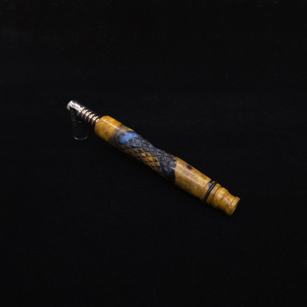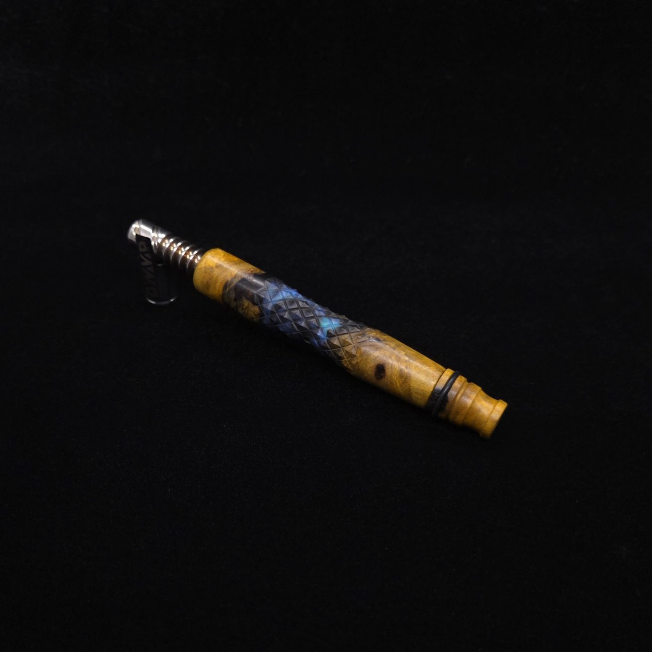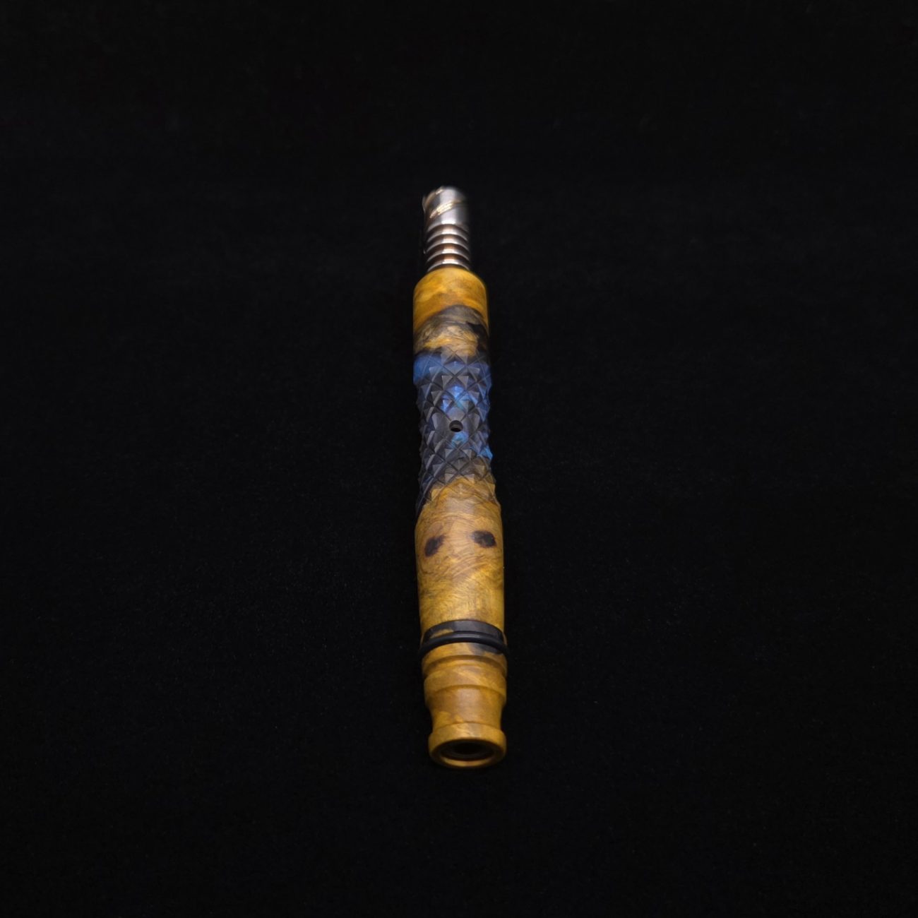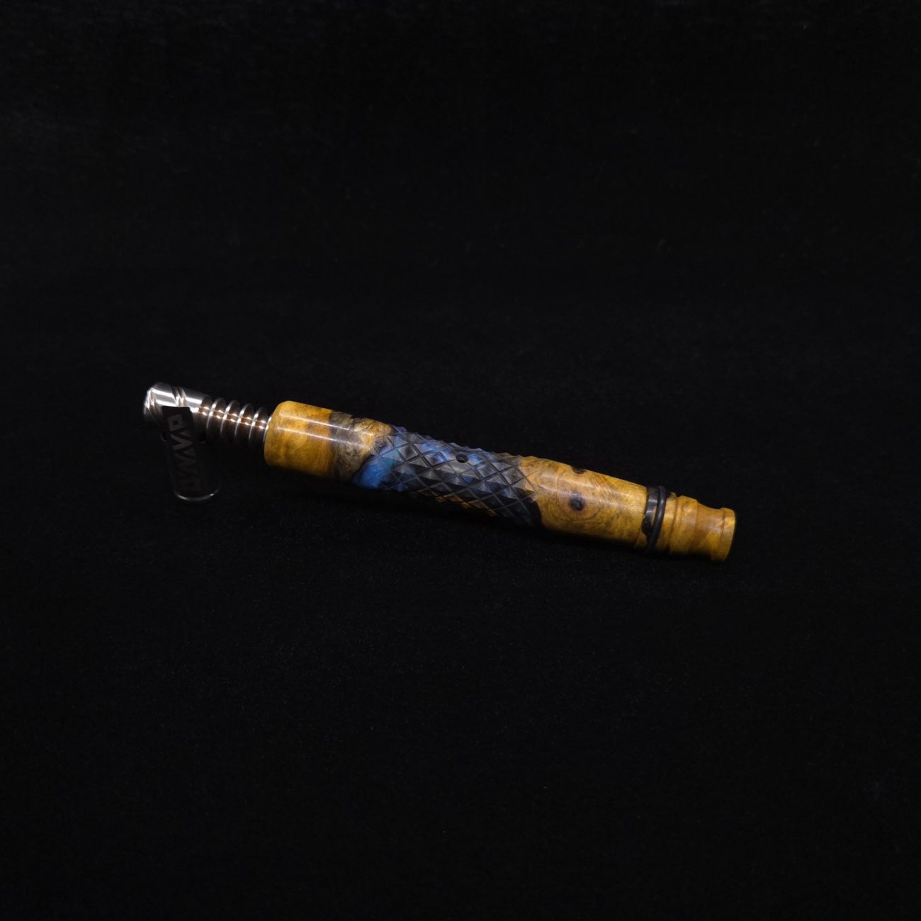 High quality buckeye burl wood hybrid XL length stem for Dynavap components. Along with a book-matched mouthpiece that can allow stem to be used on the fly with any 14mm water pipe. Burl wood has natural coloring and dyed olive green with the hybrid sections in metallic cosmic blue and black. This stem design has a concave middle section with 3D diamonds cut into the curvature. It has centered air-port to allow for tactile air-port locating within the diamond section. All of our stems function with or without mouthpiece attached. Stem has been finished with a satin finish polishing which is all natural. Comes with set of (2) high-temp tip o-rings and (2) wpa mouthpiece o-rings.