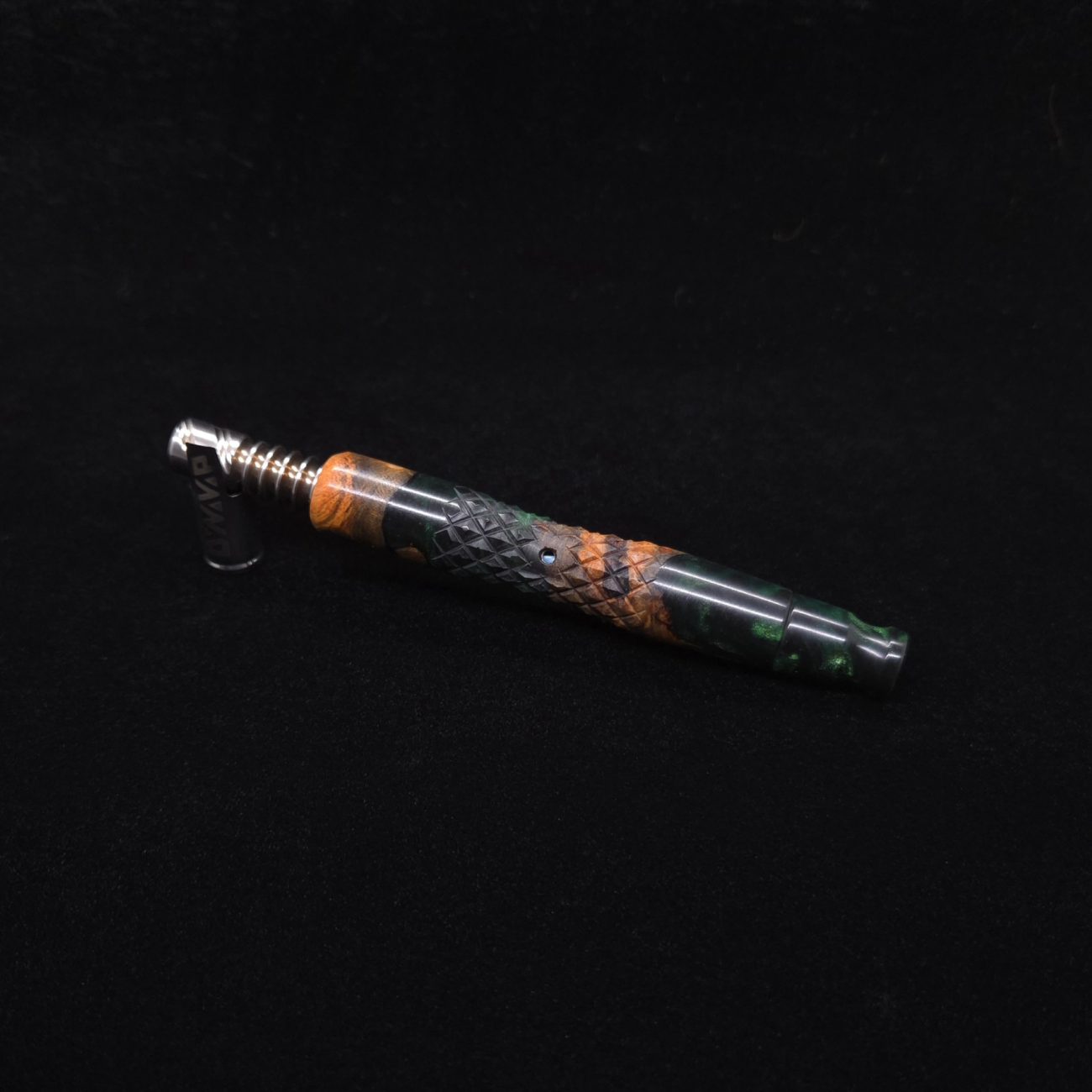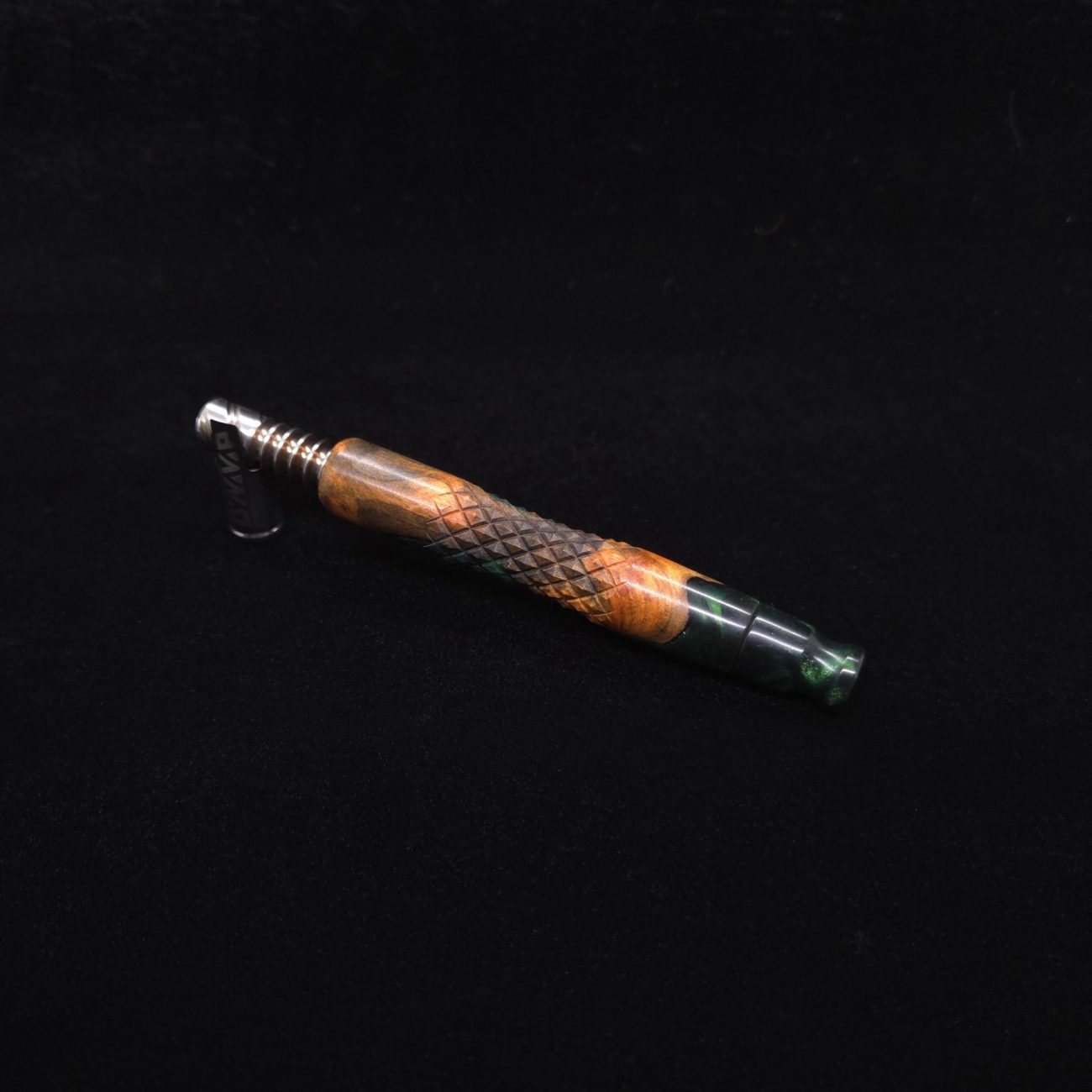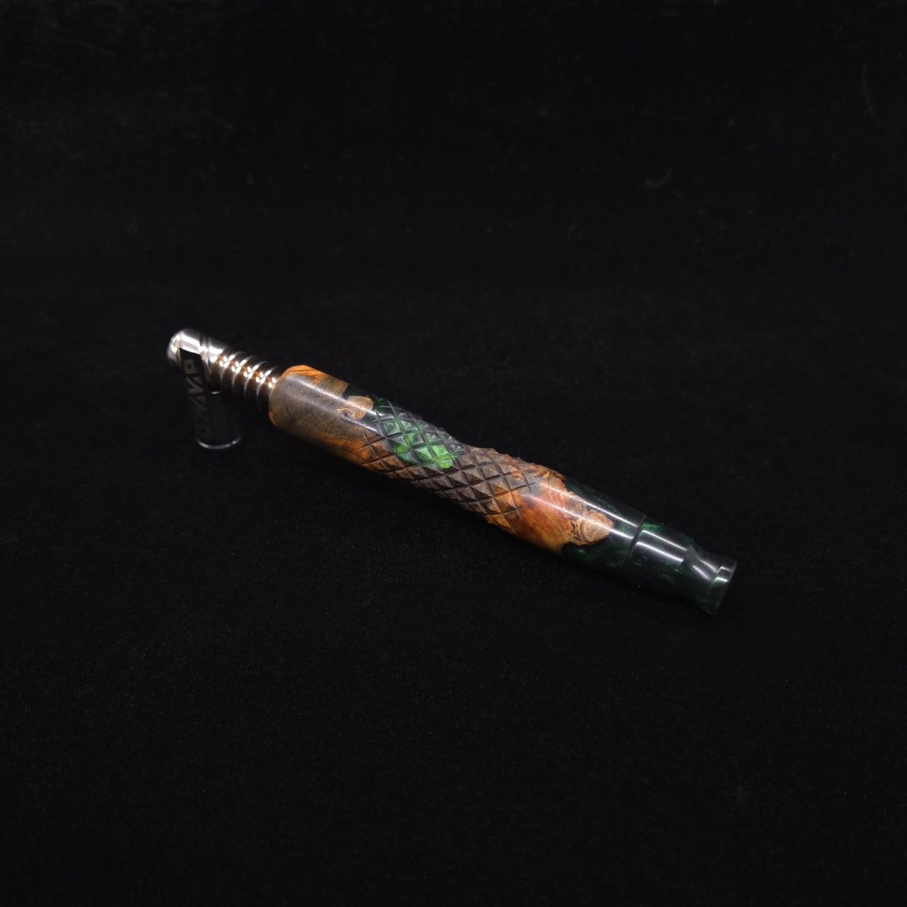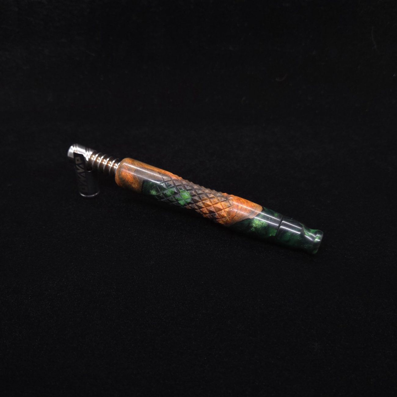 High quality buckeye burl wood hybrid XL length stem for Dynavap components. Along with a book-matched mouthpiece. Burl wood has natural coloring and dyed fire orange with the hybrid sections in metallic emerald green and black. This stem design has a concave middle section with 3D diamonds cut into the curvature. It has centered air-port to allow for tactile air-port locating within the diamond section. All of our stems function with or without mouthpiece attached. Stem has been finished with a satin finish polishing which is all natural. Comes with set of (2) high-temp tip o-rings and (2) wpa mouthpiece o-rings.