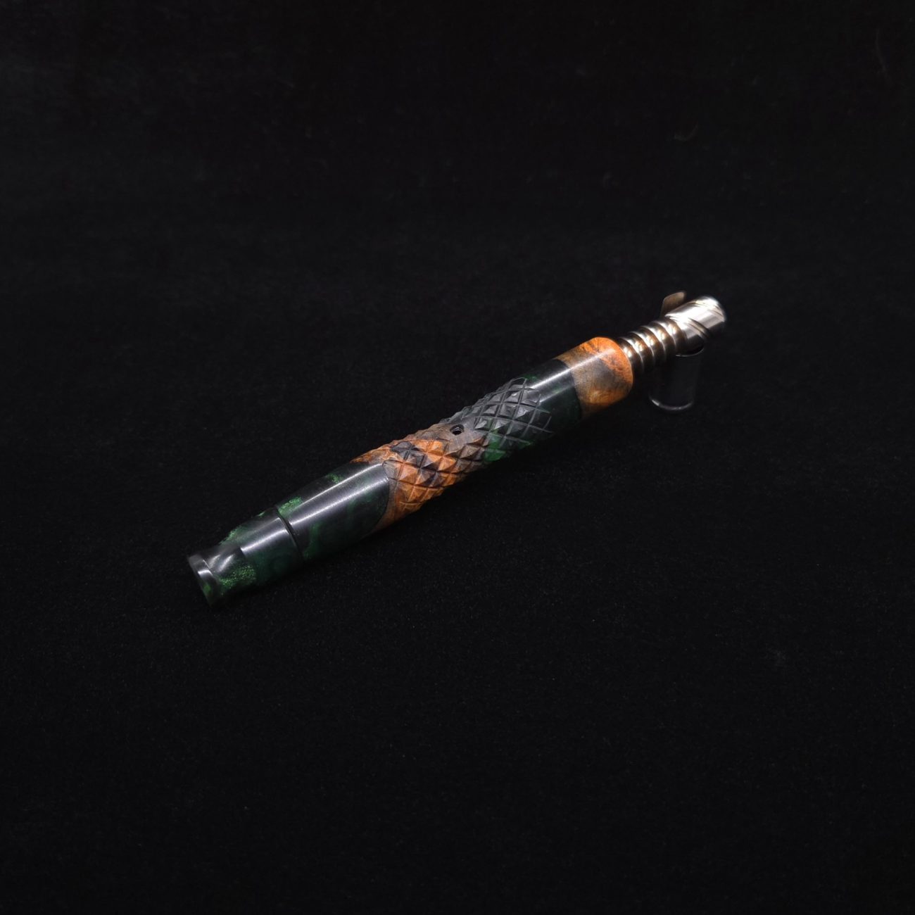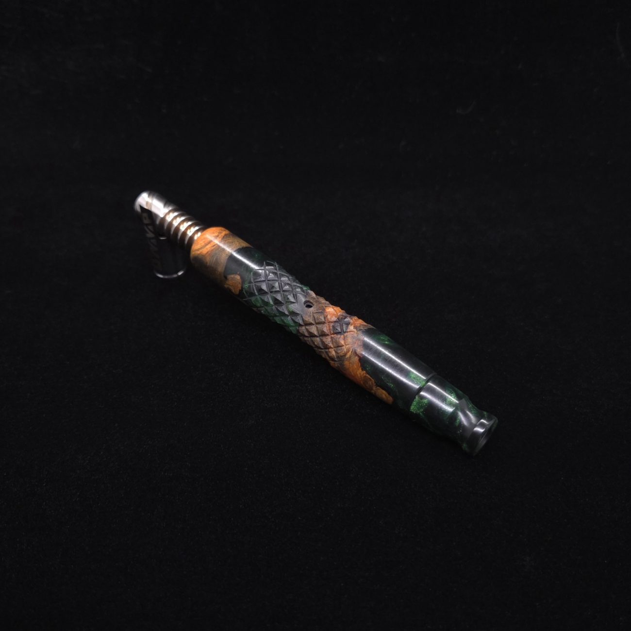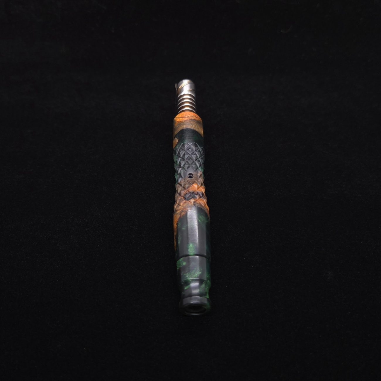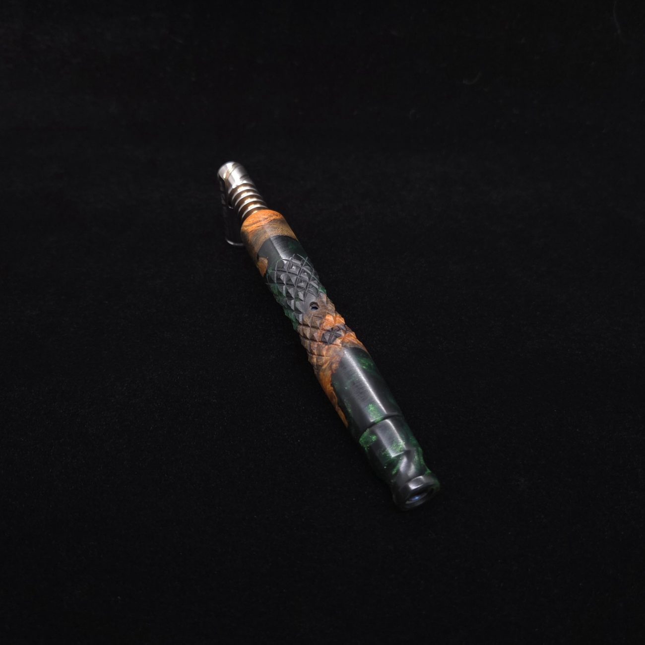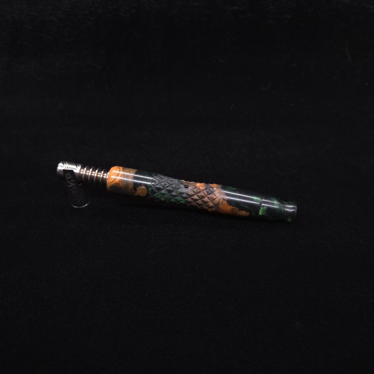 High quality buckeye burl wood hybrid XL length stem for Dynavap components. Along with a book-matched mouthpiece. Burl wood has natural coloring and dyed fire orange with the hybrid sections in metallic emerald green and black. This stem design has a concave middle section with 3D diamonds cut into the curvature. It has centered air-port to allow for tactile air-port locating within the diamond section. All of our stems function with or without mouthpiece attached. Stem has been finished with a satin finish polishing which is all natural. Comes with set of (2) high-temp tip o-rings and (2) wpa mouthpiece o-rings.