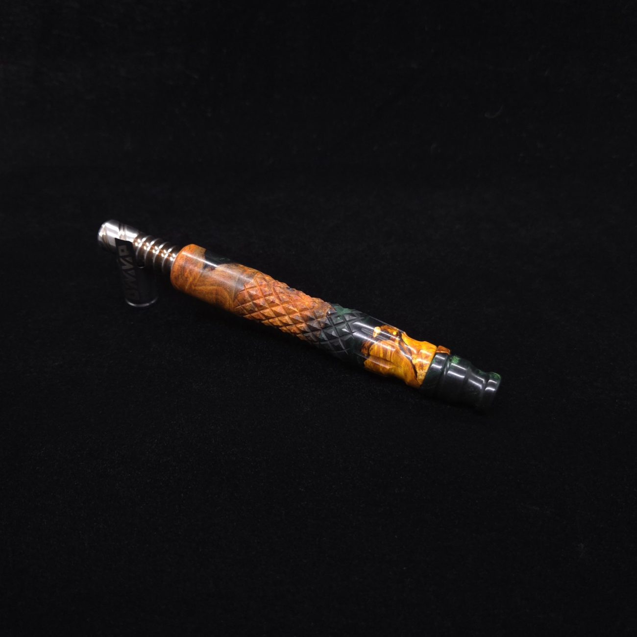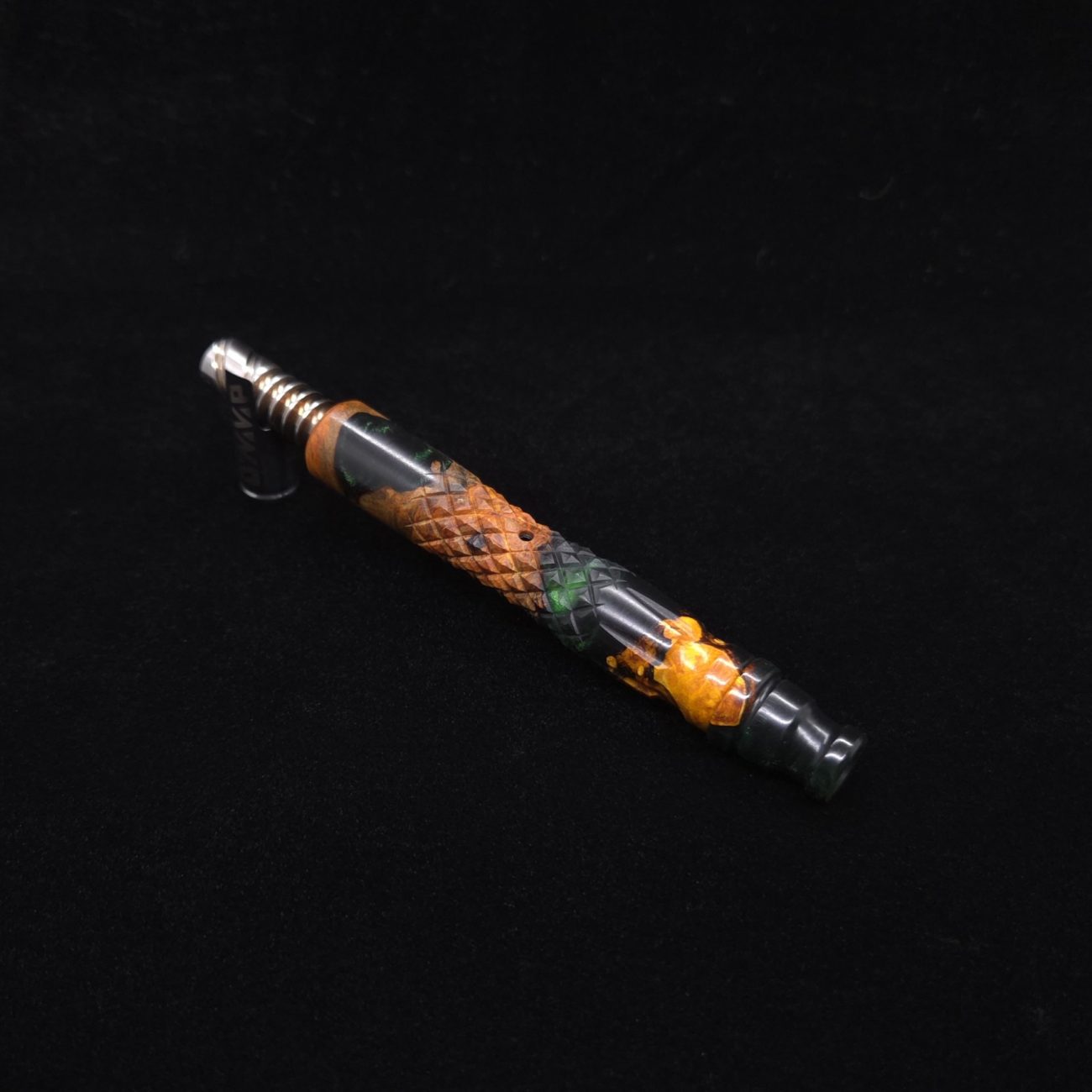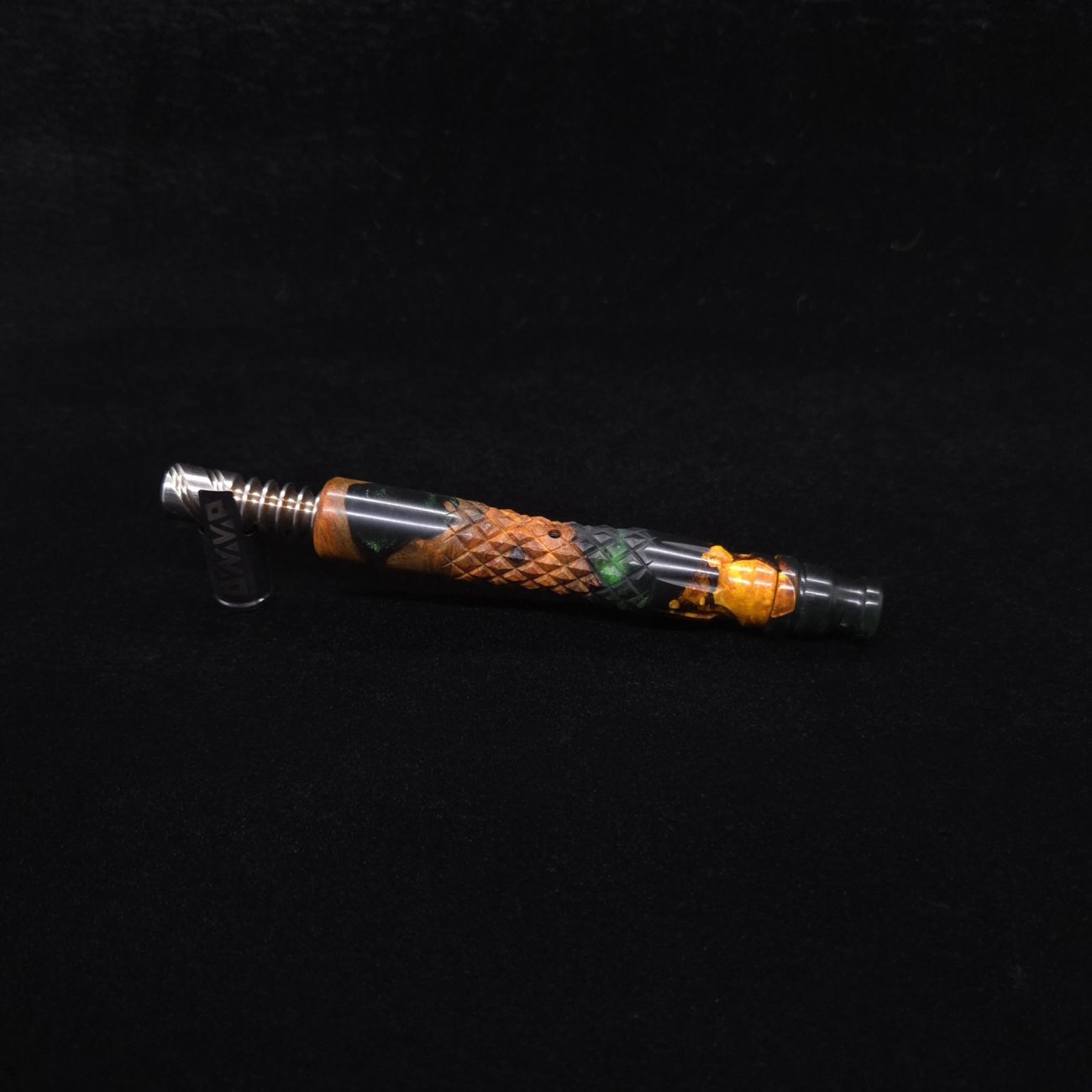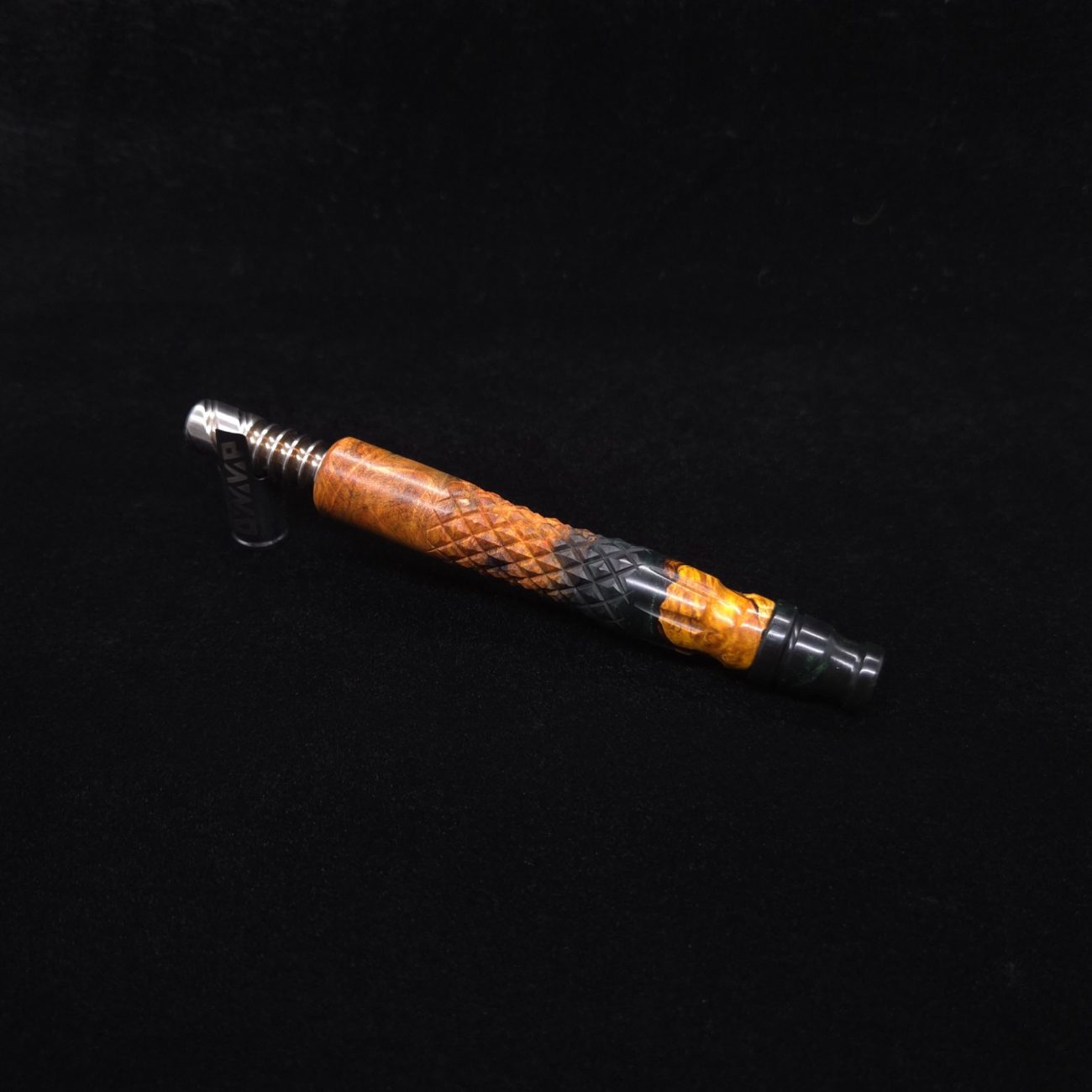High quality buckeye burl wood hybrid XL length stem for Dynavap components. Along with a book-matched mouthpiece that can allow stem to be used on the fly with any 14mm water pipe. Burl wood has natural coloring and dyed fire orange with the hybrid sections in metallic emerald green and black. Variations have been added to this design with an added mouthpiece groove to the stem itself as well as accent groove lines along the taper. This stem design has a concave middle section with 3D diamonds cut into the curvature. It has centered air-port to allow for tactile air-port locating within the diamond section. All of our stems function with or without mouthpiece attached. Stem has been finished with a satin finish polishing which is all natural. Comes with set of (2) high-temp tip o-rings and (2) wpa mouthpiece o-rings.