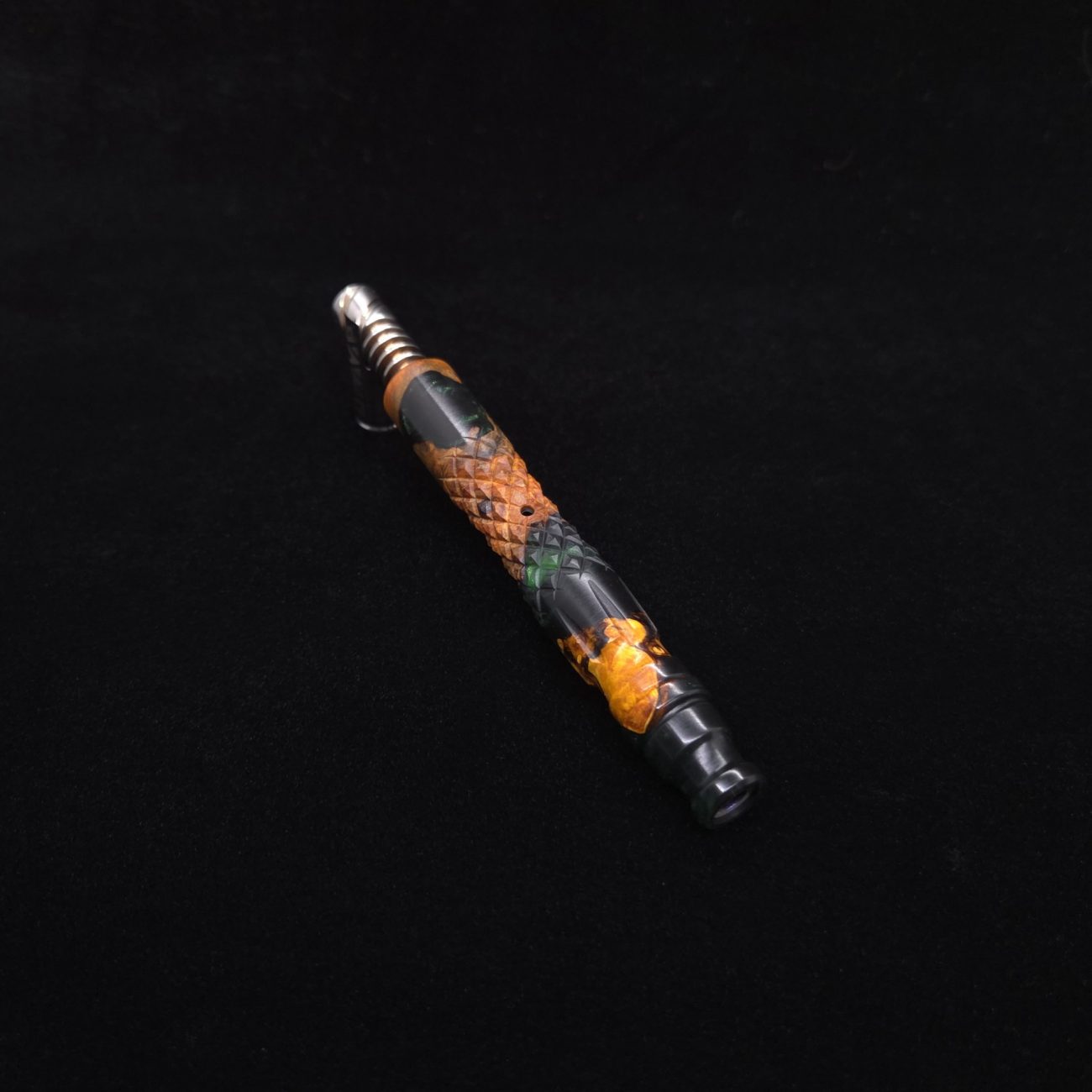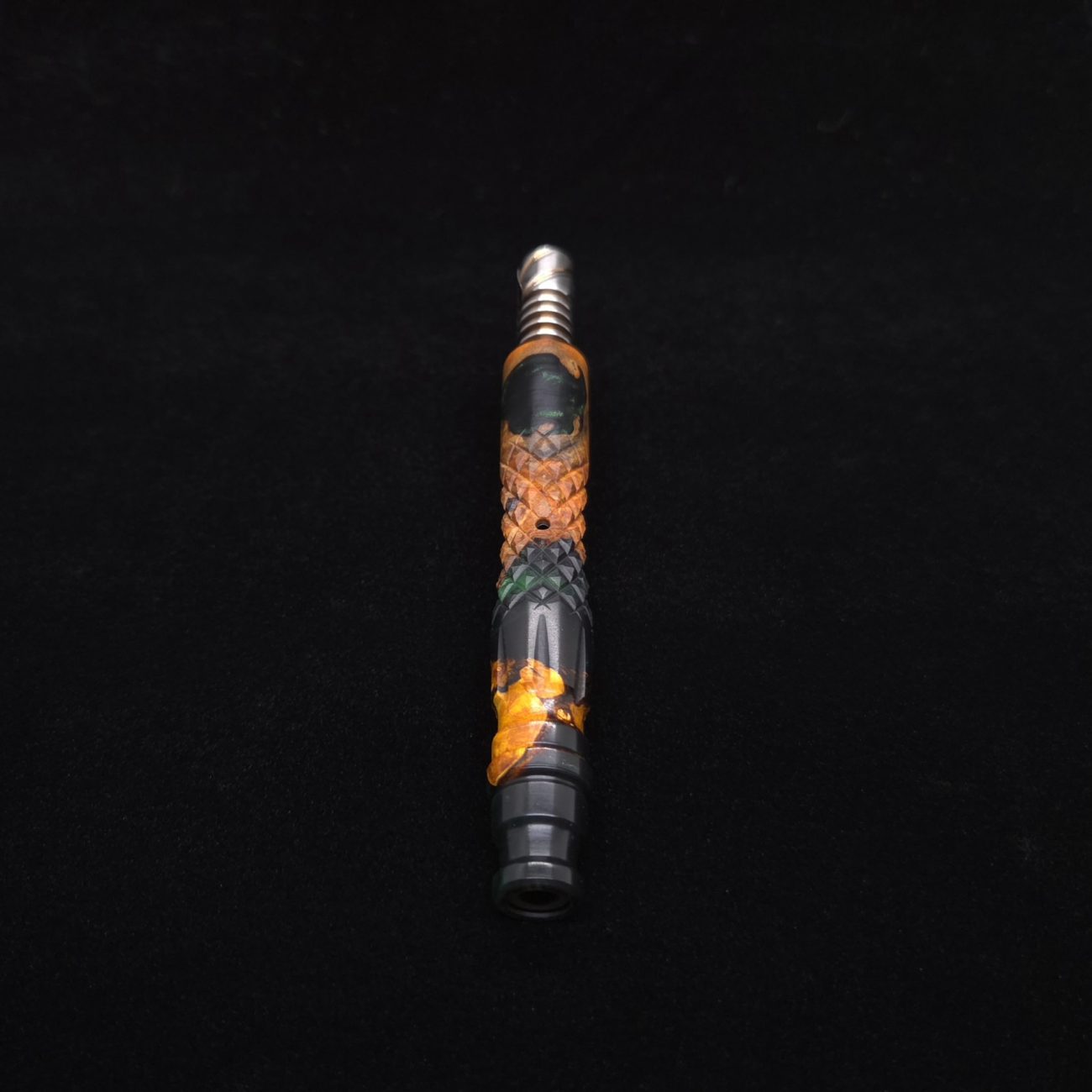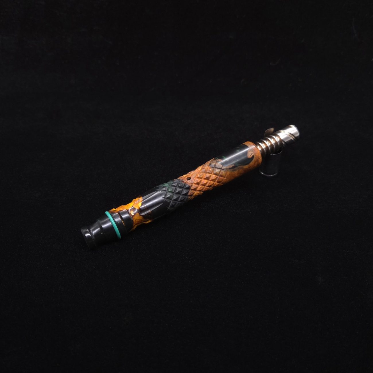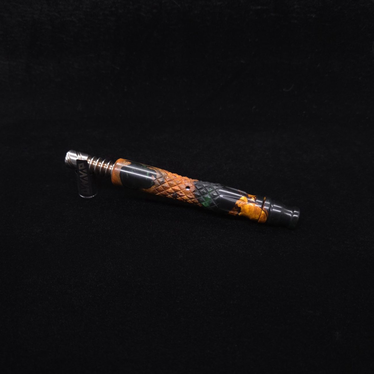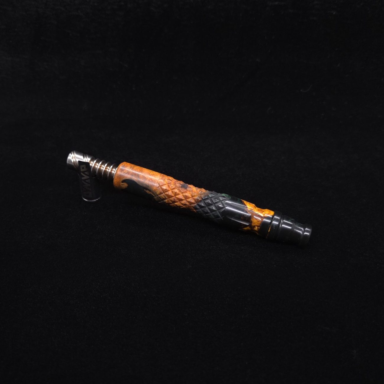 High quality buckeye burl wood hybrid XL length stem for Dynavap components. Along with a book-matched mouthpiece that can allow stem to be used on the fly with any 14mm water pipe. Burl wood has natural coloring and dyed fire orange with the hybrid sections in metallic emerald green and black. Variations have been added to this design with an added mouthpiece groove to the stem itself as well as accent groove lines along the taper. This stem design has a concave middle section with 3D diamonds cut into the curvature. It has centered air-port to allow for tactile air-port locating within the diamond section. All of our stems function with or without mouthpiece attached. Stem has been finished with a satin finish polishing which is all natural. Comes with set of (2) high-temp tip o-rings and (2) wpa mouthpiece o-rings.