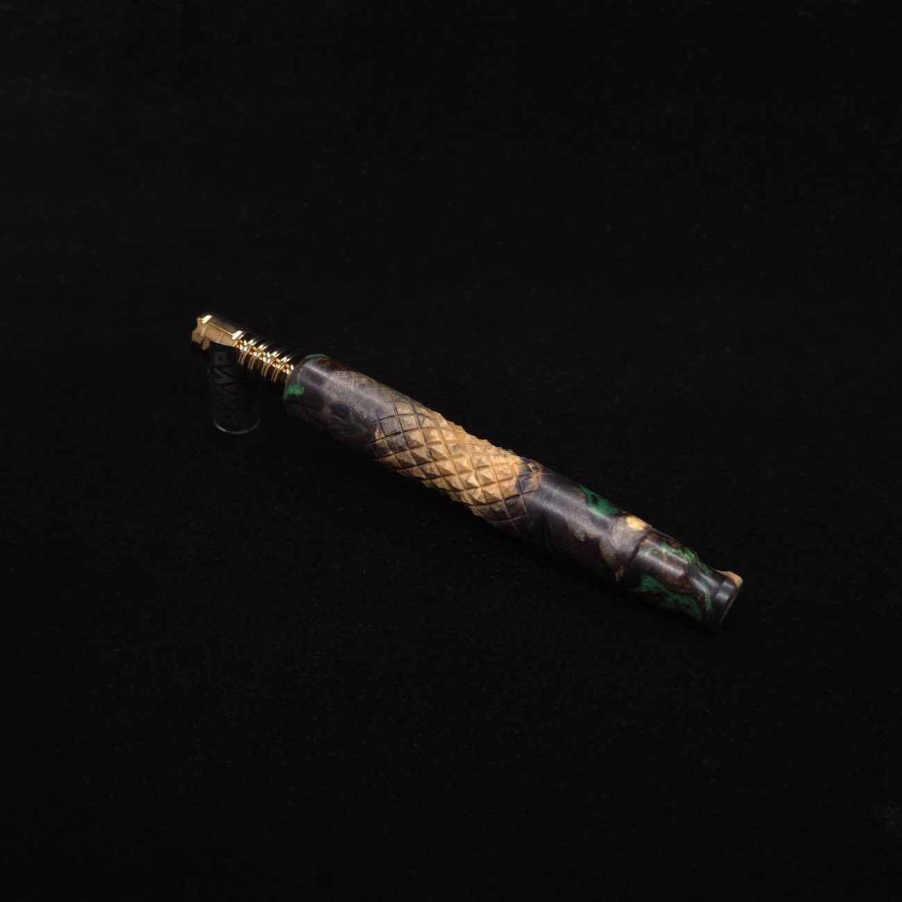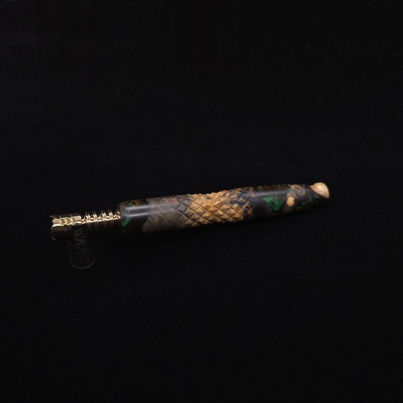 High quality buckeye burl wood hybrid XL length stem for Dynavap components. Along with a book-matched mouthpiece. Burl wood has natural coloring with the hybrid sections in metallic chocolate and metallic lime green. This stem design has a concave middle section with 3D diamonds cut into the curvature. It has centered air-port to allow for tactile air-port locating within the diamond section. All of our stems function with or without mouthpiece attached. Stem has been finished with a satin finish polishing which is all natural. Comes with set of (2) high-temp tip o-rings and (2) wpa mouthpiece o-rings.
