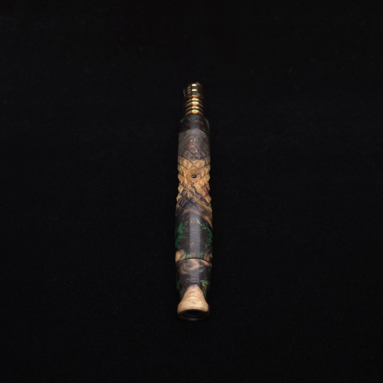 Stem has a precision drilled hole that gets fitted with a thin wall, medical grade stainless steel tube/liner. This makes the stem perfectly compatible with the Dynavap parts as well as adding rigidity and weight making it feel nice when held. The weight also gives it the same feel when in use as your used to with the metal Dynavap midsections. Once the stem is created it then gets sanded and polished using our nature based polish/waxes. Everything made in our shop is hand crafted.