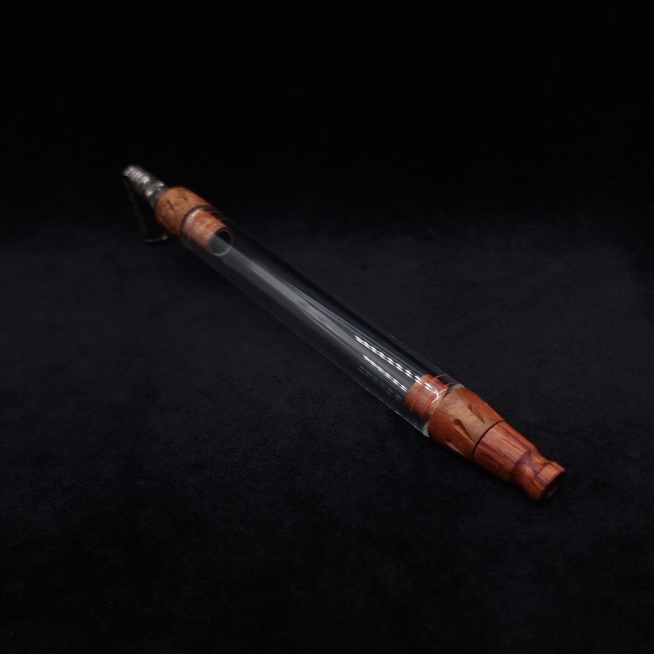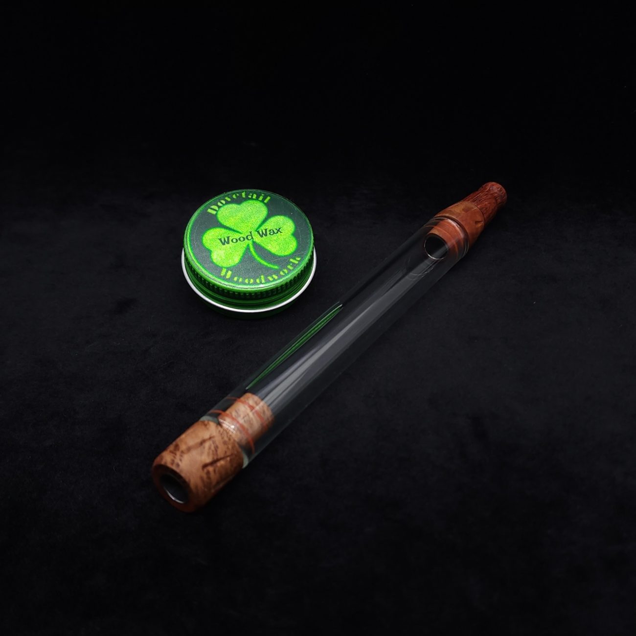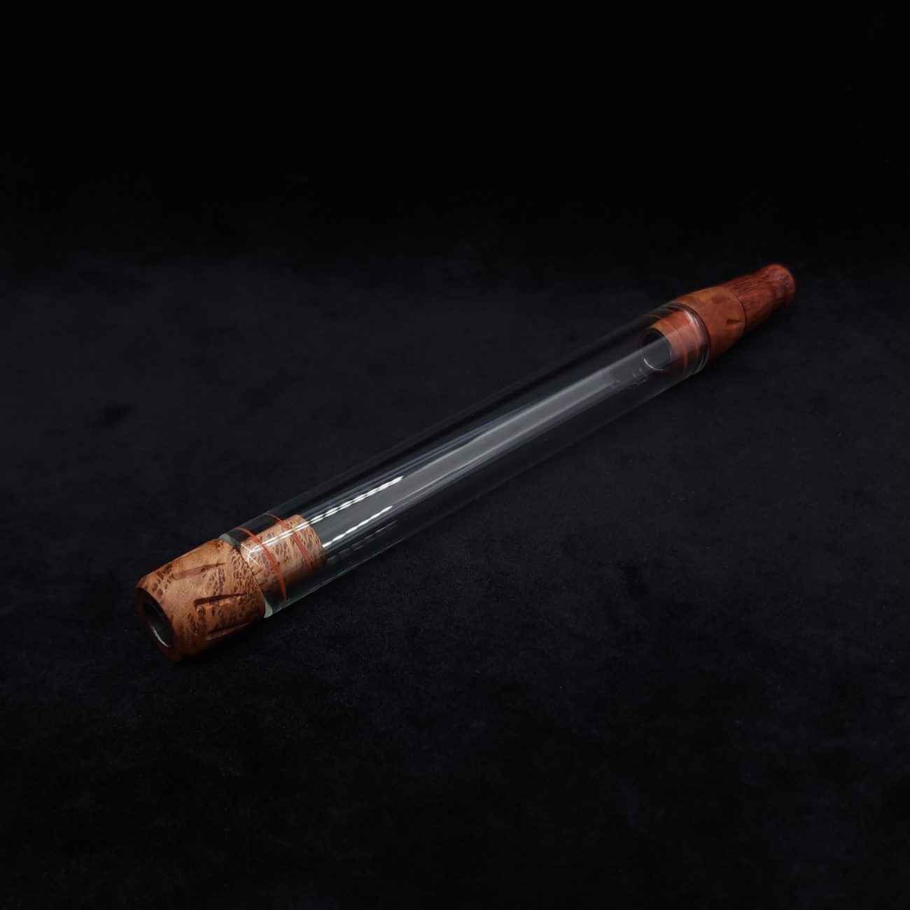 High quality red/golden mallee burl wood 3XL glass/wood stem for Dynavap. This is a new, possible limited run, 2025 stem setup using both glass and wood, using our metal liners for perfect fitment of Dynavap parts. This setup has 4 total pieces or sections. The tip end and mouthpiece end use two o-rings to connect inside the glass stem. Then the smaller wood mouthpiece uses two o-rings to connect to the mouthpiece end. The all wood mouthpiece has a smaller hole size to give a more precise experience with vapor draw and can be removed for more airflow. Glass tube is high quality borosilicate glass that is rigid yet light weight. Stem pieces have been finished with a satin finish polishing which is all natural. Stem pieces will come with (6) black high-temp o-rings pre-installed and extra set of green high-temp o-rings.