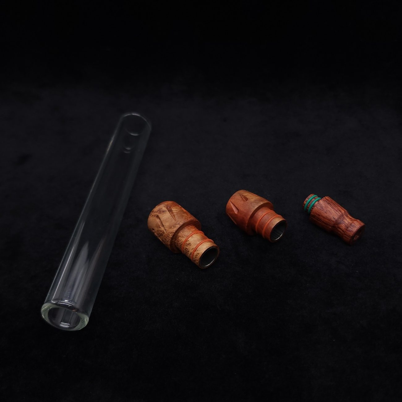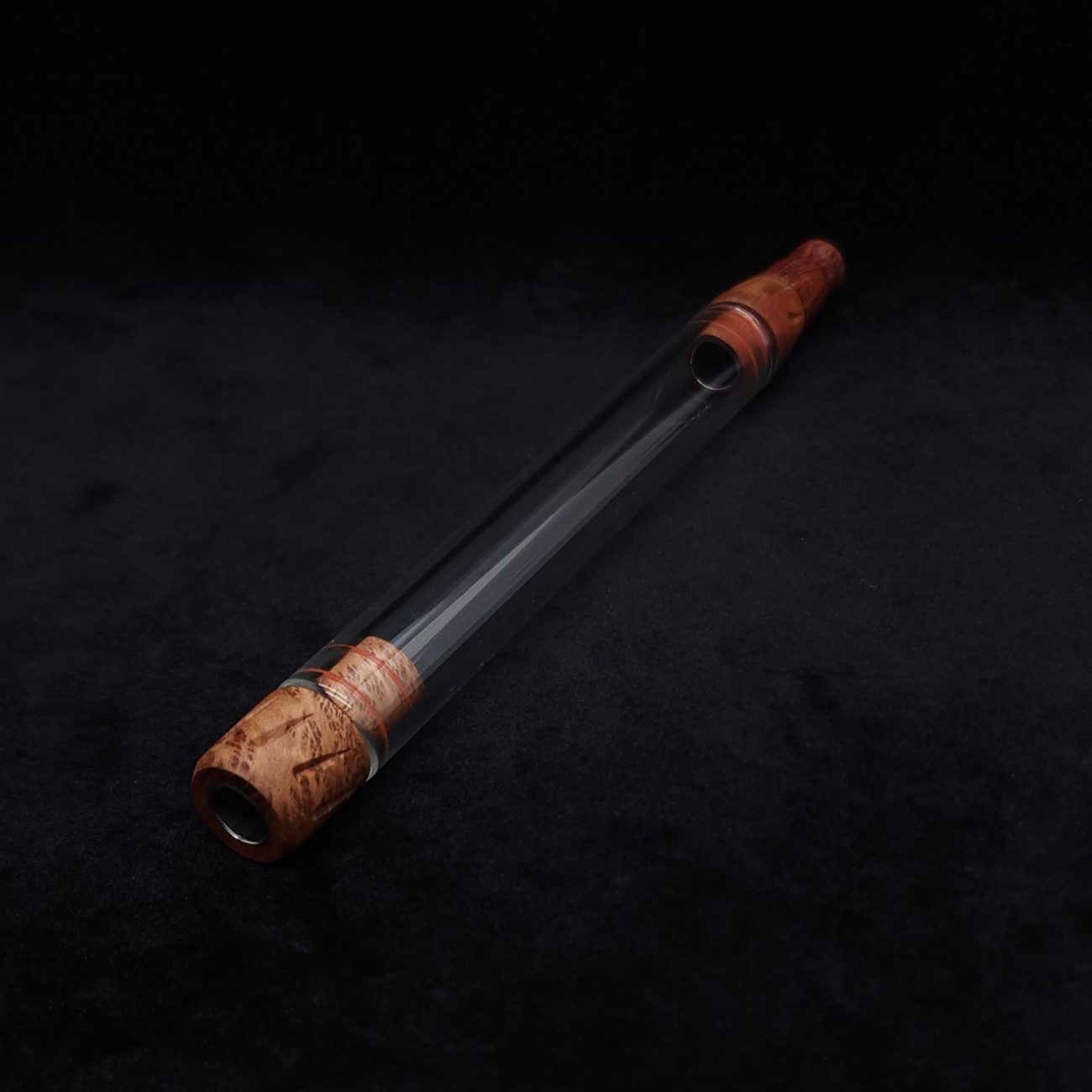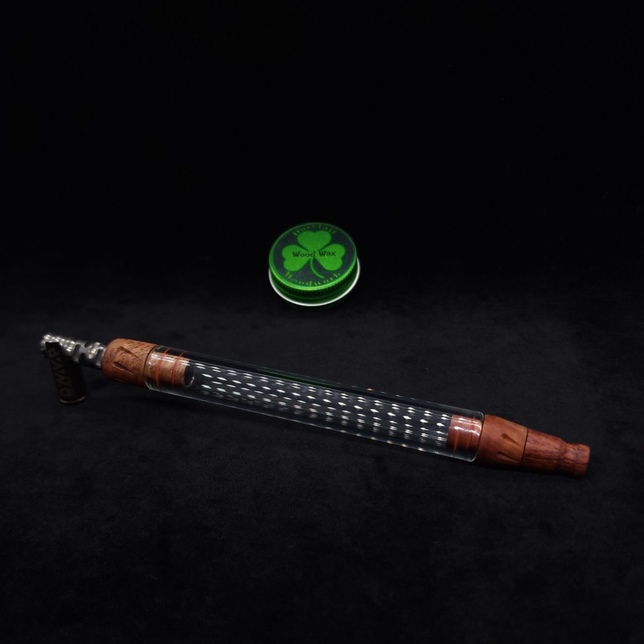 High quality red/golden mallee burl wood 3XL glass/wood stem for Dynavap. This is a new, possible limited run, 2025 stem setup using both glass and wood, using our metal liners for perfect fitment of Dynavap parts. This setup has 4 total pieces or sections. The tip end and mouthpiece end use two o-rings to connect inside the glass stem. Then the smaller wood mouthpiece uses two o-rings to connect to the mouthpiece end. The all wood mouthpiece has a smaller hole size to give a more precise experience with vapor draw and can be removed for more airflow. Glass tube is high quality borosilicate glass that is rigid yet light weight. Stem pieces have been finished with a satin finish polishing which is all natural. Stem pieces will come with (6) black high-temp o-rings pre-installed and extra set of green high-temp o-rings.