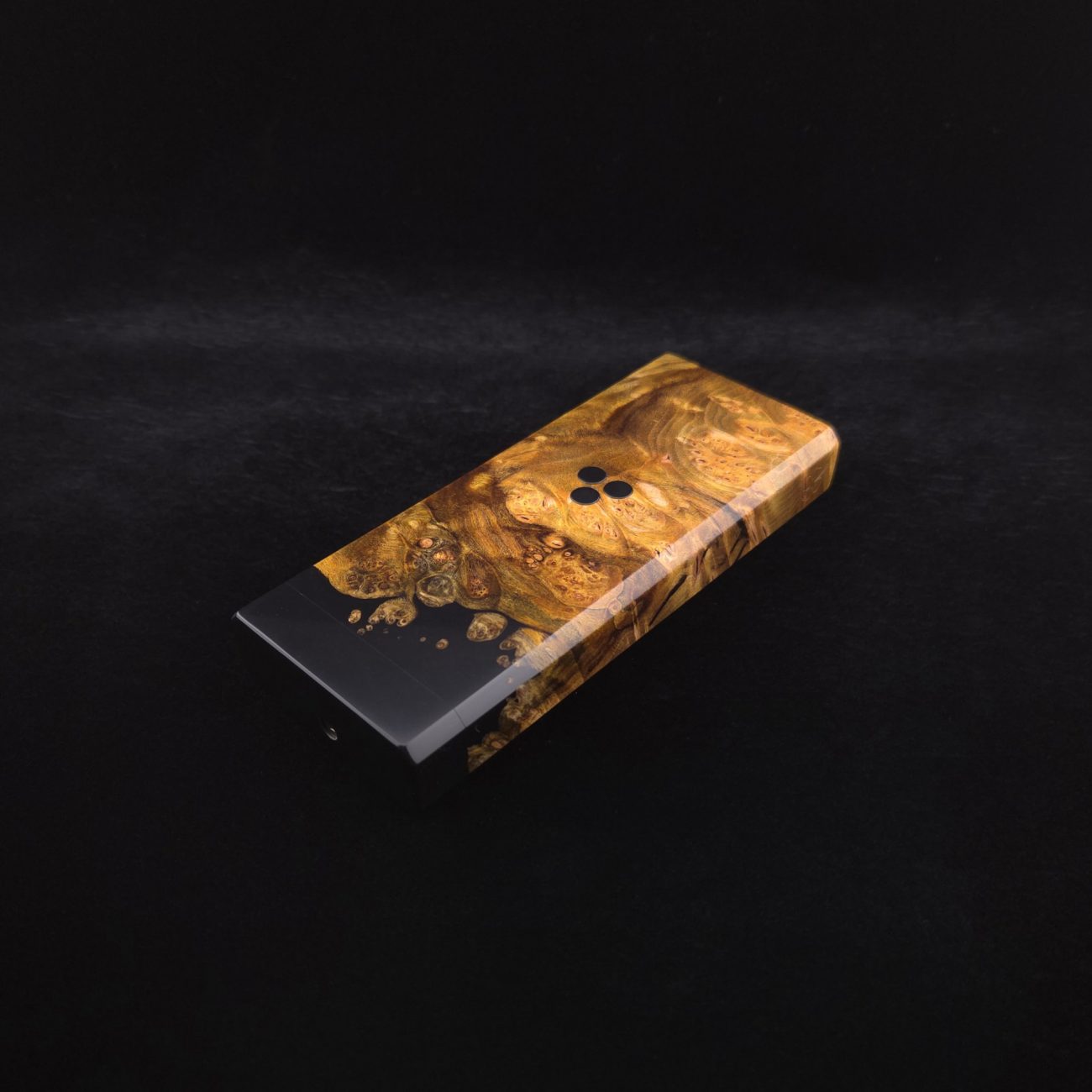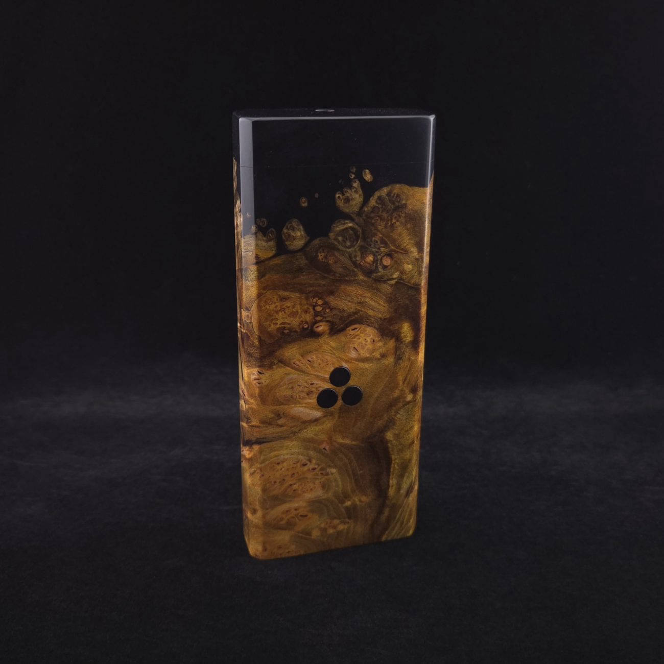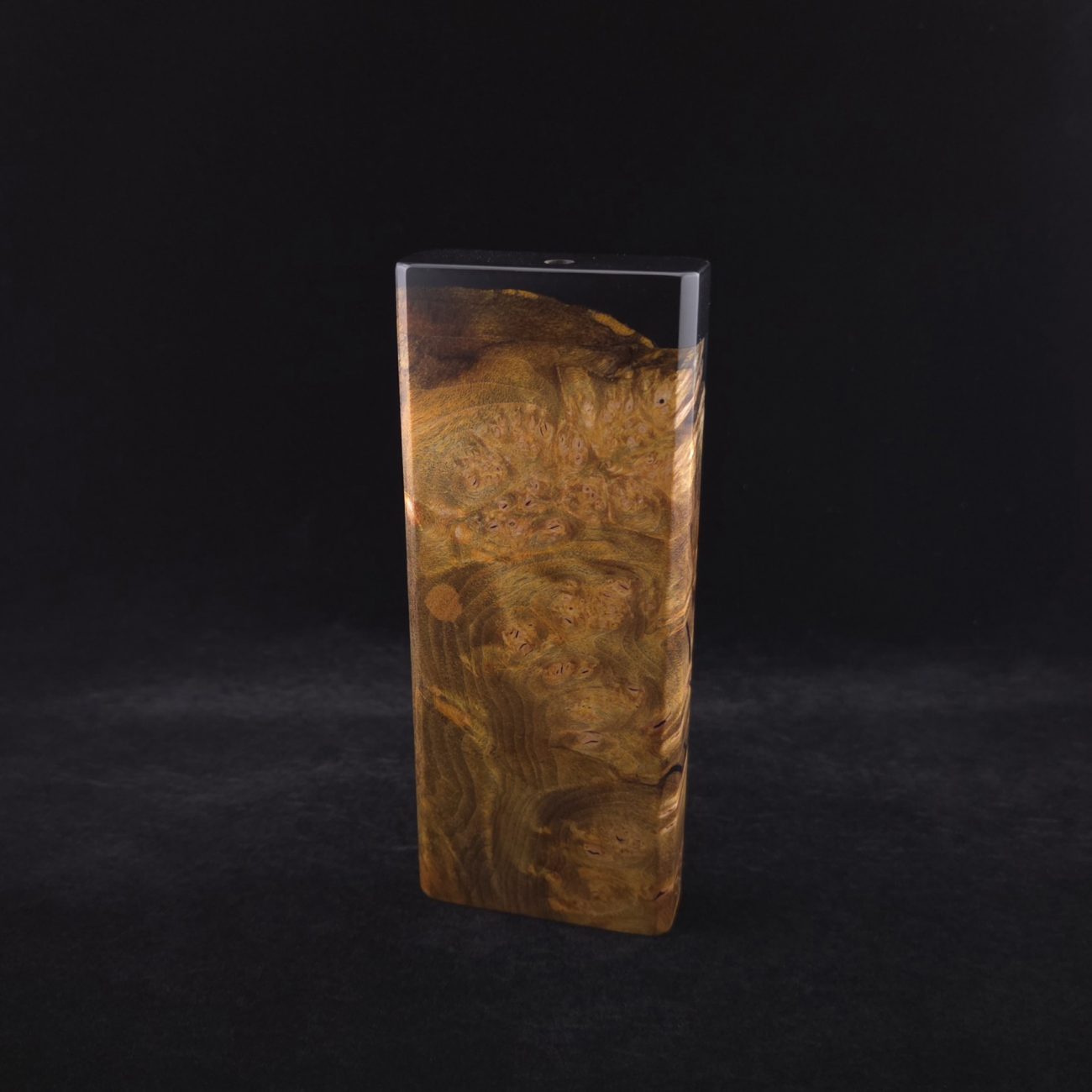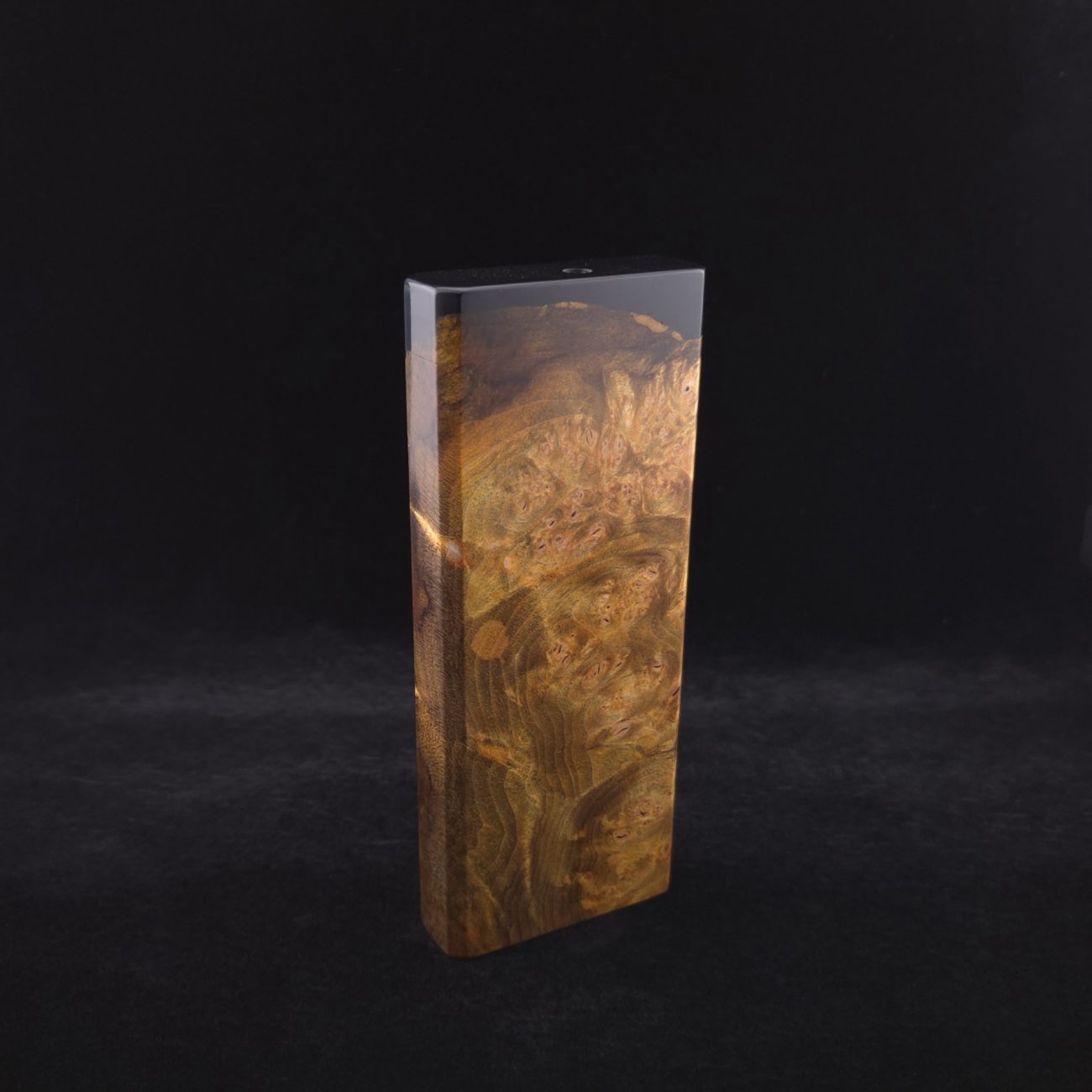 High grade and amazingly figured maple burl wood. Made into a high class hybrid using sleek metallic black coloring. Burl has been colored to a rich, royal gold. This burl has some extreme figure with a high number of burl eye clusters, matched with the metallic black for a high class look. The case is for single stem device storage and material storage. Stem/device compartment is spring loaded with a stainless steel spring/plate and will fit stems under 15mm diameter. Material storage is done in a 5/8″ diameter cutout (precision cnc cut) to fit any stored stem and give extra space to load and maneuver, including up to the Hyper tip size. Case has been finished with a smooth satin finish polishing which is all natural. Outside of case is equipped with (3) black epoxy coated mags. Case also has a golden bronze anodized 3mm stainless steel quick-pick with storage slot inside. Pick has a pointer side and a flat-head side for versatile clean out/parts removal options. Case also comes with an s.s. metal hex key to tighten the lid if this ever becomes necessary. All case hardware from spring/spring plate to lid screw, which is gold anodized, is of quality stainless steel. All edges are beveled and polished to the highest quality.