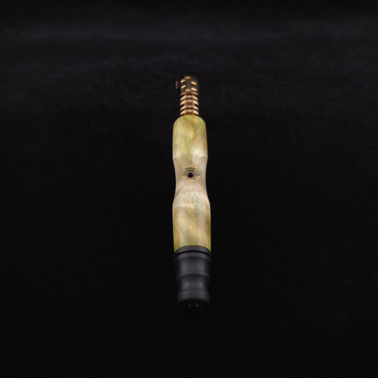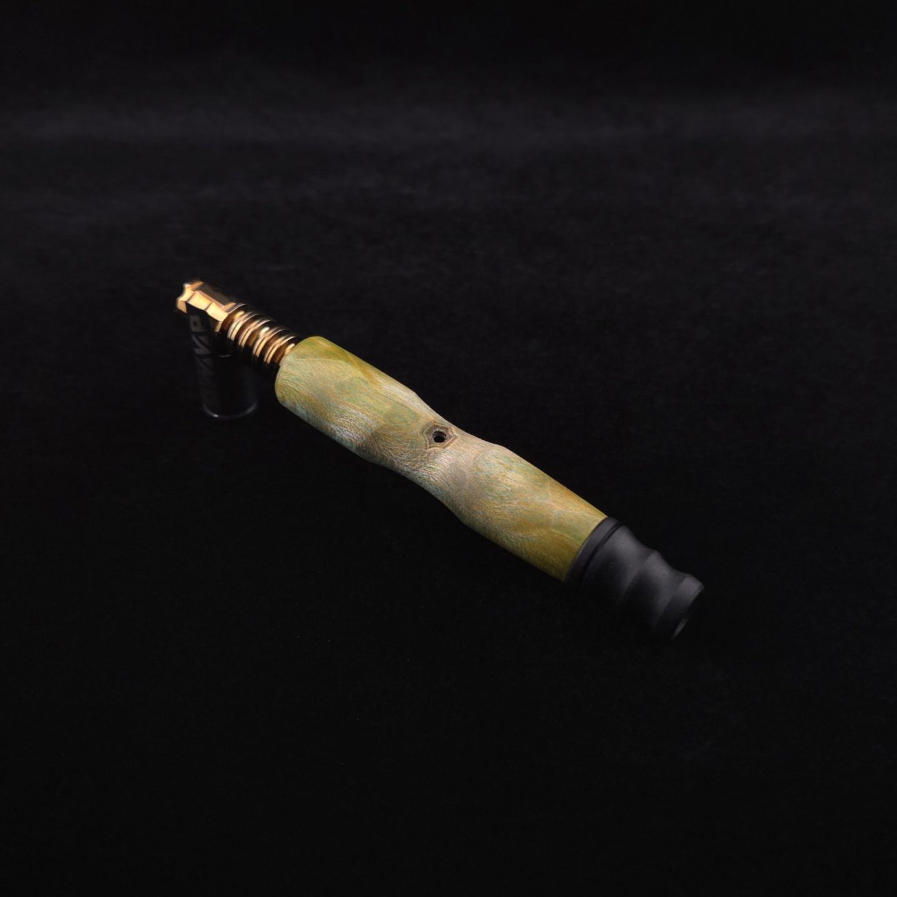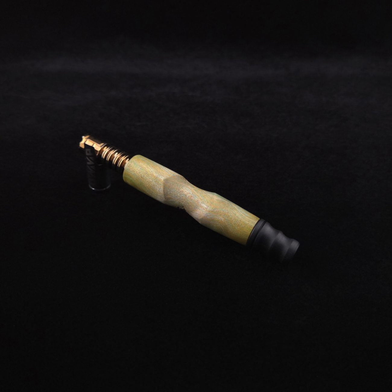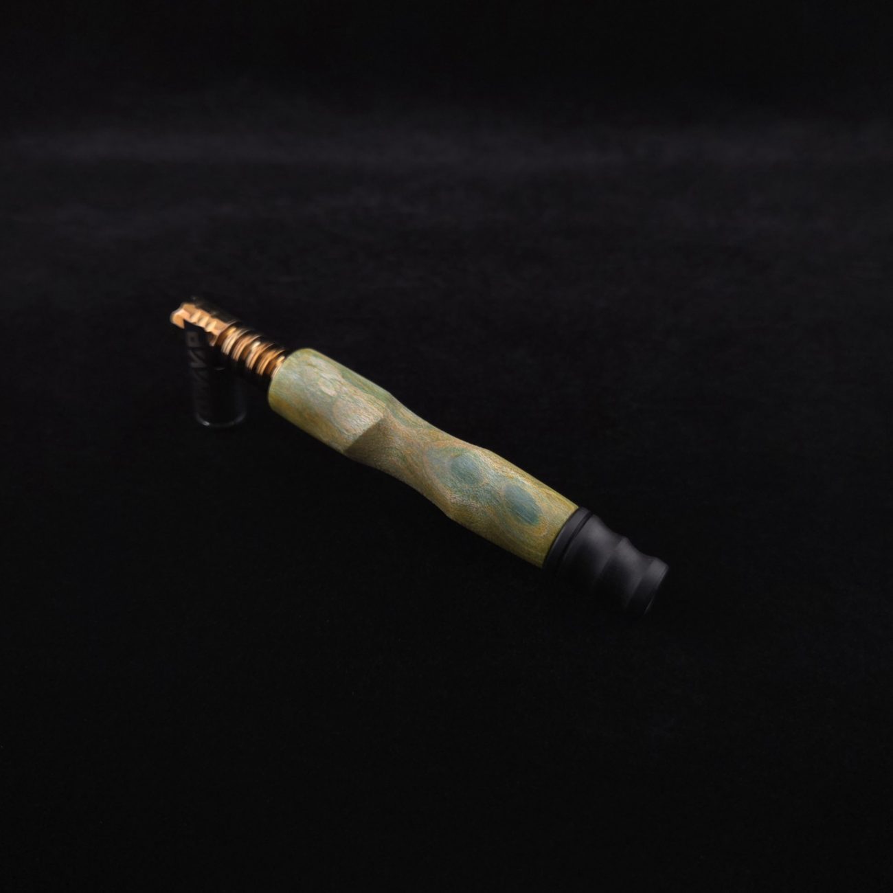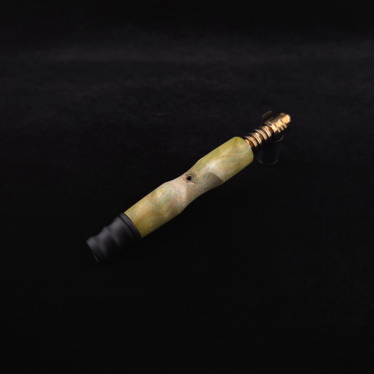 High quality, extreme figure quilted flame maple burl wood XL length stem for Dynavap components. Burl has been dyed with ocean blue and olive green coloring with some natural light colored grains. These limited run stems are made from a highly figured block of quilted flame maple burl that has very unique twists and grain patterns. We’ll be run out these limited run stems until we have no more of this unique rare find burl. This is a new design having the hollowed, scooped out middle sections in the high class version and a centered air-port side oval design with max air-flow. Stem functions with or without m.p. Stem has been finished with a smooth satin/semi-gloss finish polishing which is all natural and food safe.