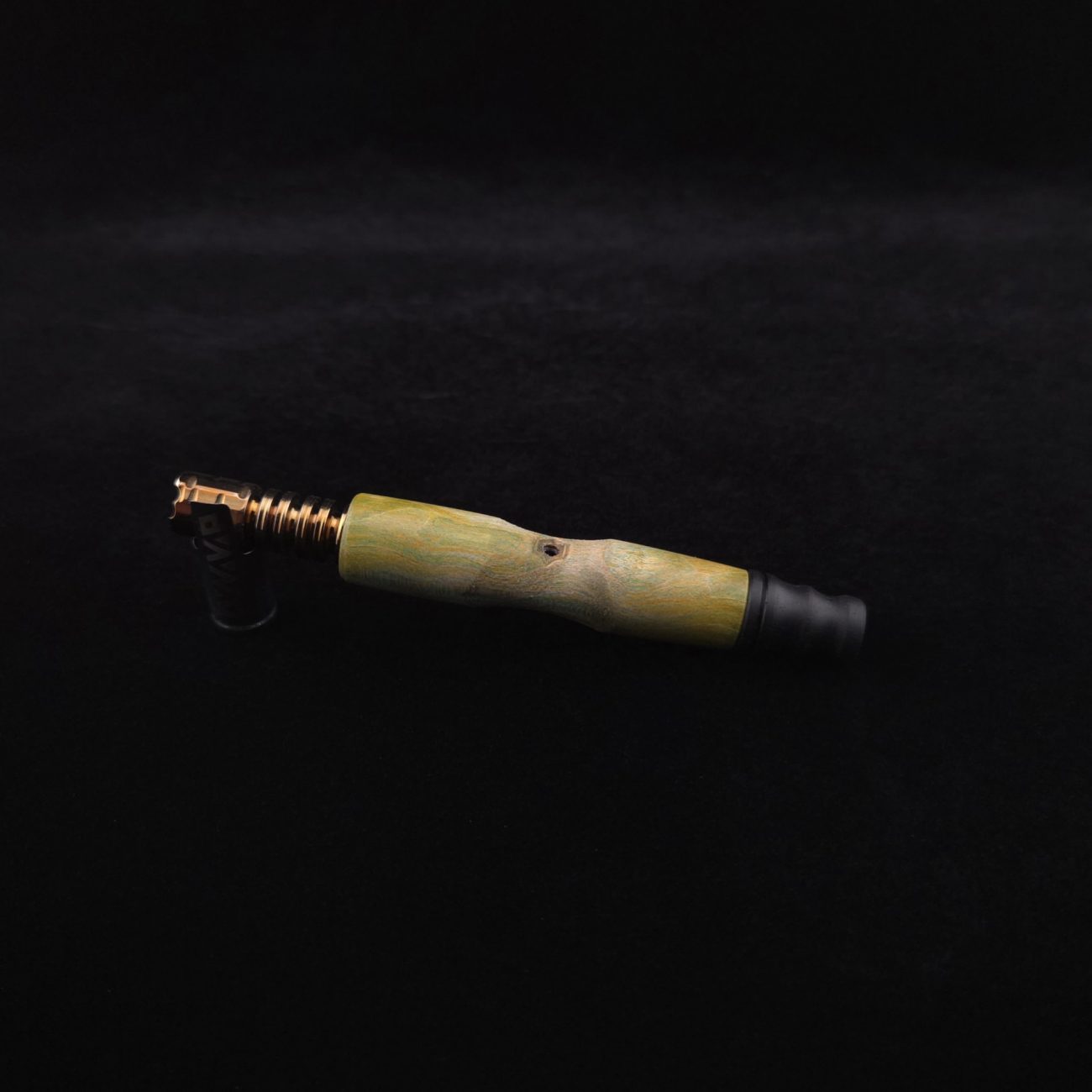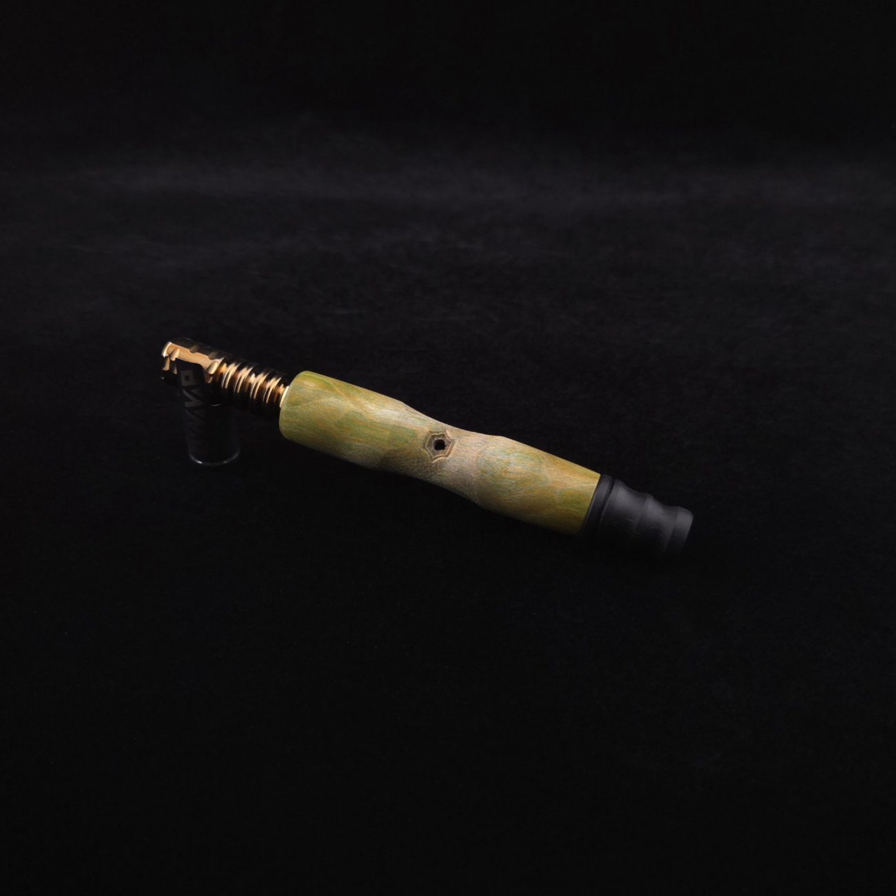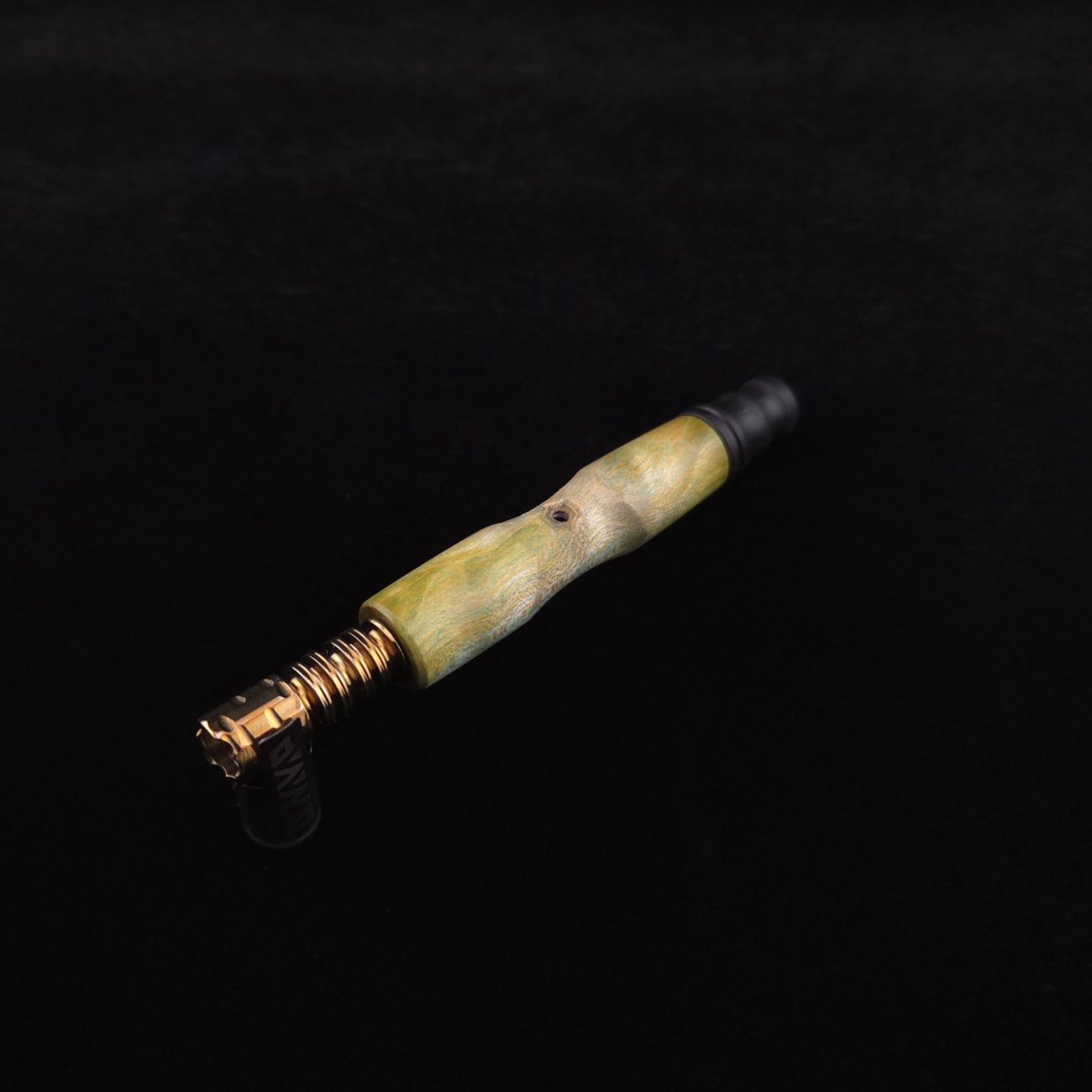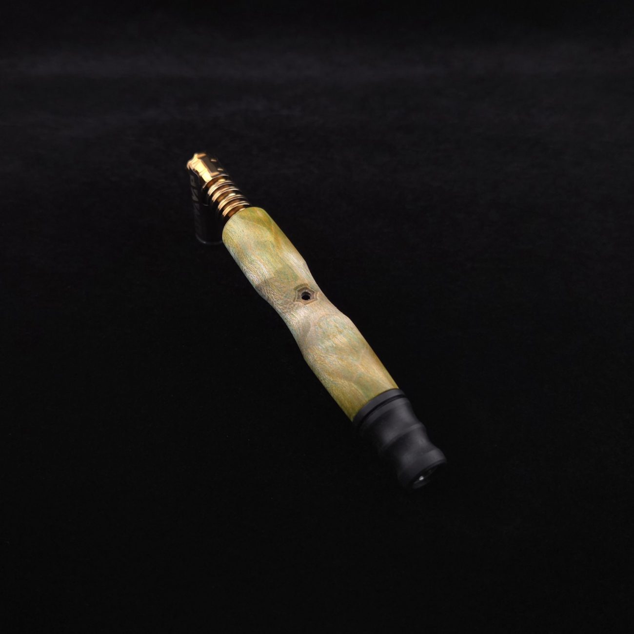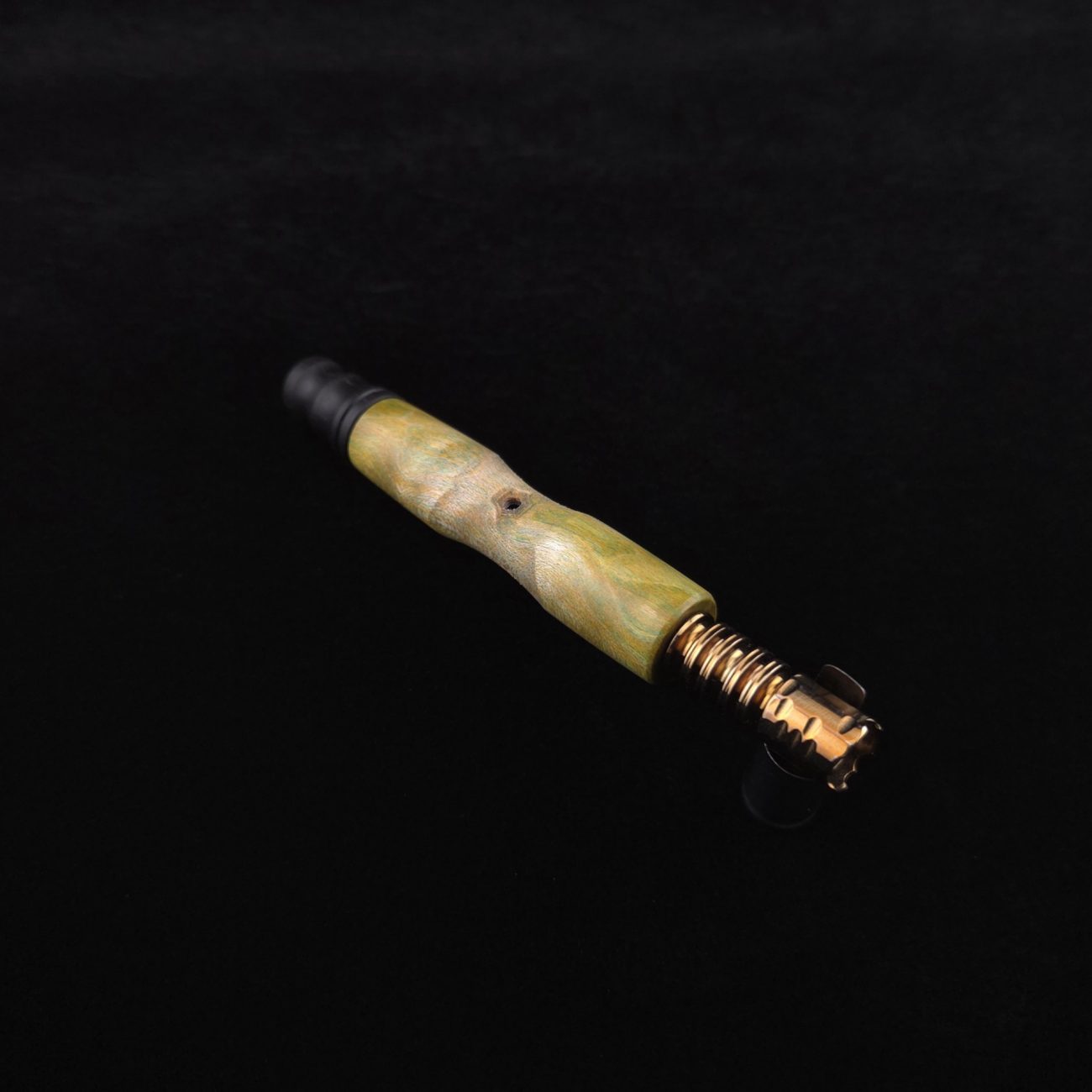 High quality, extreme figure quilted flame maple burl wood XL length stem for Dynavap components. Burl has been dyed with ocean blue and olive green coloring with some natural light colored grains. These limited run stems are made from a highly figured block of quilted flame maple burl that has very unique twists and grain patterns. We’ll be run out these limited run stems until we have no more of this unique rare find burl. This is a new design having the hollowed, scooped out middle sections in the high class version and a centered air-port side oval design with max air-flow. Stem functions with or without m.p. Stem has been finished with a smooth satin/semi-gloss finish polishing which is all natural and food safe.