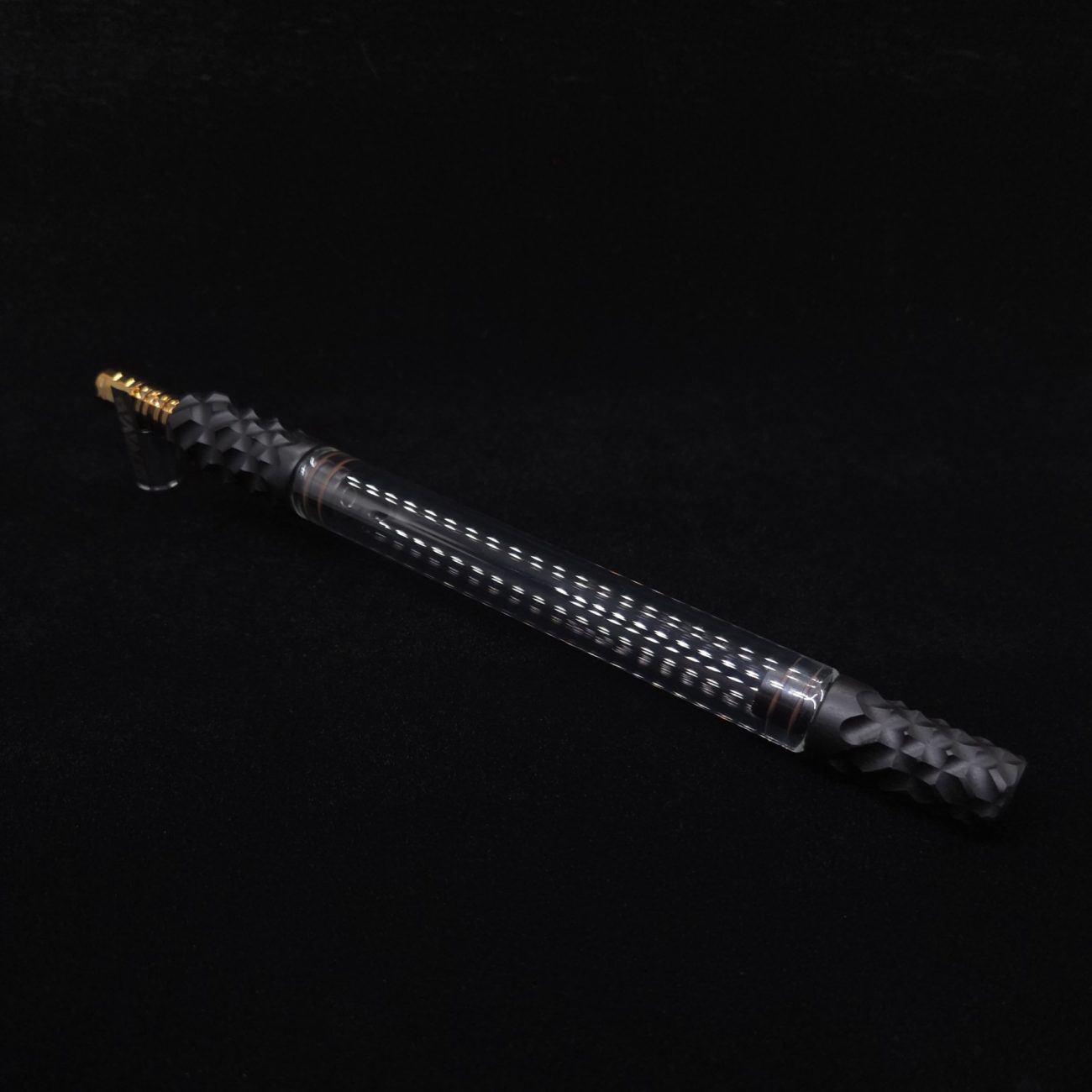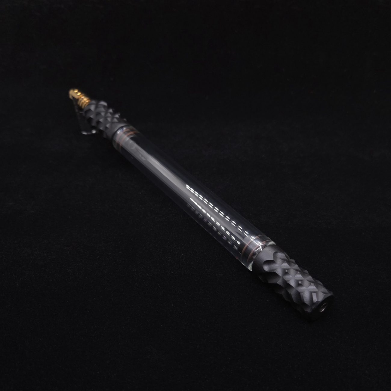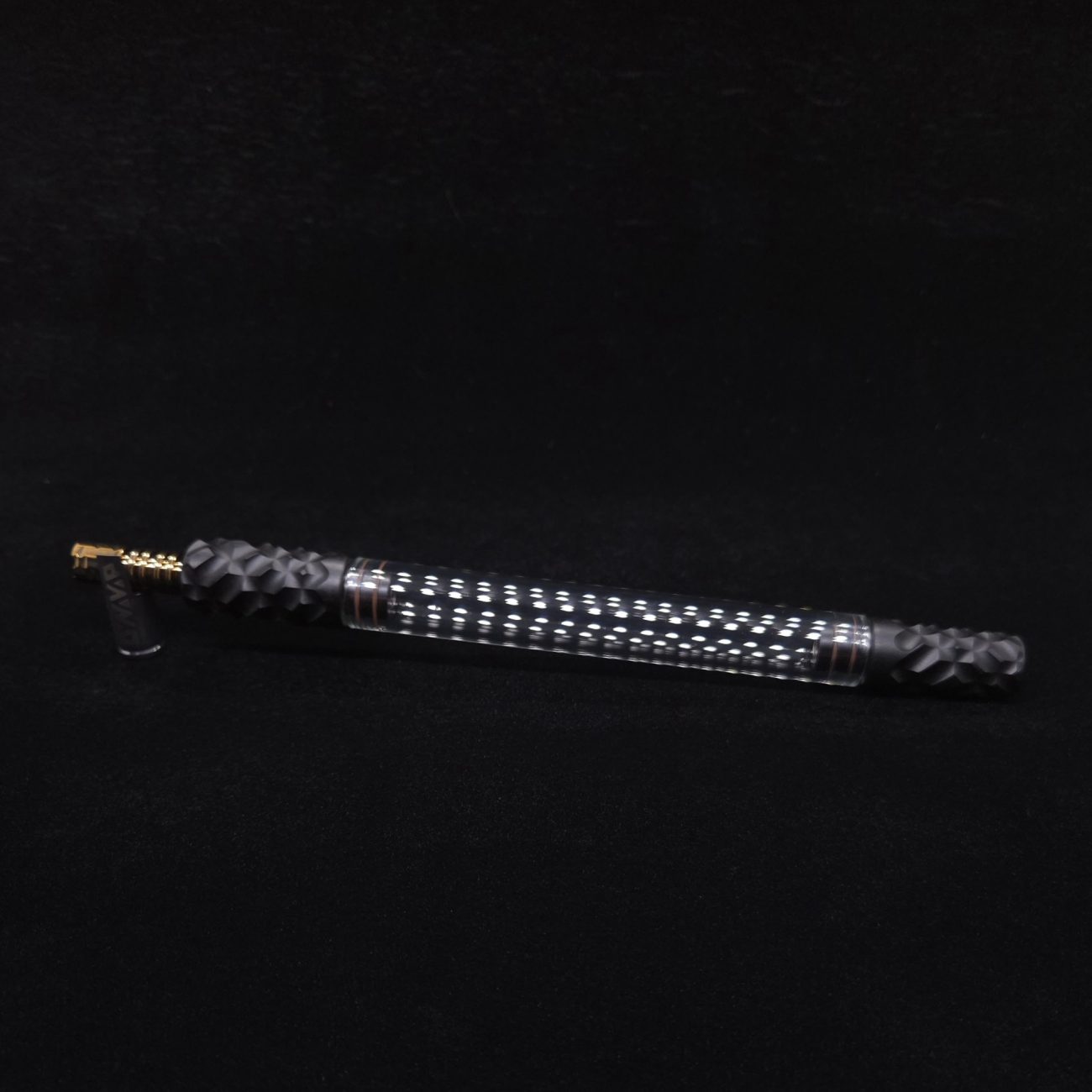 High quality pure black ebony wood 3XL glass/wood stem for Dynavap. This is a newer boro glass version done in a limited edition reaper design. Pulled from our reaper stem design, it has similar matching cuts on each end. This setup has 3 total pieces or sections. The tip end and mouthpiece end use two o-rings to connect inside the glass stem. The tip is lined with med grade stainless steel in 8mm to 5mm allowing for maximum draw. The mouthpiece is lined with the same 5mm tubing. Glass tube is high quality borosilicate glass that is rigid yet light weight. Stem pieces have been finished with a satin finish polishing which is all natural. Stem pieces will come with (4) high-temp o-rings pre-installed and extra set of high-temp o-rings. The mouthpiece also comes with (2) o-rings that when installed allow for glass device wpa connection to any glass device (bong) with a 14mm tapered hole.