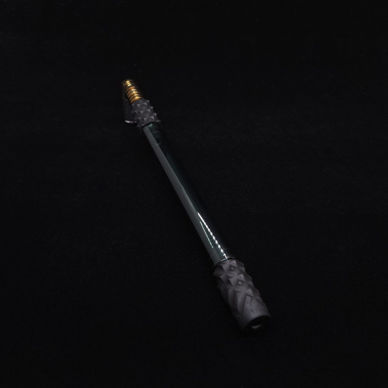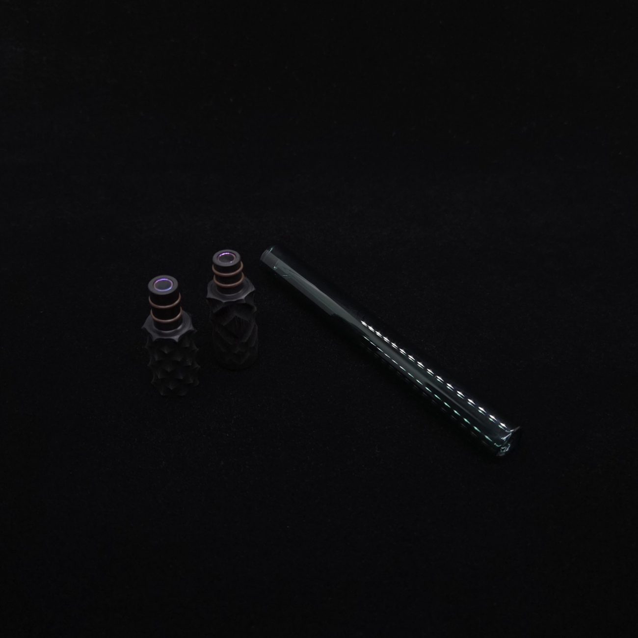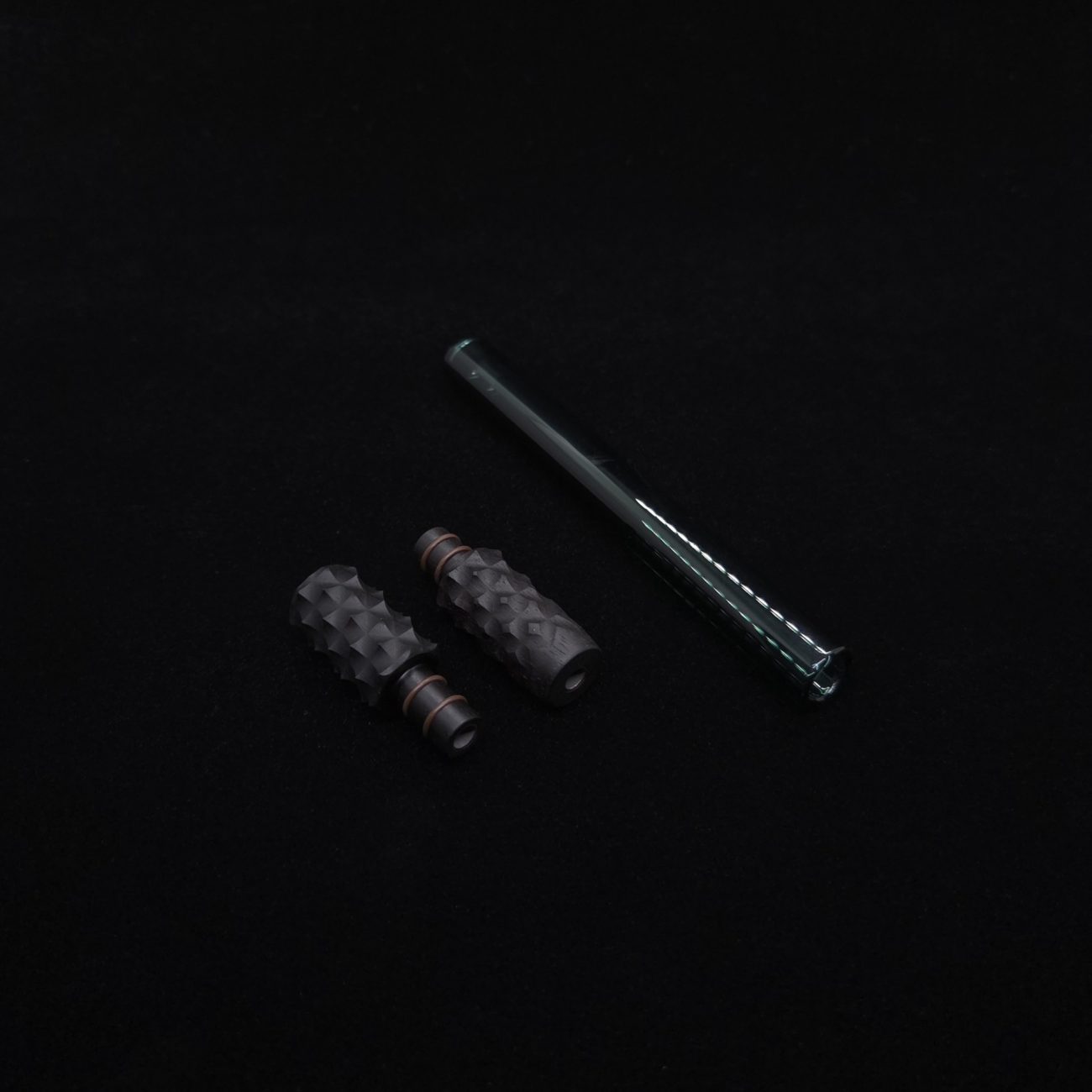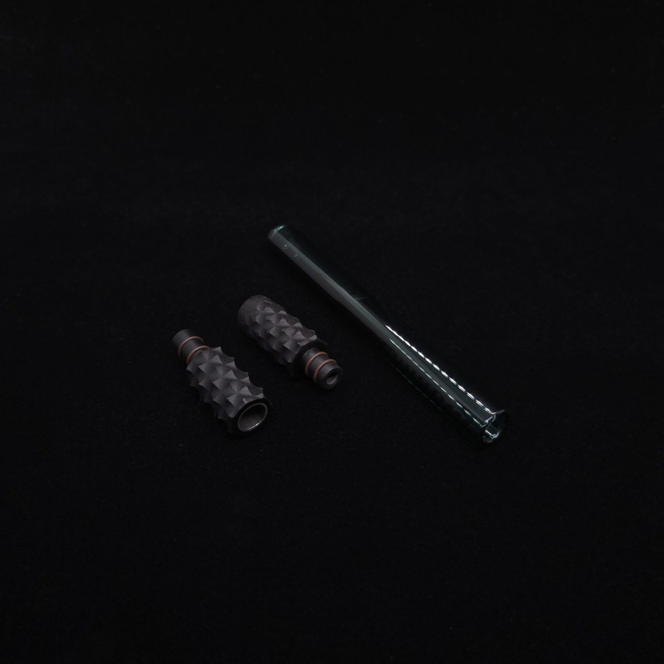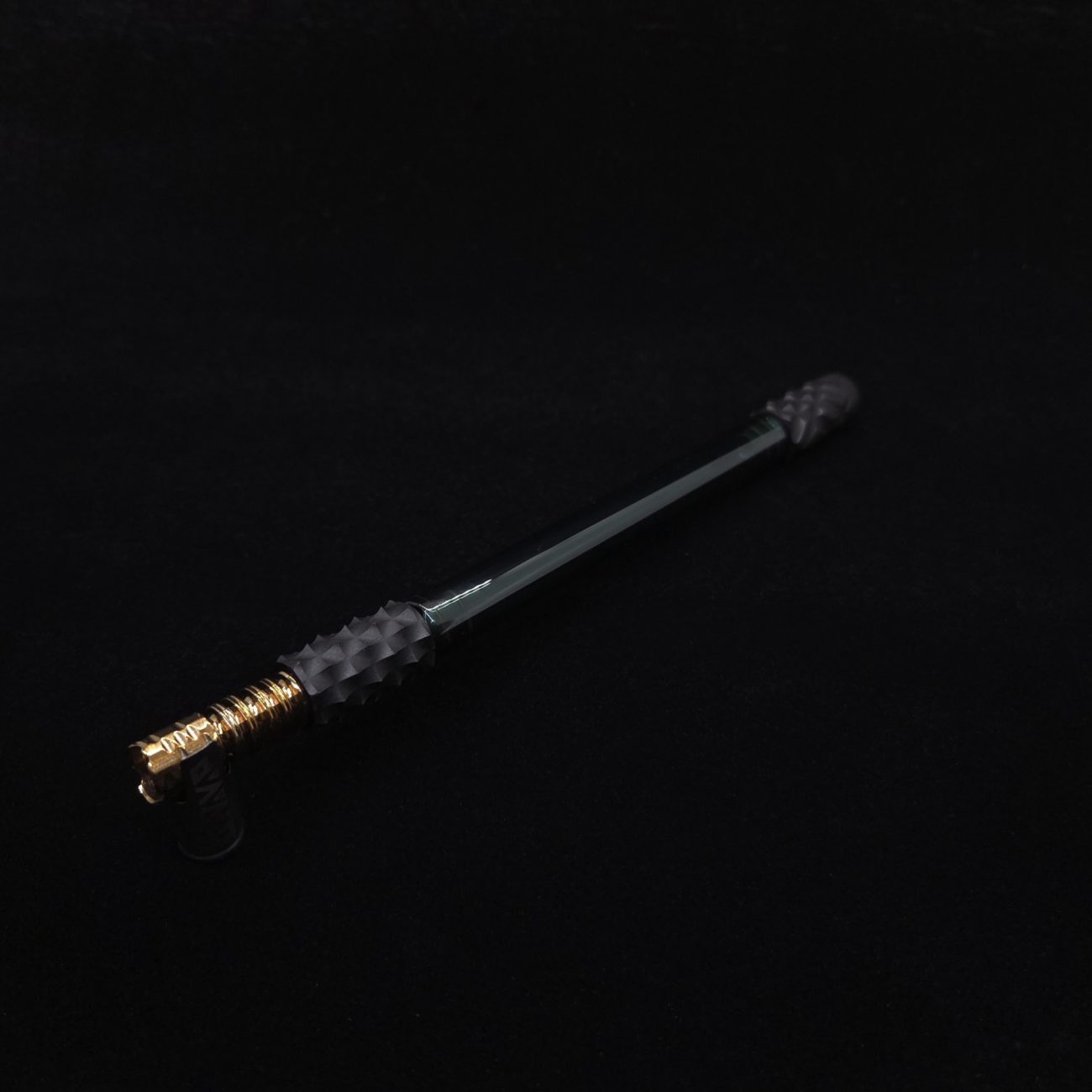 High quality, pure black ebony wood and green colored boro-glass/wood stem for Dynavap. This is a new standard length boro glass version done in a limited edition reaper design. Pulled from our reaper spine stem design, it has similar matching cuts on each end. This setup has 3 total pieces or sections. The tip end and mouthpiece end use two o-rings to connect inside the glass stem. The tip is lined with med grade stainless steel in 8mm to anodized titanium 5mm lining, allowing for maximum draw. The mouthpiece is lined with the same anodized titanium 5mm tubing. Glass tube is high quality borosilicate glass that is rigid yet light weight in a green colored version. Stem pieces have been finished with a satin finish polishing which is all natural. Stem pieces will come with (4) high-temp o-rings pre-installed and extra set of high-temp o-rings.