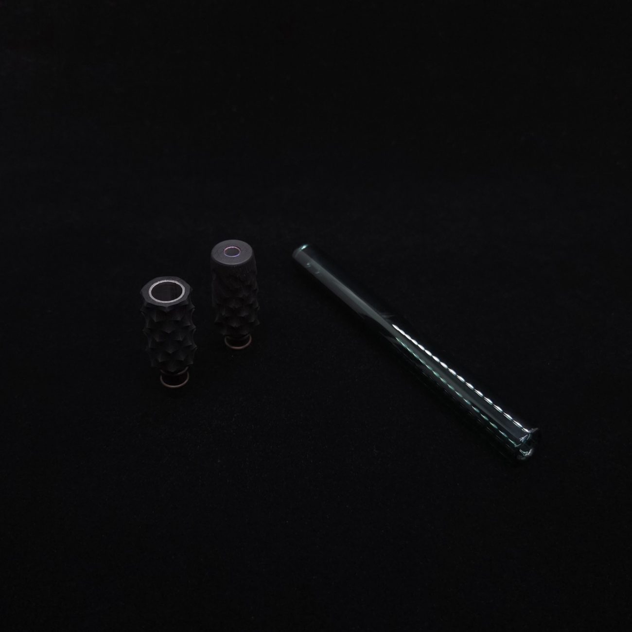 - Black Ebony wood tip adapter/lined with med-grade stainless steel/anodized titanium liners