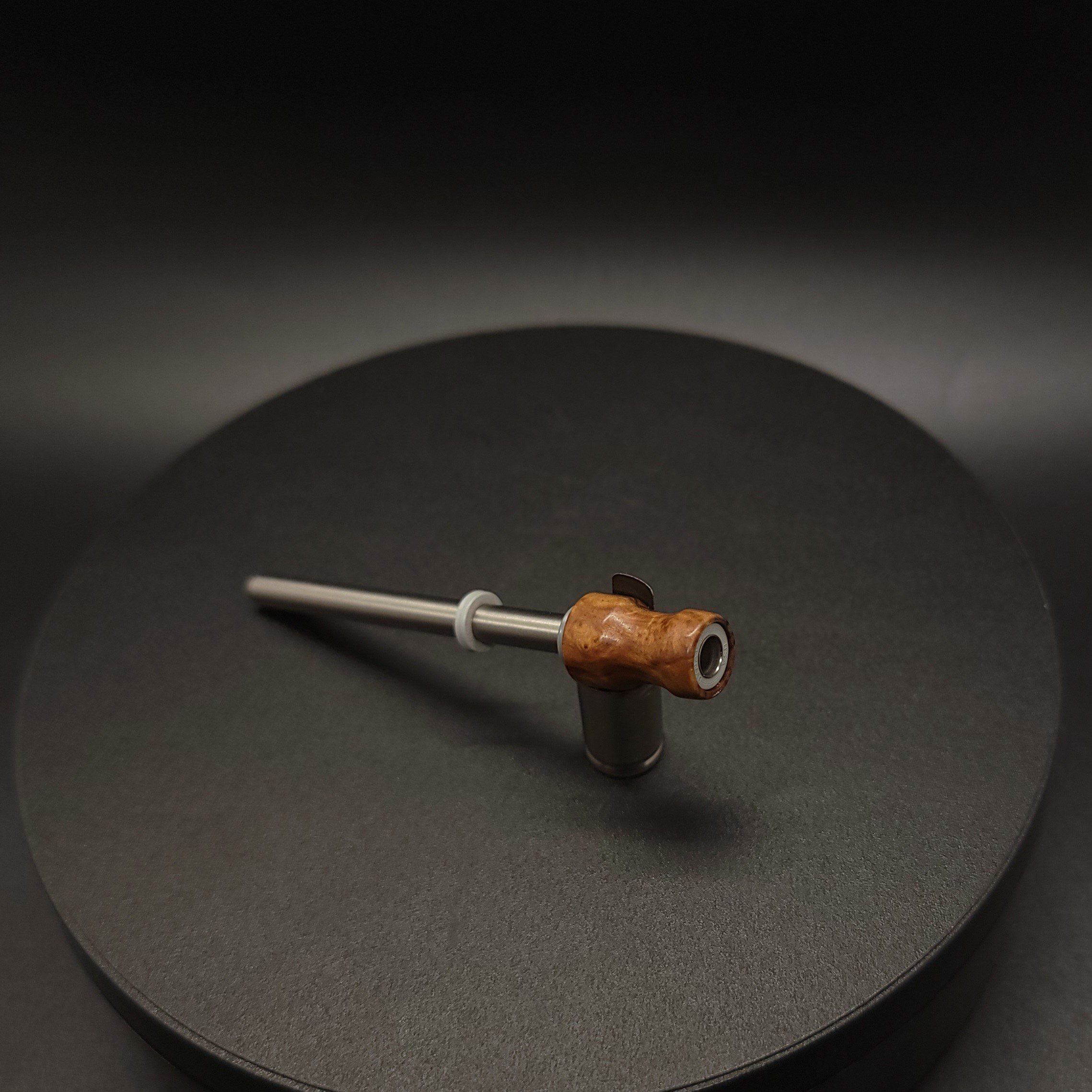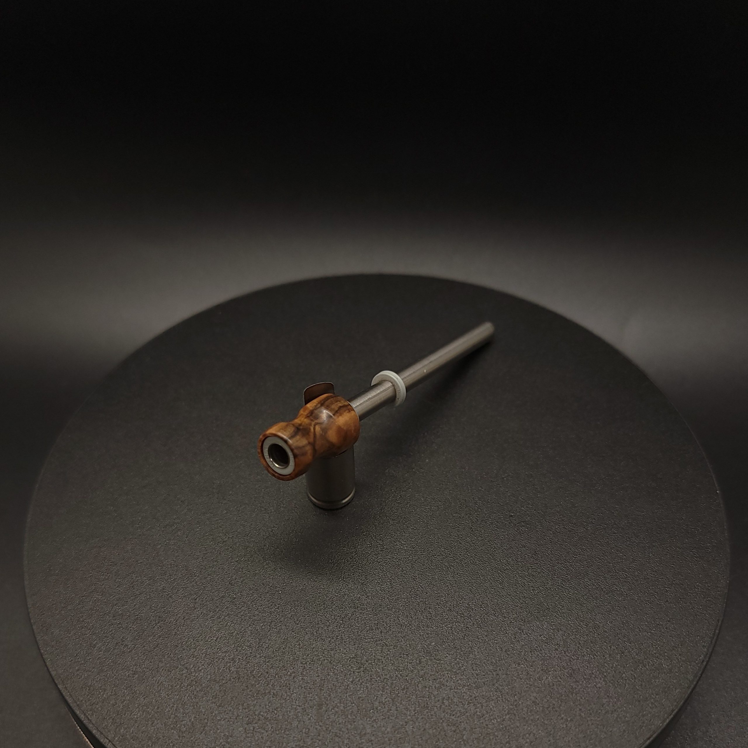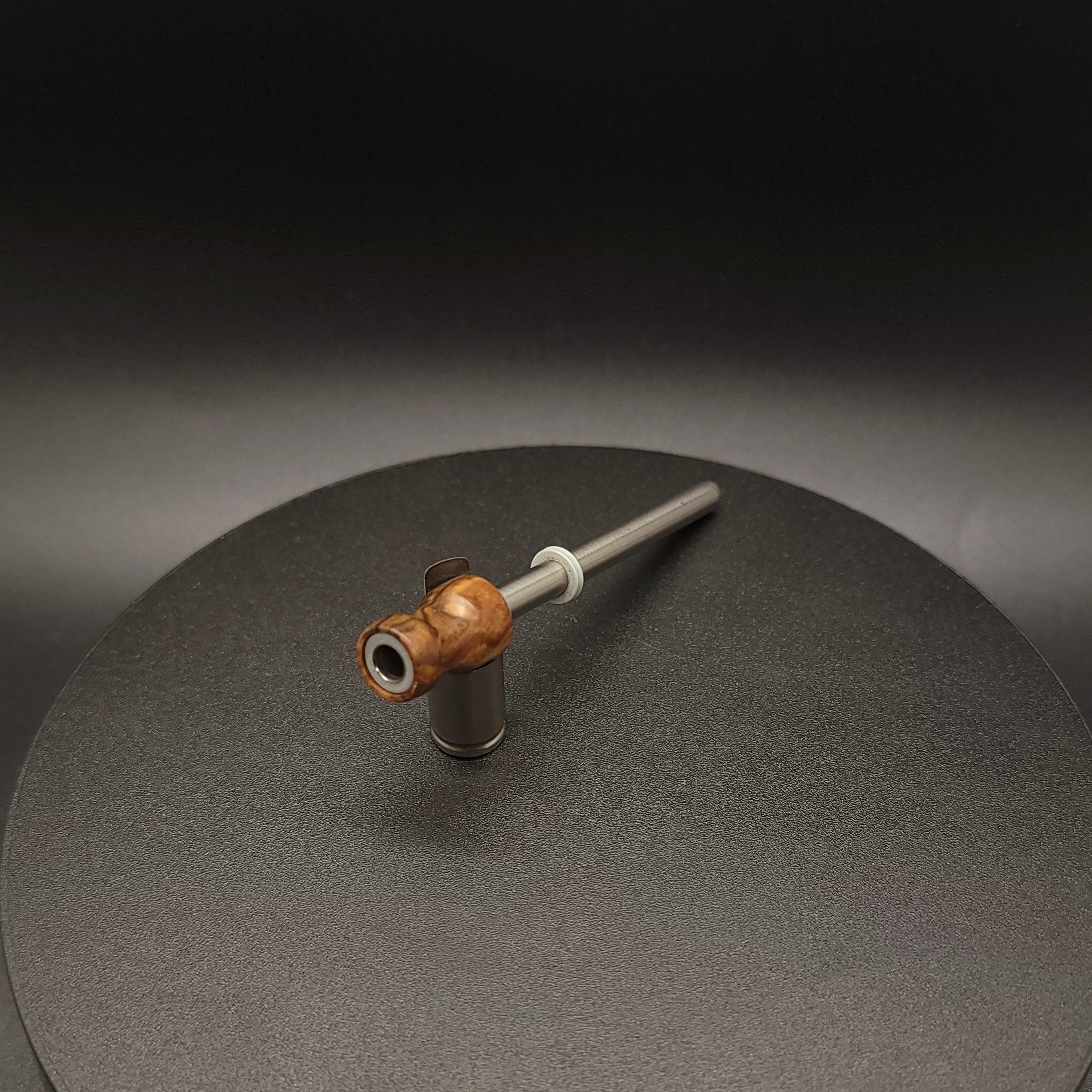 This spinning mouthpiece is made from a solid piece of graybox burl wood. As part of our new line of mouthpieces this acts as a replacement or upgrade to your current stem setup. It operates in the same way as the factory wooden mouthpieces you get from Dynavap. It has been stabilized along with precision drilled holes added to fit the condensers perfectly.