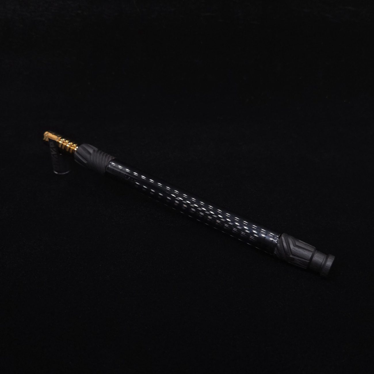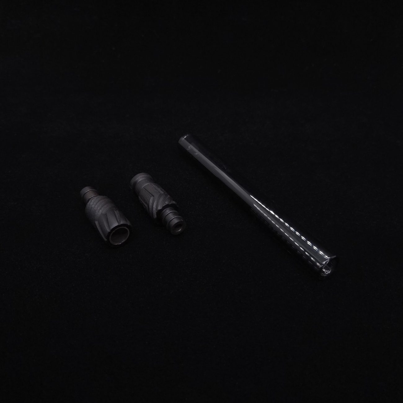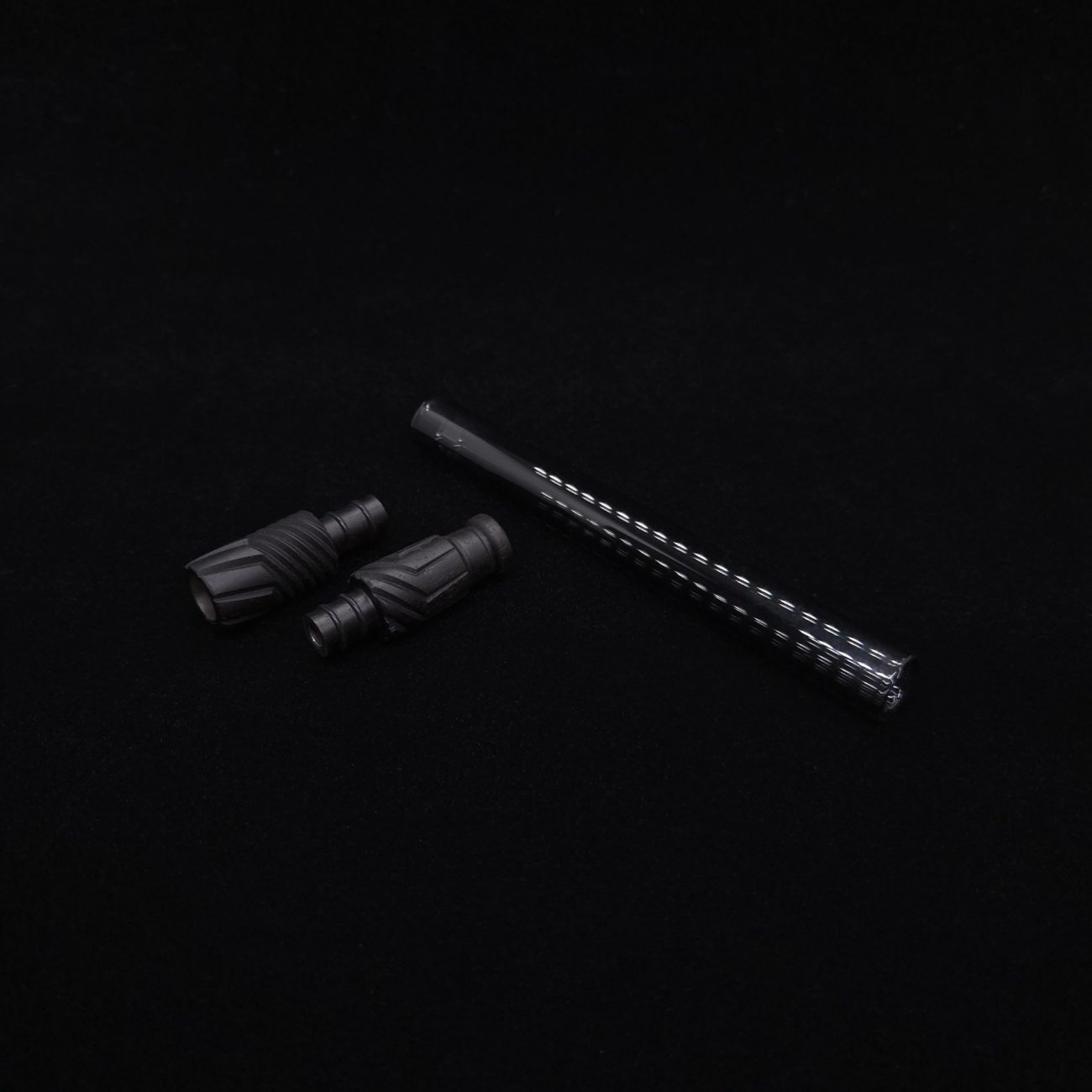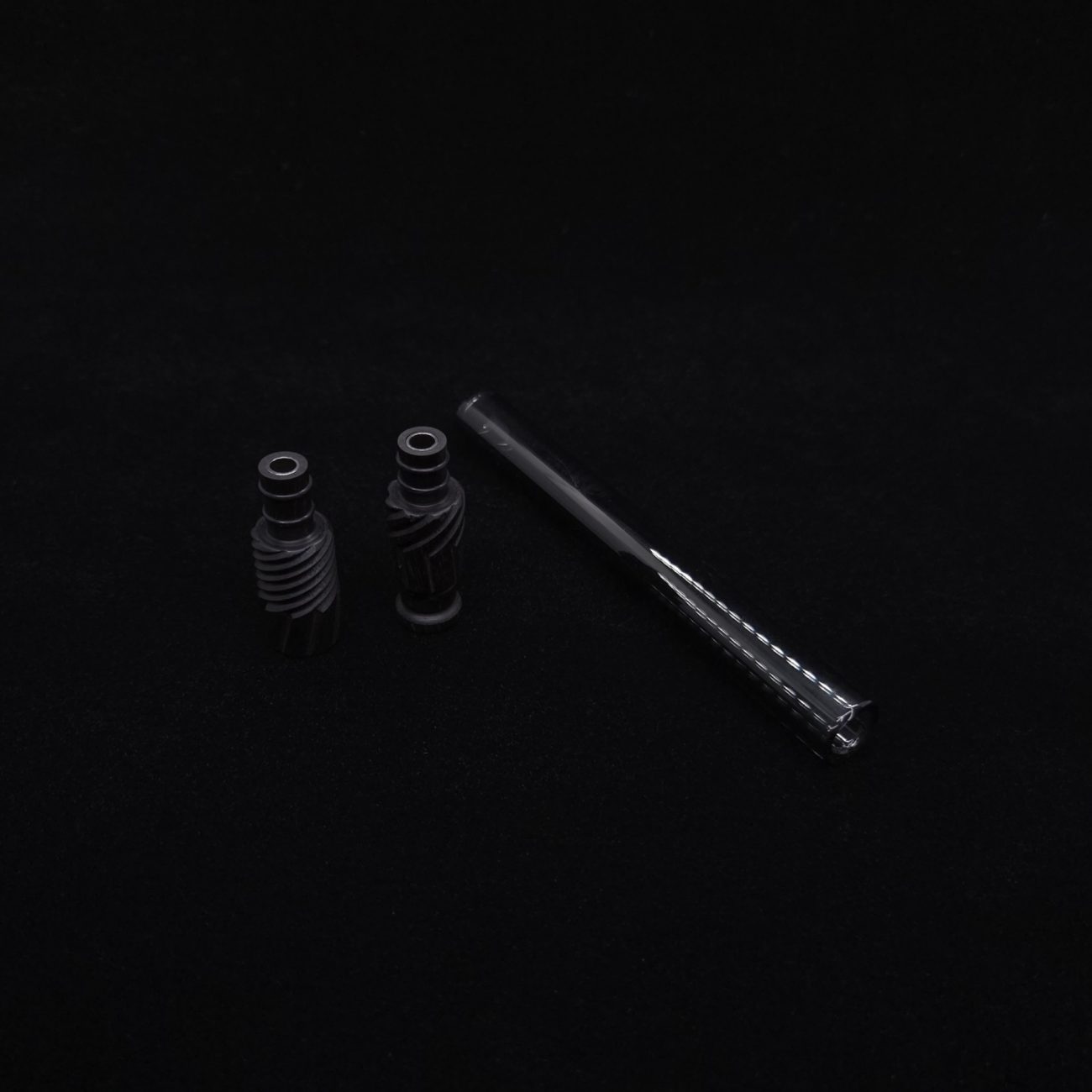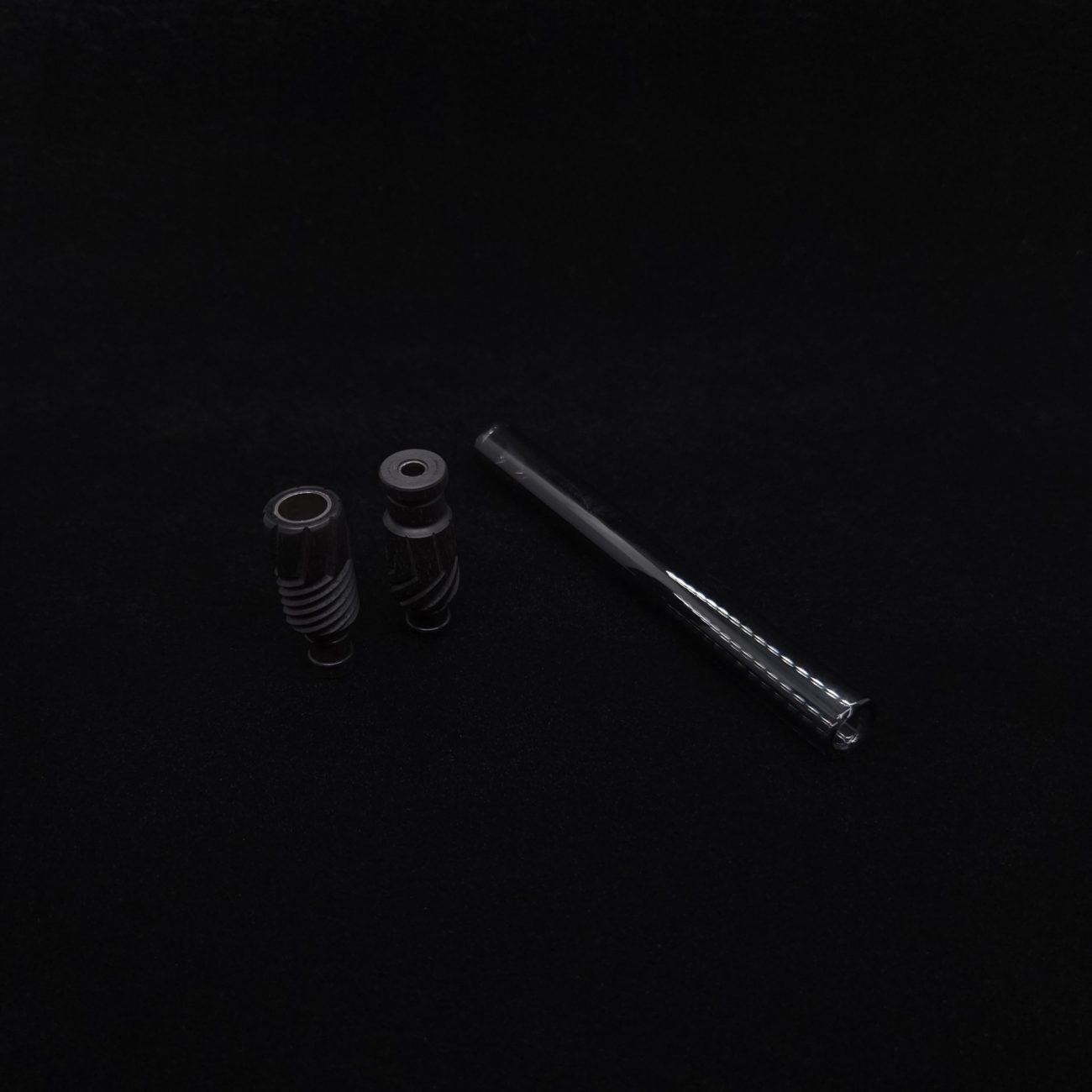 High quality pure black ebony wood smoke color boro-glass/wood stem for Dynavap. This is a new standard length boro glass version done in a limited edition vertex design. Pulled from our vertex stem design, it has similar matching cuts on each end. This setup has 3 total pieces or sections. The tip end and mouthpiece end use two o-rings to connect inside the glass stem. The tip is lined with med grade stainless steel in 8mm to 5mm allowing for maximum draw. The mouthpiece is lined with the same 5mm tubing. Glass tube is high quality borosilicate glass that is rigid yet light weight in a blacked out smoke color version. Stem pieces have been finished with a satin finish polishing which is all natural. Stem pieces will come with (4) high-temp o-rings pre-installed and extra set of high-temp o-rings.