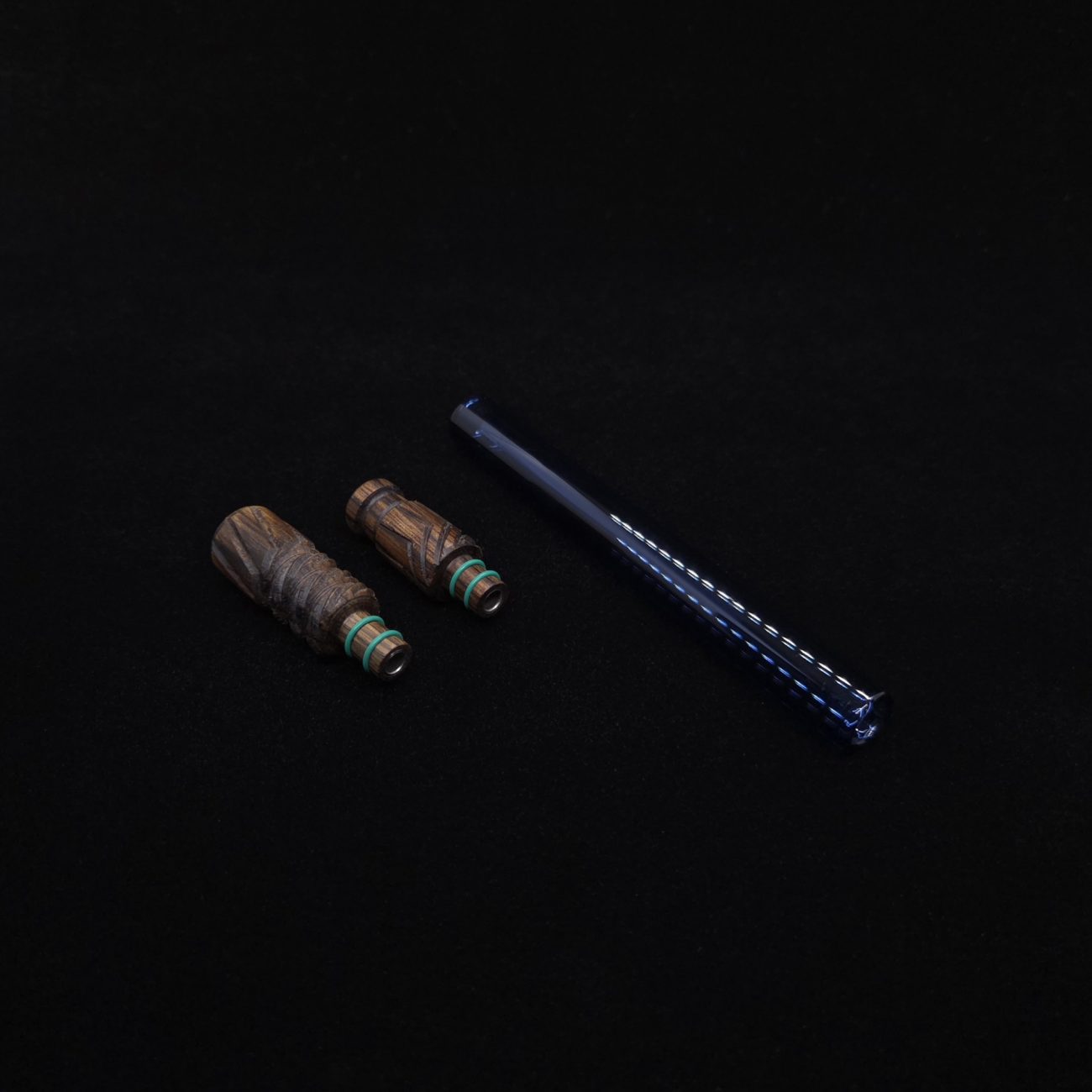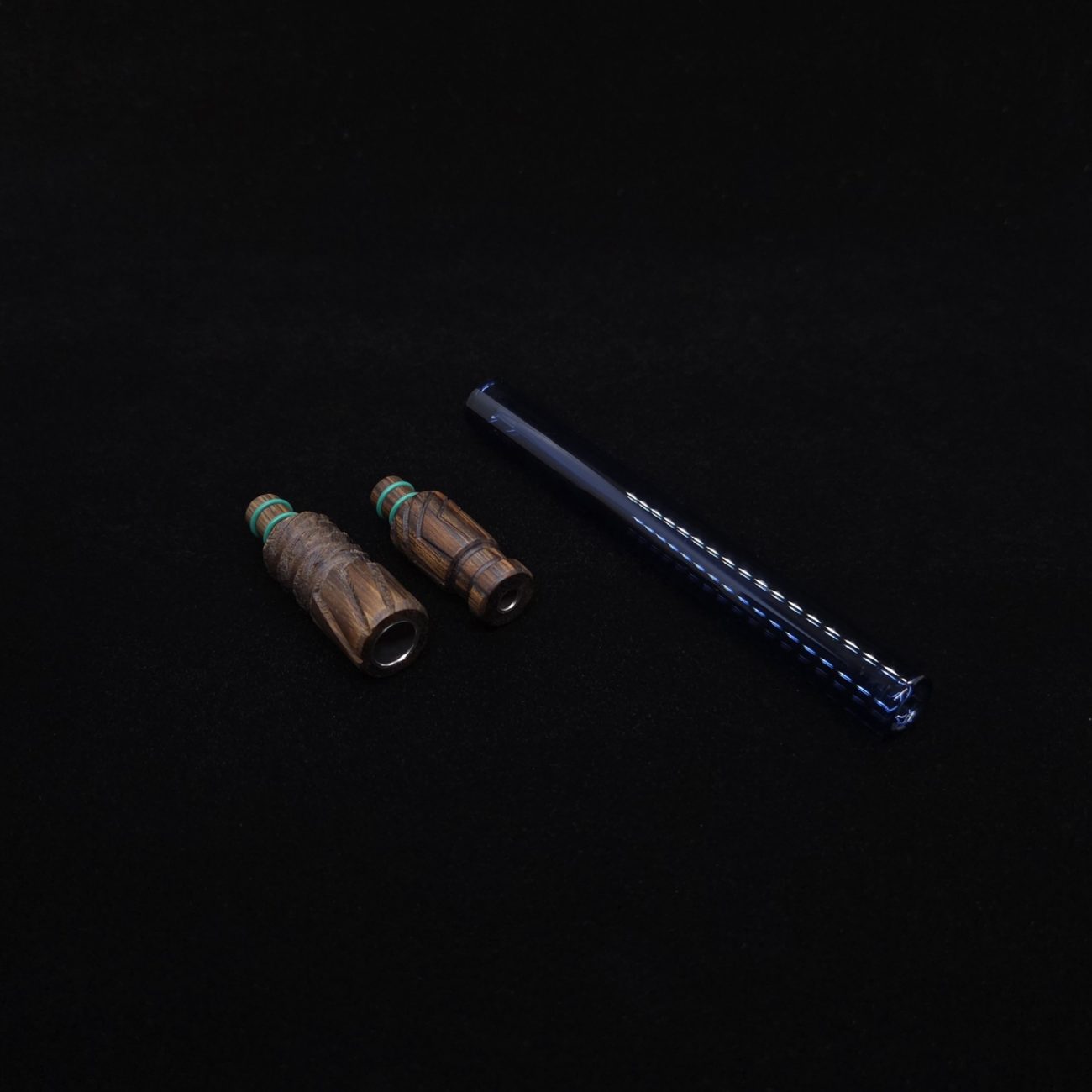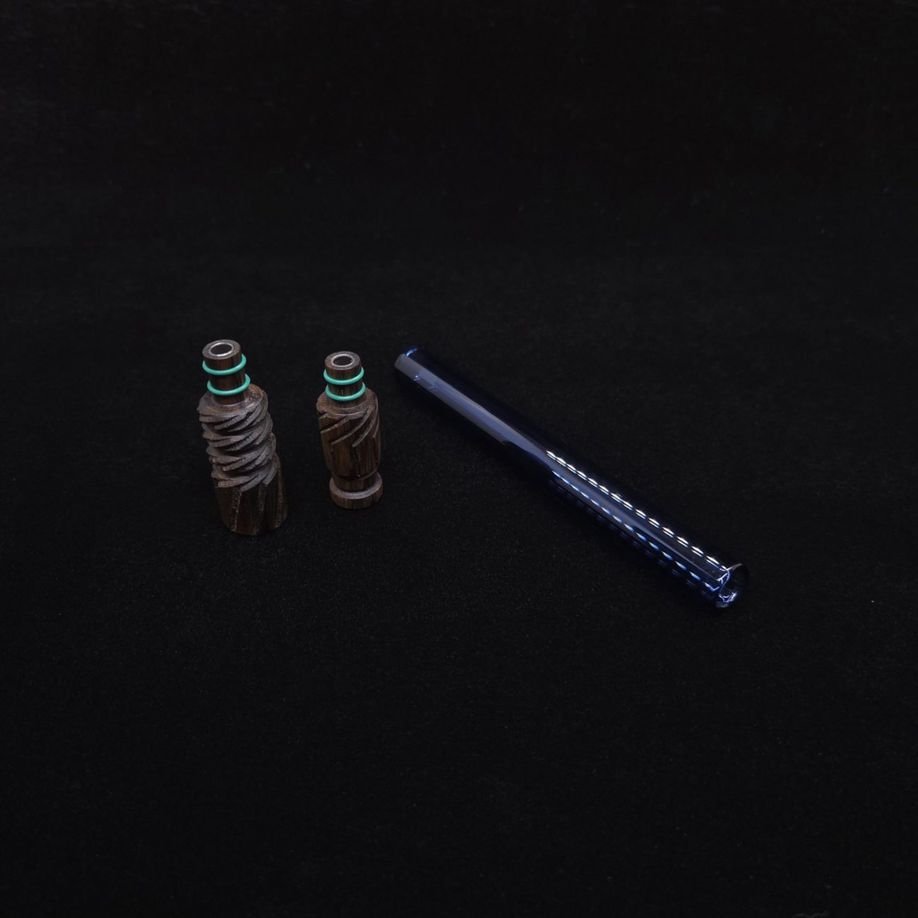 High quality black limba wood smoke color boro-glass/wood stem for Dynavap. This is a new standard length boro glass version done in a limited edition vertex design. Pulled from our vertex stem design, it has similar matching cuts on each end. This setup has 3 total pieces or sections. The tip end and mouthpiece end use two o-rings to connect inside the glass stem. The tip is lined with med grade stainless steel in 8mm to 5mm allowing for maximum draw. The mouthpiece is lined with the same 5mm tubing. Glass tube is high quality borosilicate glass that is rigid yet light weight in a blue colored version. Stem pieces have been finished with a satin finish polishing which is all natural. Stem pieces will come with (4) high-temp o-rings pre-installed and extra set of high-temp o-rings.