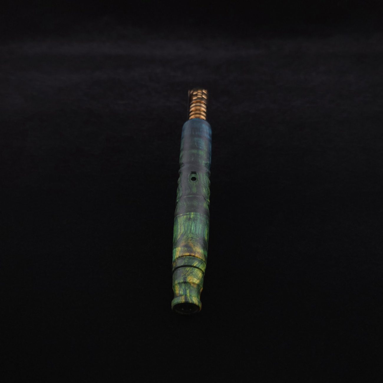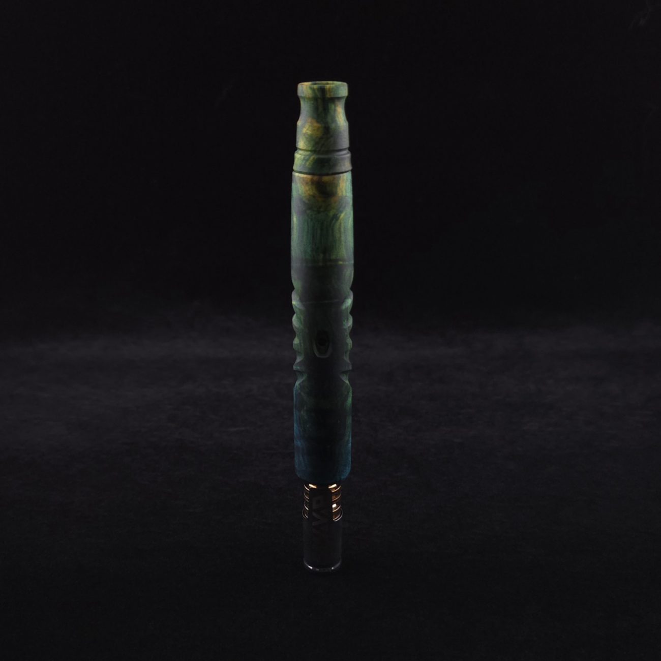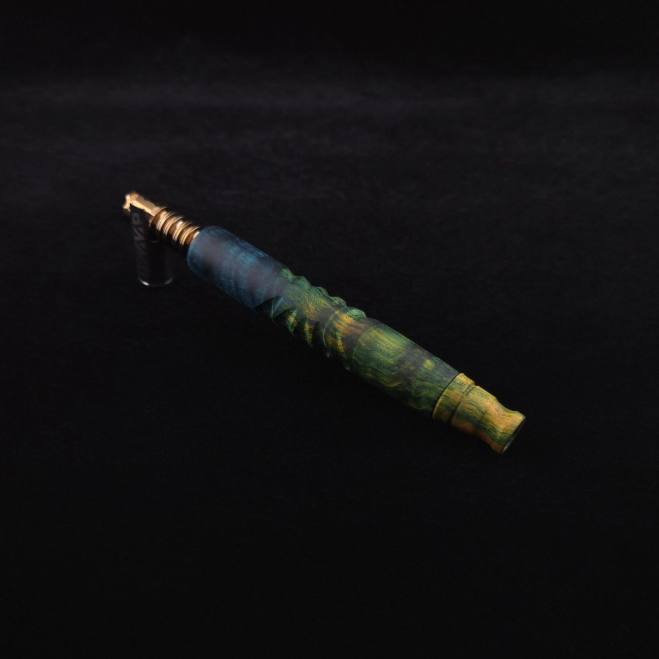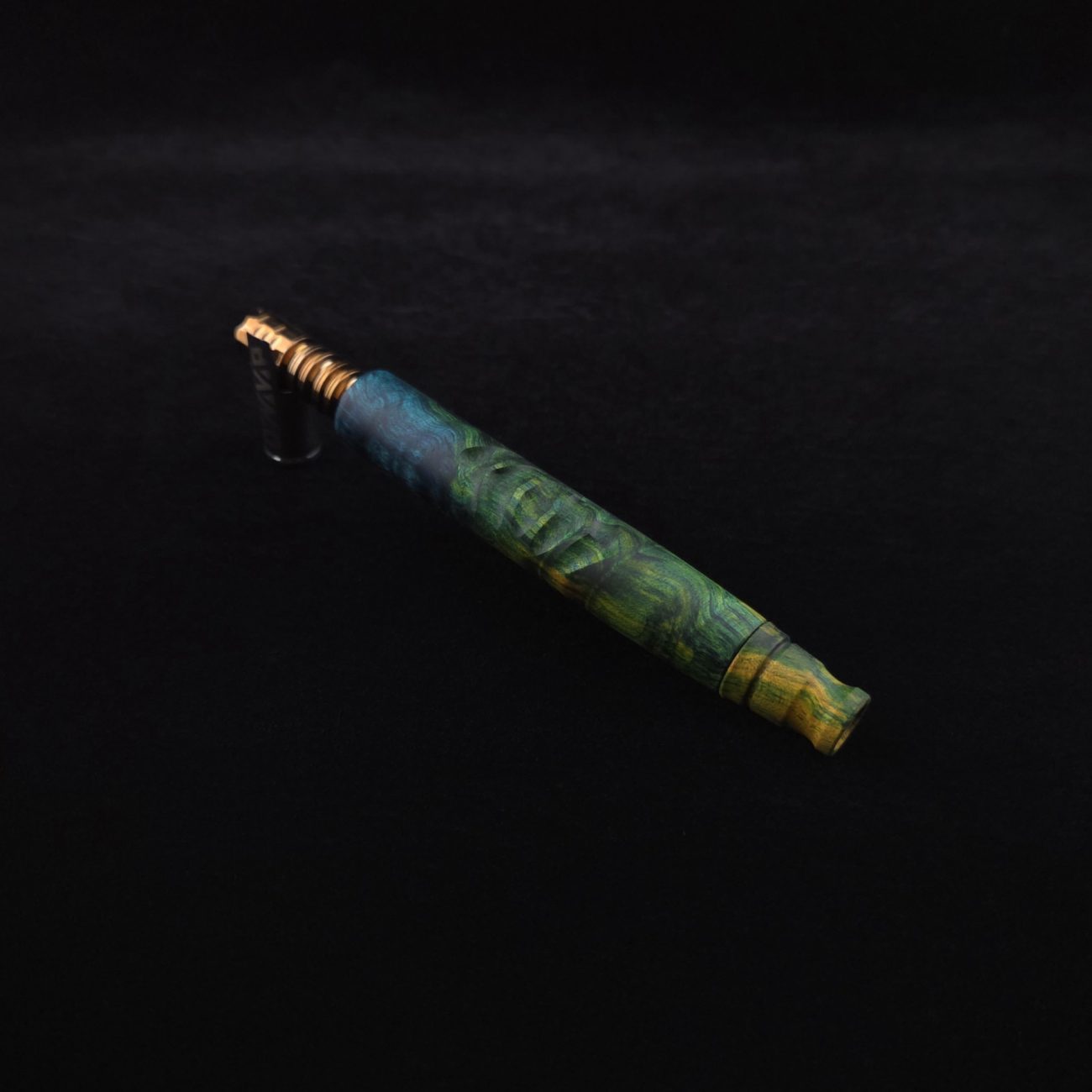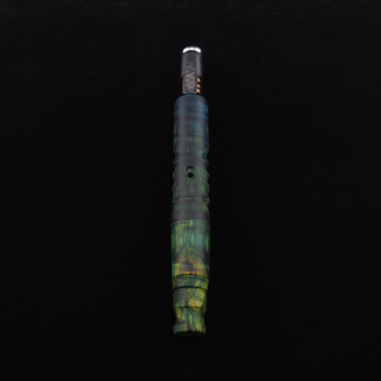 High quality, quilted maple burl wood XL length stem for Dynavap components. Burl has been triple dyed in golden, green and blue colorings. This stem has a 2026 version #2 of our eclipse stem design with angled notches cut in along each side with ribbed out sections centered on each side. Ver. #2 eclipse air-port design has been placed in the center with an oval coffin shape and wide 4mm hole for more airflow. Book-matched spinning mouthpiece can be used with any 14mm water pipe by sliding on the included o-ring. Stem functions with or without m.p. Stem has been finished with a smooth satin finish polishing which is all natural.