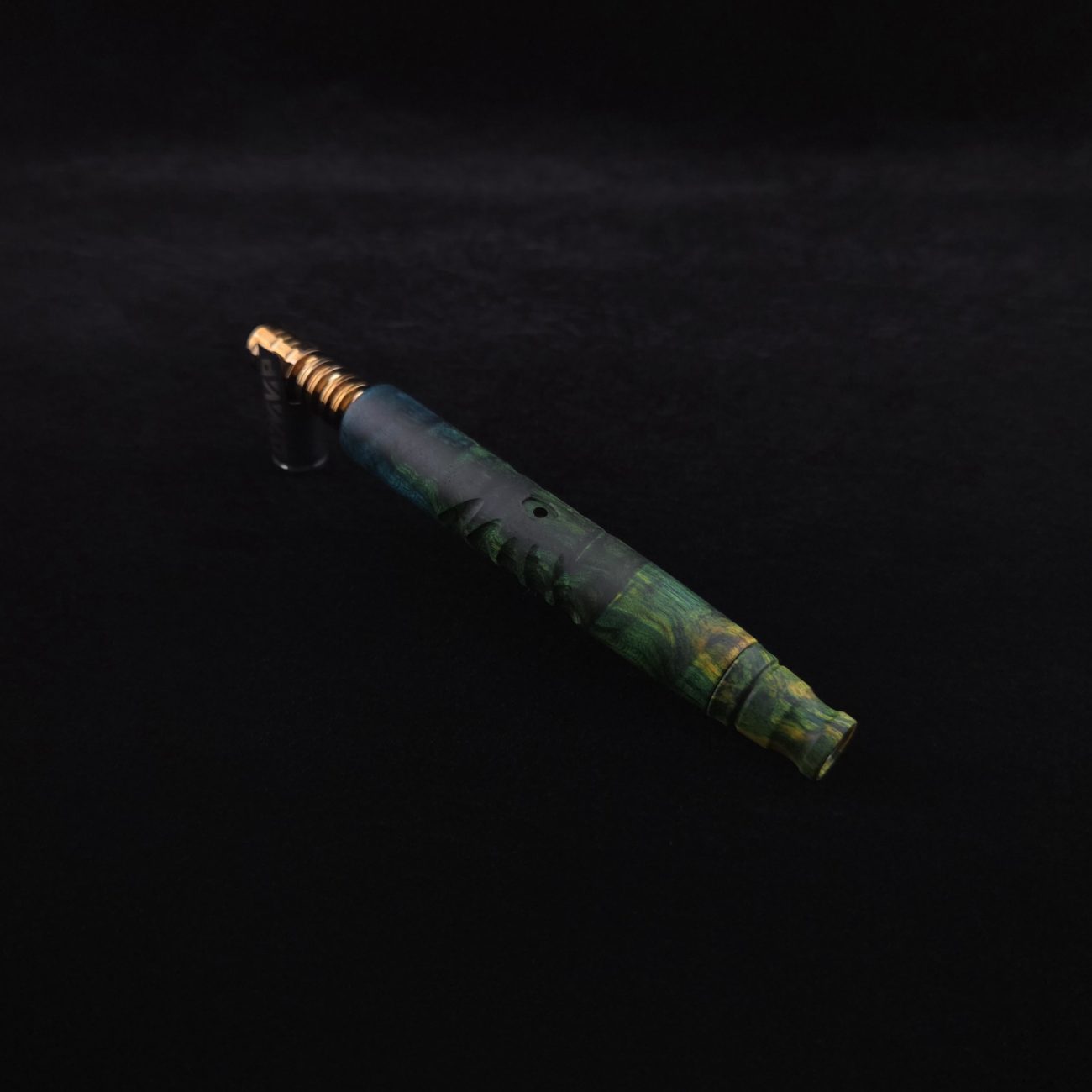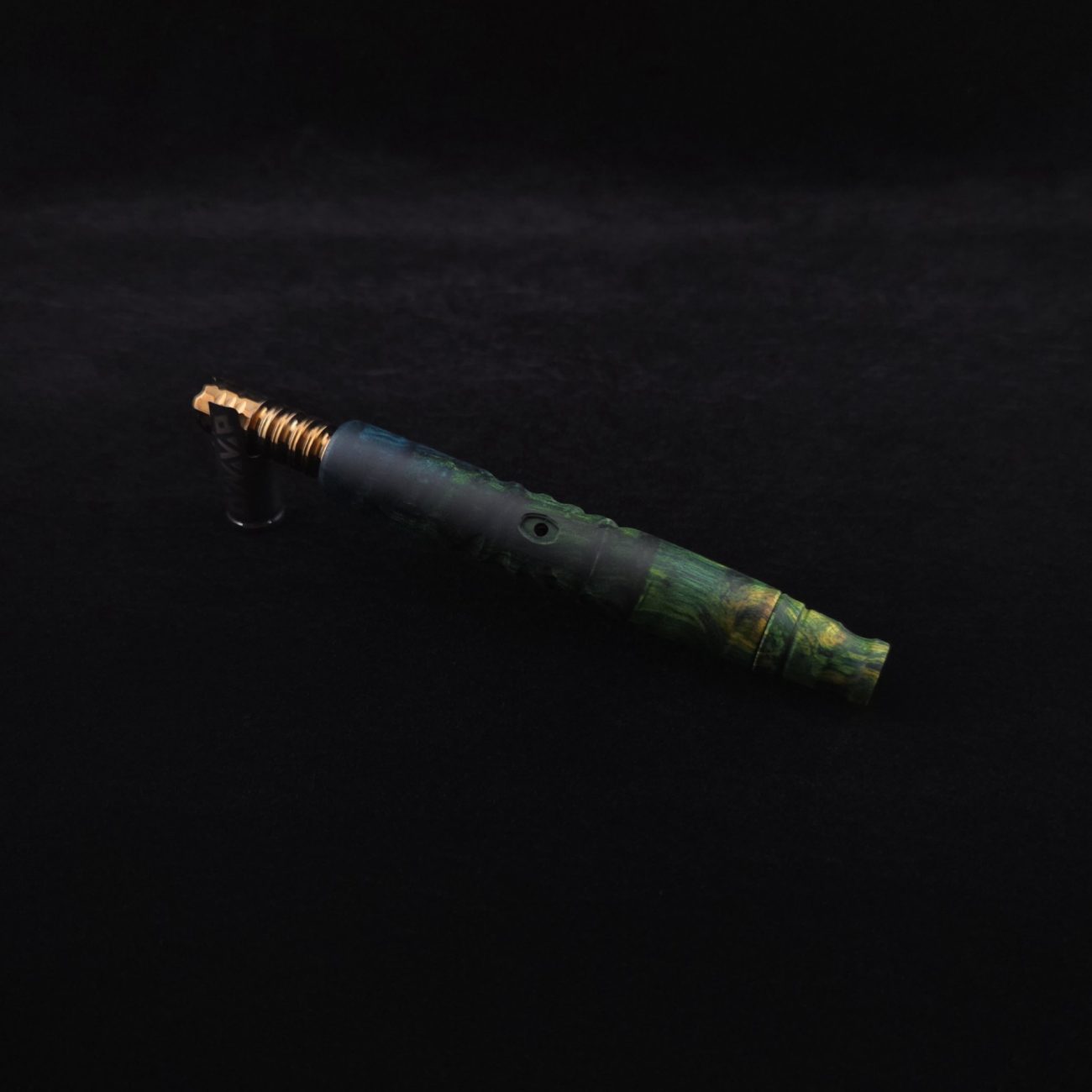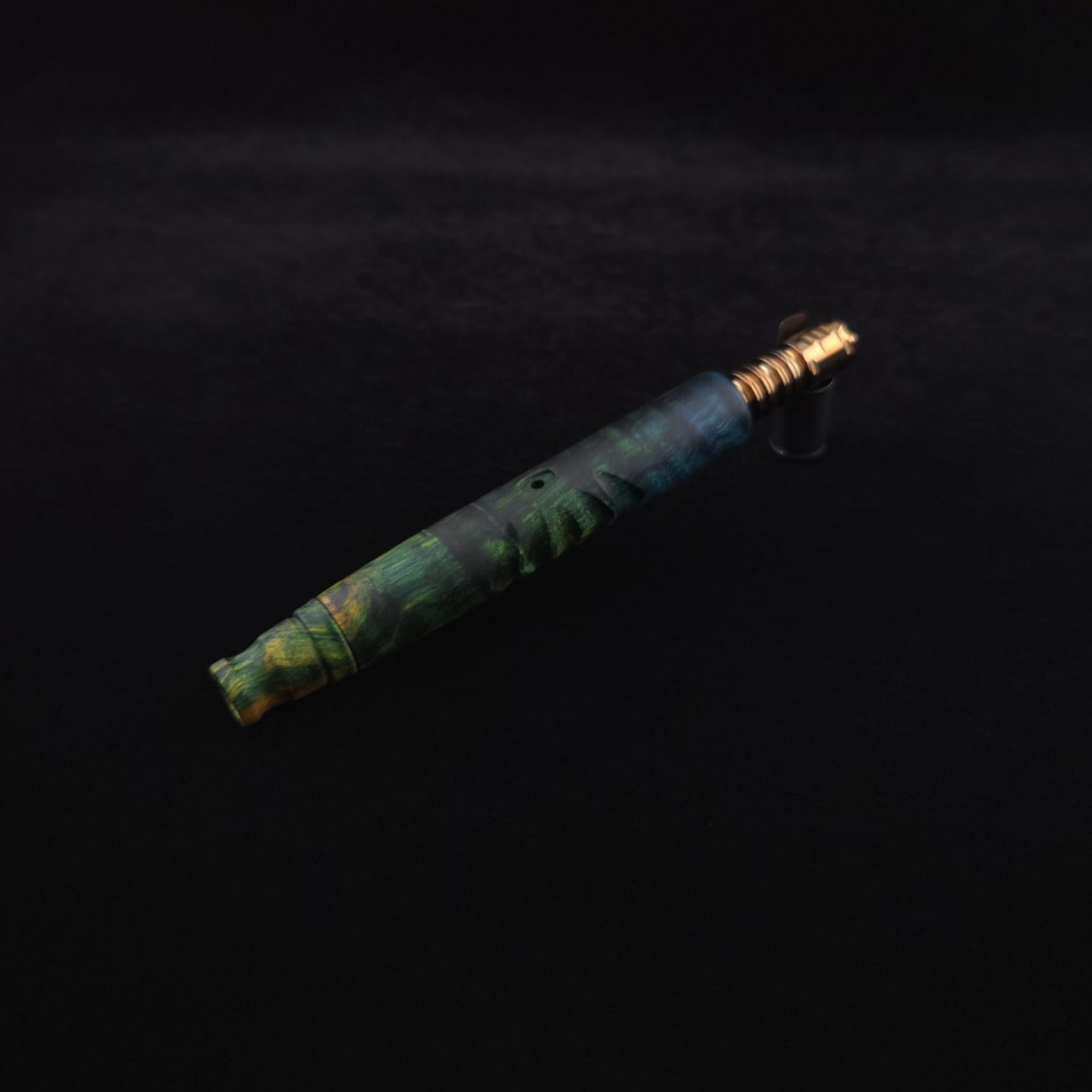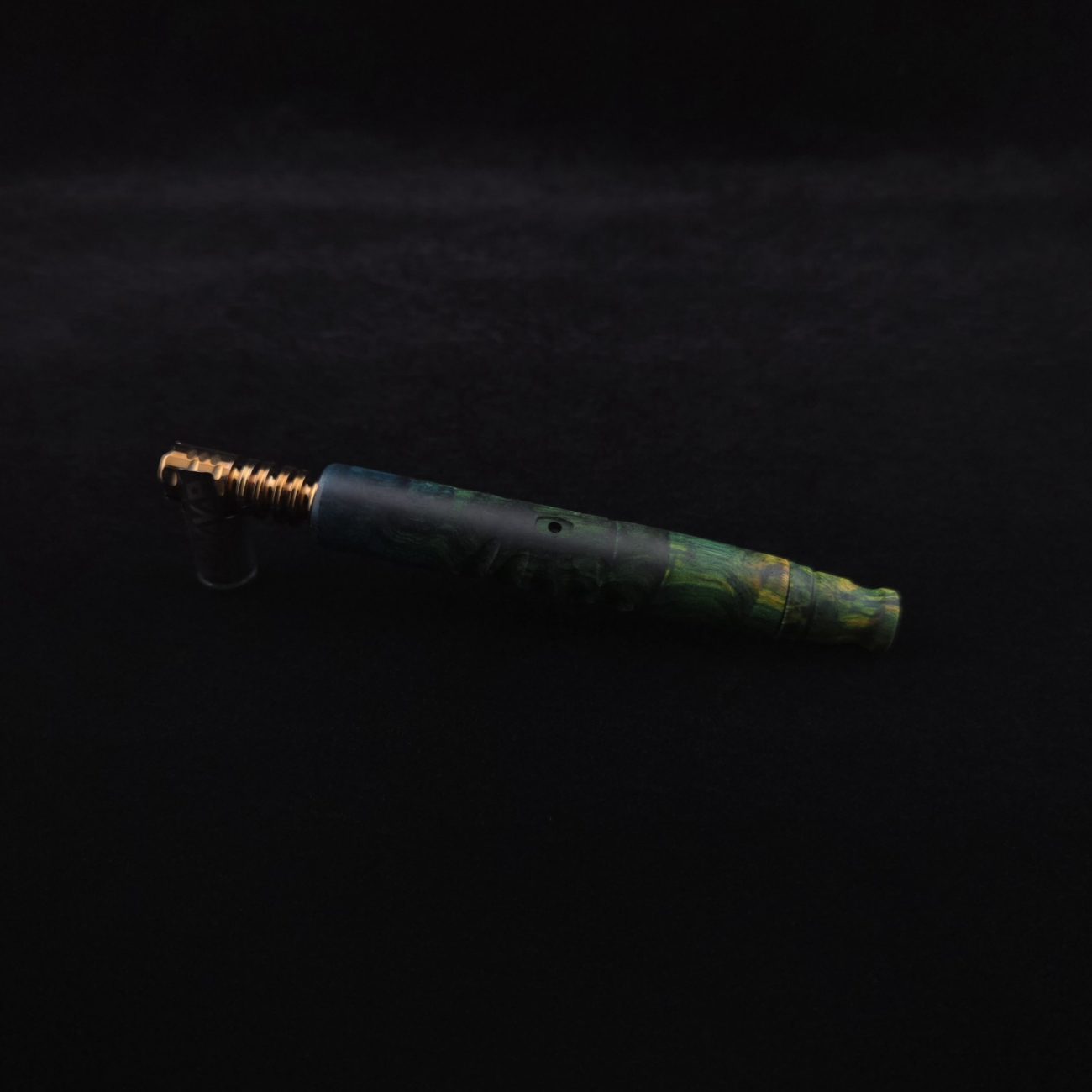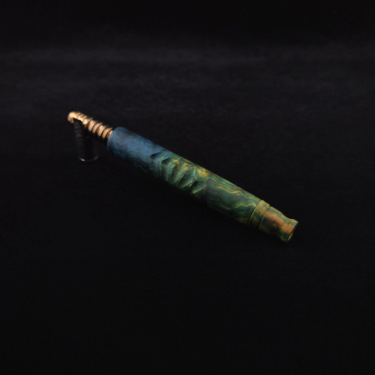 High quality, quilted maple burl wood XL length stem for Dynavap components. Burl has been triple dyed in golden, green and blue colorings. This stem has a 2026 version #2 of our eclipse stem design with angled notches cut in along each side with ribbed out sections centered on each side. Ver. #2 eclipse air-port design has been placed in the center with an oval coffin shape and wide 4mm hole for more airflow. Book-matched spinning mouthpiece can be used with any 14mm water pipe by sliding on the included o-ring. Stem functions with or without m.p. Stem has been finished with a smooth satin finish polishing which is all natural.