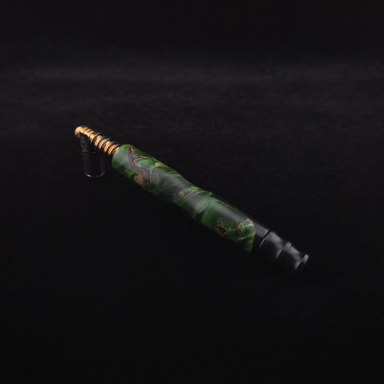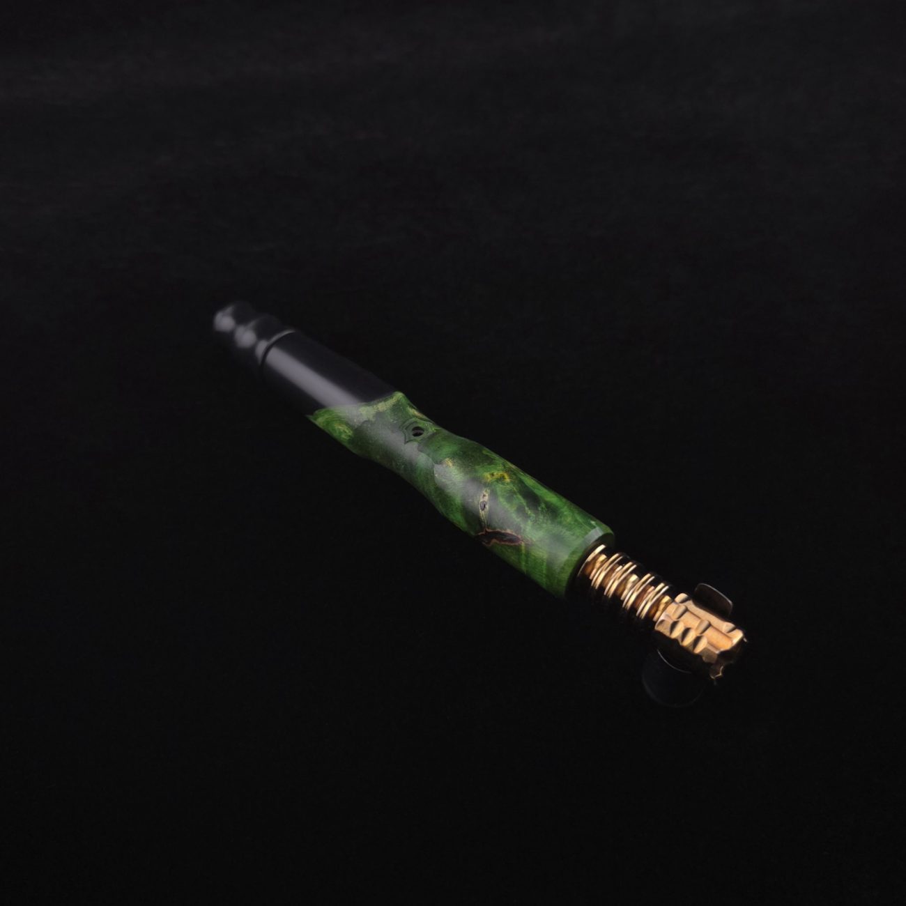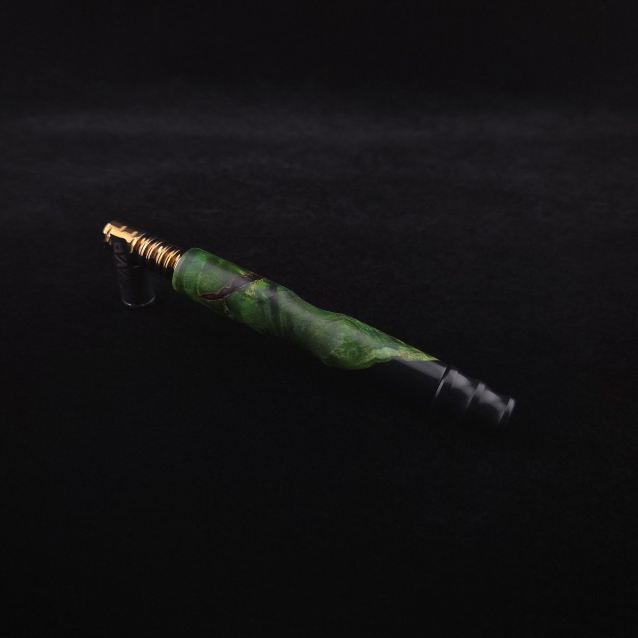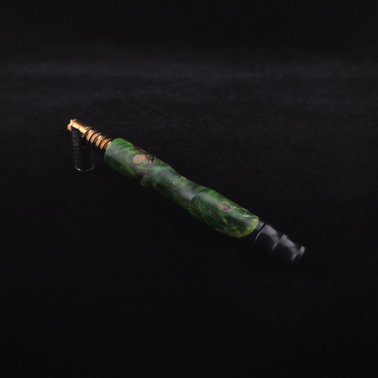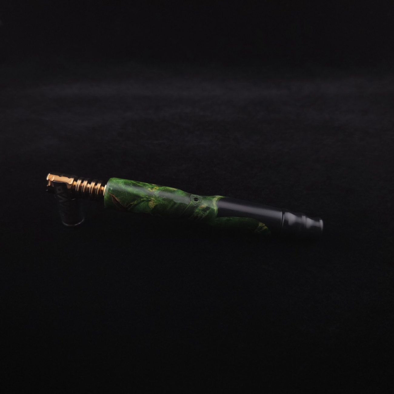 High quality, extreme figure buckeye burl wood hybrid XL length stem for Dynavap components. Burl has dyed a deep emerald green and a light green with natural brown/black coloring. Hybrid color is metallic midnight black. This is a new design having the hollowed, scooped out middle sections in the high class version and a centered air-port side oval design with max air-flow. Stem functions with or without m.p. Stem has been finished with a smooth satin finish polishing which is all natural and food safe.