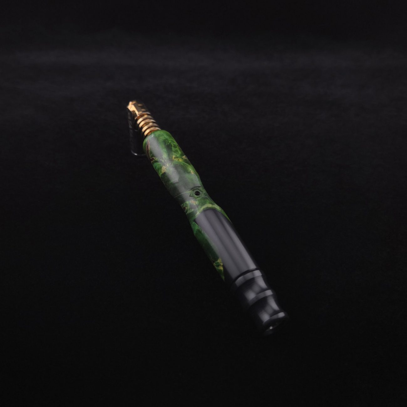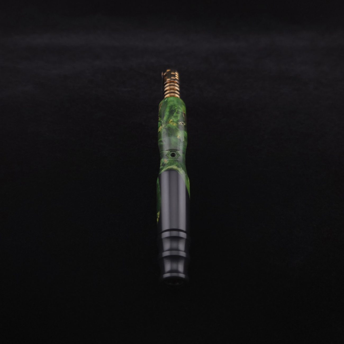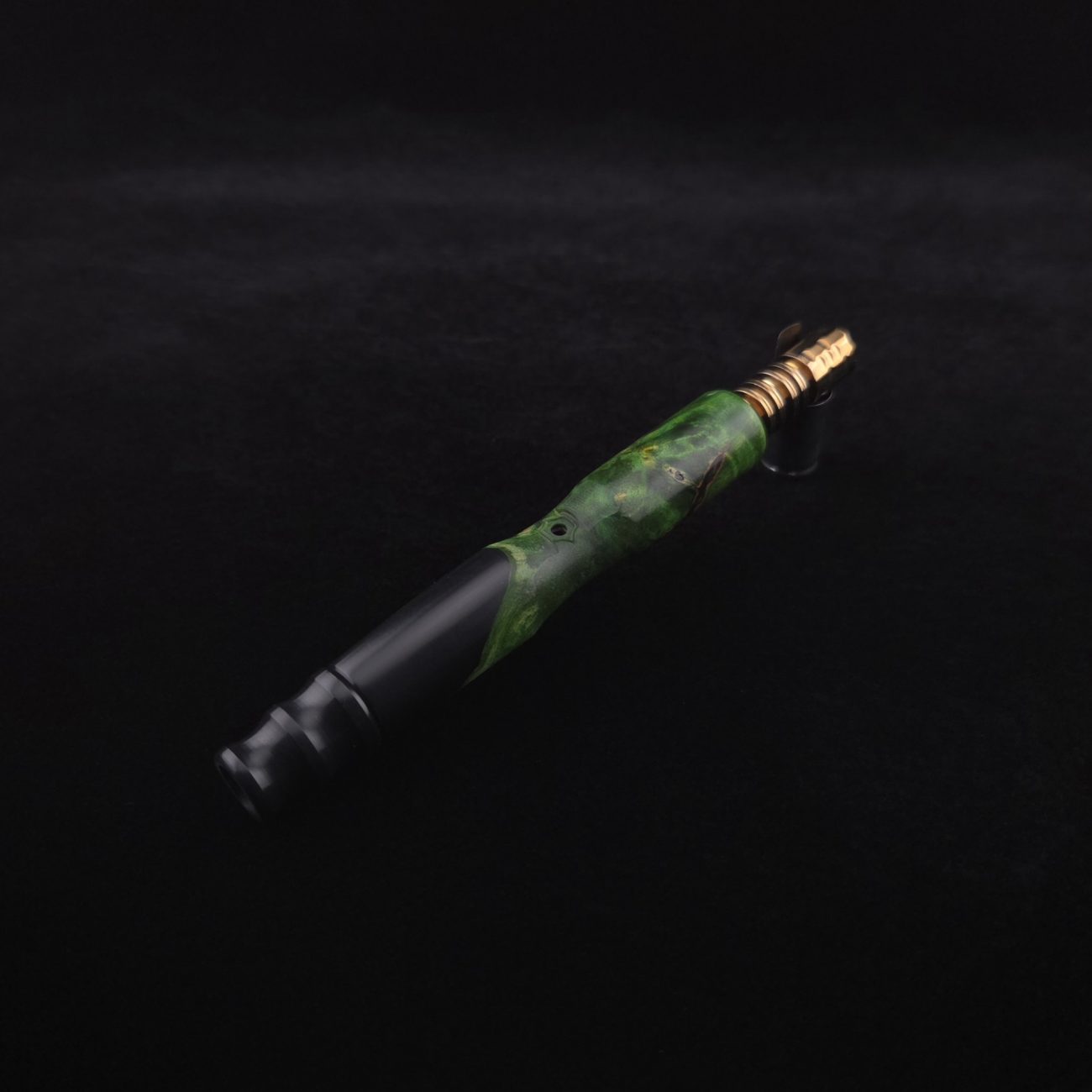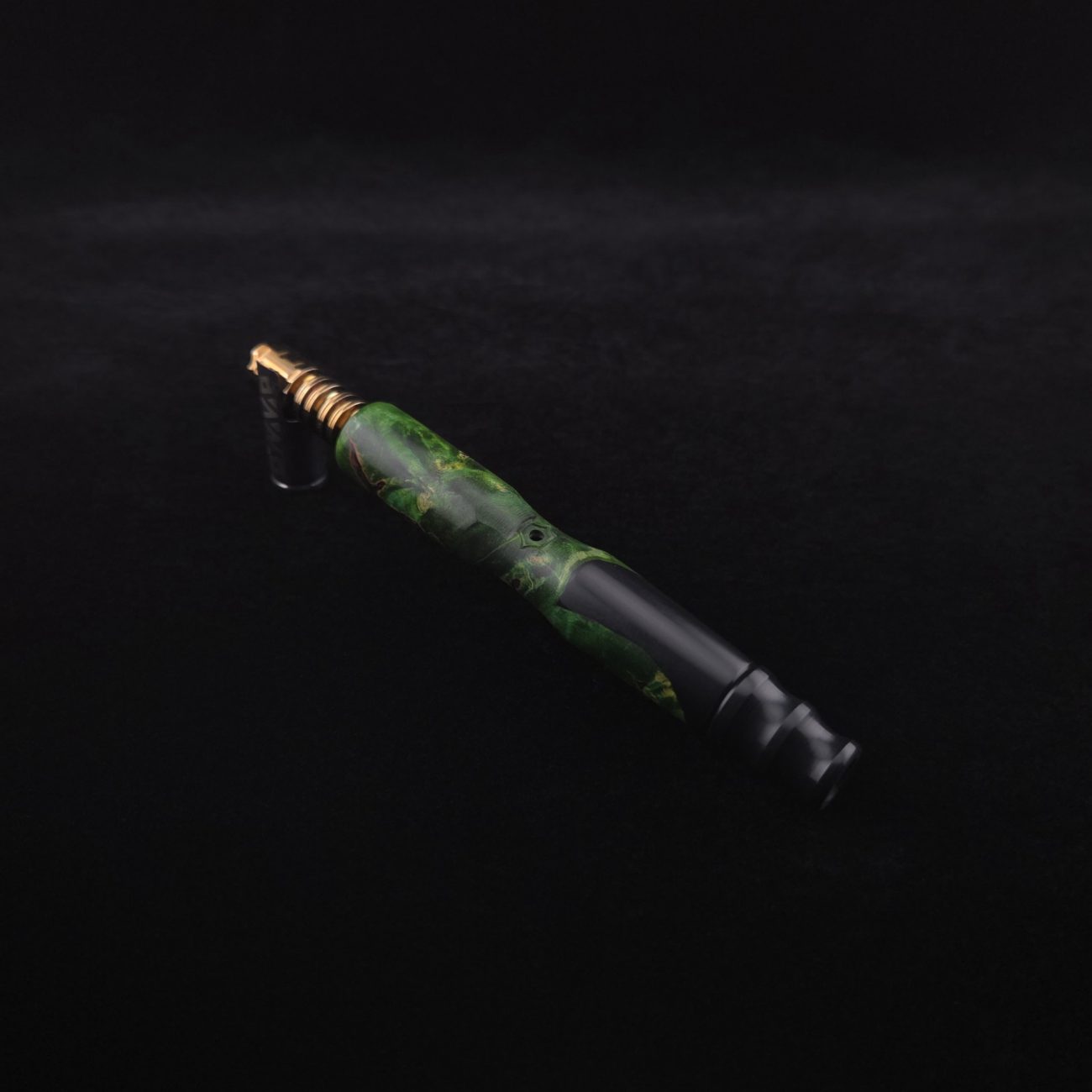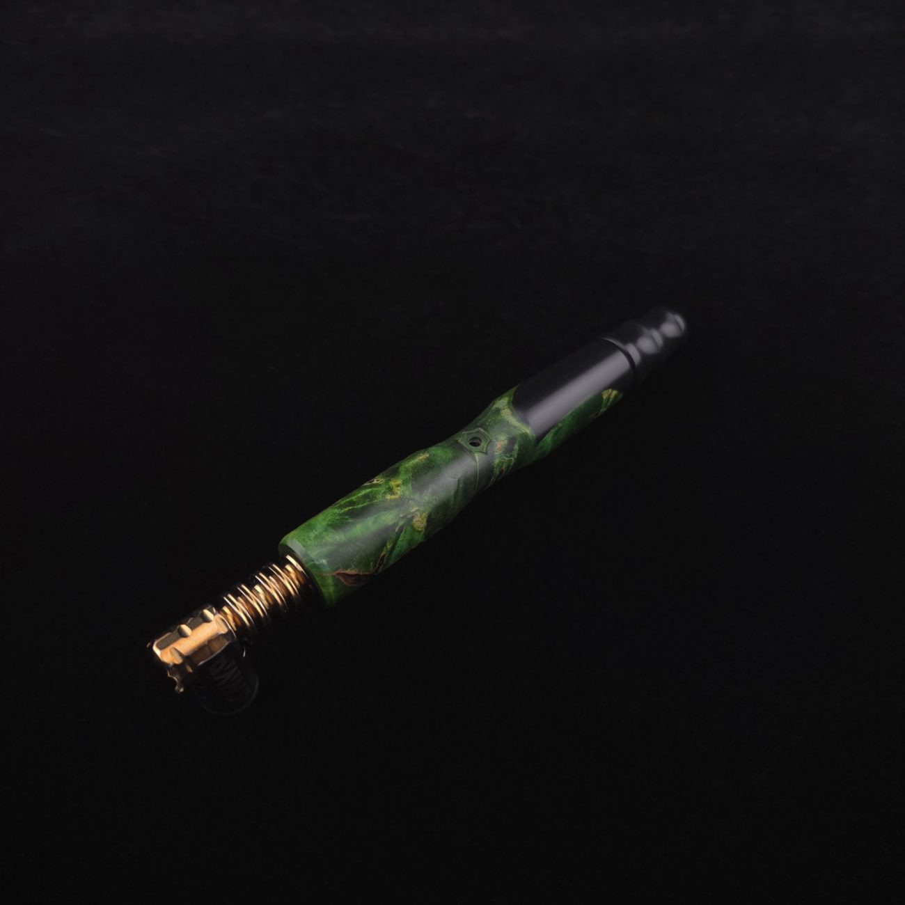 High quality, extreme figure buckeye burl wood hybrid XL length stem for Dynavap components. Burl has dyed a deep emerald green and a light green with natural brown/black coloring. Hybrid color is metallic midnight black. This is a new design having the hollowed, scooped out middle sections in the high class version and a centered air-port side oval design with max air-flow. Stem functions with or without m.p. Stem has been finished with a smooth satin finish polishing which is all natural and food safe.