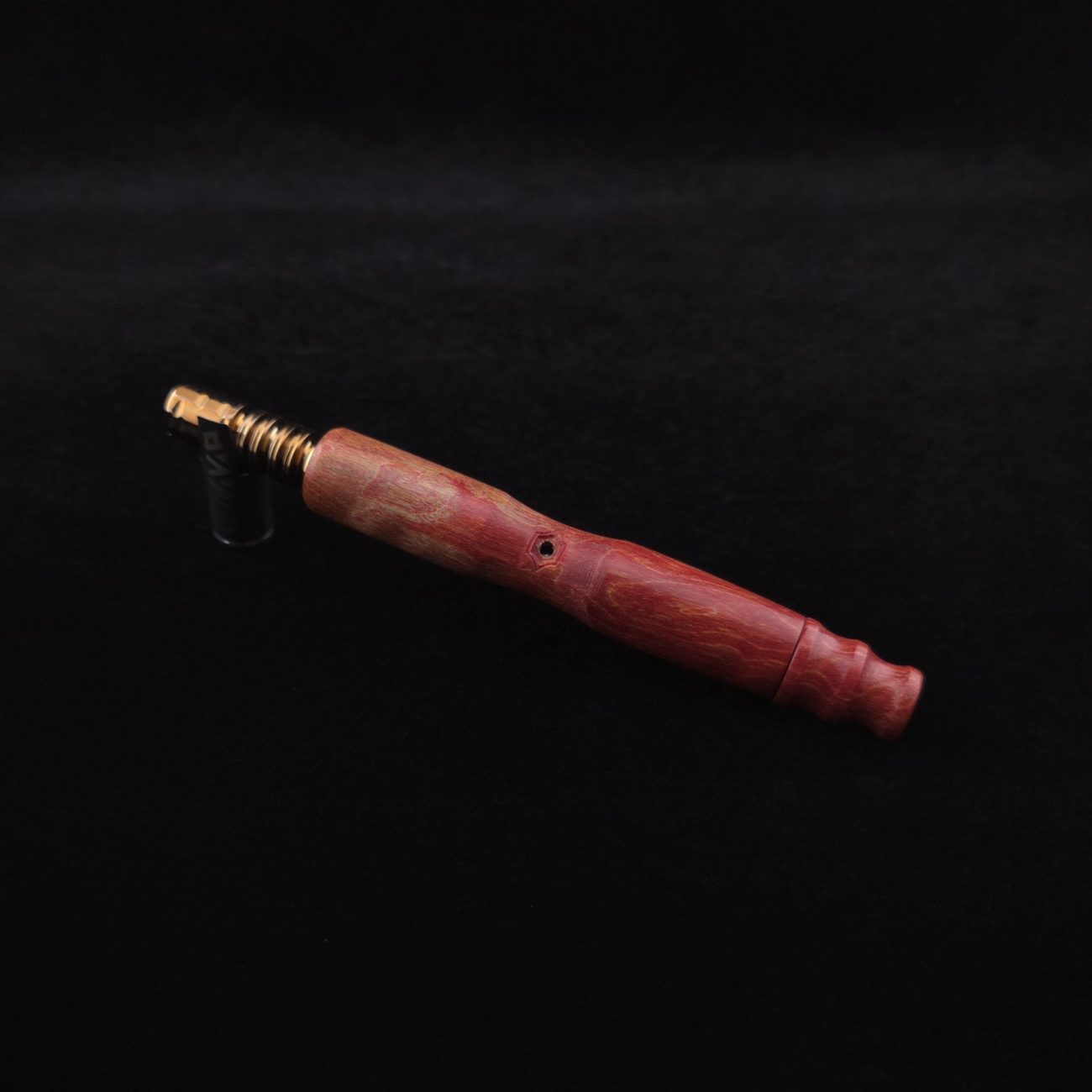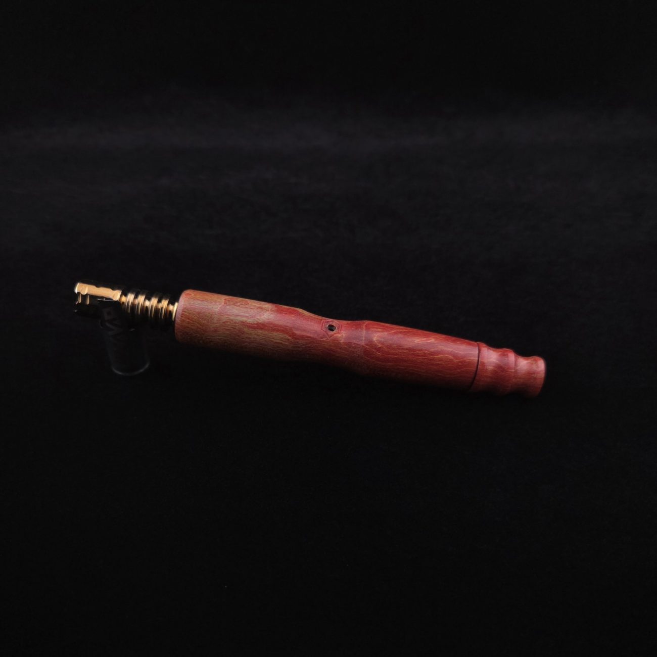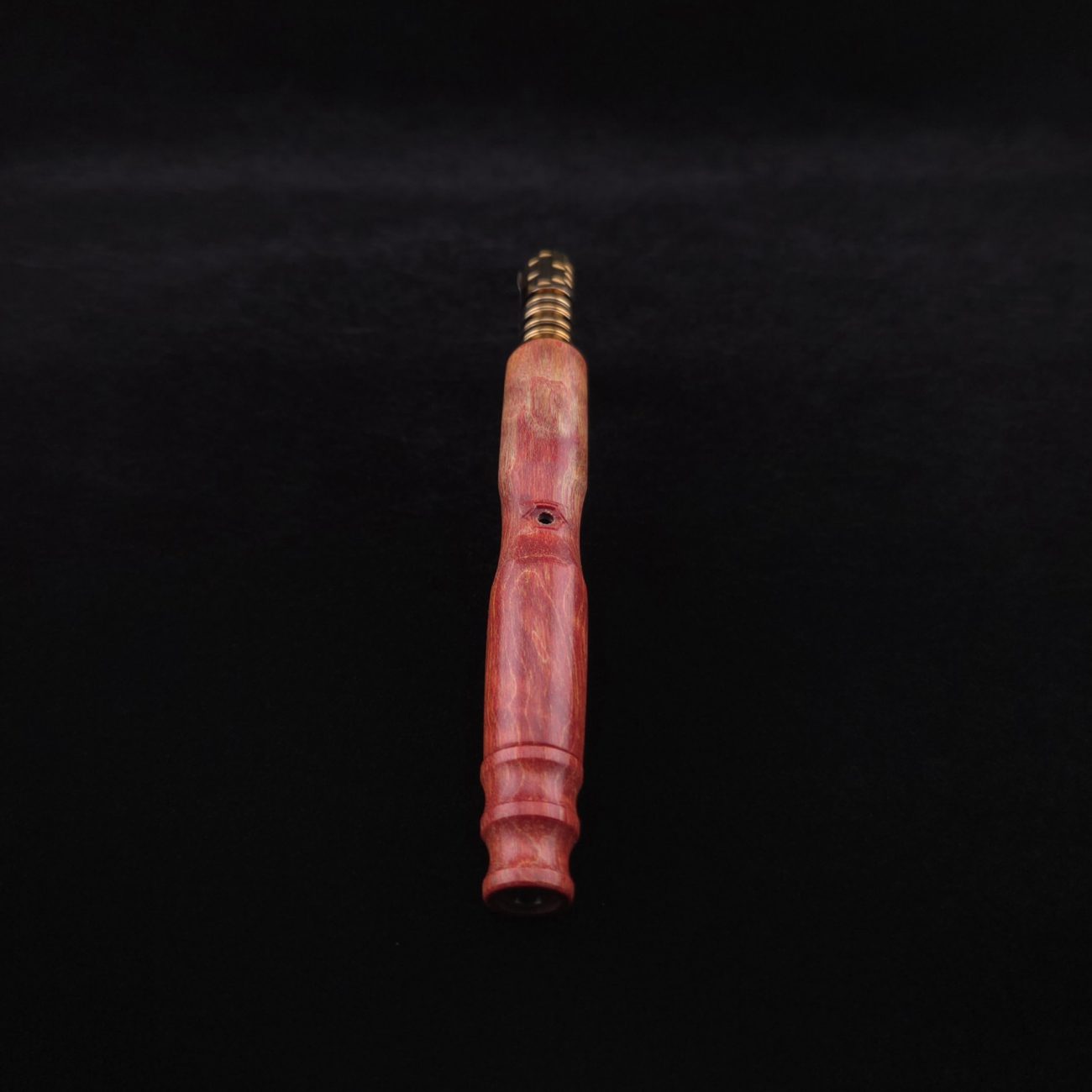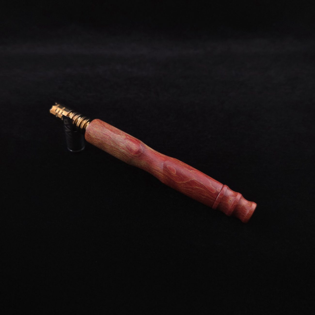 High quality, extreme figure quilted flame maple burl wood XL length stem for Dynavap components. Burl has been dyed from green to fire orange/red with some natural coloring. These limited run stems are made from a highly figured block of quilted flame maple burl that has very unique twists and grain patterns. We’ll be run out these limited run stems until we have no more of this unique rare find burl. This is a new design having the hollowed, scooped out middle sections in the high class version and a centered air-port side oval design with max air-flow. Stem functions with or without m.p. Stem has been finished with a smooth satin/semi-gloss finish polishing which is all natural and food safe.