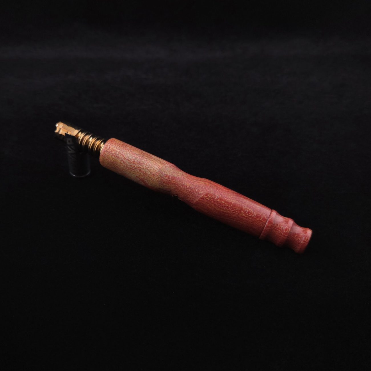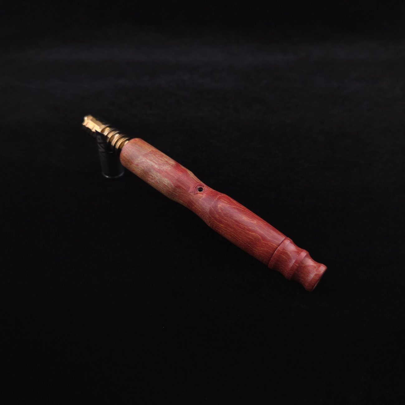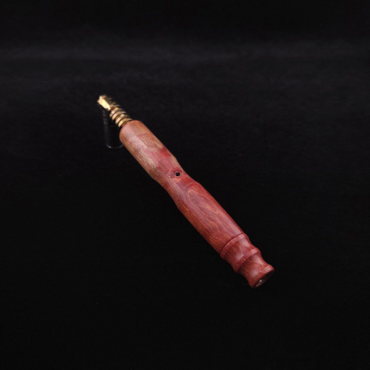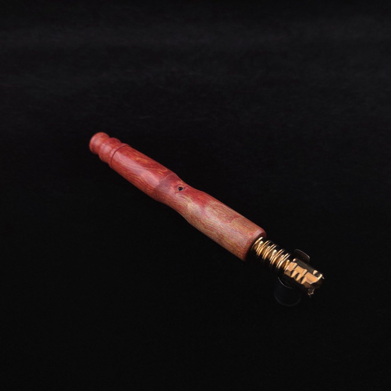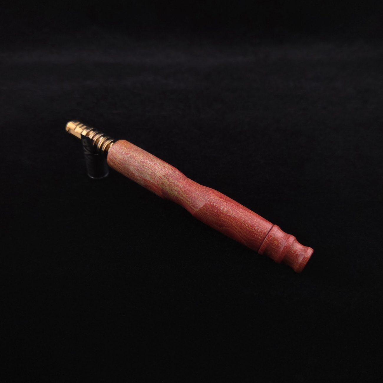 High quality, extreme figure quilted flame maple burl wood XL length stem for Dynavap components. Burl has been dyed from green to fire orange/red with some natural coloring. These limited run stems are made from a highly figured block of quilted flame maple burl that has very unique twists and grain patterns. We’ll be run out these limited run stems until we have no more of this unique rare find burl. This is a new design having the hollowed, scooped out middle sections in the high class version and a centered air-port side oval design with max air-flow. Stem functions with or without m.p. Stem has been finished with a smooth satin/semi-gloss finish polishing which is all natural and food safe.
