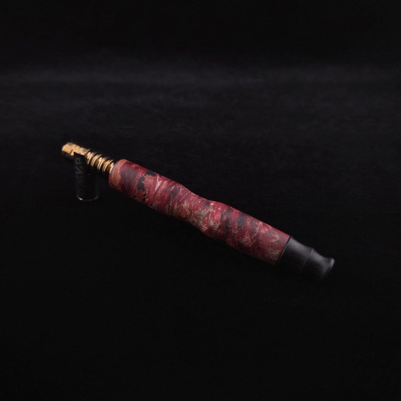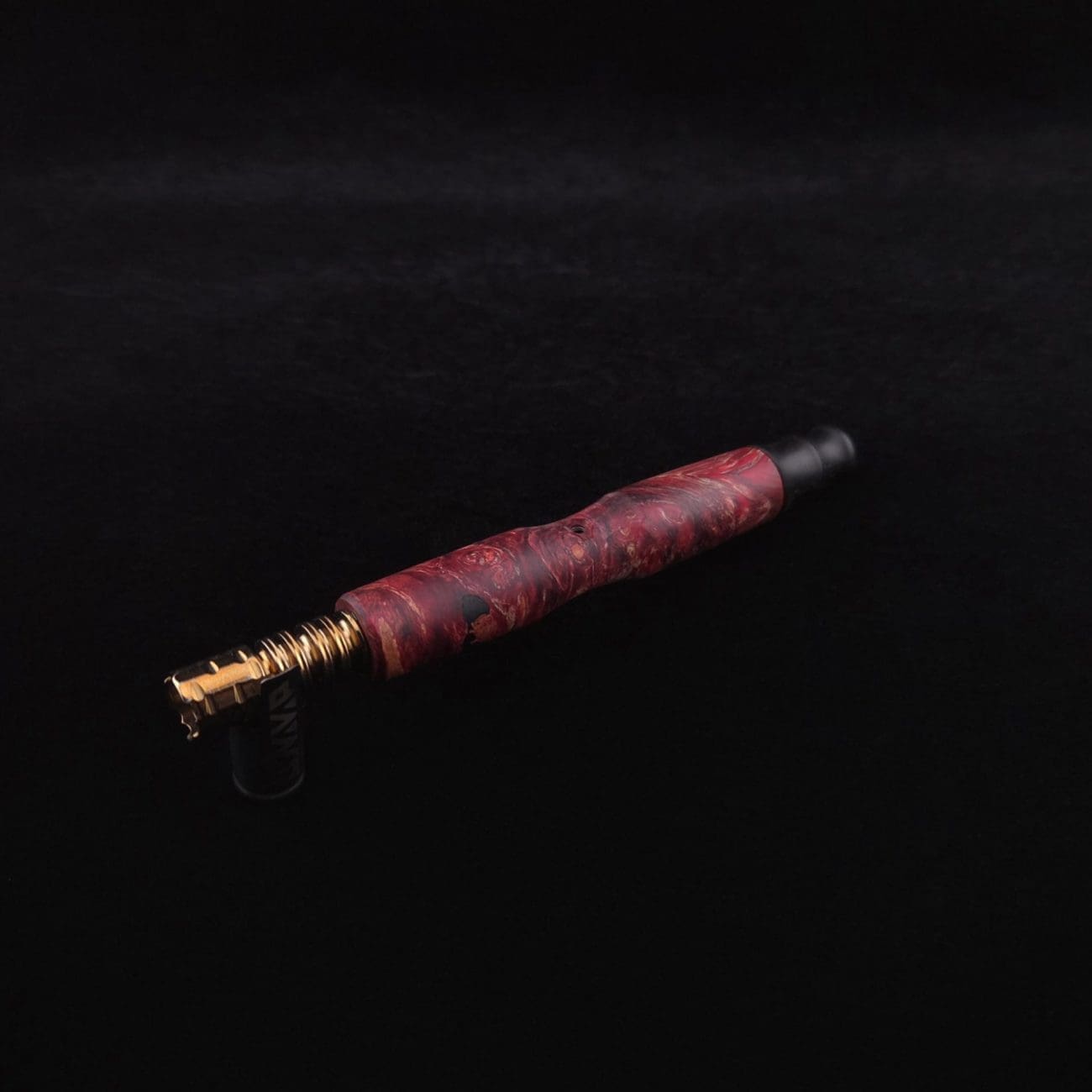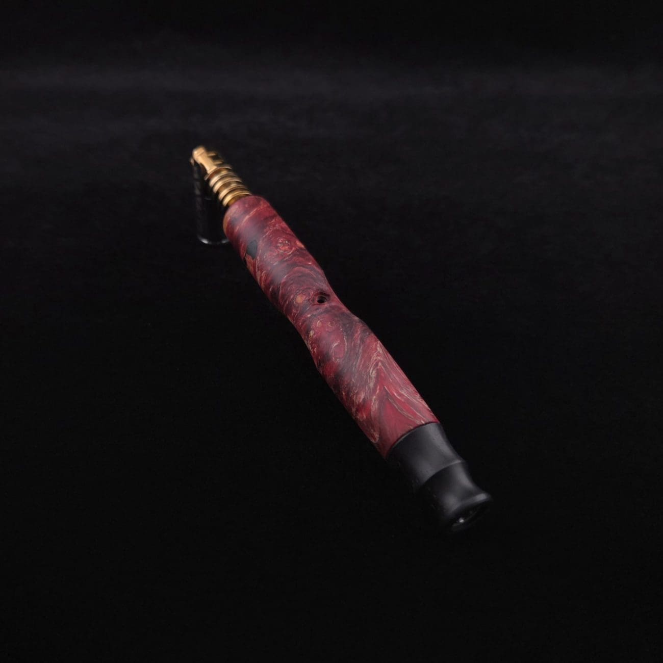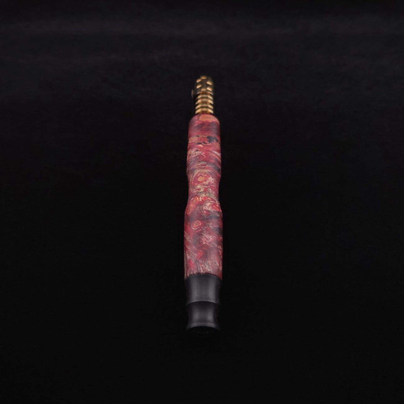 High quality, highly figured buckeye burl wood XL length stem for Dynavap components. Burl has been dyed fireball red with natural black and brown coloring. Stem has true cosmic theme with galaxy swirls occurring naturally and added color emphasizes these aspects. This is a new design having the hollowed, scooped out middle sections in the high class version and a centered air-port side oval design with max air-flow. Stem functions with or without m.p. Stem has been finished with a smooth satin finish polishing which is all natural and food safe.