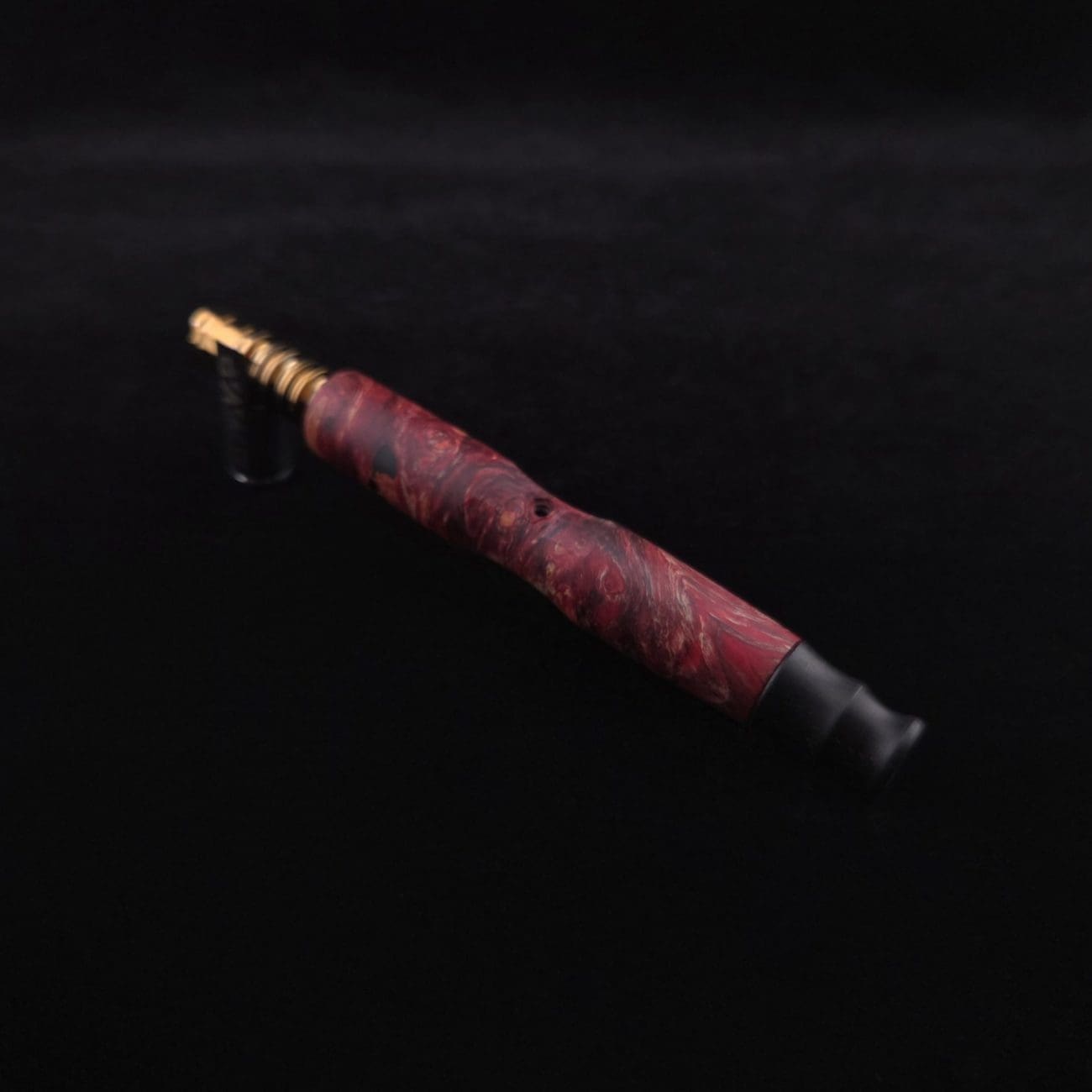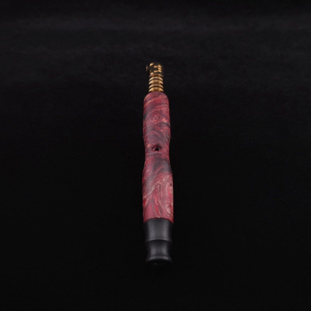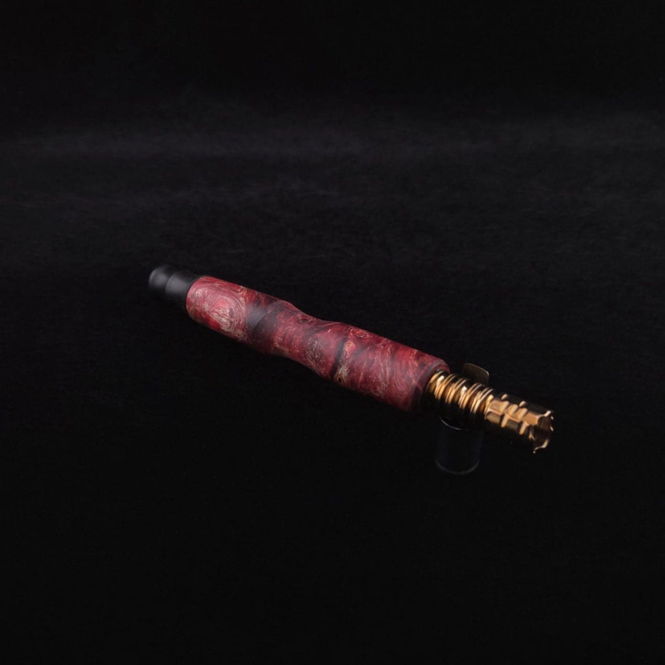 High quality, highly figured buckeye burl wood XL length stem for Dynavap components. Burl has been dyed fireball red with natural black and brown coloring. Stem has true cosmic theme with galaxy swirls occurring naturally and added color emphasizes these aspects. This is a new design having the hollowed, scooped out middle sections in the high class version and a centered air-port side oval design with max air-flow. Stem functions with or without m.p. Stem has been finished with a smooth satin finish polishing which is all natural and food safe.
