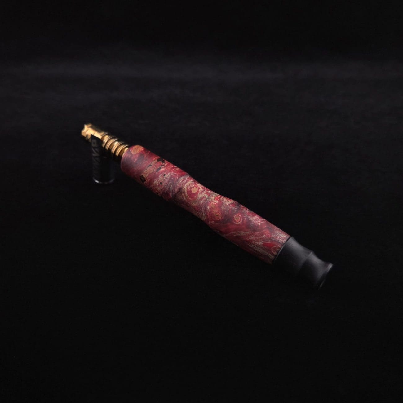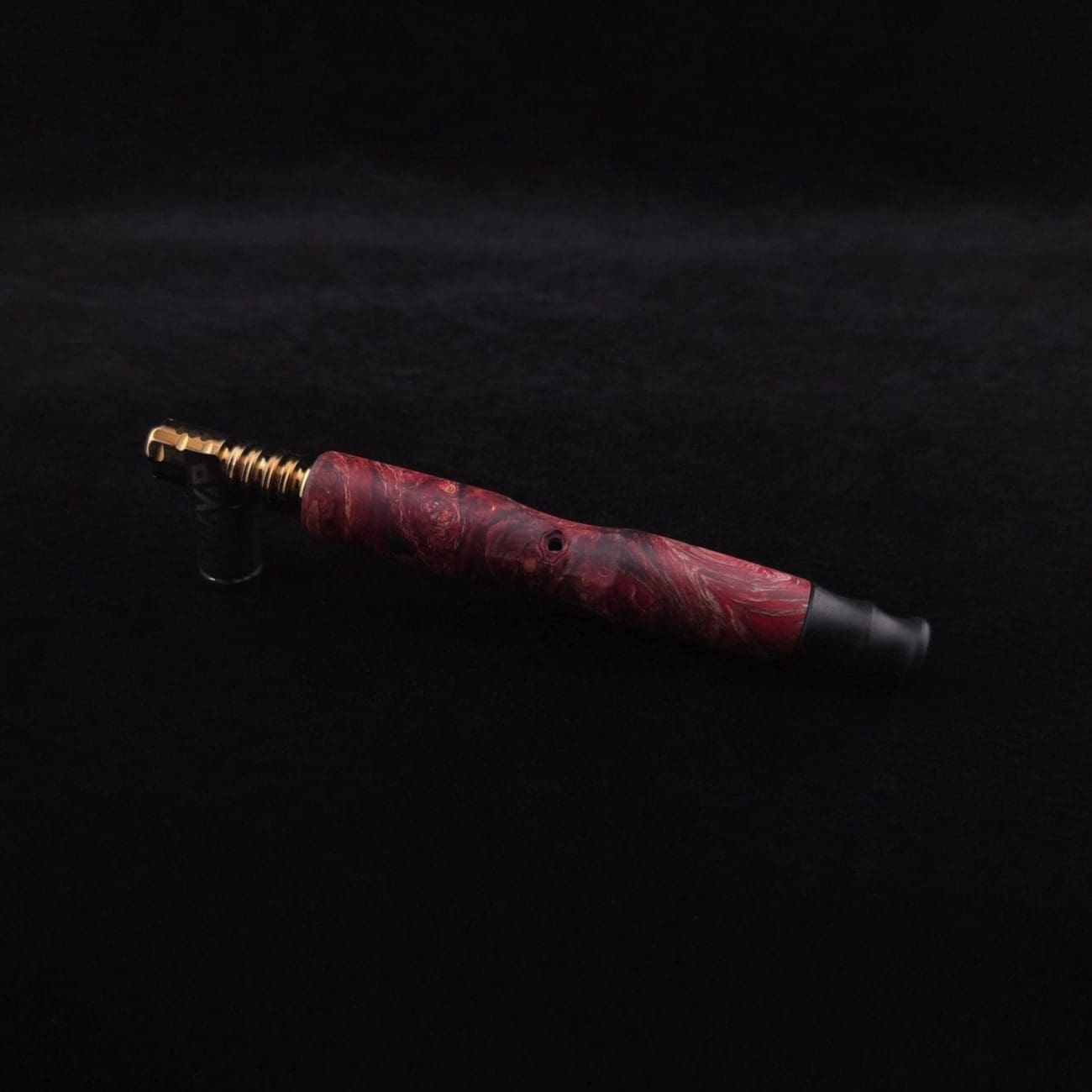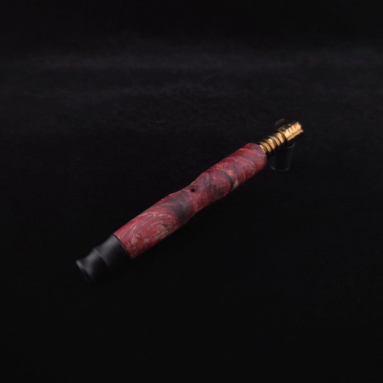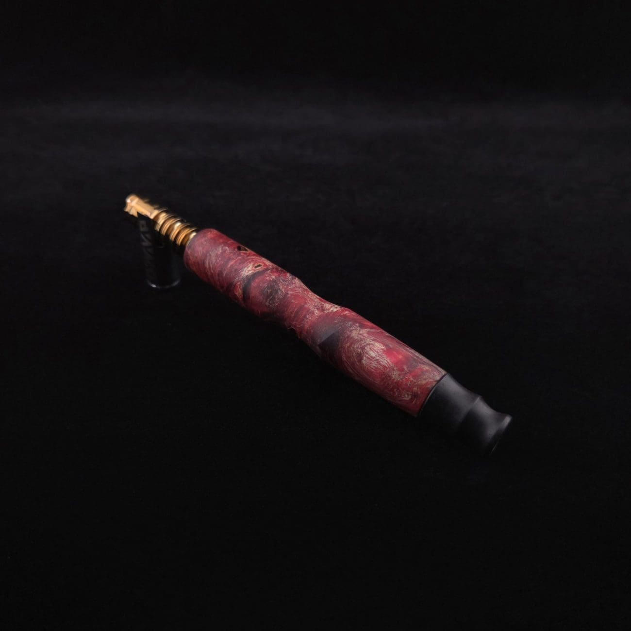 High quality, highly figured buckeye burl wood XL length stem for Dynavap components. Burl has been dyed fireball red with natural black and brown coloring. Stem has true cosmic theme with galaxy swirls occurring naturally and added color emphasizes these aspects. This is a new design having the hollowed, scooped out middle sections in the high class version and a centered air-port side oval design with max air-flow. Stem functions with or without m.p. Stem has been finished with a smooth satin finish polishing which is all natural and food safe.
