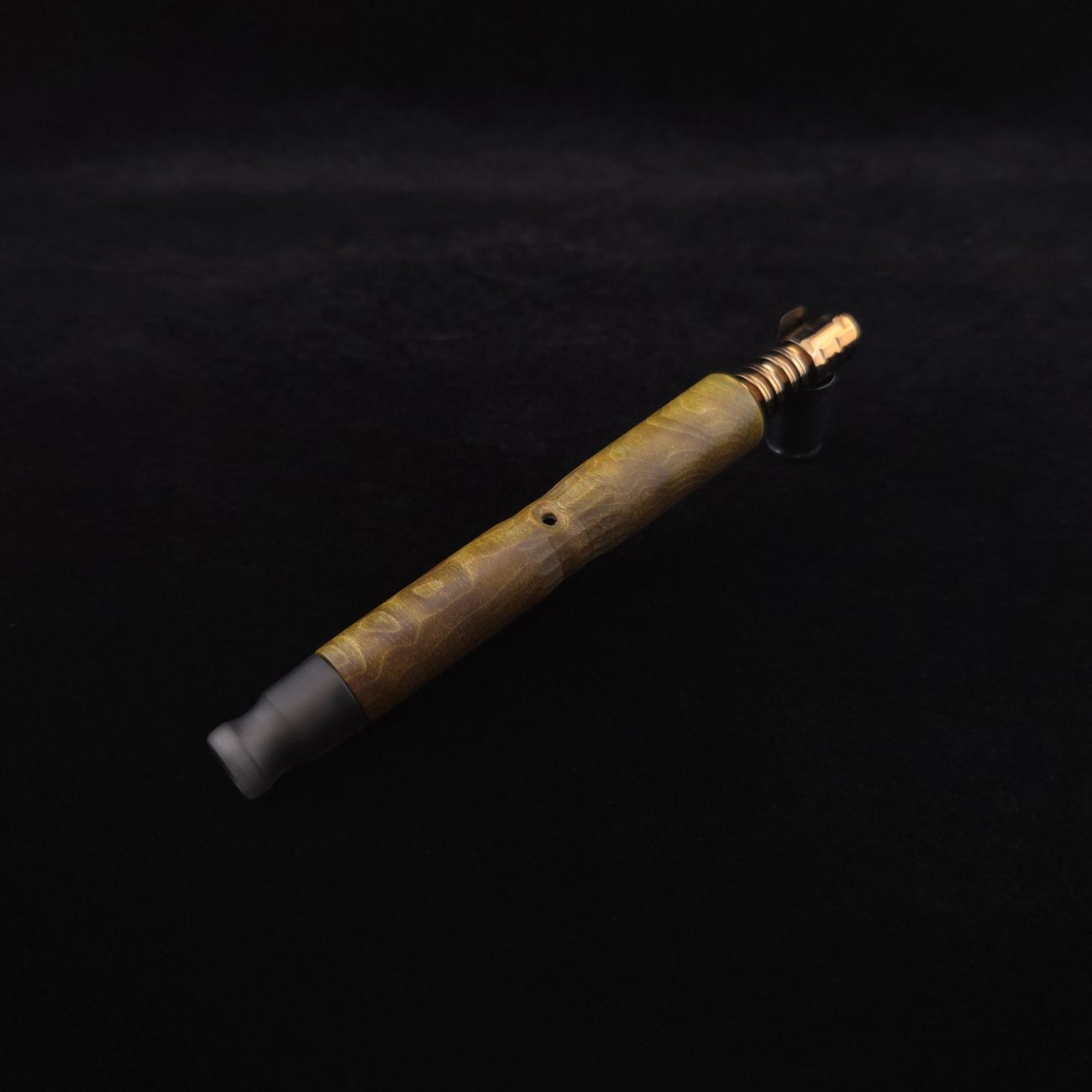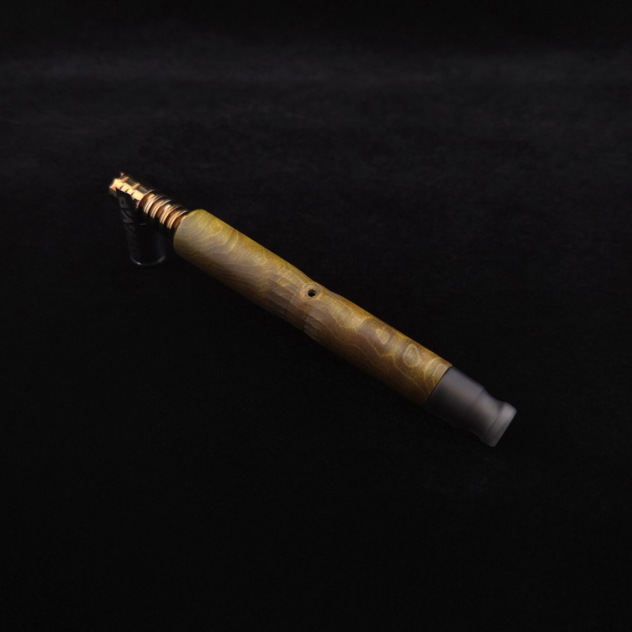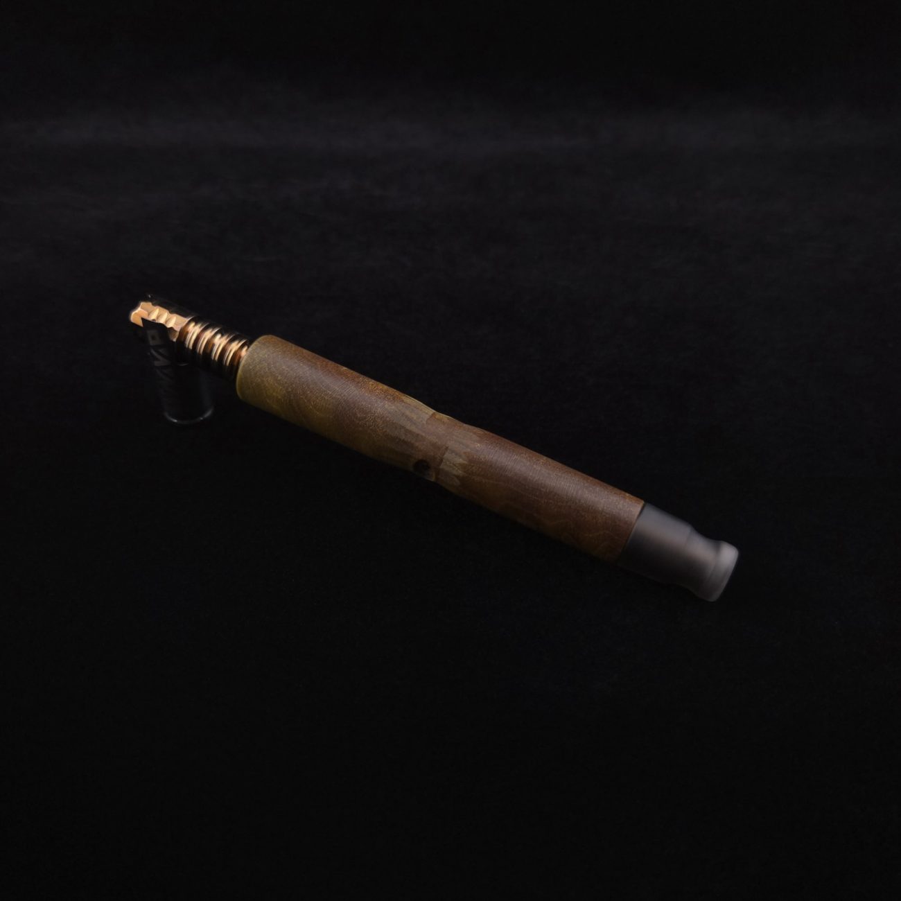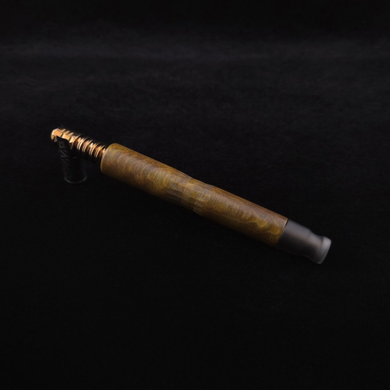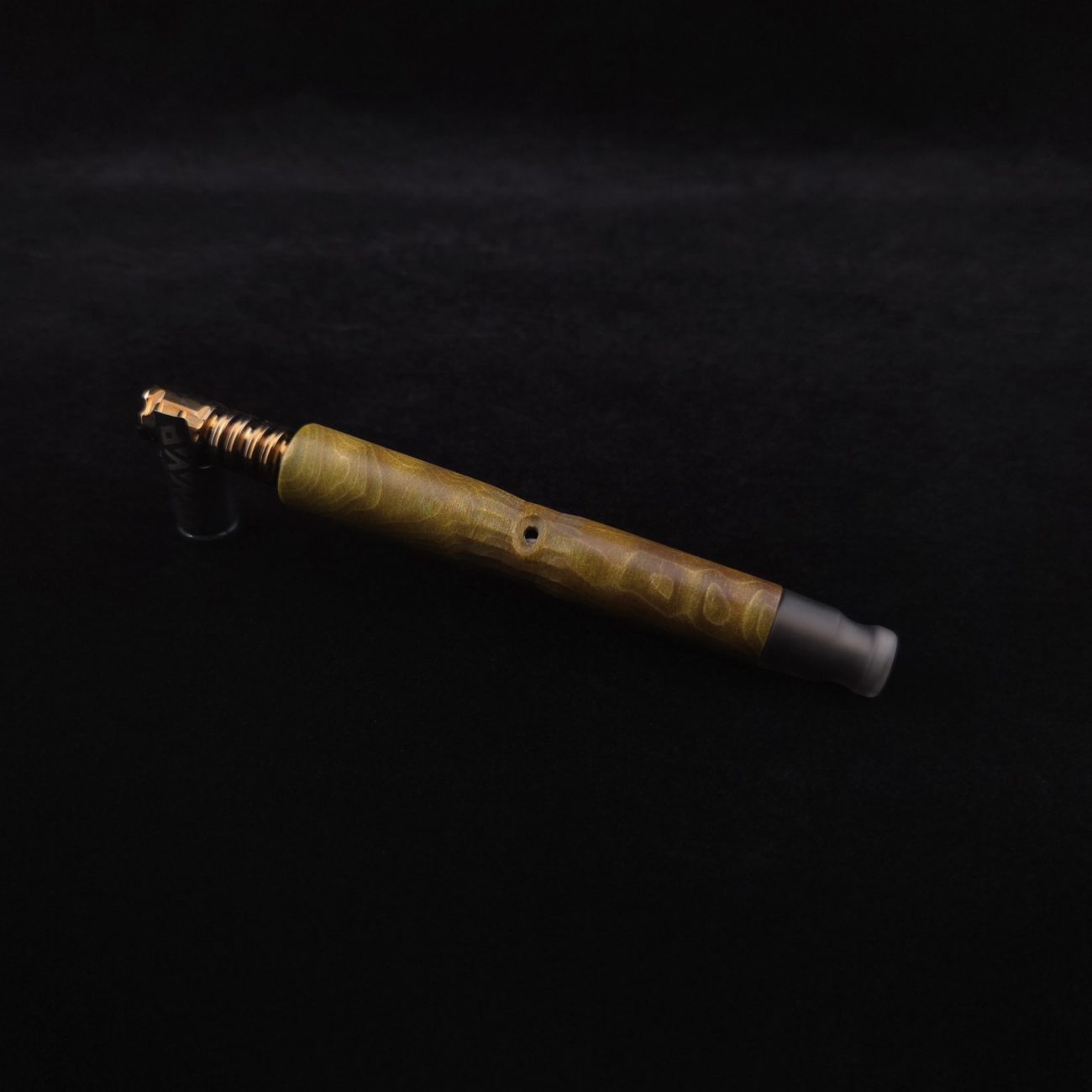 High quality, quilted flame maple burl wood XL length stem for Dynavap components. This is a limited run stem using the limited stock of the quilted flame maple burl we have. Along with a smoke colored matched mouthpiece. Maple burl has been colored a camo green with naturally occurring earthy black/brown tones. This stem is a high class straight blunt design with the straight blunt style taper design from end to end. Straight taper refers to 2/3 being straight cut and 1/3 having the taper cut at the mouthpiece end. This is a specialty blunt stem having the center section cut with an intricate angled design towards the air-port. This provides a way to easily locate the air-port at all times allowing your finger to rest in the concave section. All of our stems function with or without mouthpiece attached. Stem has been finished with smooth satin/semi-gloss finish polishing and is done with all natural, food safe polishes.