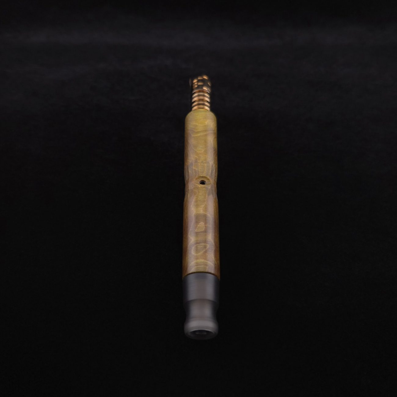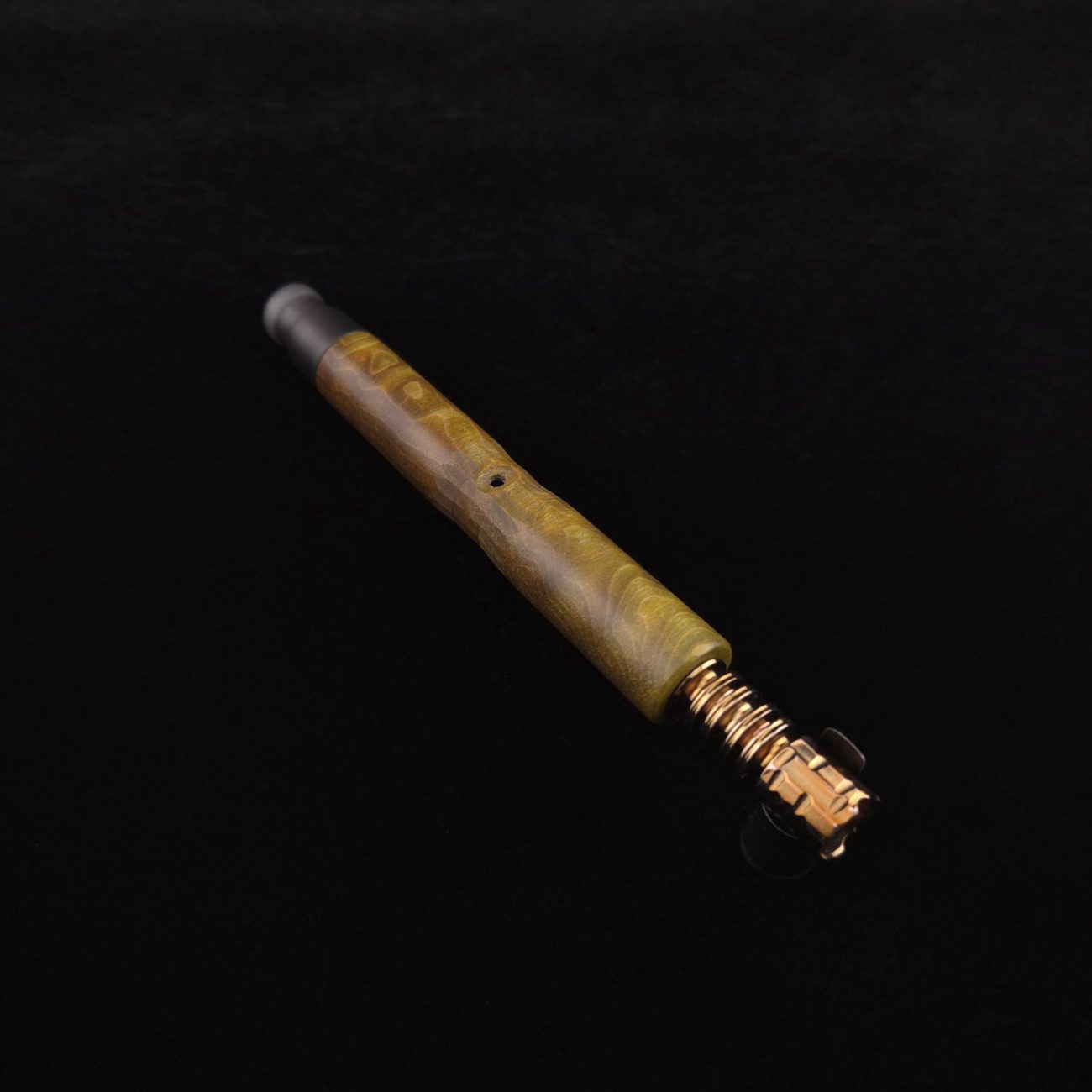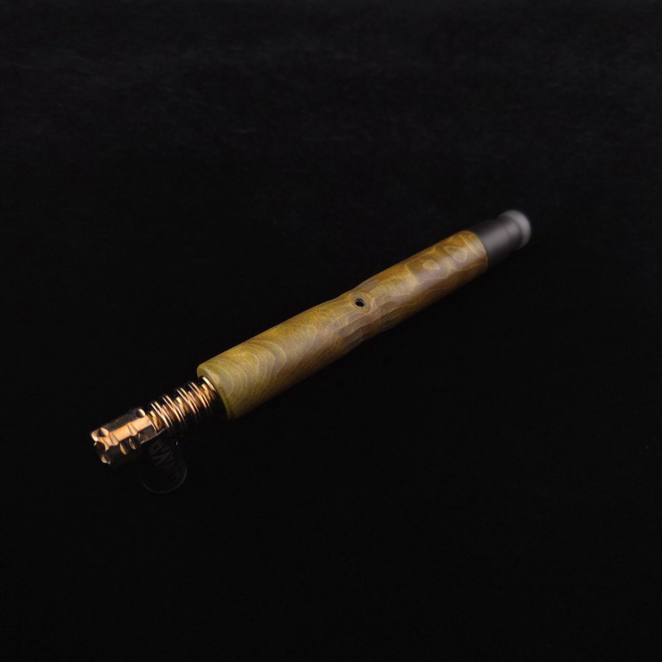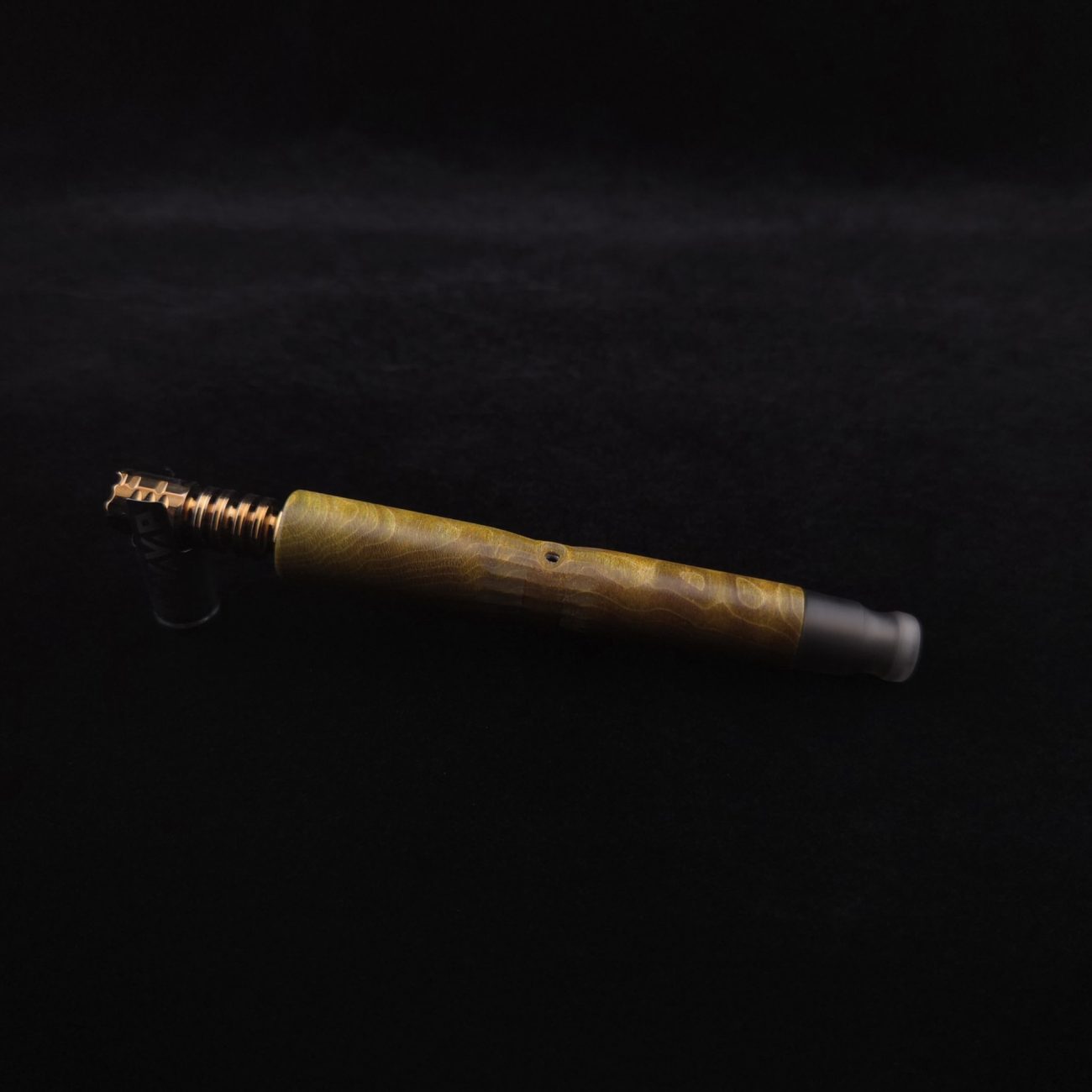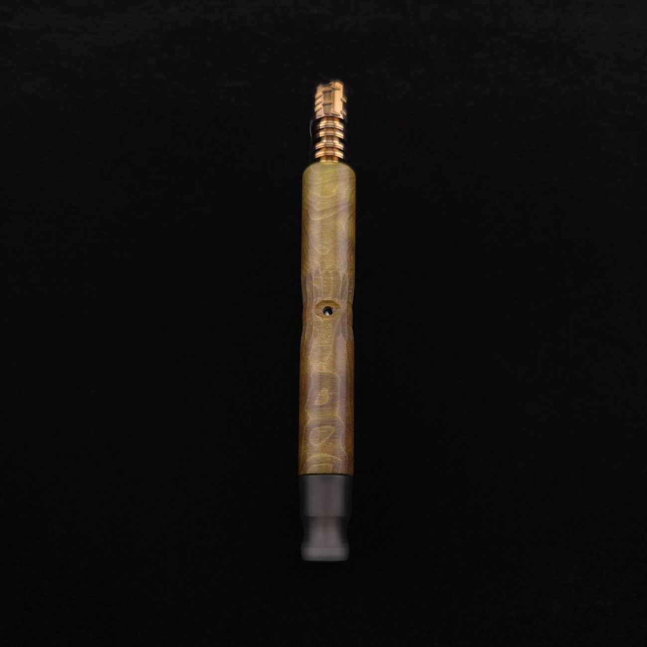 High quality, quilted flame maple burl wood XL length stem for Dynavap components. This is a limited run stem using the limited stock of the quilted flame maple burl we have. Along with a smoke colored matched mouthpiece. Maple burl has been colored a camo green with naturally occurring earthy black/brown tones. This stem is a high class straight blunt design with the straight blunt style taper design from end to end. Straight taper refers to 2/3 being straight cut and 1/3 having the taper cut at the mouthpiece end. This is a specialty blunt stem having the center section cut with an intricate angled design towards the air-port. This provides a way to easily locate the air-port at all times allowing your finger to rest in the concave section. All of our stems function with or without mouthpiece attached. Stem has been finished with smooth satin/semi-gloss finish polishing and is done with all natural, food safe polishes.