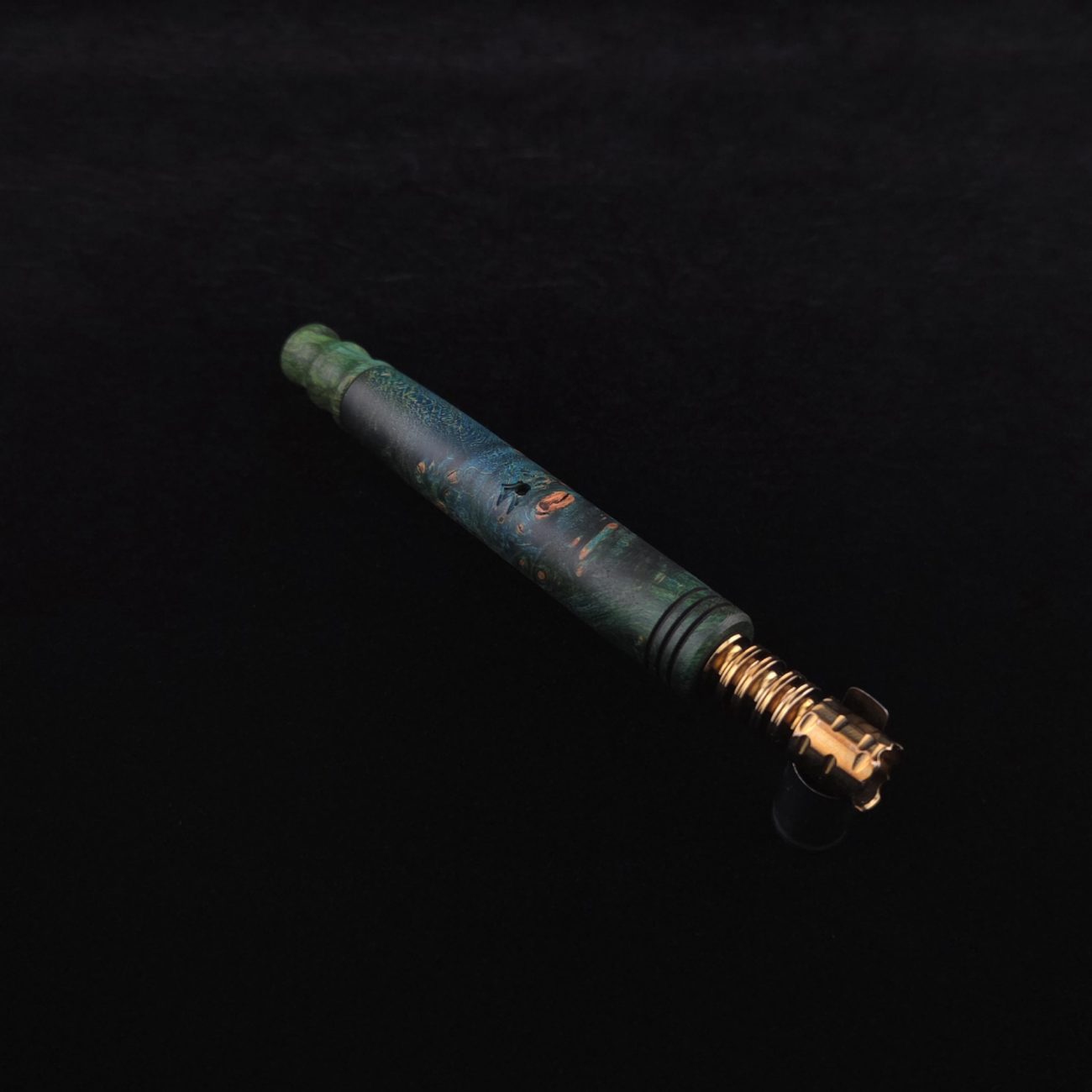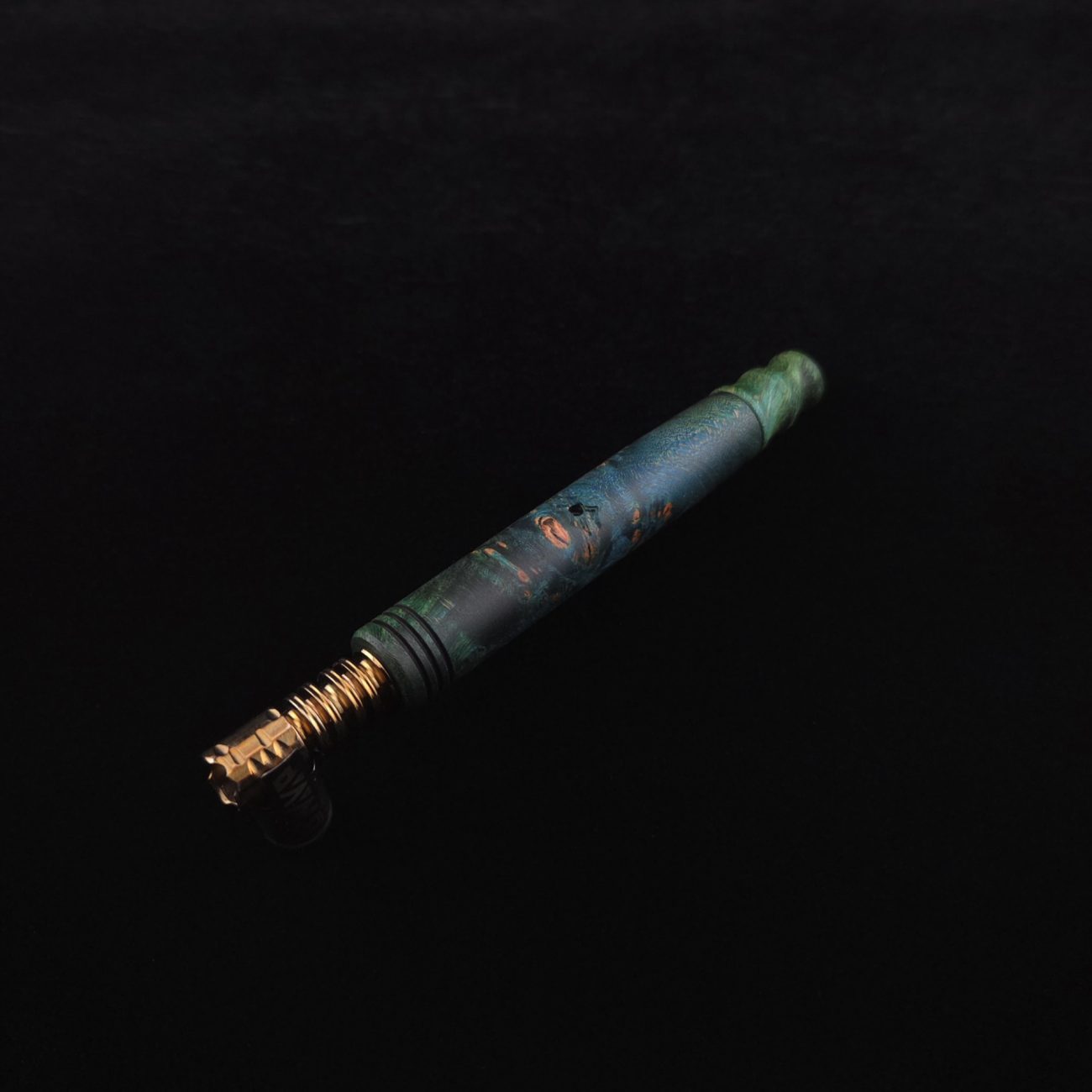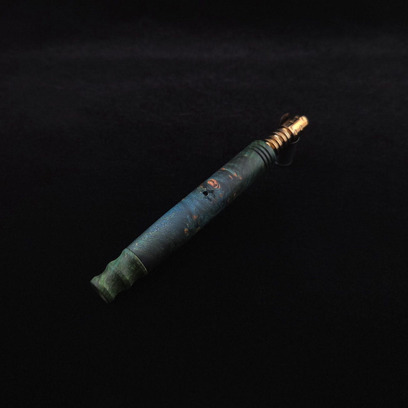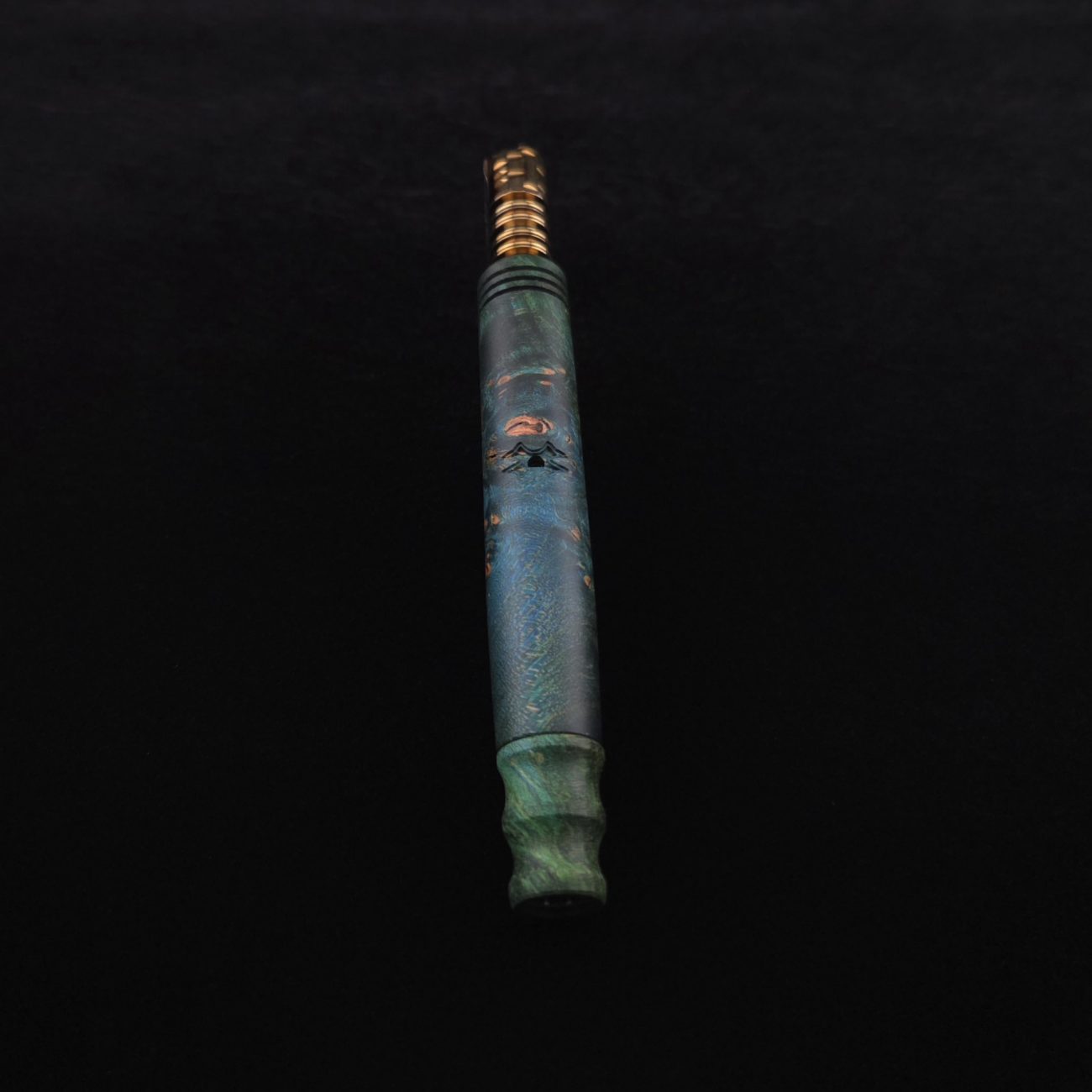 High quality, highly figured maple burl wood XL length stem for Dynavap components. Along with a specialty design book-matched mouthpiece. Maple burl has been colored a vibrant blues and greens with earthy brown tones in the burl eyes. This stem is a high class straight blunt design with the straight blunt style taper design from end to end. Straight taper refers to 2/3 being straight cut and 1/3 having the taper cut at the mouthpiece end. All of our stems function with or without mouthpiece attached. Stem has been finished with smooth satin finish polishing and is all natural.
