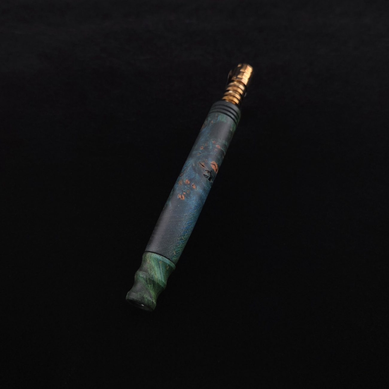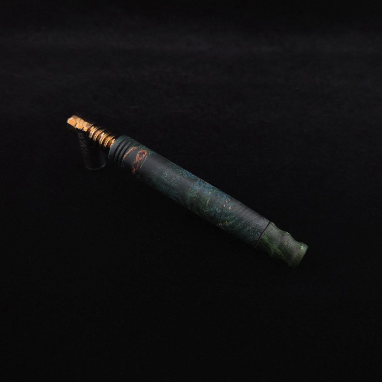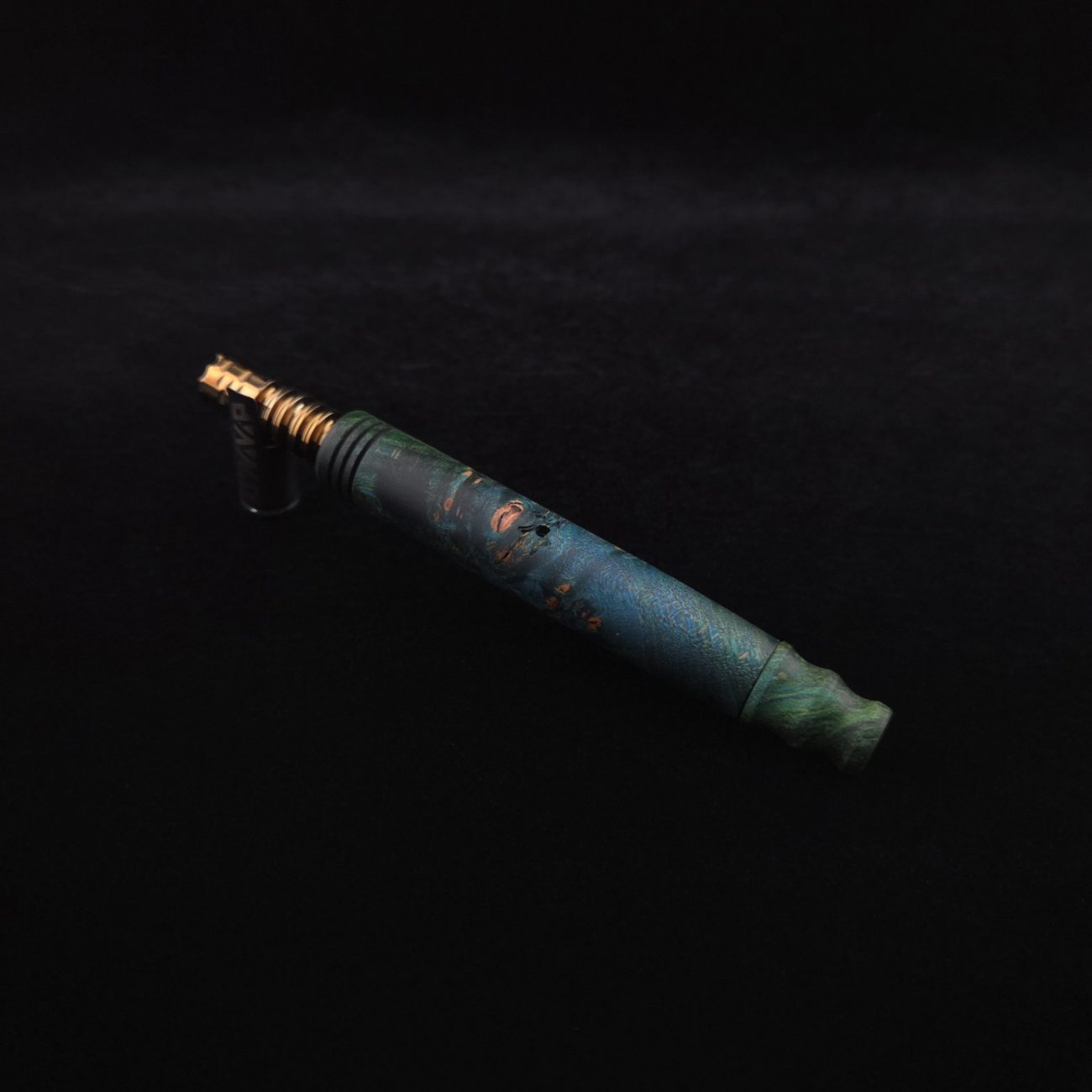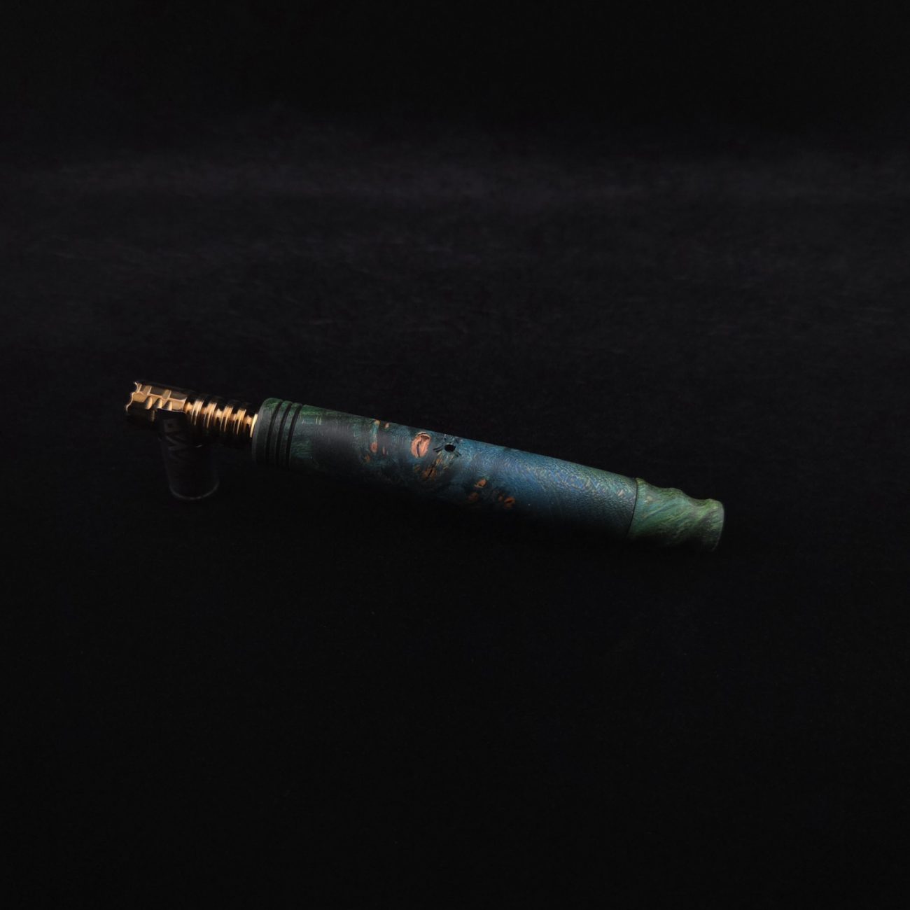 High quality, highly figured maple burl wood XL length stem for Dynavap components. Along with a specialty design book-matched mouthpiece. Maple burl has been colored a vibrant blues and greens with earthy brown tones in the burl eyes. This stem is a high class straight blunt design with the straight blunt style taper design from end to end. Straight taper refers to 2/3 being straight cut and 1/3 having the taper cut at the mouthpiece end. All of our stems function with or without mouthpiece attached. Stem has been finished with smooth satin finish polishing and is all natural.
