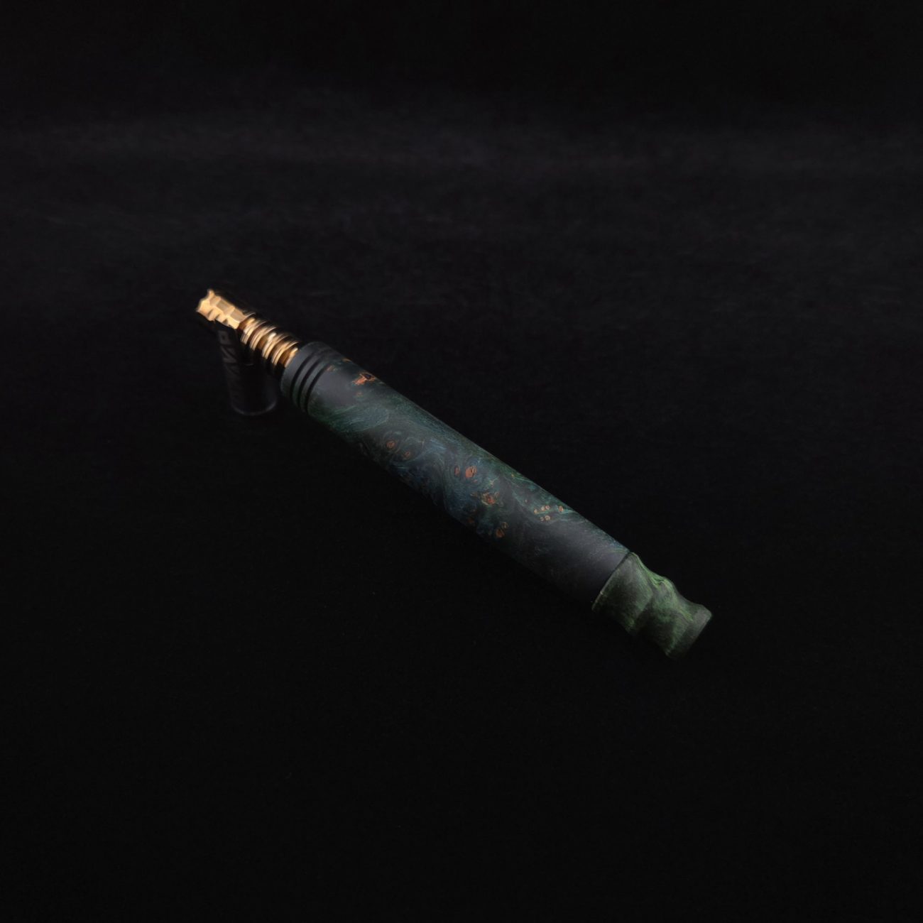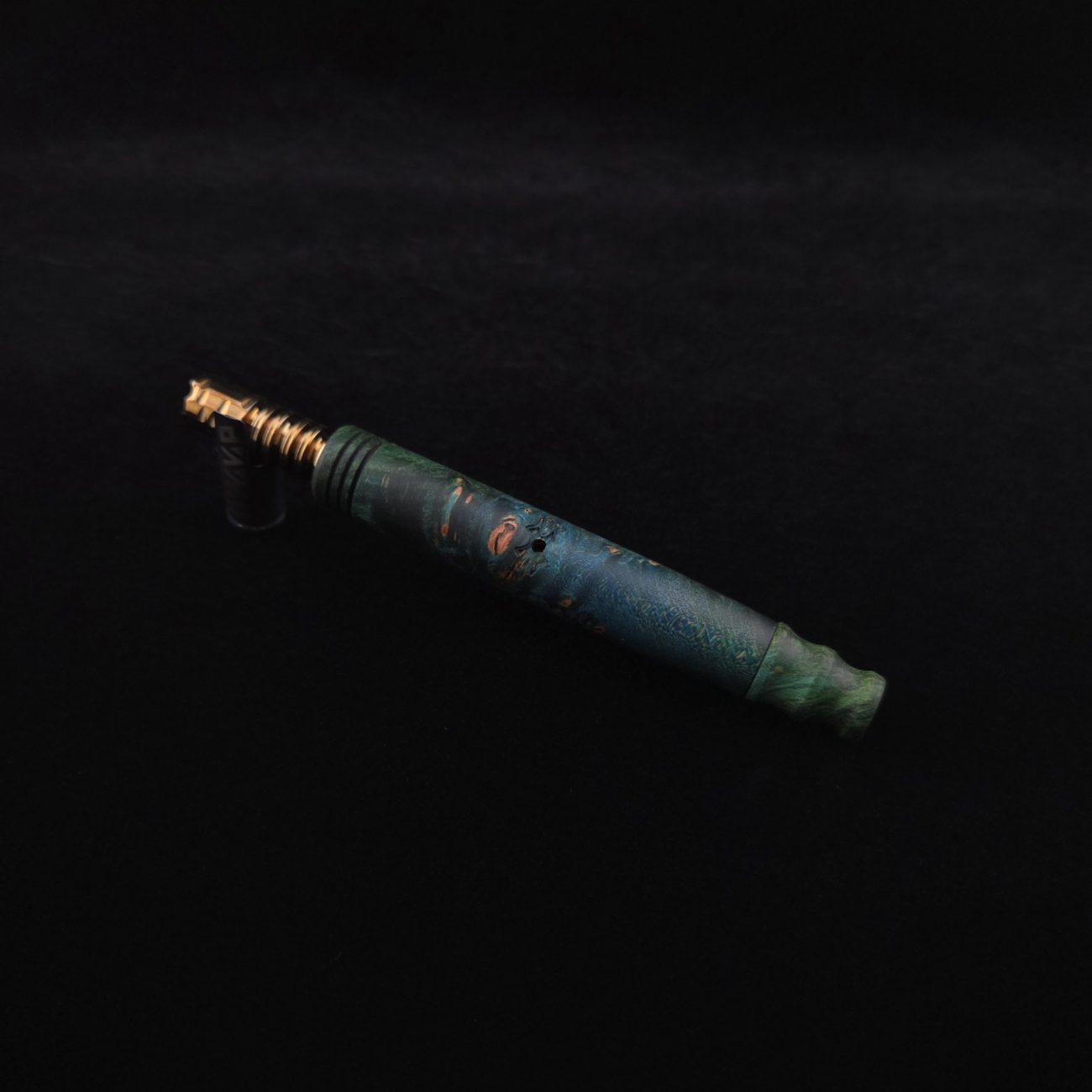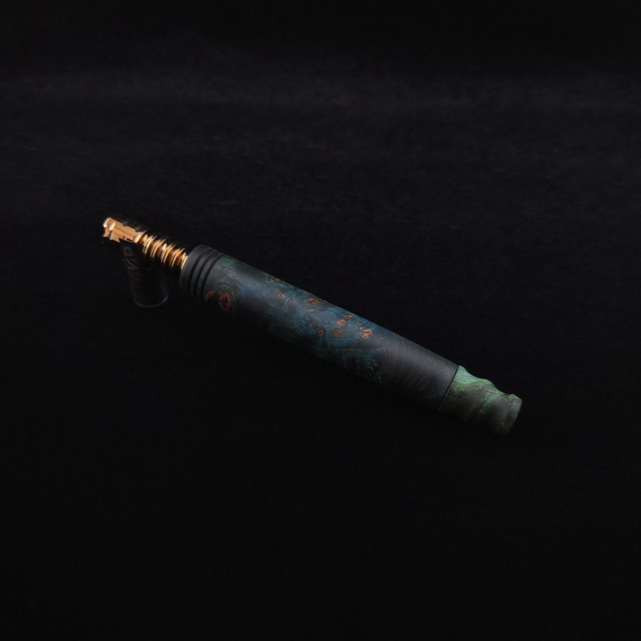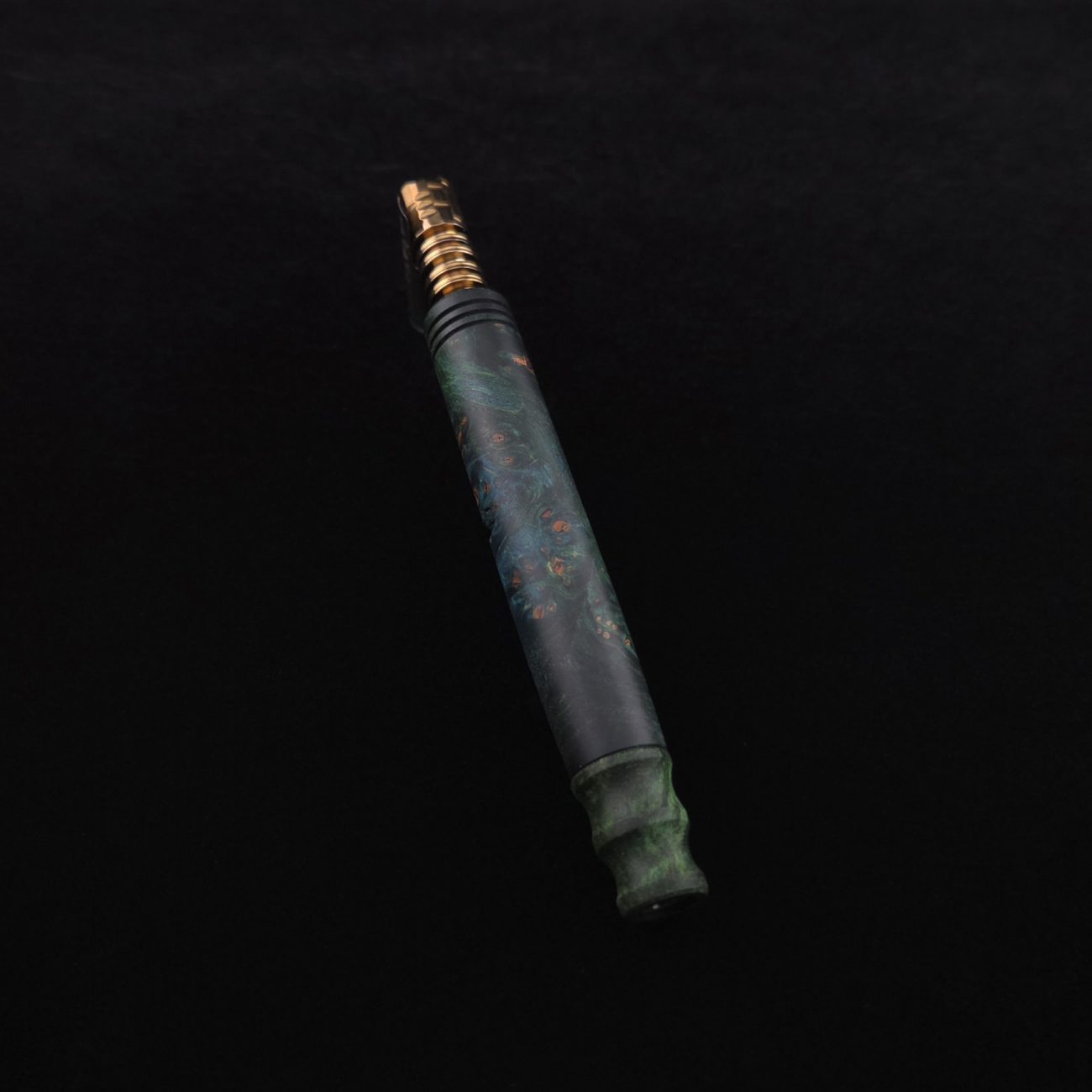 High quality, highly figured maple burl wood XL length stem for Dynavap components. Along with a specialty design book-matched mouthpiece. Maple burl has been colored a vibrant blues and greens with earthy brown tones in the burl eyes. This stem is a high class straight blunt design with the straight blunt style taper design from end to end. Straight taper refers to 2/3 being straight cut and 1/3 having the taper cut at the mouthpiece end. All of our stems function with or without mouthpiece attached. Stem has been finished with smooth satin finish polishing and is all natural.