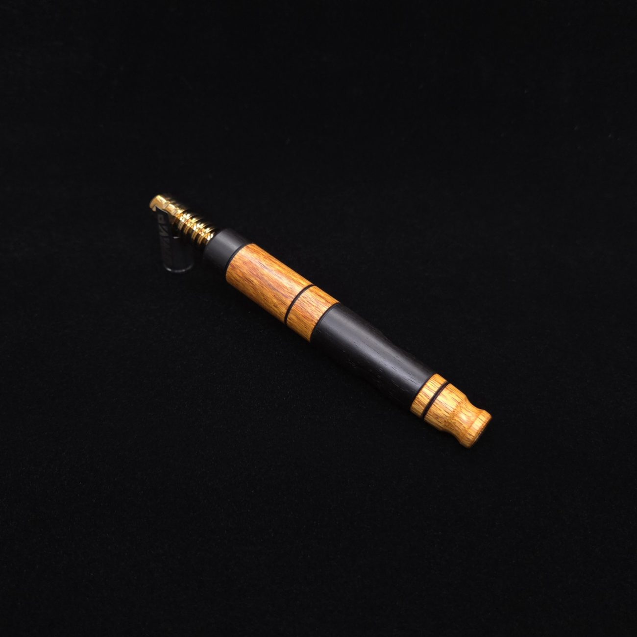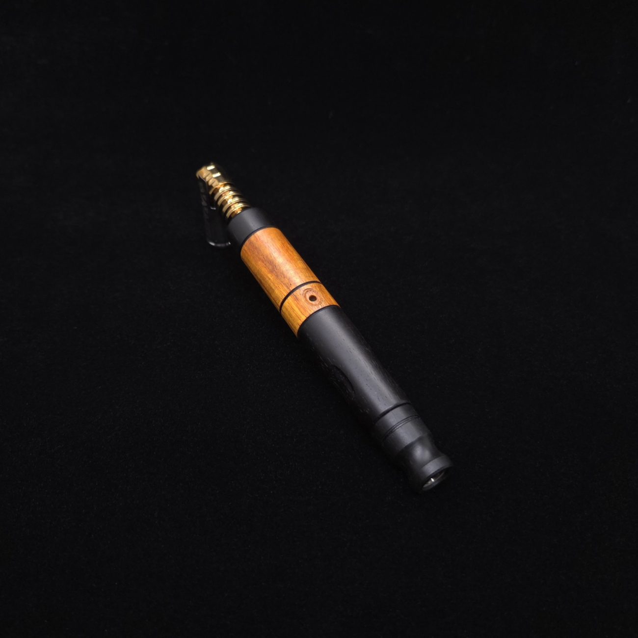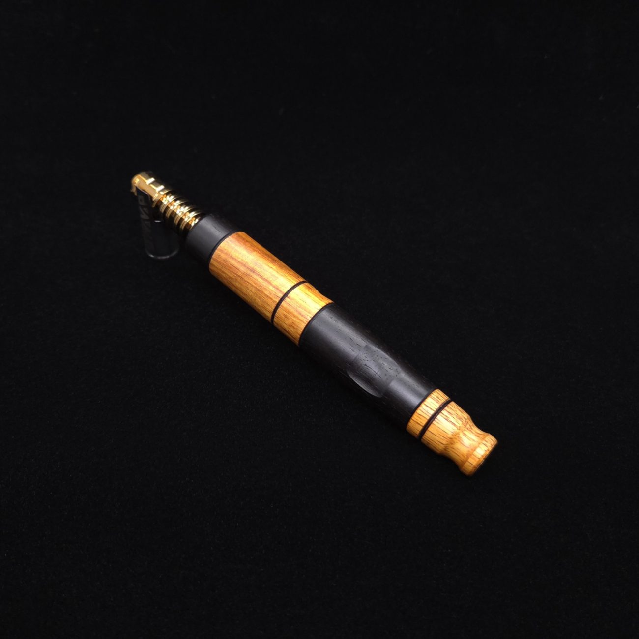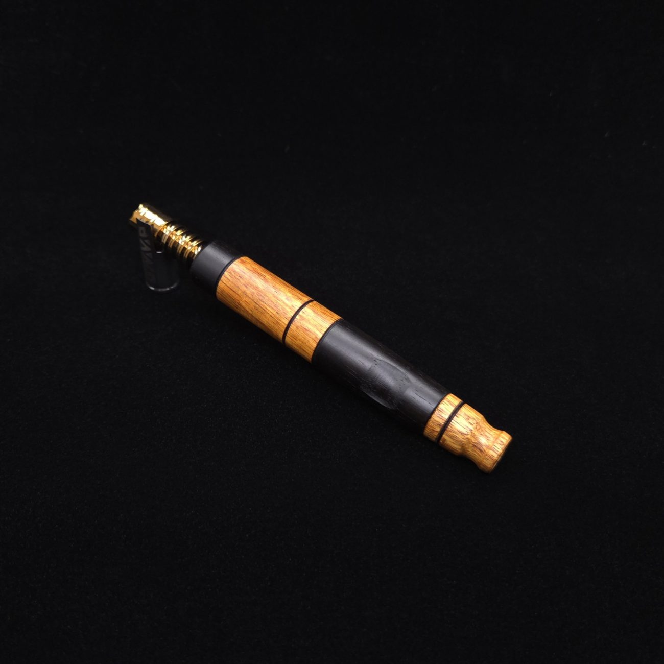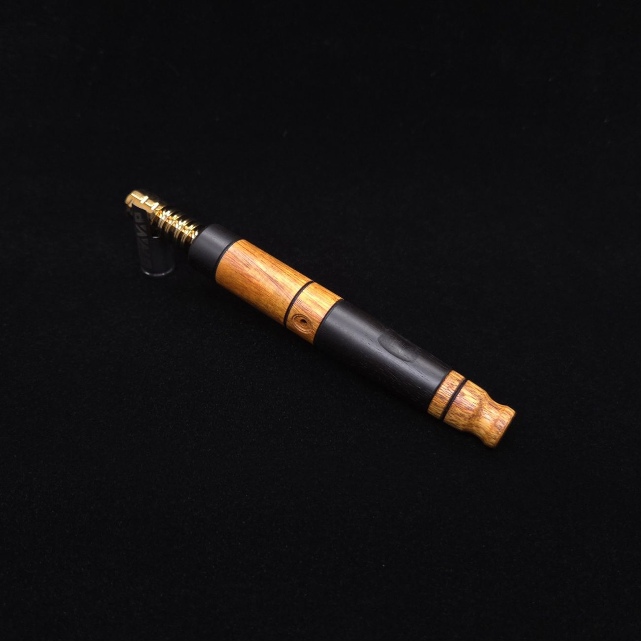 High quality canary wood/ebony wood XL length stem for Dynavap components. Along with a book-matched specialty design mouthpiece in ebony and canary wood. This stem is a high class version in design with the straight blunt style taper design that shows off the highly figured burl patterns and amazing burl wood. Straight taper refers to 2/3 being straight cut and 1/3 having the taper cut at the mouthpiece end. Both ends of this stem design are capped with ebony wood having the main middle section in black limba burl. The three sections are broken up by burnished accent lines that have been cut in. Stem also has 2 concave side finger rests near the mouthpiece end for added feel and function. All of our stems function with or without mouthpiece attached. Stem has been finished with smooth satin finish polishing and is all natural.