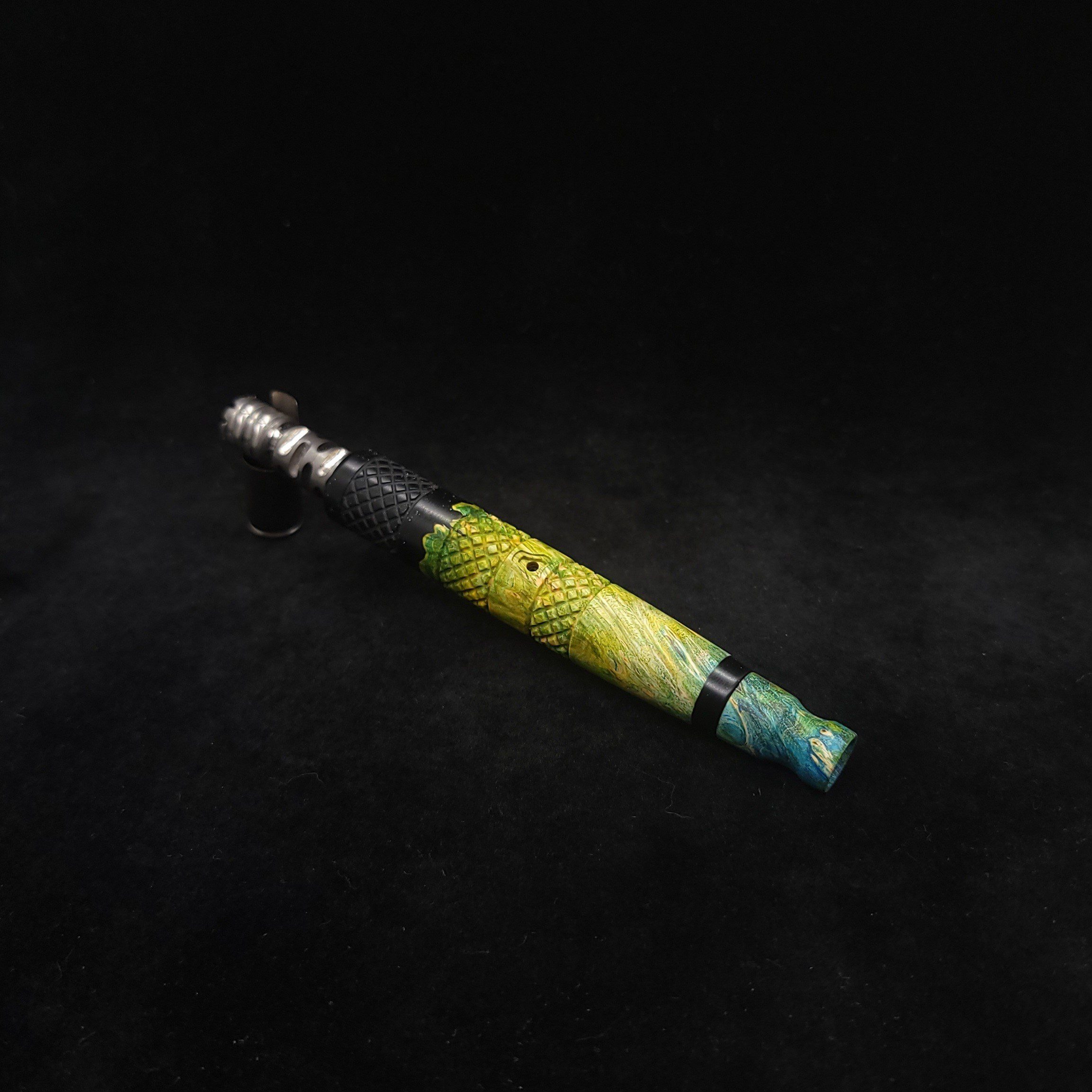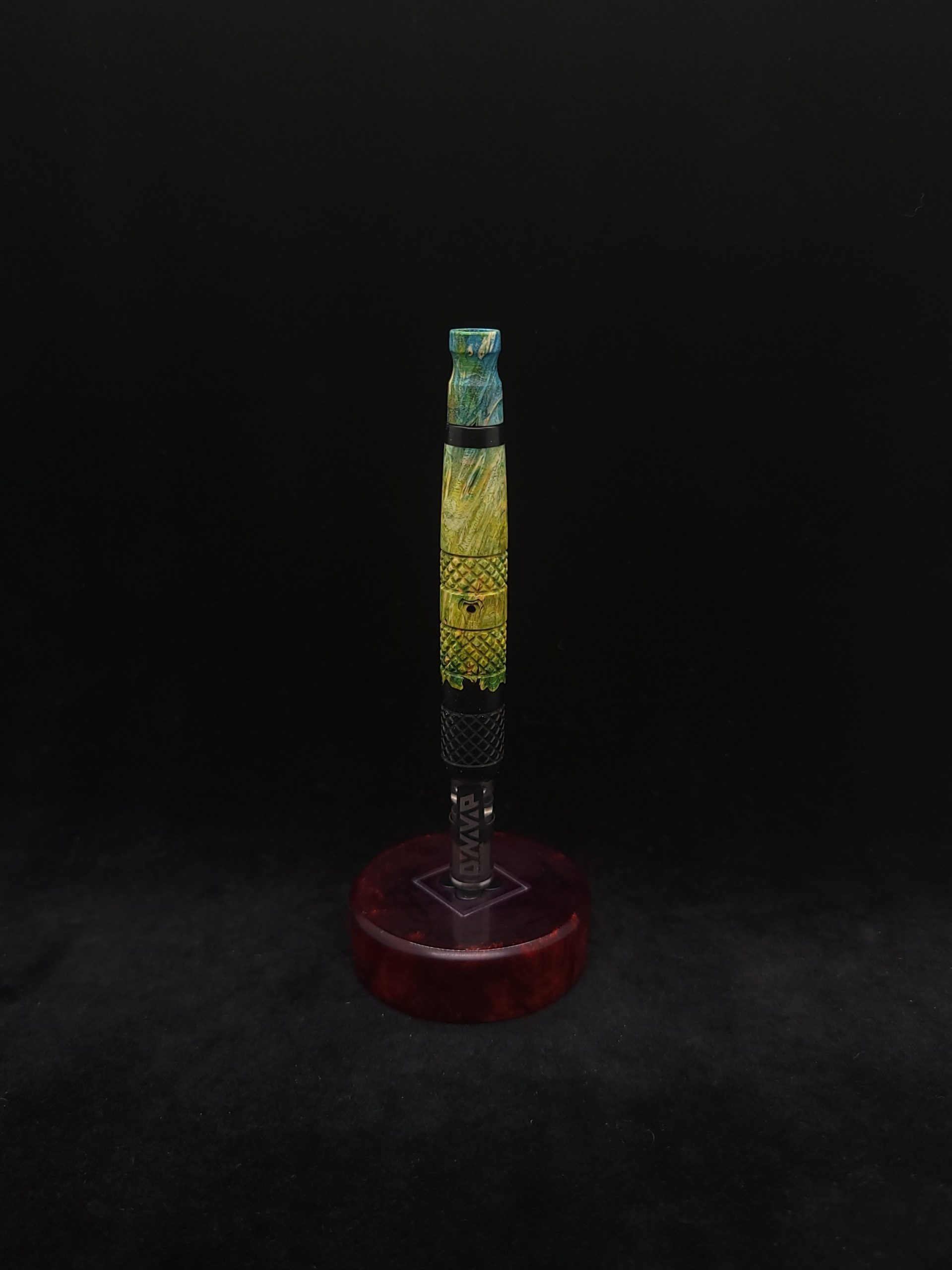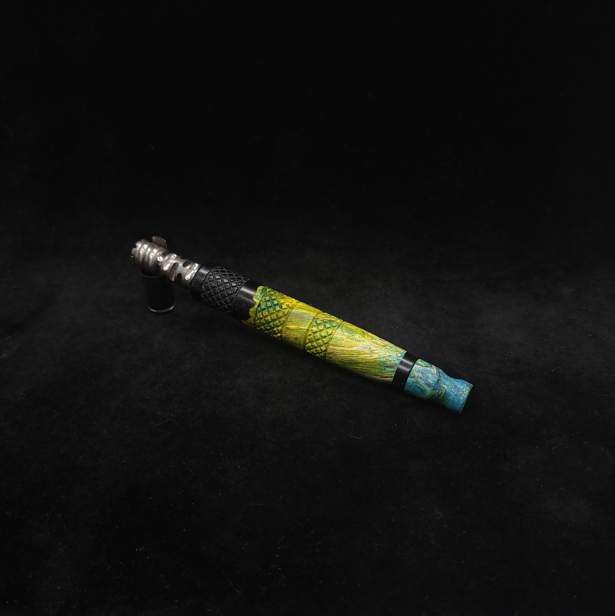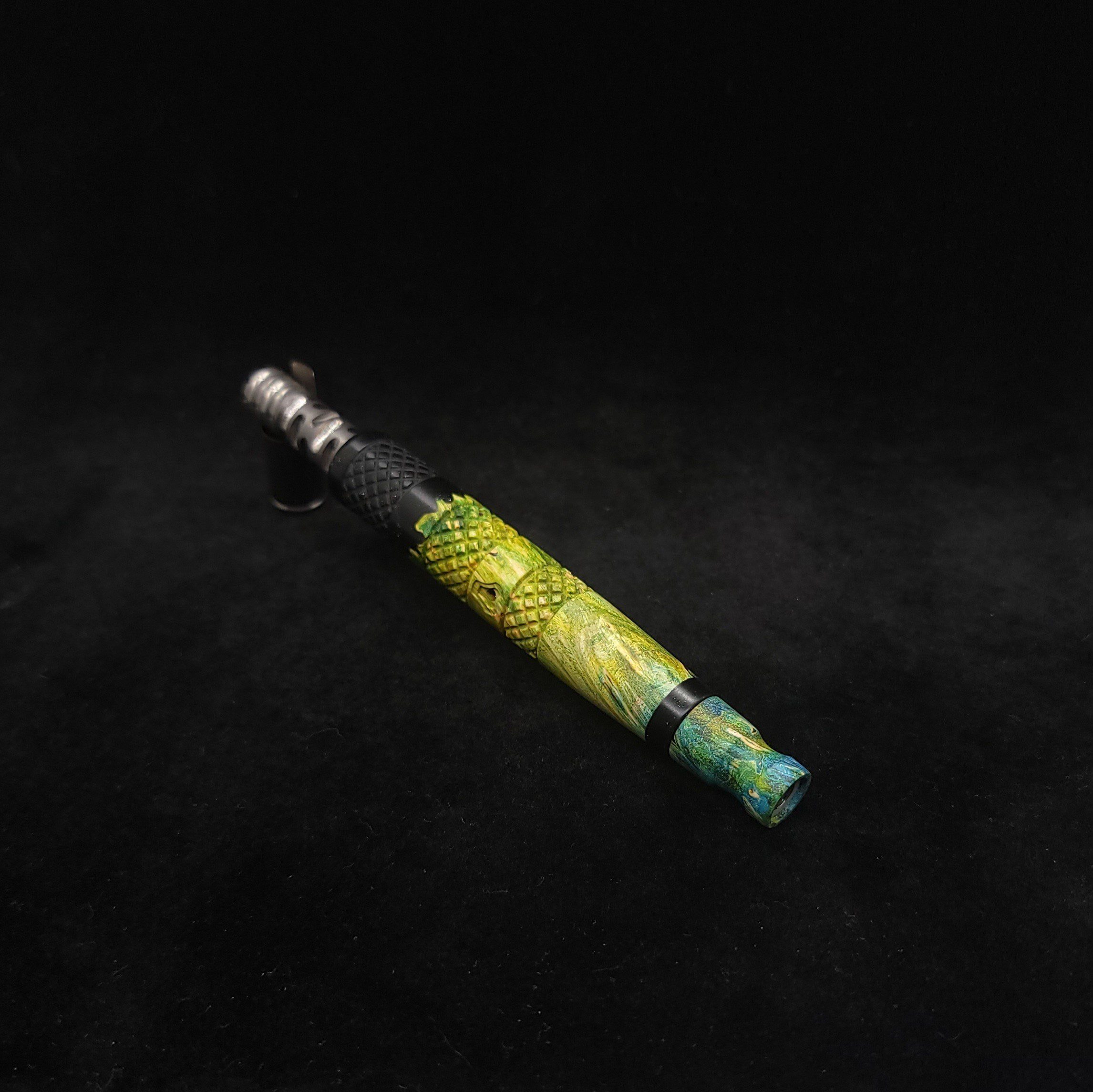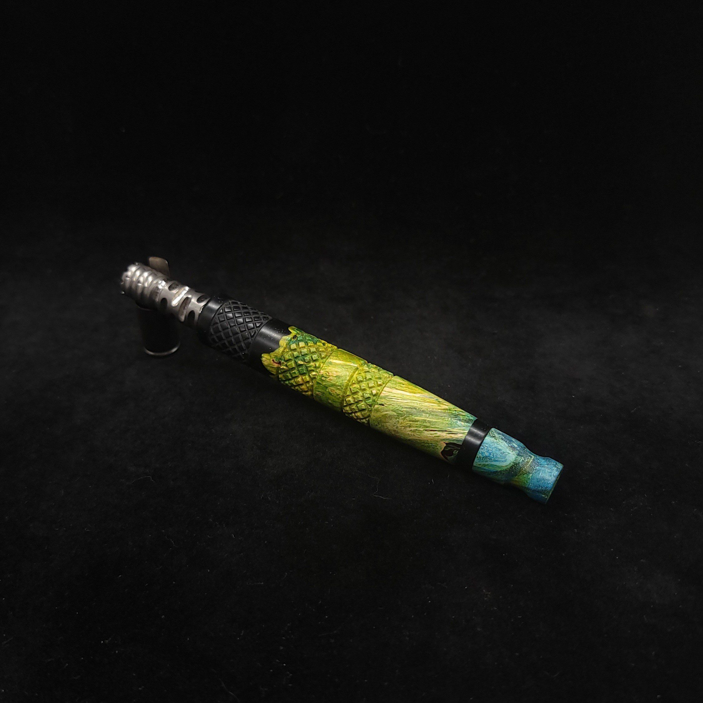 Quality dye stabilized box elder burl wood hybrid XL stem for Dynavap components. Burl wood has been dyed green/blue. Metal black resin to mimic the look of black metal. This stem has been designed with our high class knurled design carving, our latest high class series design. The design features added grip and tactile support as well as our 3mm hole 2x shield air-port. Stem has been finished with a matte/satin finish polishing which is all natural.