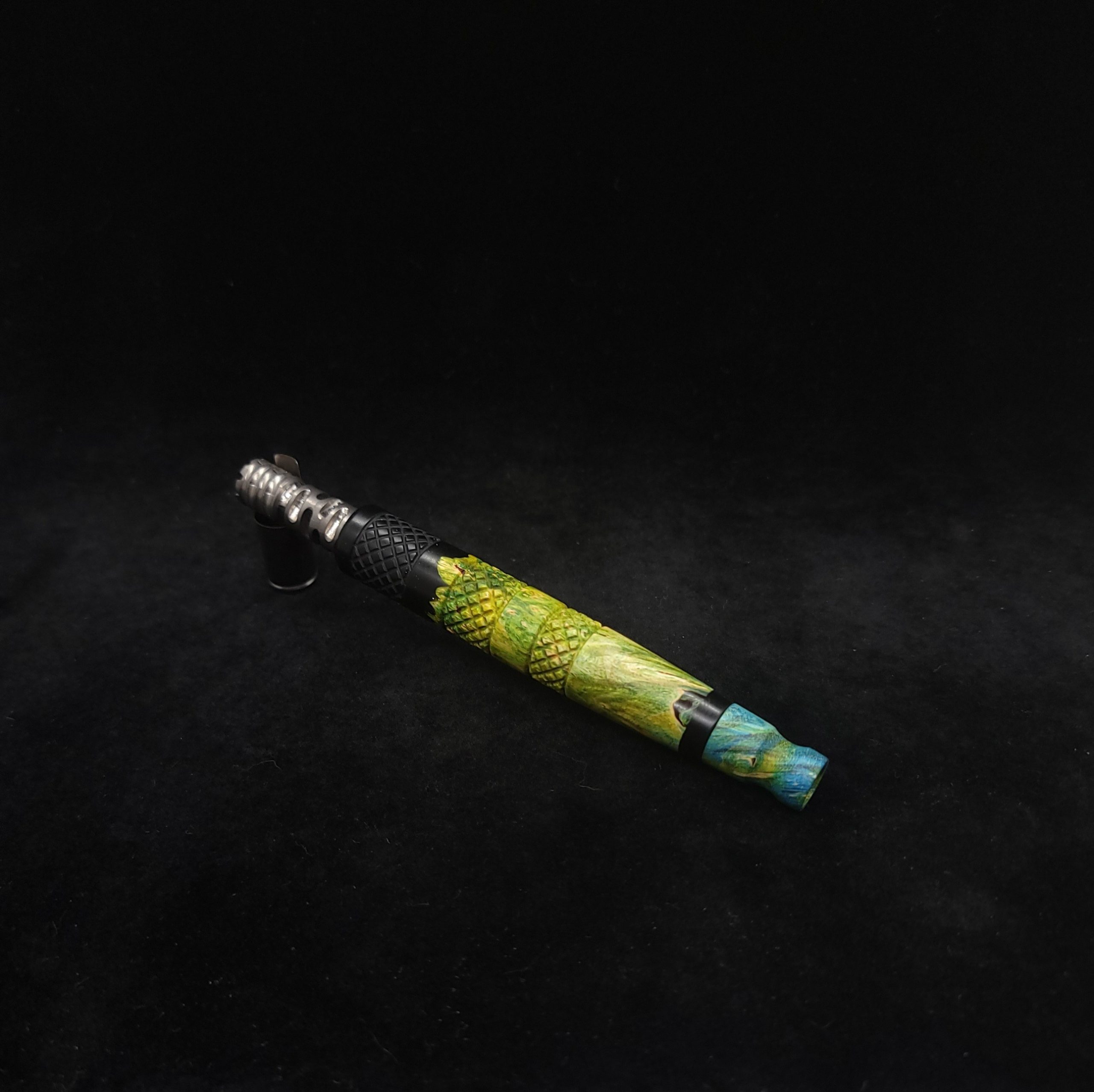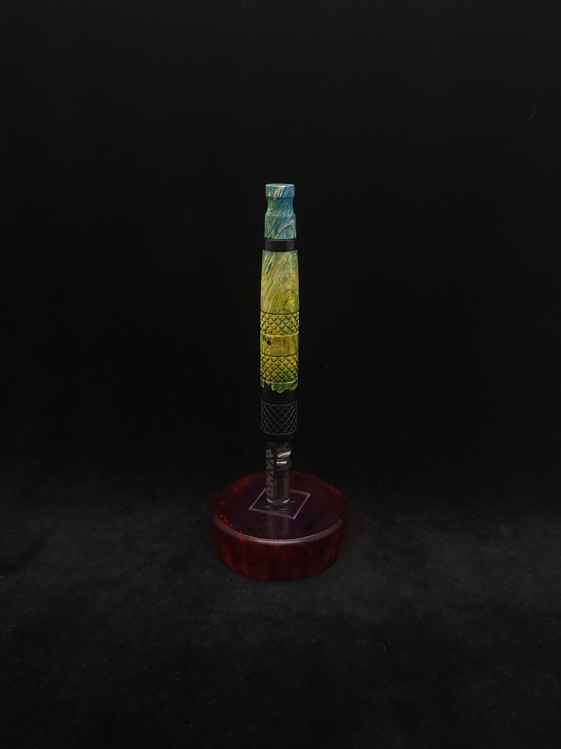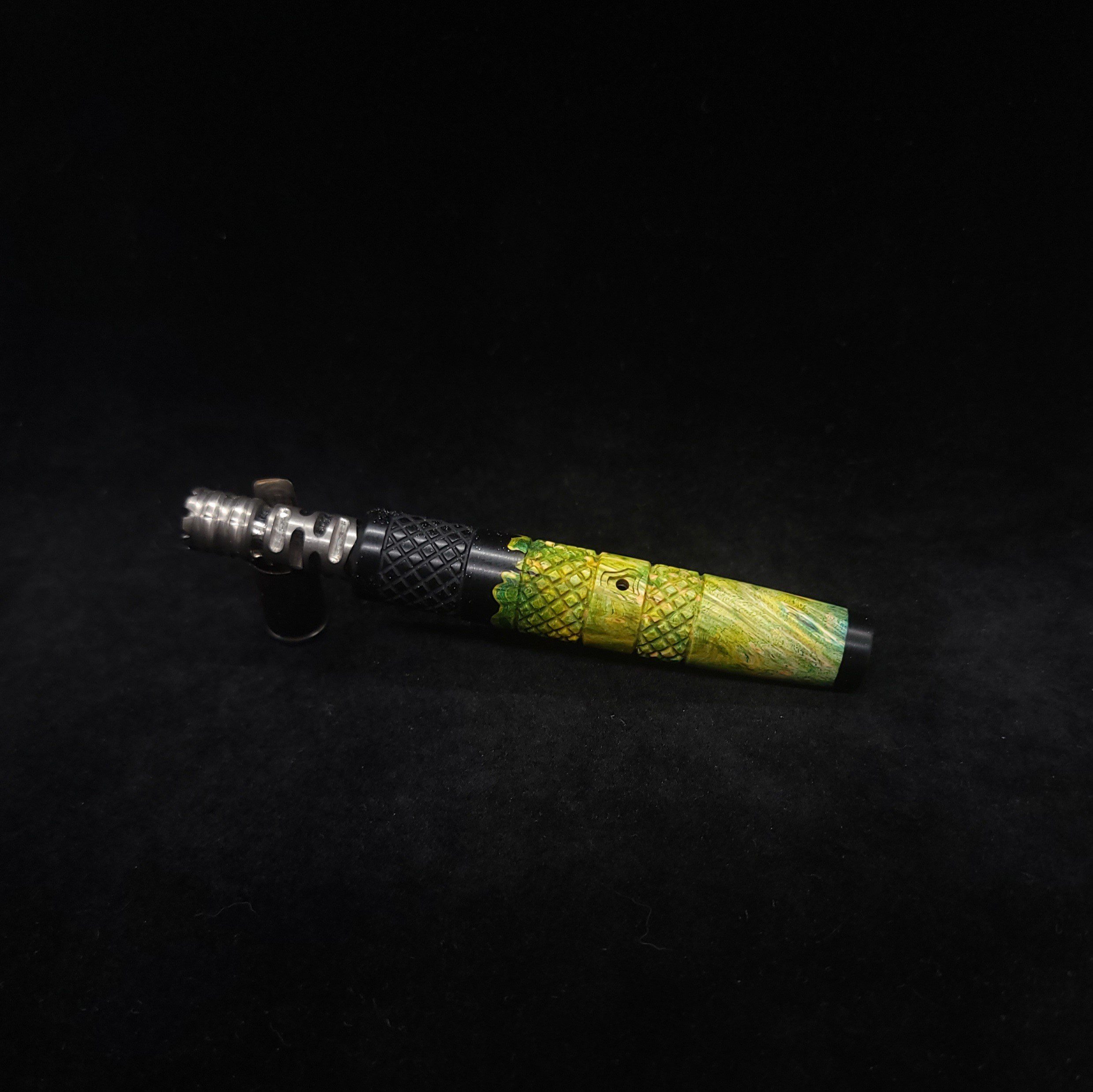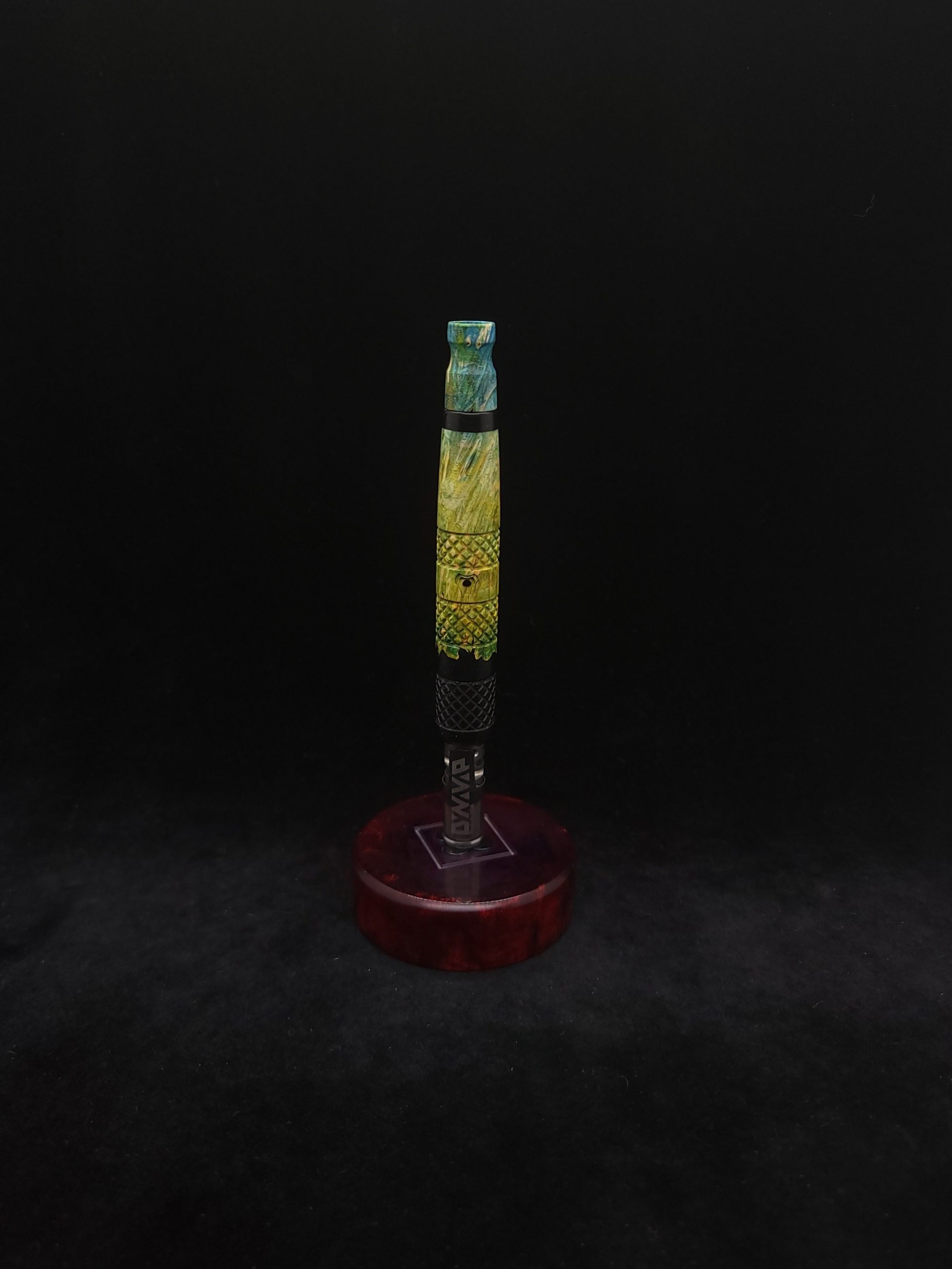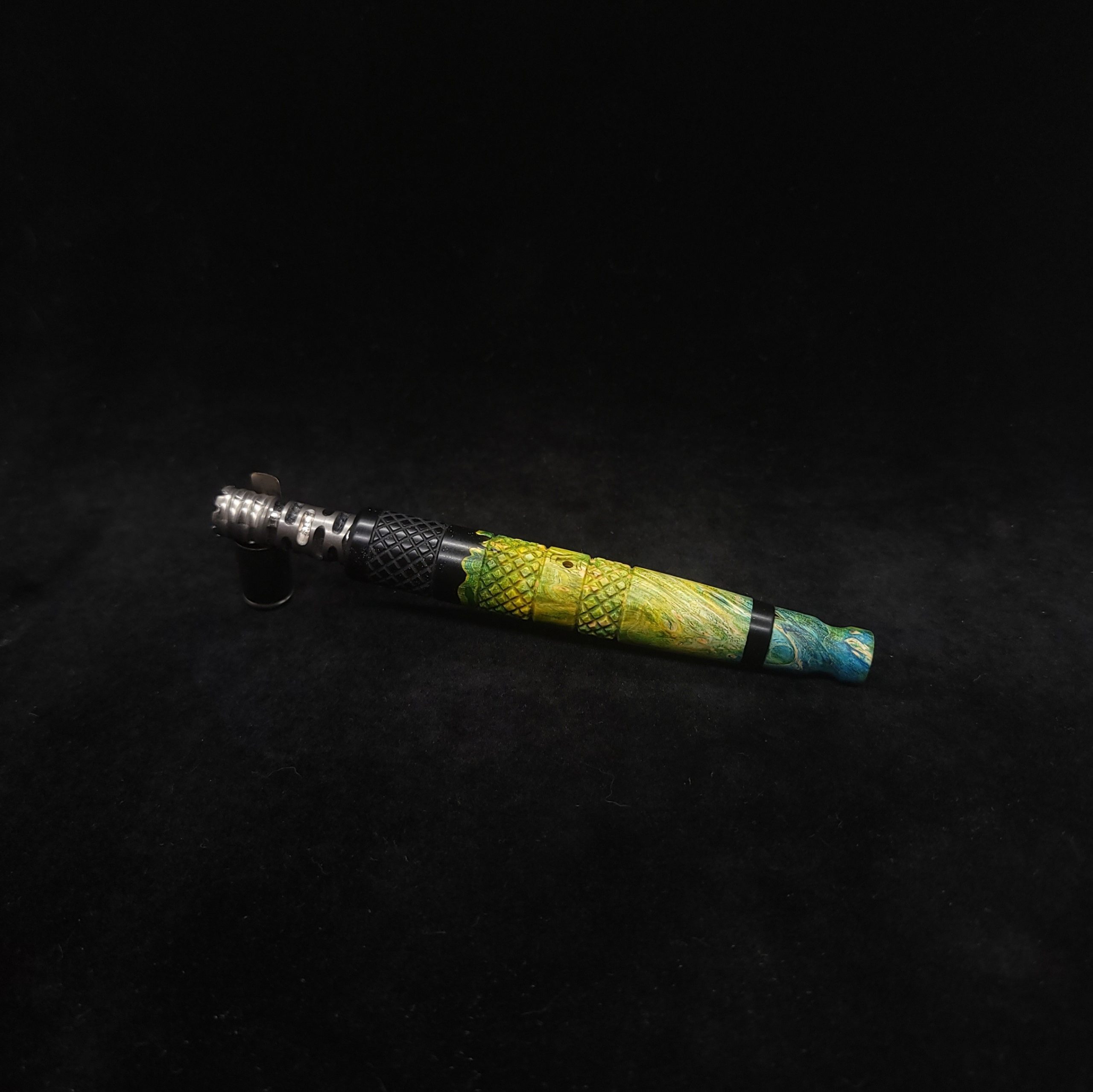 Quality dye stabilized box elder burl wood hybrid XL stem for Dynavap components. Burl wood has been dyed green/blue. Metal black resin to mimic the look of black metal. This stem has been designed with our high class knurled design carving, our latest high class series design. The design features added grip and tactile support as well as our 3mm hole 2x shield air-port. Stem has been finished with a matte/satin finish polishing which is all natural.