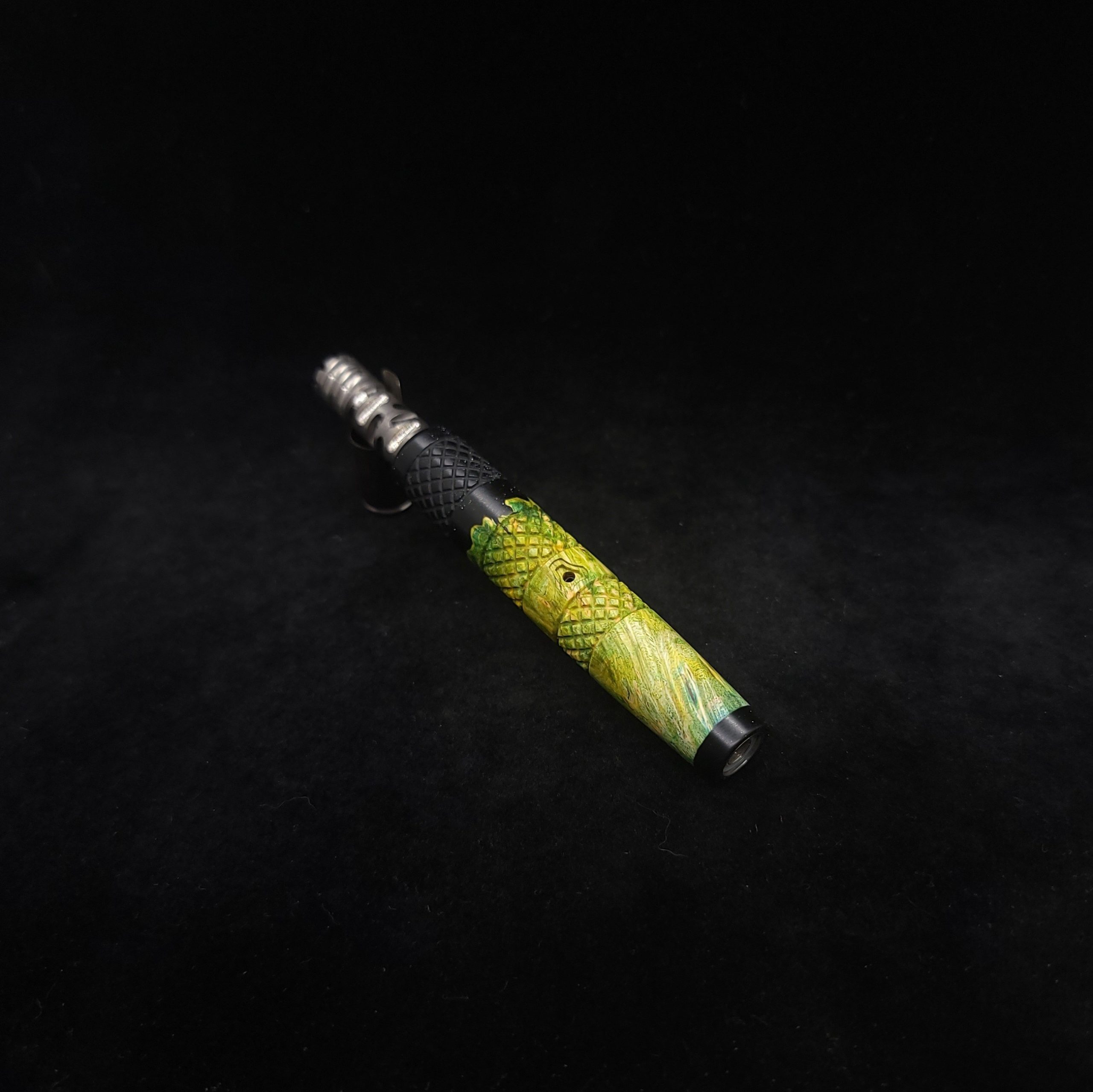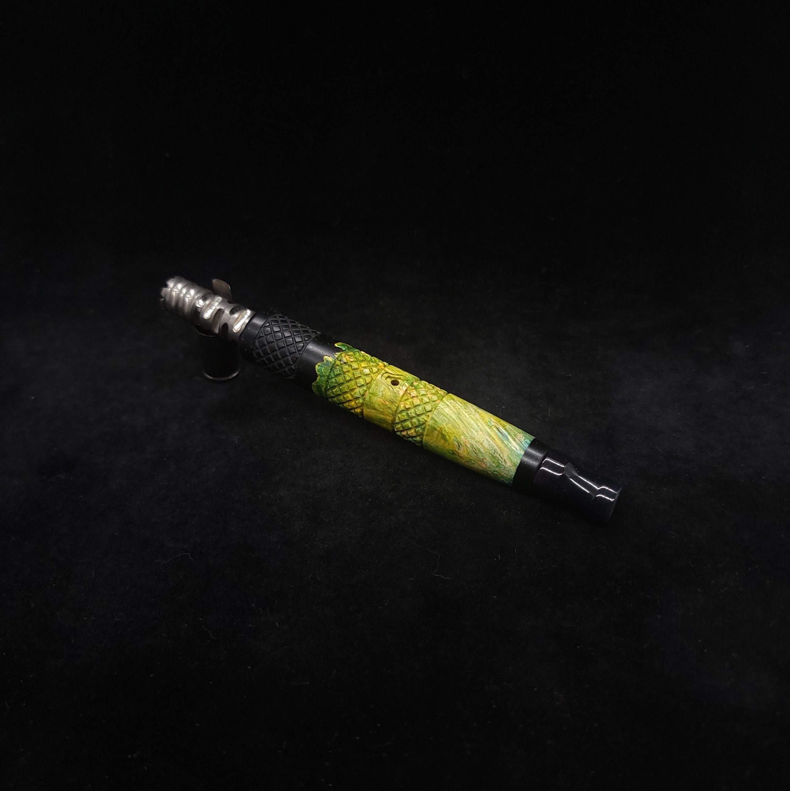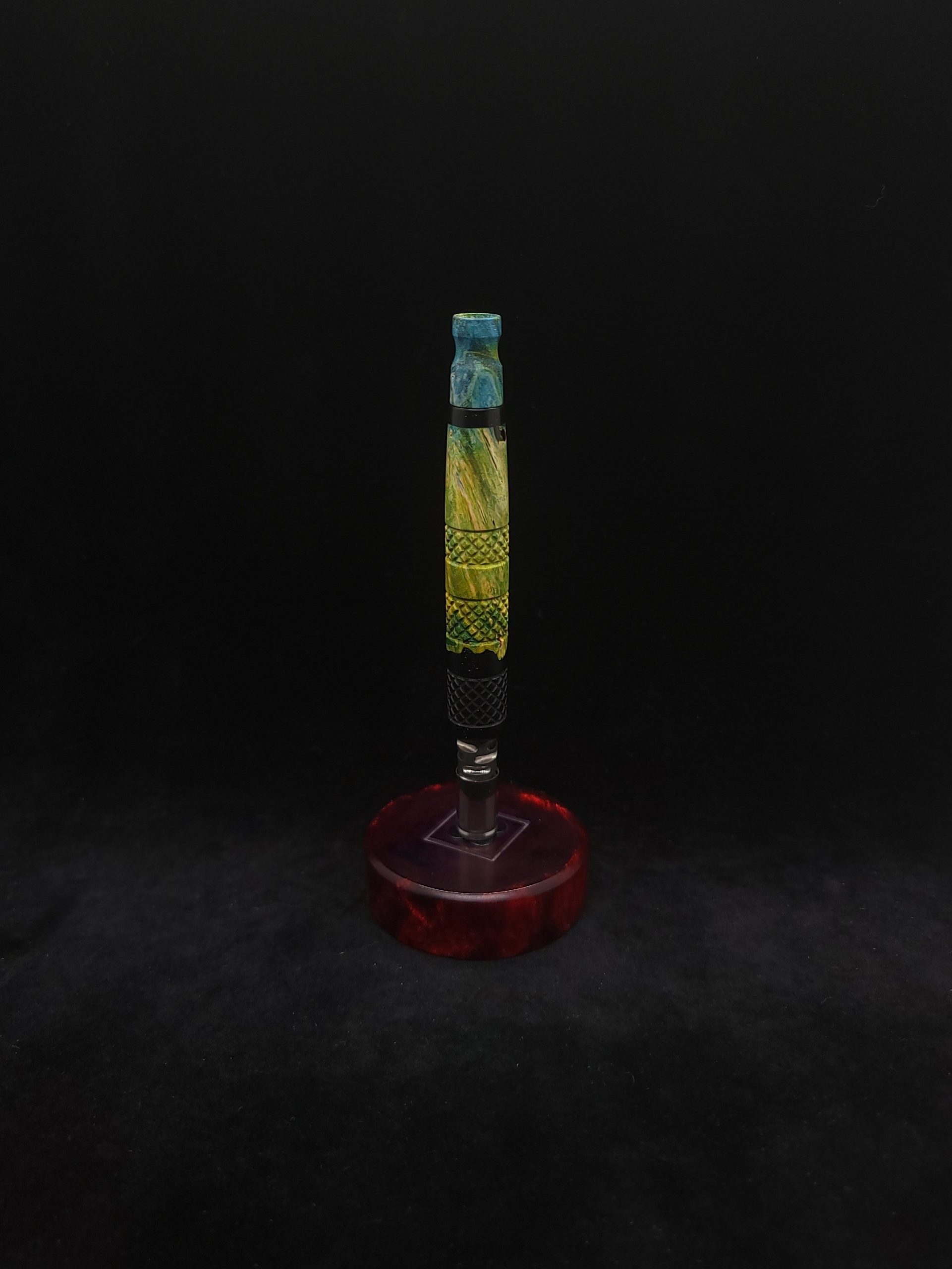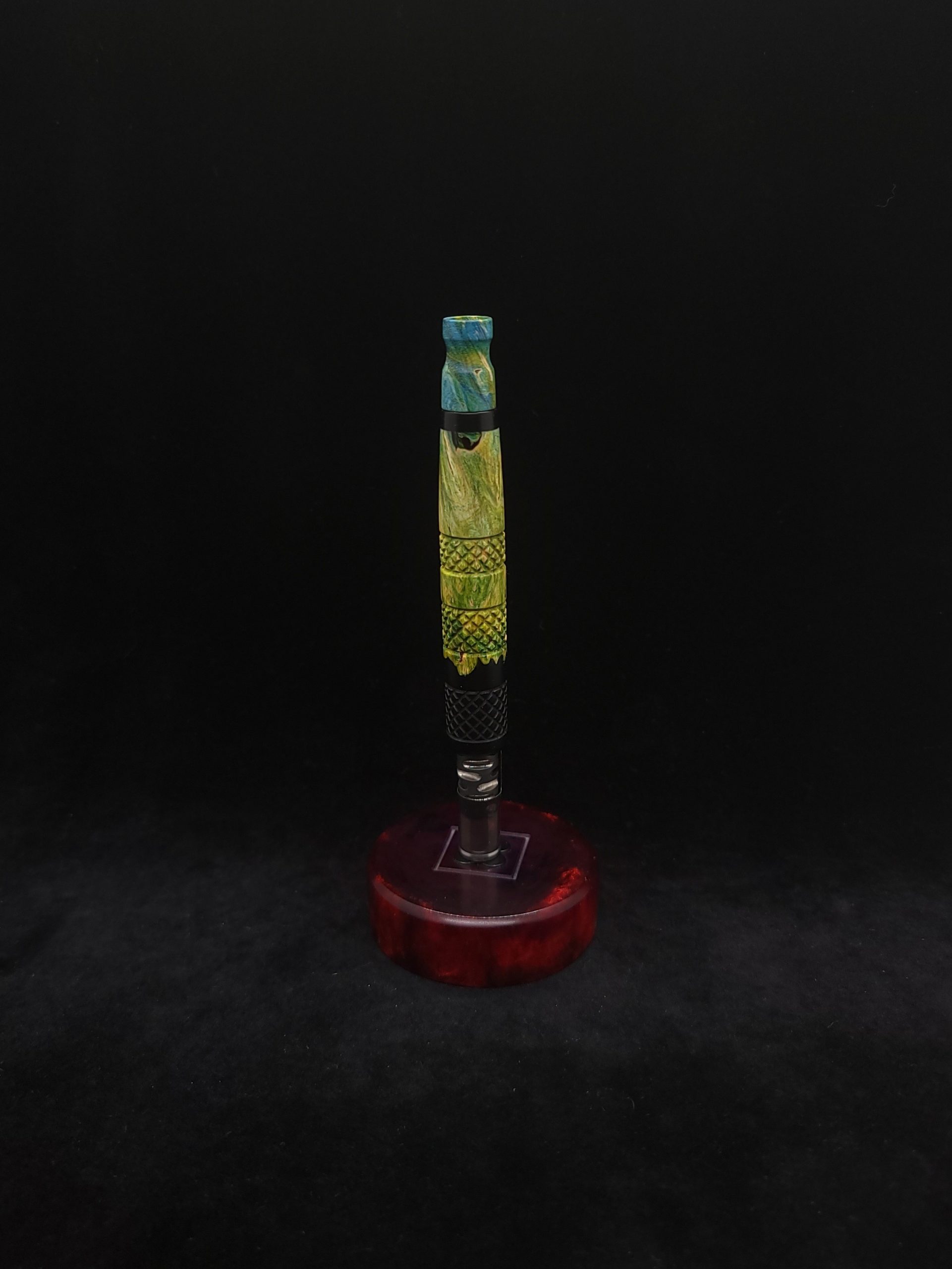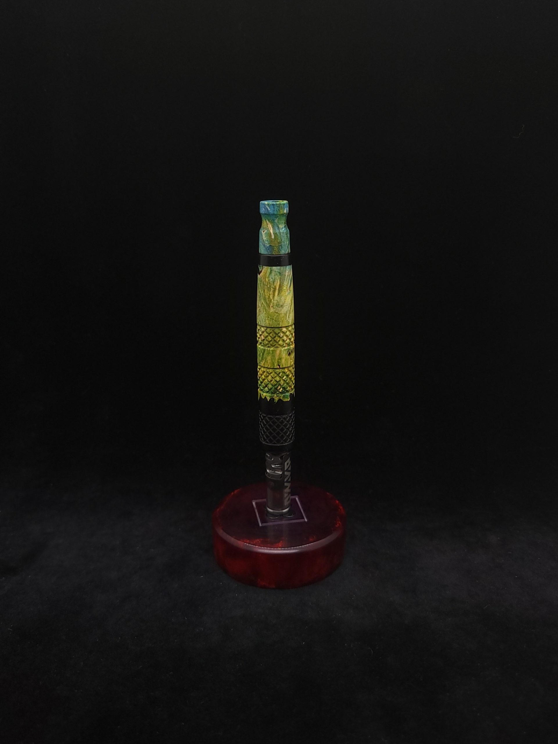 Quality dye stabilized box elder burl wood hybrid XL stem for Dynavap components. Burl wood has been dyed green/blue. Metal black resin to mimic the look of black metal. This stem has been designed with our high class knurled design carving, our latest high class series design. The design features added grip and tactile support as well as our 3mm hole 2x shield air-port. Stem has been finished with a matte/satin finish polishing which is all natural.