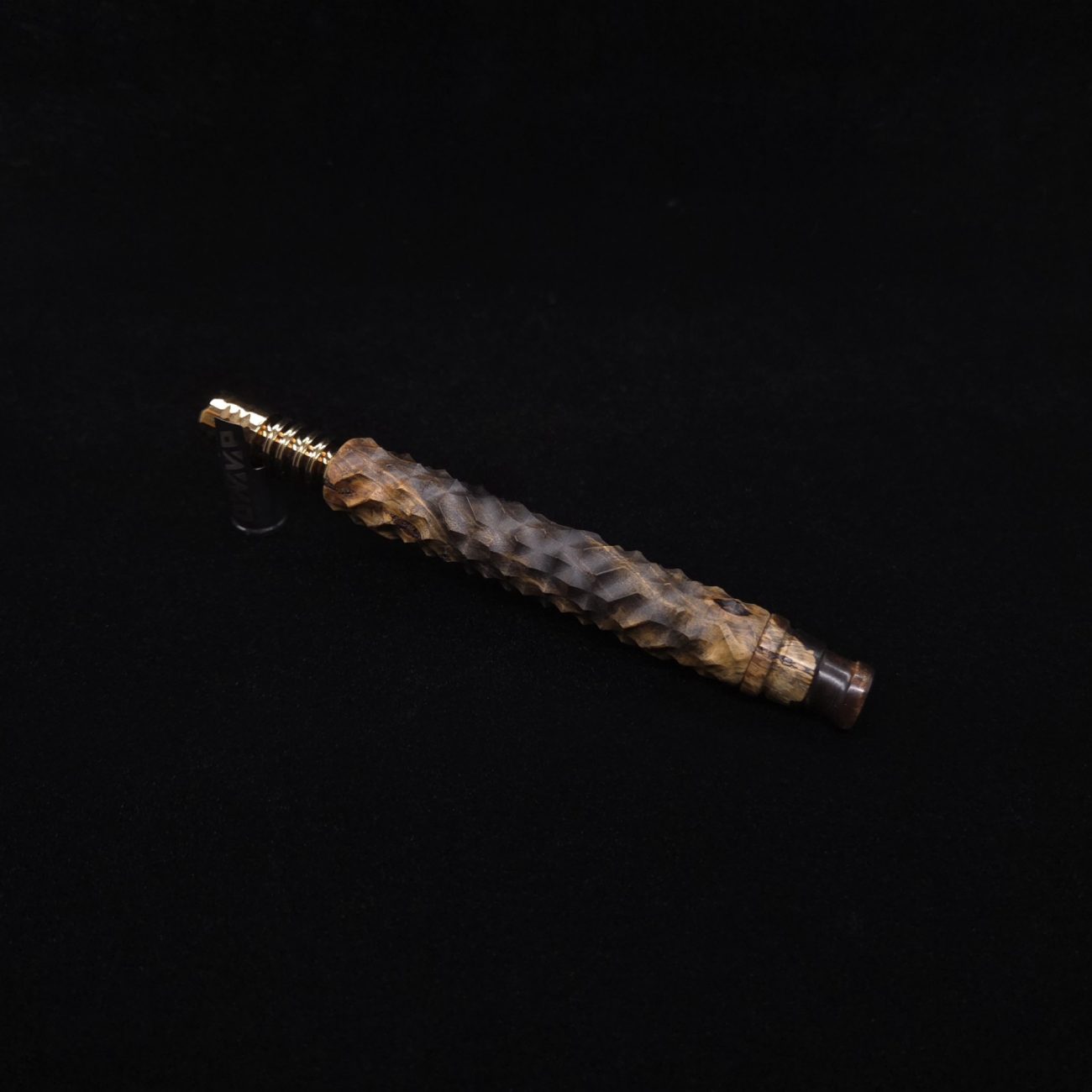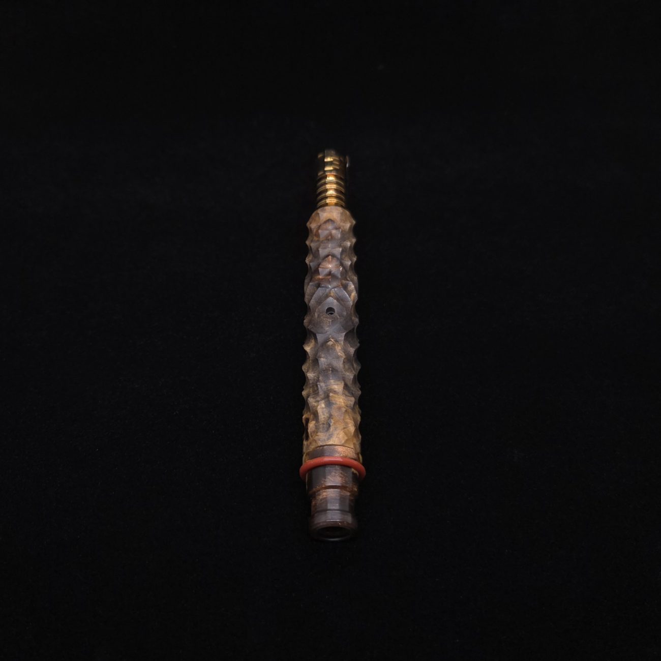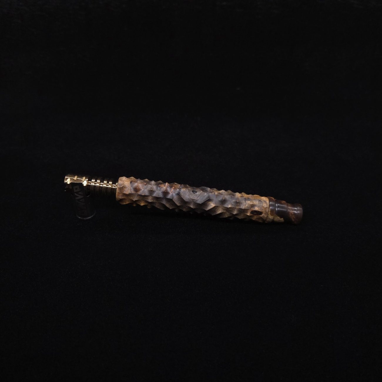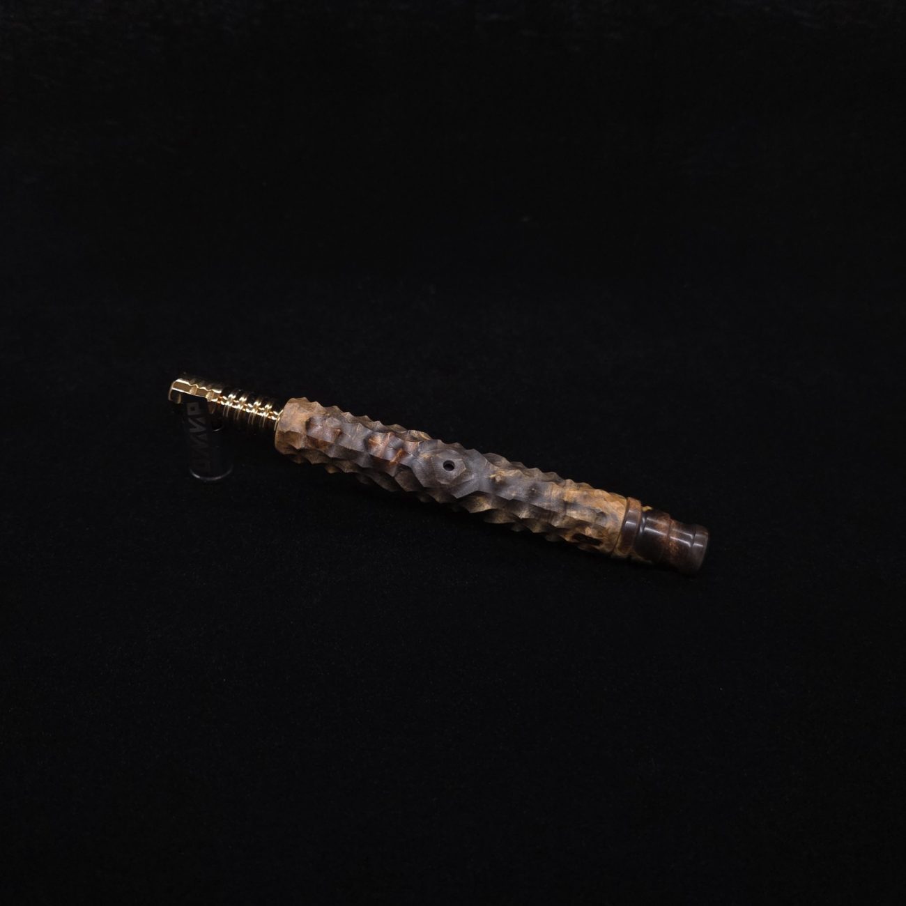 High quality pure buckeye burl wood hybrid XL length stem for Dynavap components. Along with one black book-matched wpa adaptable spinning mouthpiece. Burl has been colored a light brown with natural blacks and browns with hybrid colors in a rich metallic chocolate coloring. Mouthpiece has an o-ring groove where you attach one of the included o-rings for use with any 14mm hole glass water pipe. This is also another of our stem designs that has an amazing detailed complex cut that’s usually reserved for metal, but we’ve applied it to certain wood/resin stems that can hold such detailed cuts. The design has pointed sections cut in across the length of the stem with the concave airport centered and easy to locate. All of our stems do function with or without mouthpiece attached. Stem has been finished with a satin to low-gloss finish polishing and is all natural.