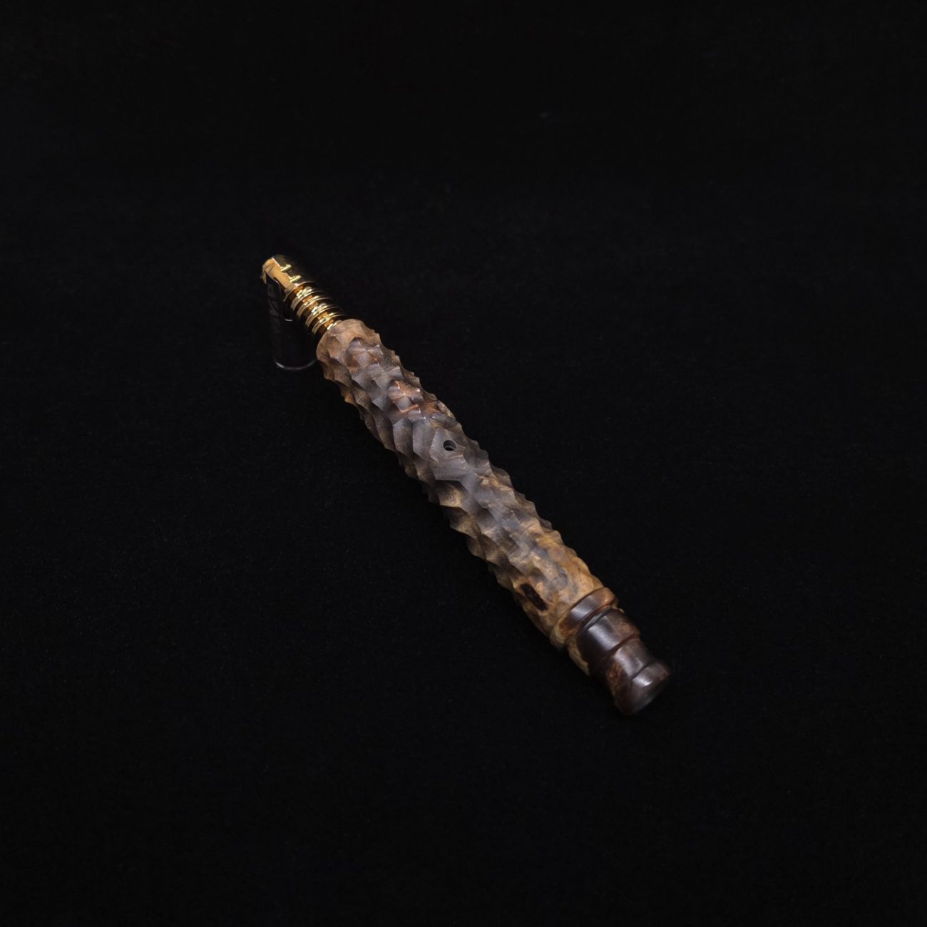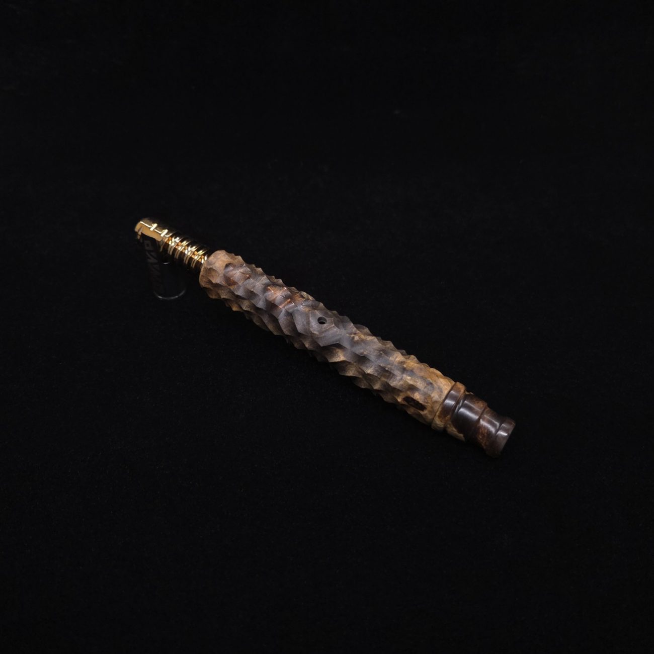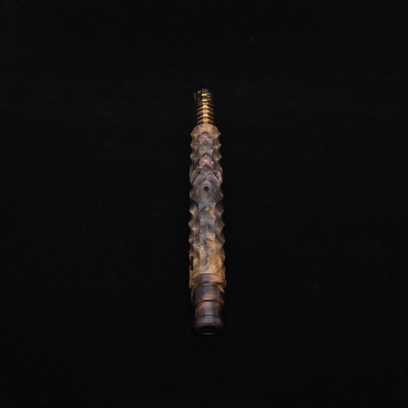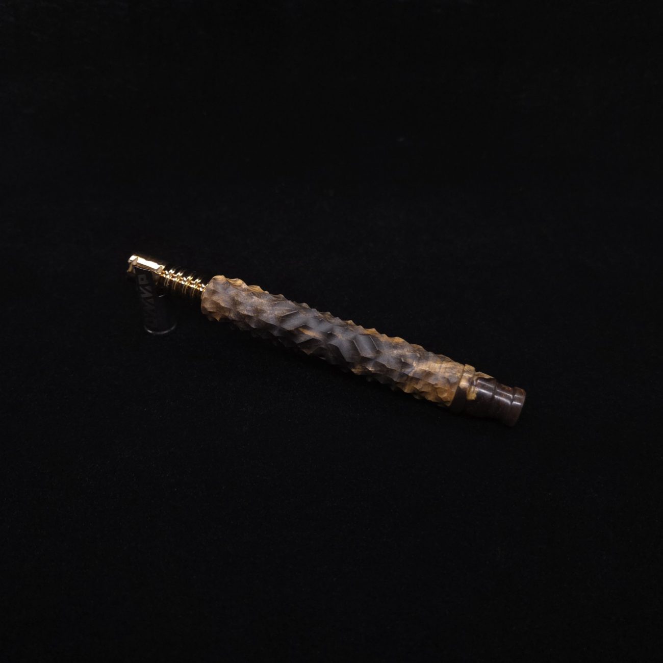 High quality pure buckeye burl wood hybrid XL length stem for Dynavap components. Along with one black book-matched wpa adaptable spinning mouthpiece. Burl has been colored a light brown with natural blacks and browns with hybrid colors in a rich metallic chocolate coloring. Mouthpiece has an o-ring groove where you attach one of the included o-rings for use with any 14mm hole glass water pipe. This is also another of our stem designs that has an amazing detailed complex cut that’s usually reserved for metal, but we’ve applied it to certain wood/resin stems that can hold such detailed cuts. The design has pointed sections cut in across the length of the stem with the concave airport centered and easy to locate. All of our stems do function with or without mouthpiece attached. Stem has been finished with a satin to low-gloss finish polishing and is all natural.