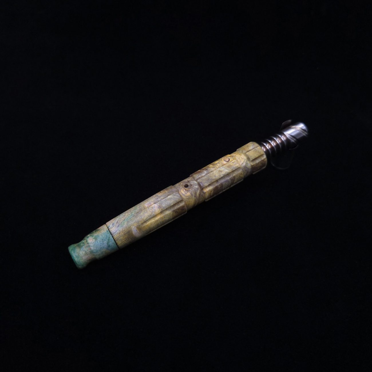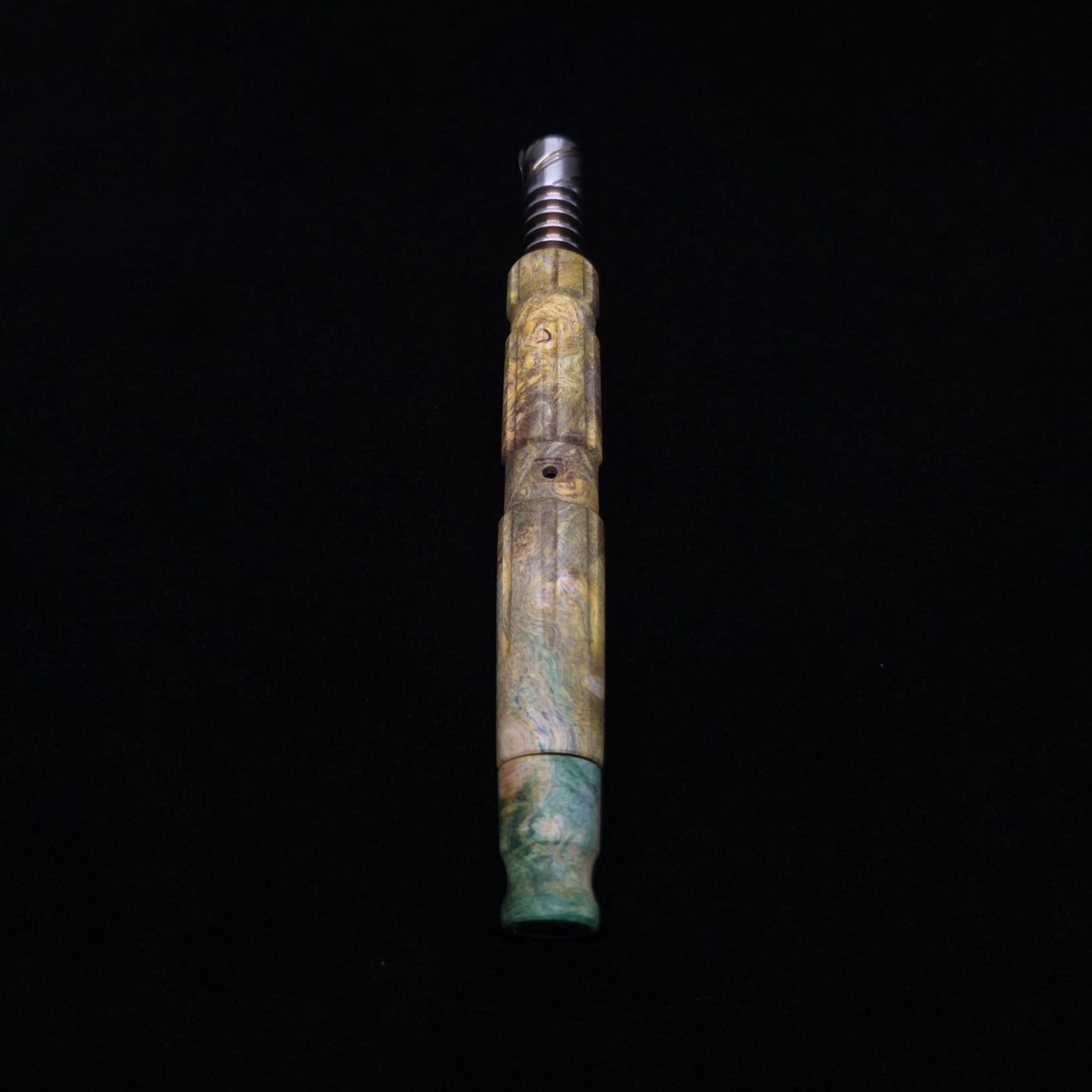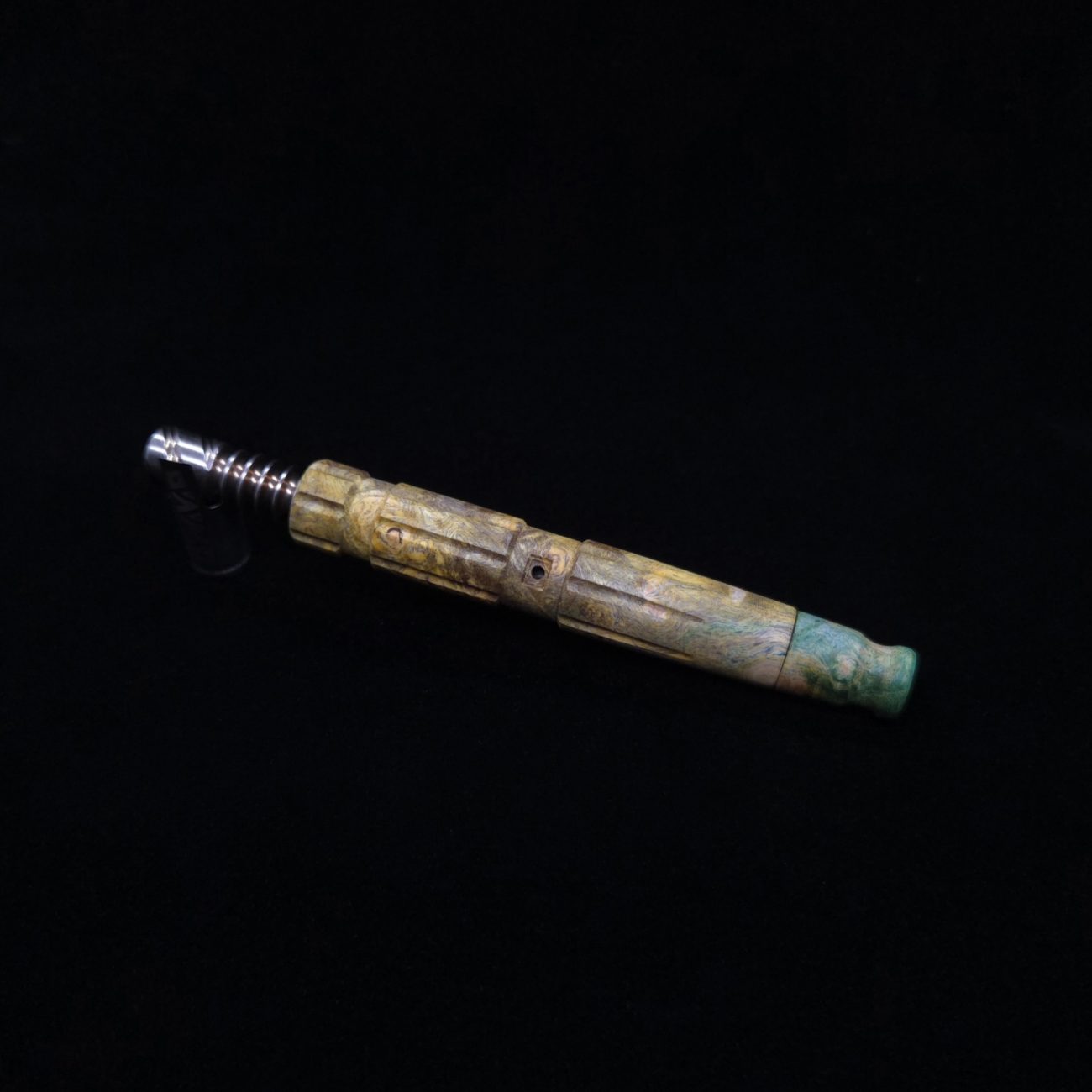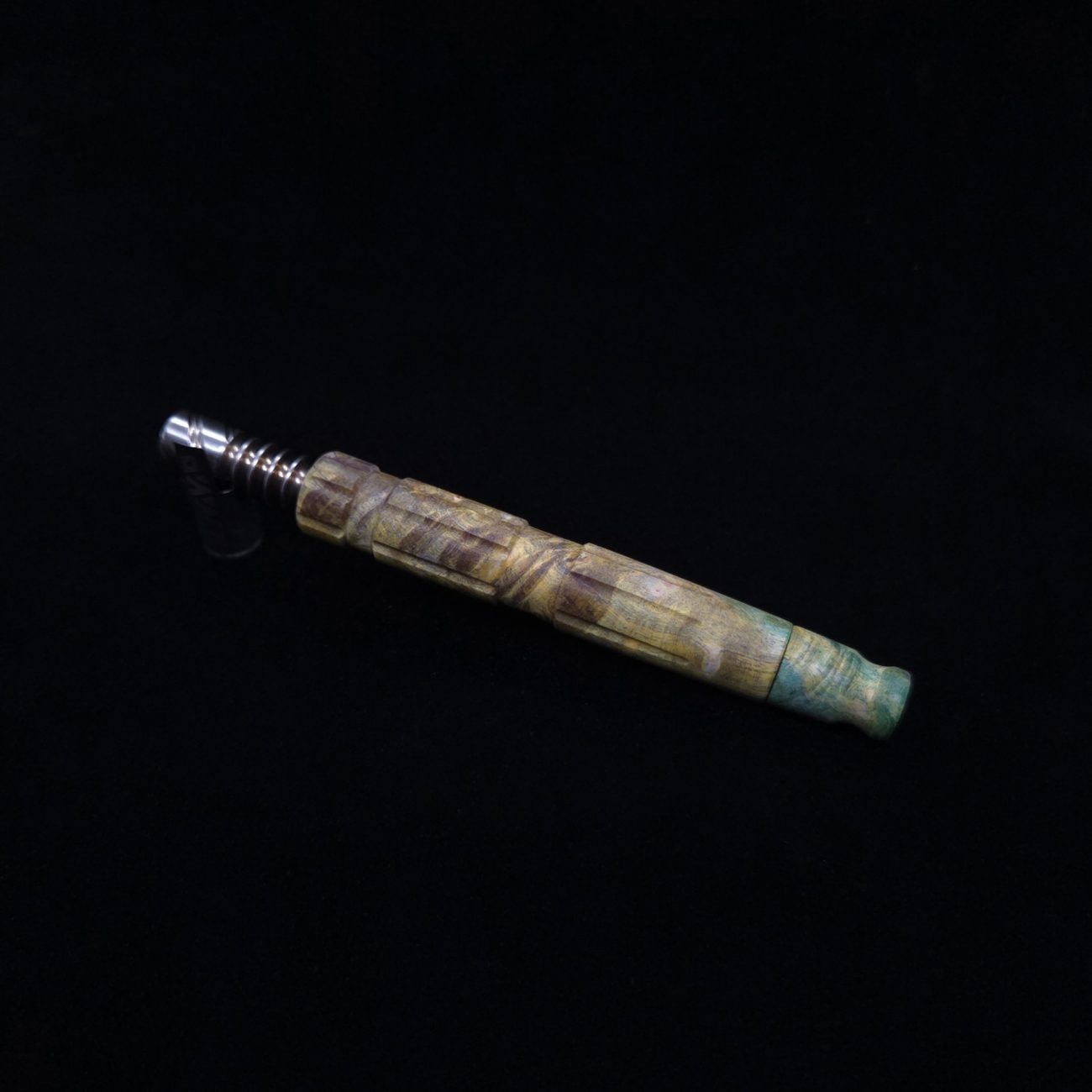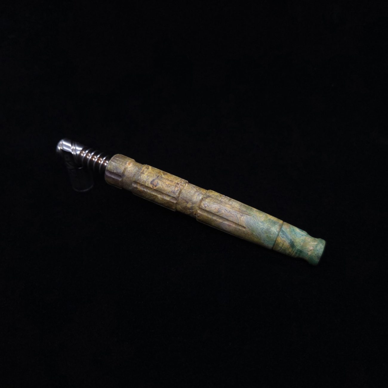 High quality box elder burl wood XL length stem for Dynavap components. Along with a book-matched mouthpiece. Burl is colored golden, green and blue with naturally occurring black and natural wood tones. This specialty high class design is a simple, stately design with two cutout sections with one in the center for airport placement. Then seven grooves cut lengthwise. All of our stems function with or without mouthpiece attached. Stem has been finished with a satin finish polishing and is all natural.