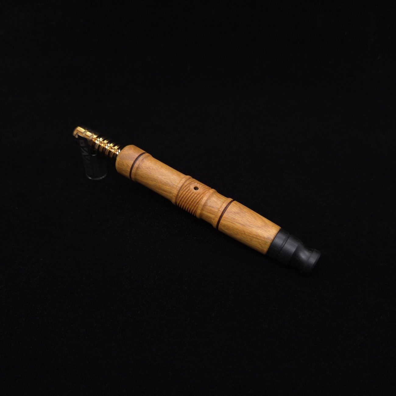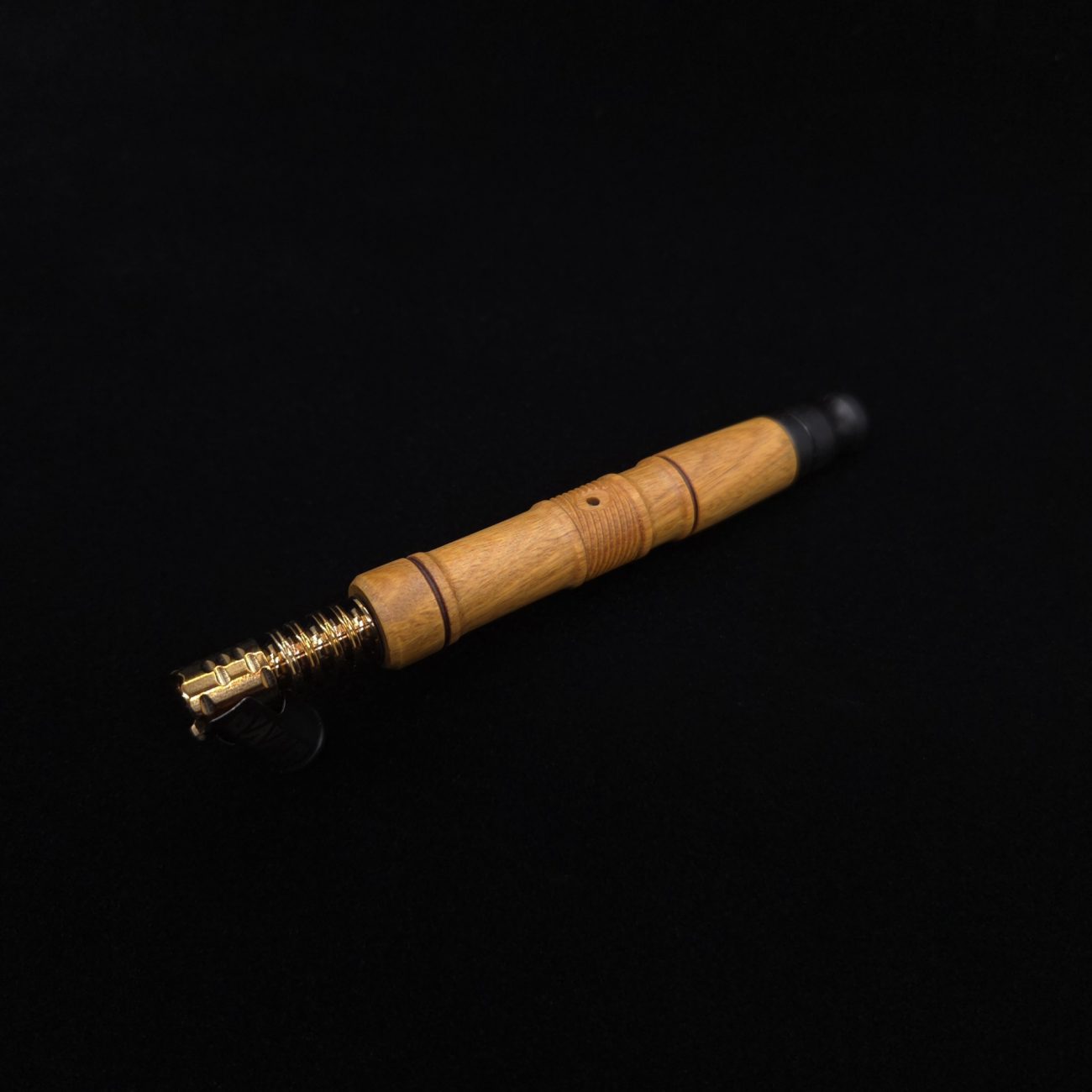 Stem has a precision drilled hole that gets fitted with a thin wall, medical grade stainless steel tube/liner. This makes the stem perfectly compatible with the Dynavap parts as well as adding rigidity and weight making it feel nice when held. The weight also gives it the same feel when in use as your used to with the metal Dynavap midsections. Once the stem is created it then gets sanded and polished using our nature based polish/waxes. Everything made in our shop is hand crafted.