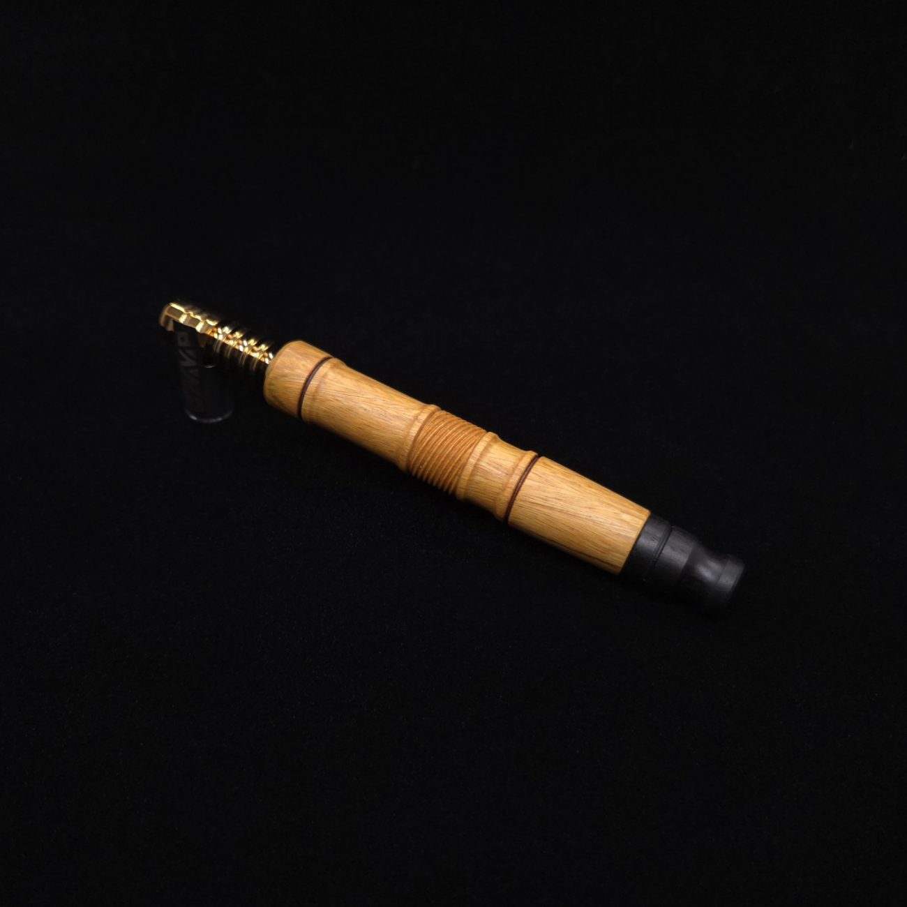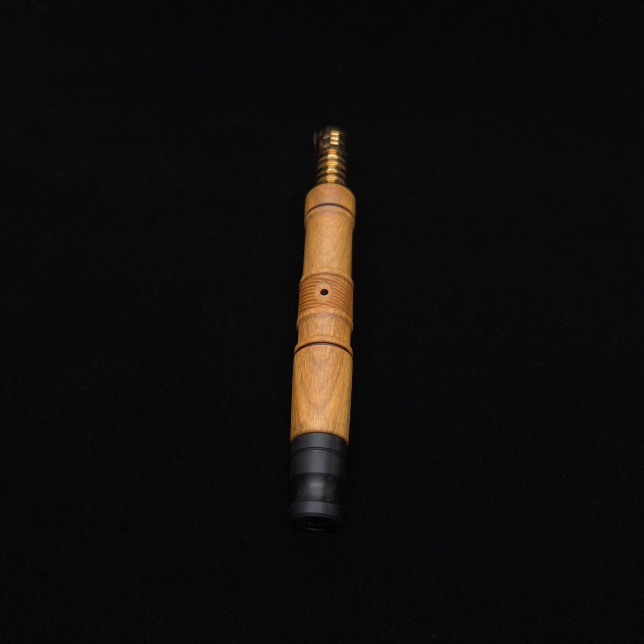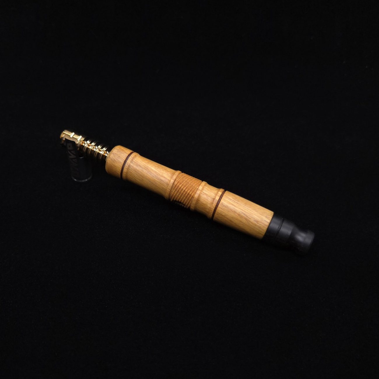 High quality lignum vitae (tree of life) wood XL length stem for Dynavap components. Along with a specialty design ebony wood m.p. This stem design is a high class version of our vertex stems. It is another of our stem designs that has an amazing detailed complex cut that’s usually reserved for metal, but we’ve applied it to certain wood/resin stems that can hold such detailed cuts…and look great doing it. The design has spiraled v-cuts over the centered air-port section. The v-cut lines are a great tactile feature. Along with 2 lightly burnished lines and grooved cutout sections. All of our stems function with or without mouthpiece attached. Stem has been finished with a satin finish polishing and is all natural.