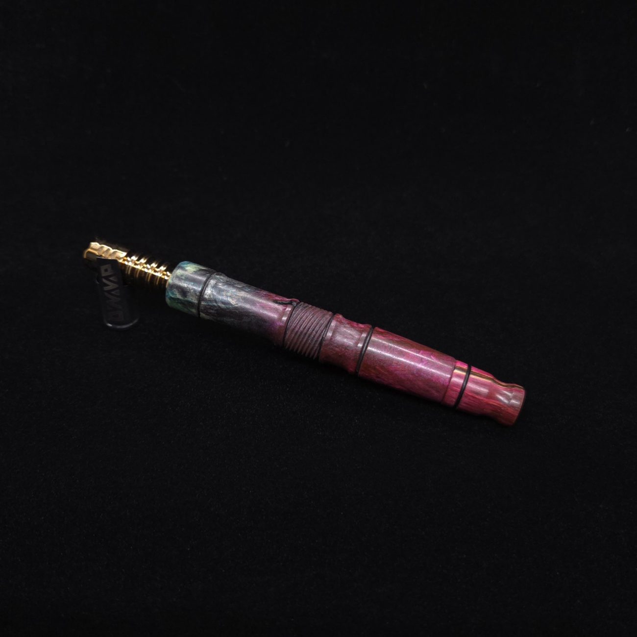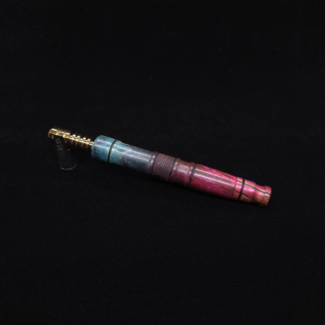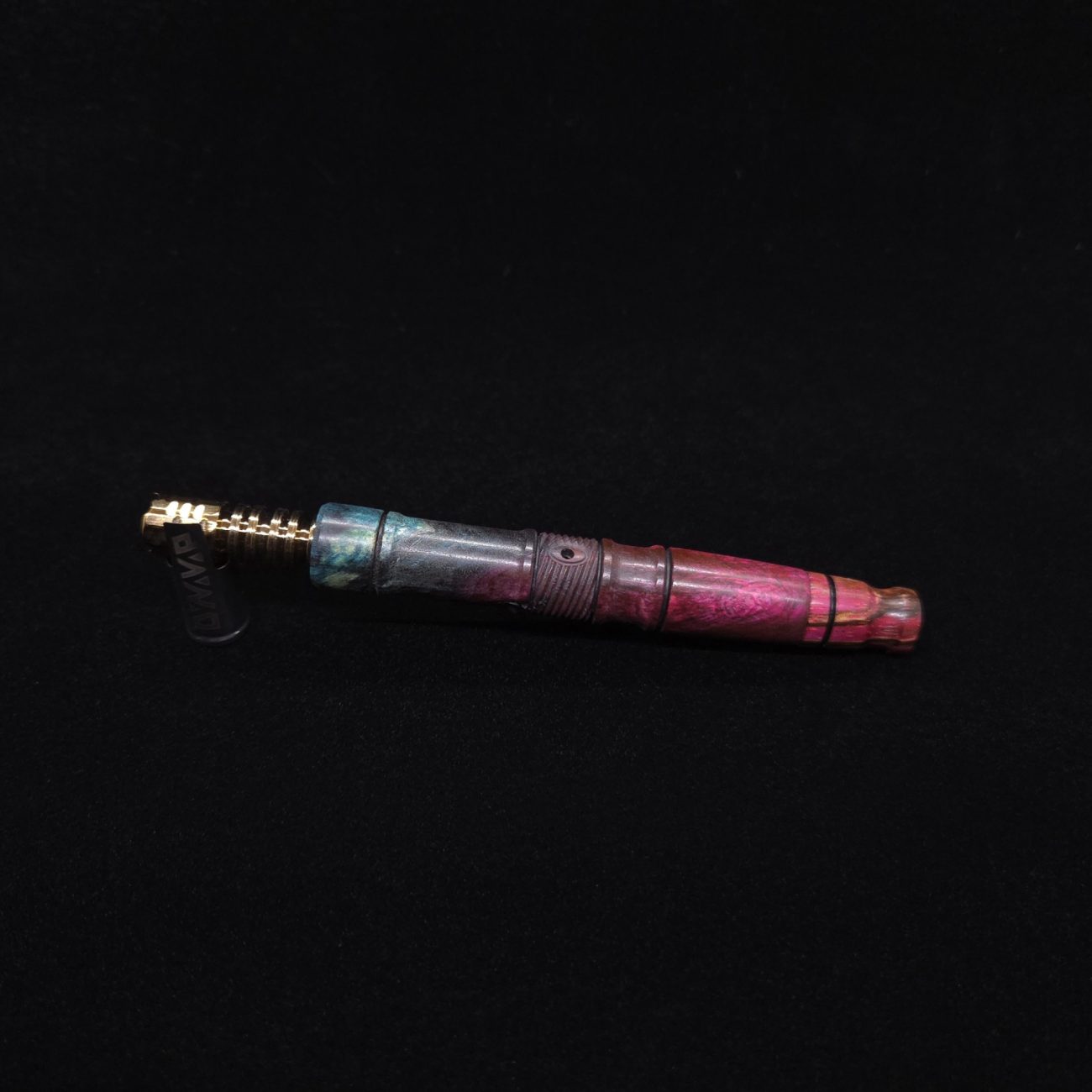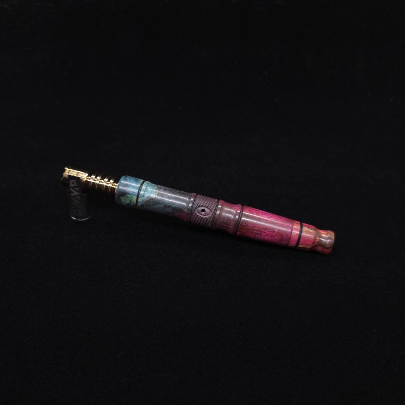High quality buckeye burl wood XL length stem for Dynavap components. Along with a specialty design zebrawood m.p. Stem has been colored from vibrant blue/green teal to vibrant pink along with the mouthpiece. Stem does already have a 14mm taper to work with 14mm glass bong setups, but also included is (2) o-rings that fit onto mouthpiece accent groove to use with glass device as well to give multiple options fort this. This stem design is a high class version of our vertex stems. It is another of our stem designs that has an amazing detailed complex cut that’s usually reserved for metal, but we’ve applied it to certain wood/resin stems that can hold such detailed cuts…and look great doing it. The design has spiraled v-cuts over the centered air-port section. The v-cut lines are a great tactile feature. Along with 2 lightly burnished lines and grooved cutout sections. All of our stems function with or without mouthpiece attached. Stem has been finished with a satin finish polishing and is all natural.