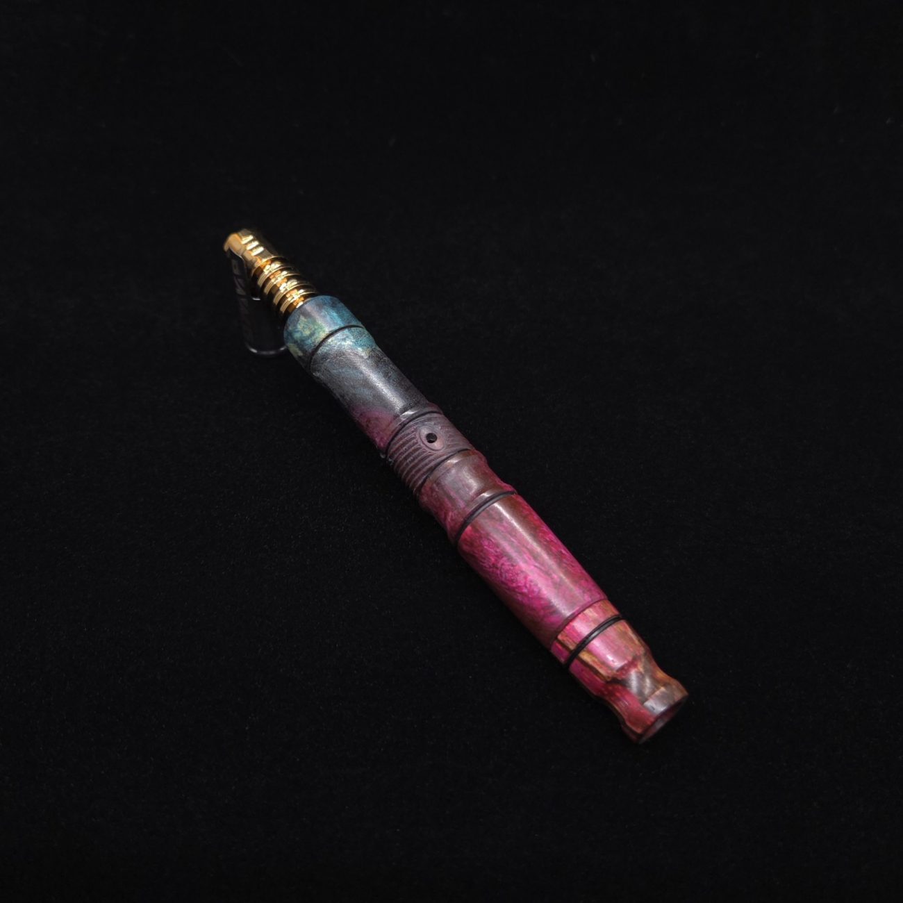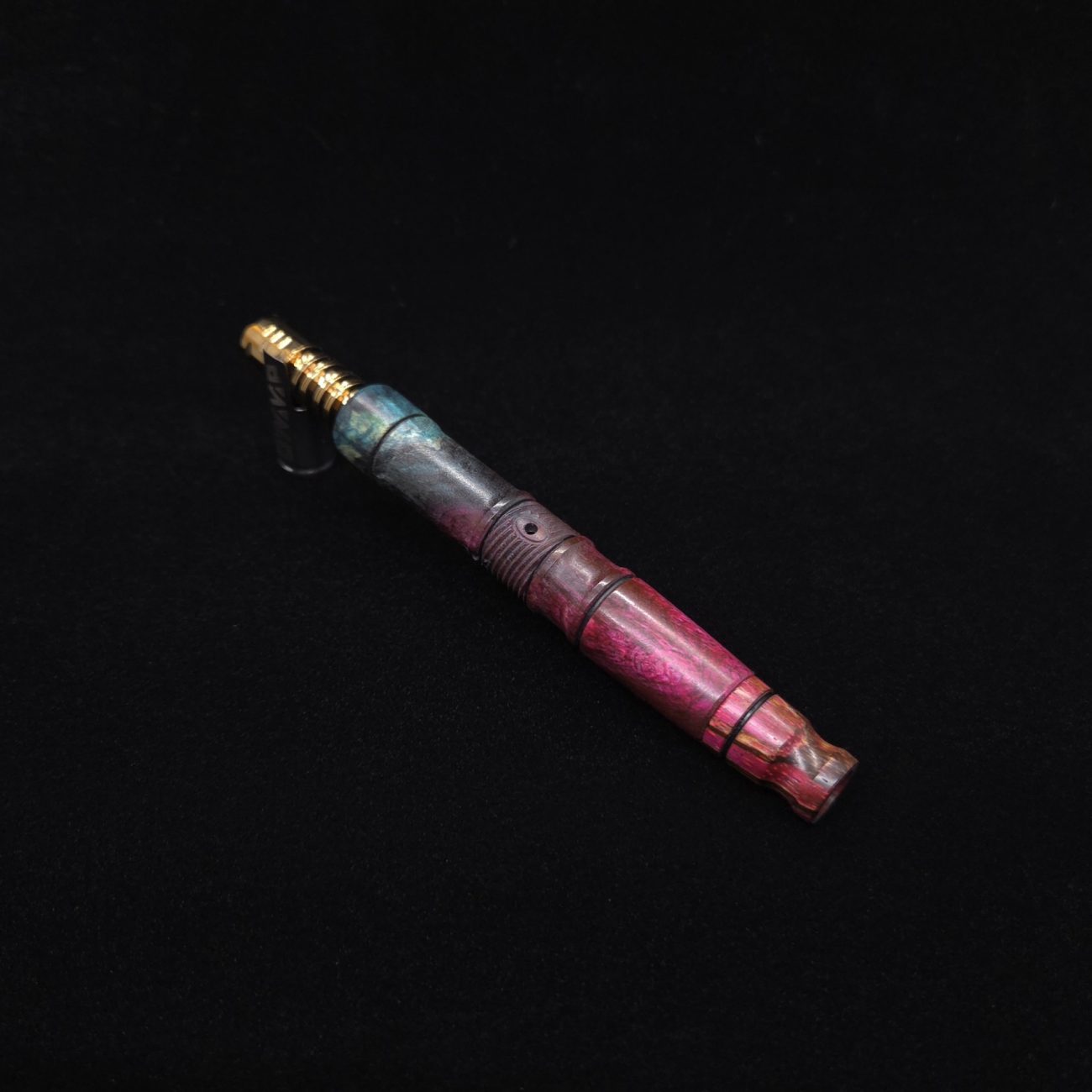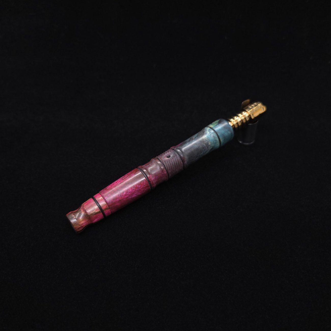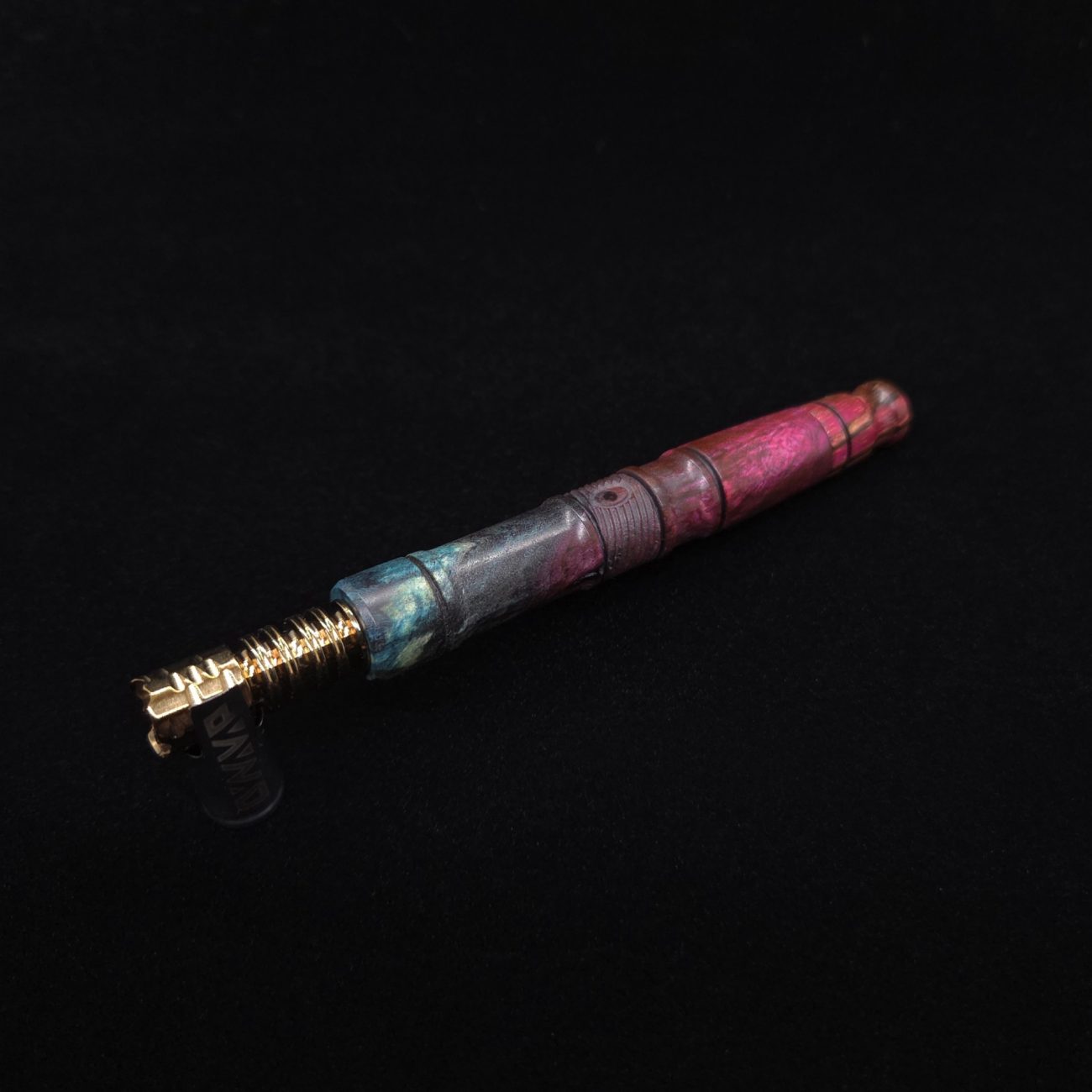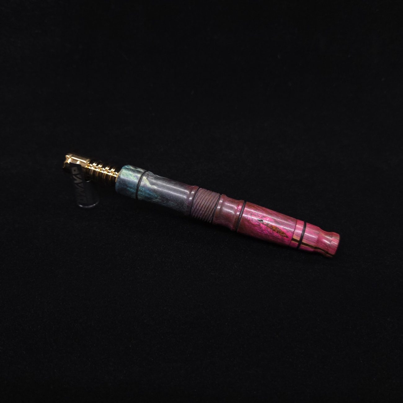 High quality buckeye burl wood XL length stem for Dynavap components. Along with a specialty design zebrawood m.p. Stem has been colored from vibrant blue/green teal to vibrant pink along with the mouthpiece. Stem does already have a 14mm taper to work with 14mm glass bong setups, but also included is (2) o-rings that fit onto mouthpiece accent groove to use with glass device as well to give multiple options fort this. This stem design is a high class version of our vertex stems. It is another of our stem designs that has an amazing detailed complex cut that’s usually reserved for metal, but we’ve applied it to certain wood/resin stems that can hold such detailed cuts…and look great doing it. The design has spiraled v-cuts over the centered air-port section. The v-cut lines are a great tactile feature. Along with 2 lightly burnished lines and grooved cutout sections. All of our stems function with or without mouthpiece attached. Stem has been finished with a satin finish polishing and is all natural.