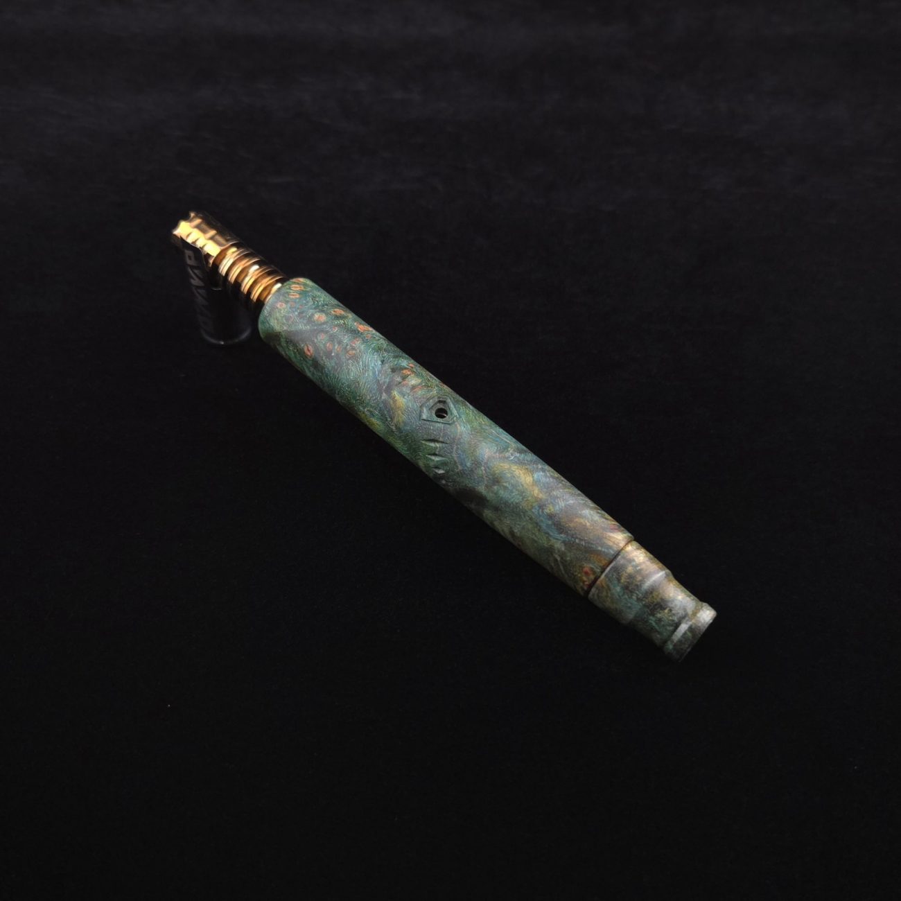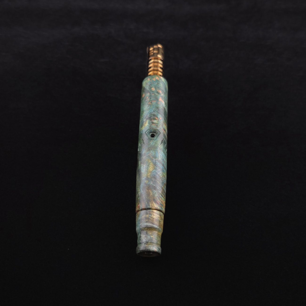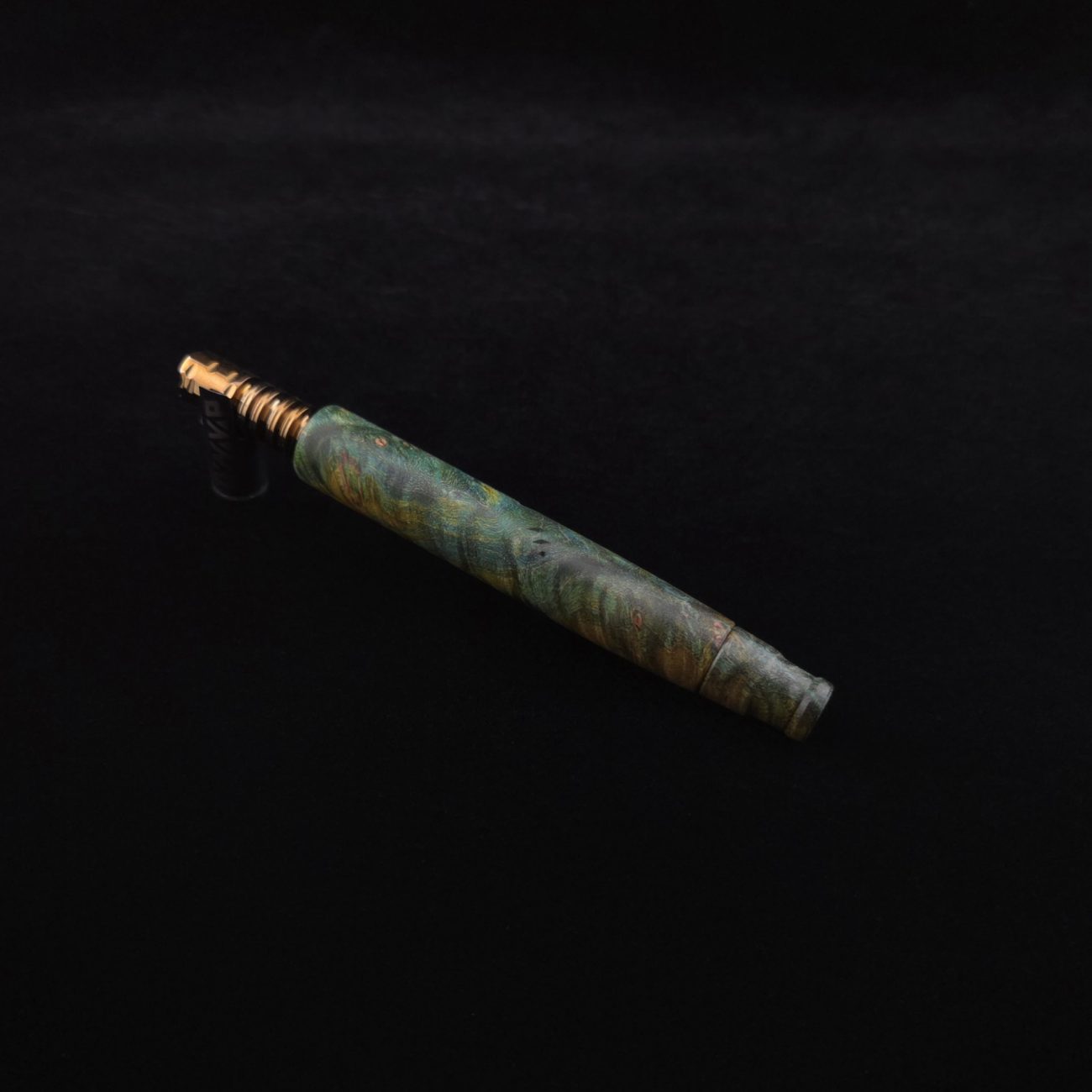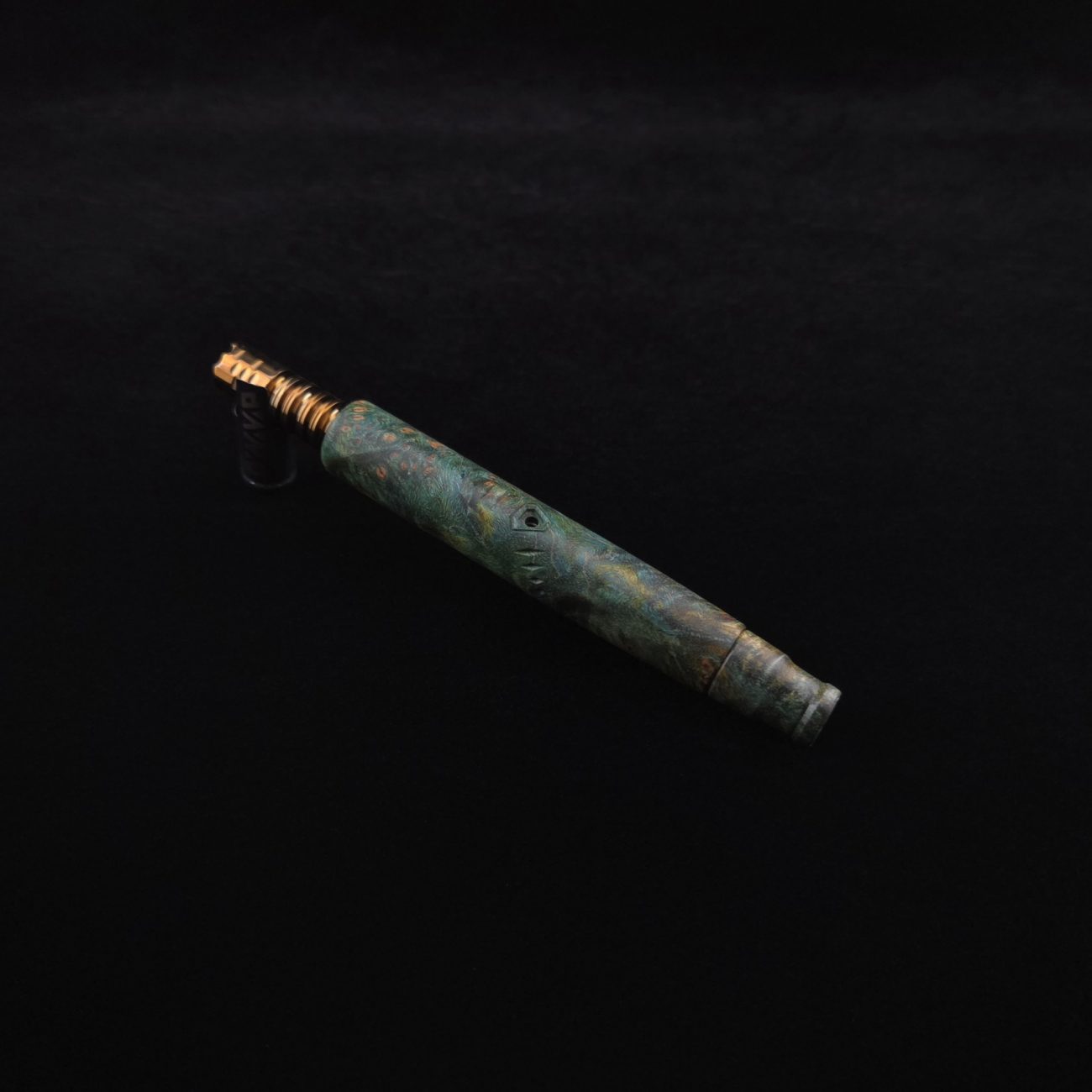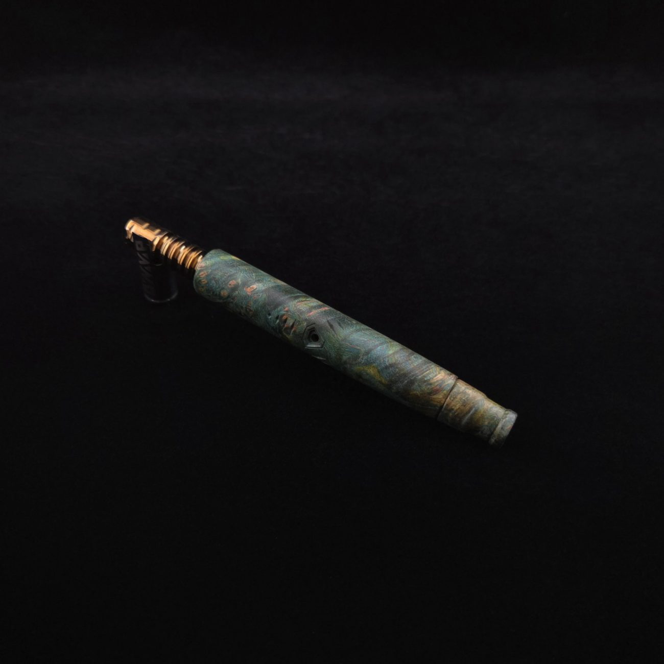 High quality and highly figured maple burl XL length stem for Dynavap components. Along with a specialty book-matched spinning mouthpiece. Cosmic burl coloring in vibrant blues and greens. This stem is our nova design with the straight blunt style taper design. Straight taper refers to 2/3 being straight cut and 1/3 having the taper cut at the mouthpiece end. This is a uniquely designed blunt stem having the nova diamond cut accent lines triangulated around the triangular air-port design drawing attention to the air-port. All of our stems function with or without mouthpiece attached. Stem has been finished with a smooth semi-gloss finish polishing and is all natural.