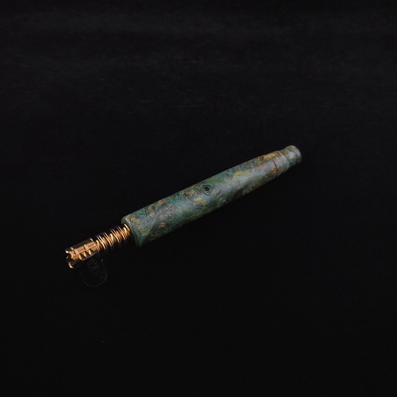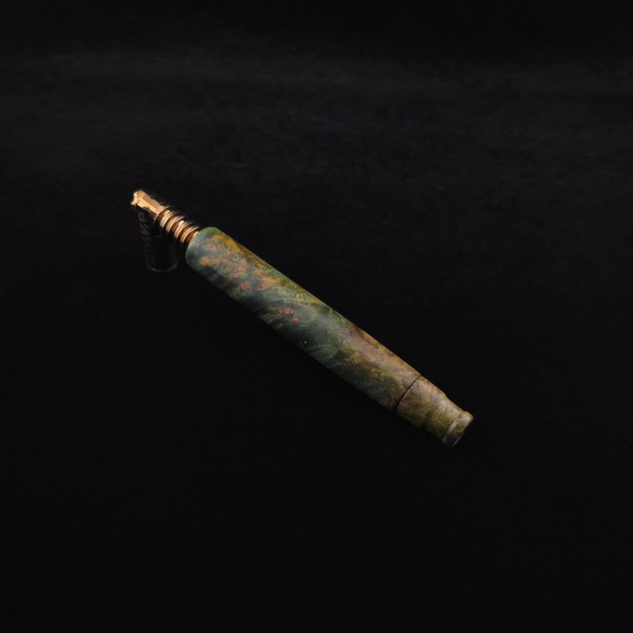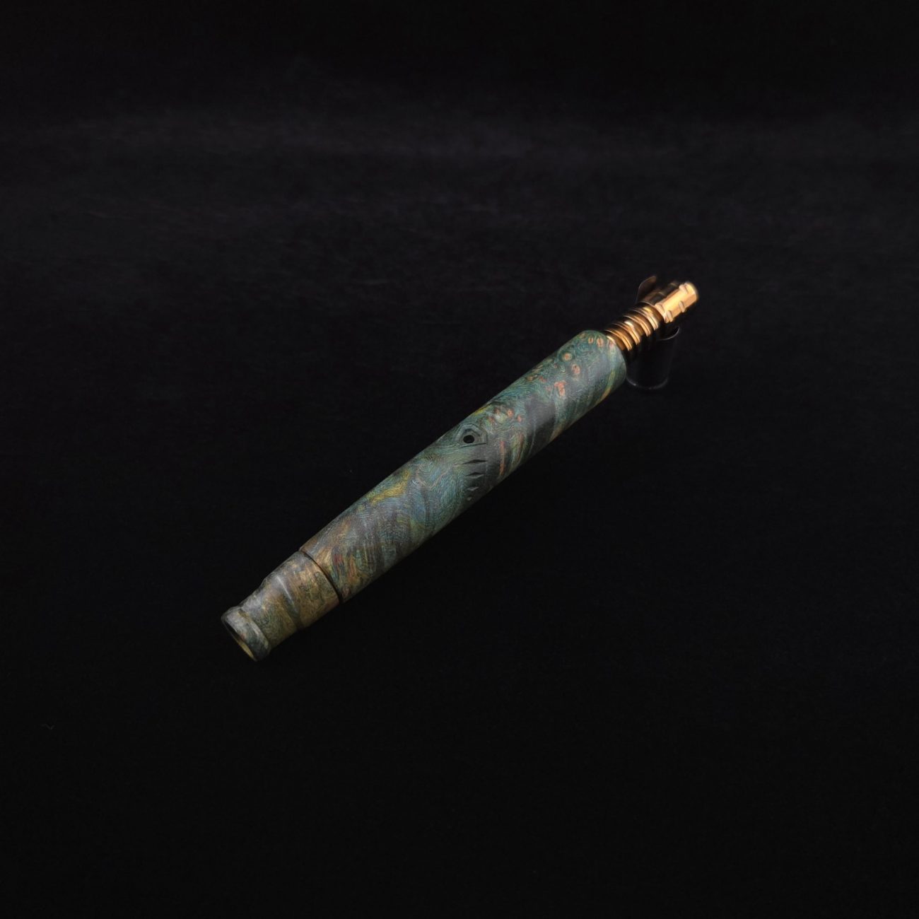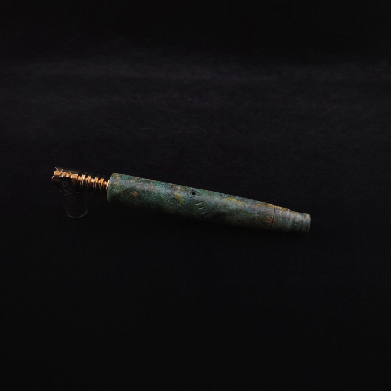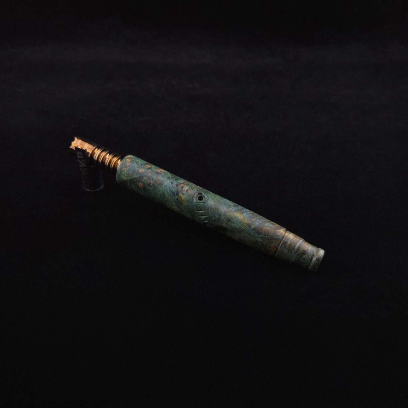 High quality and highly figured maple burl XL length stem for Dynavap components. Along with a specialty book-matched spinning mouthpiece. Cosmic burl coloring in vibrant blues and greens. This stem is our nova design with the straight blunt style taper design. Straight taper refers to 2/3 being straight cut and 1/3 having the taper cut at the mouthpiece end. This is a uniquely designed blunt stem having the nova diamond cut accent lines triangulated around the triangular air-port design drawing attention to the air-port. All of our stems function with or without mouthpiece attached. Stem has been finished with a smooth semi-gloss finish polishing and is all natural.