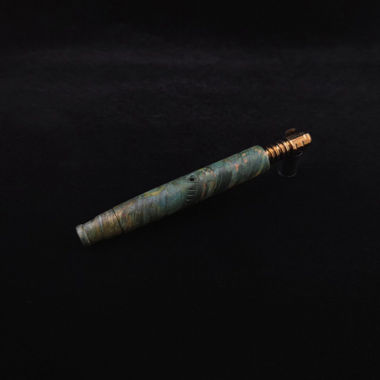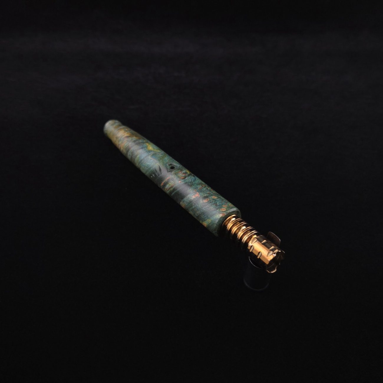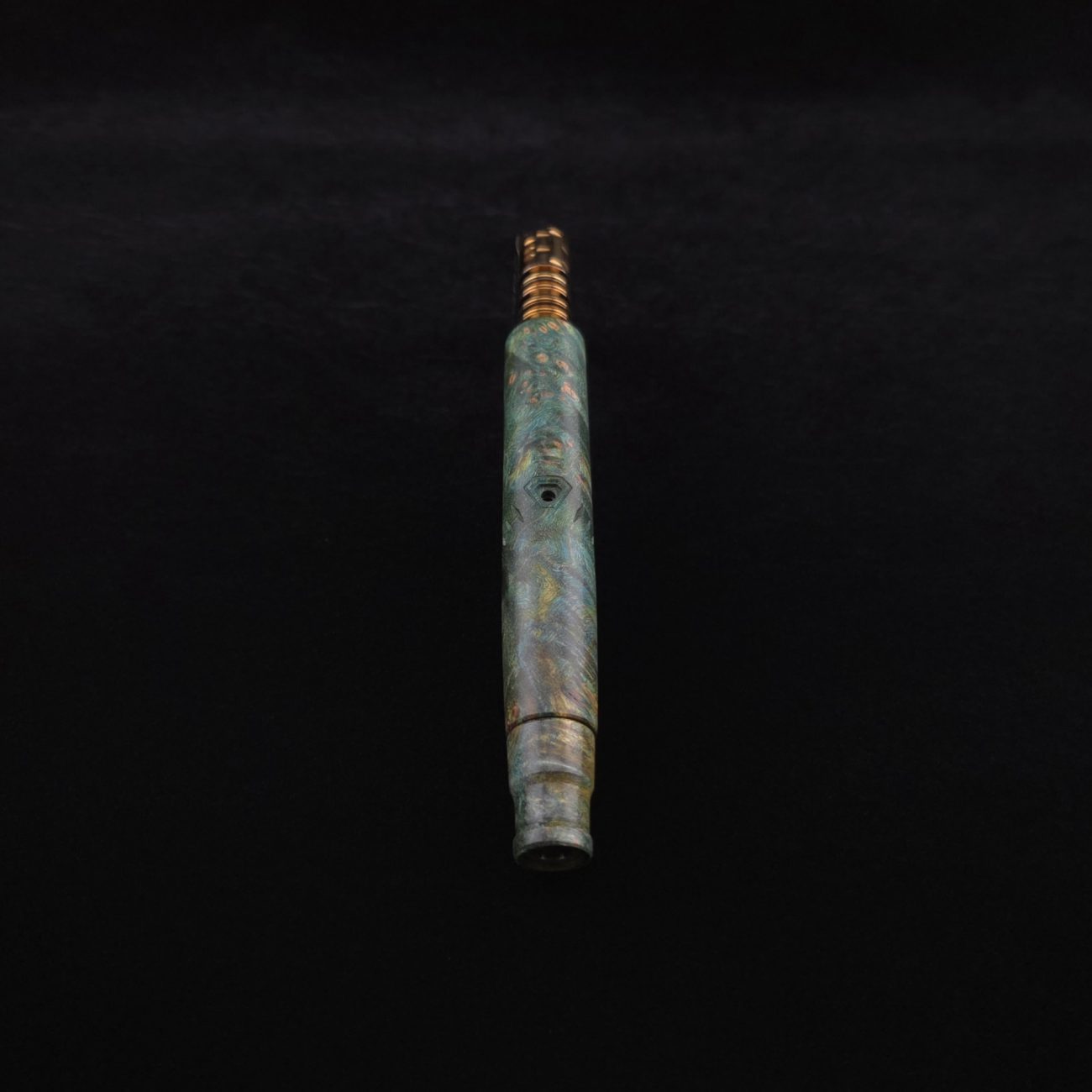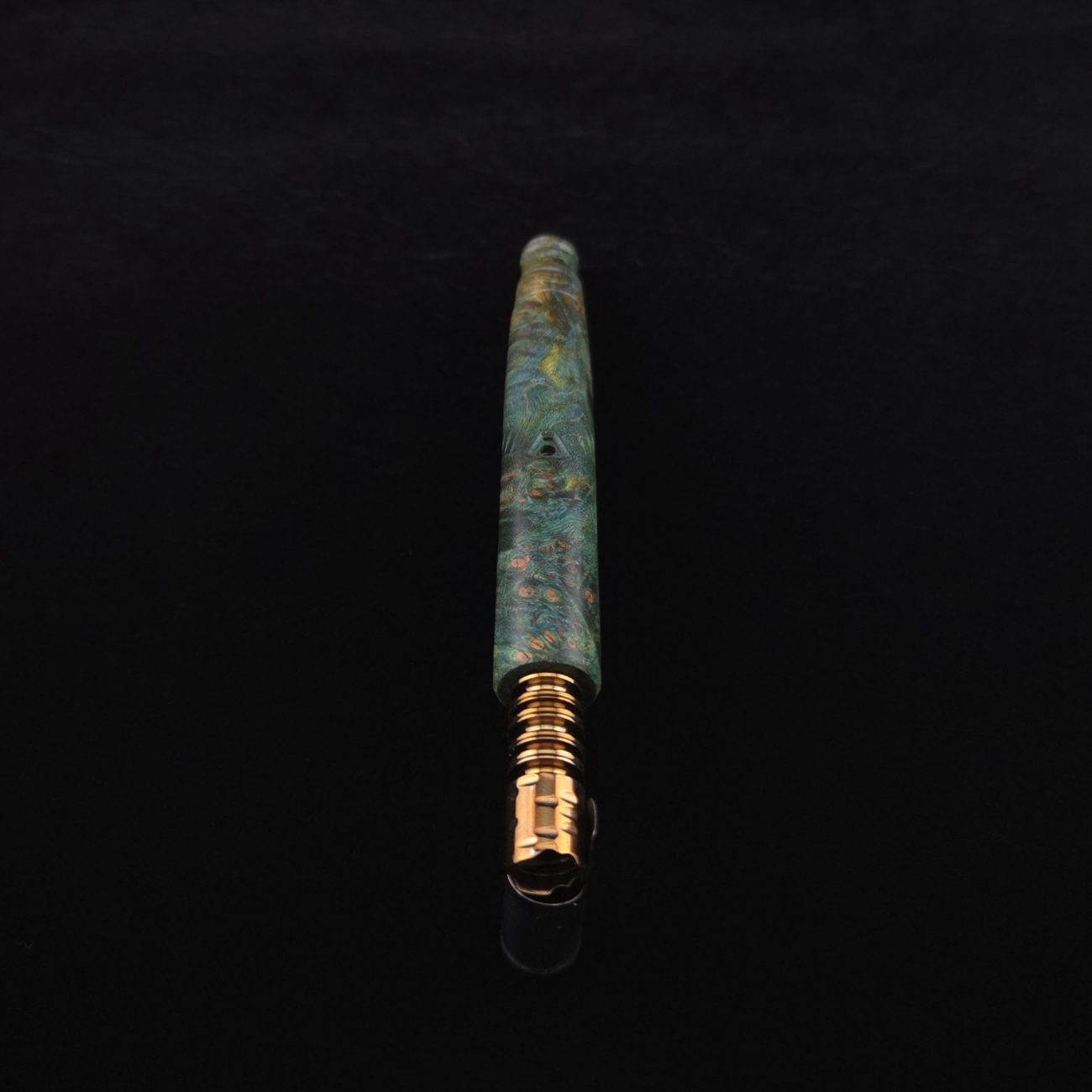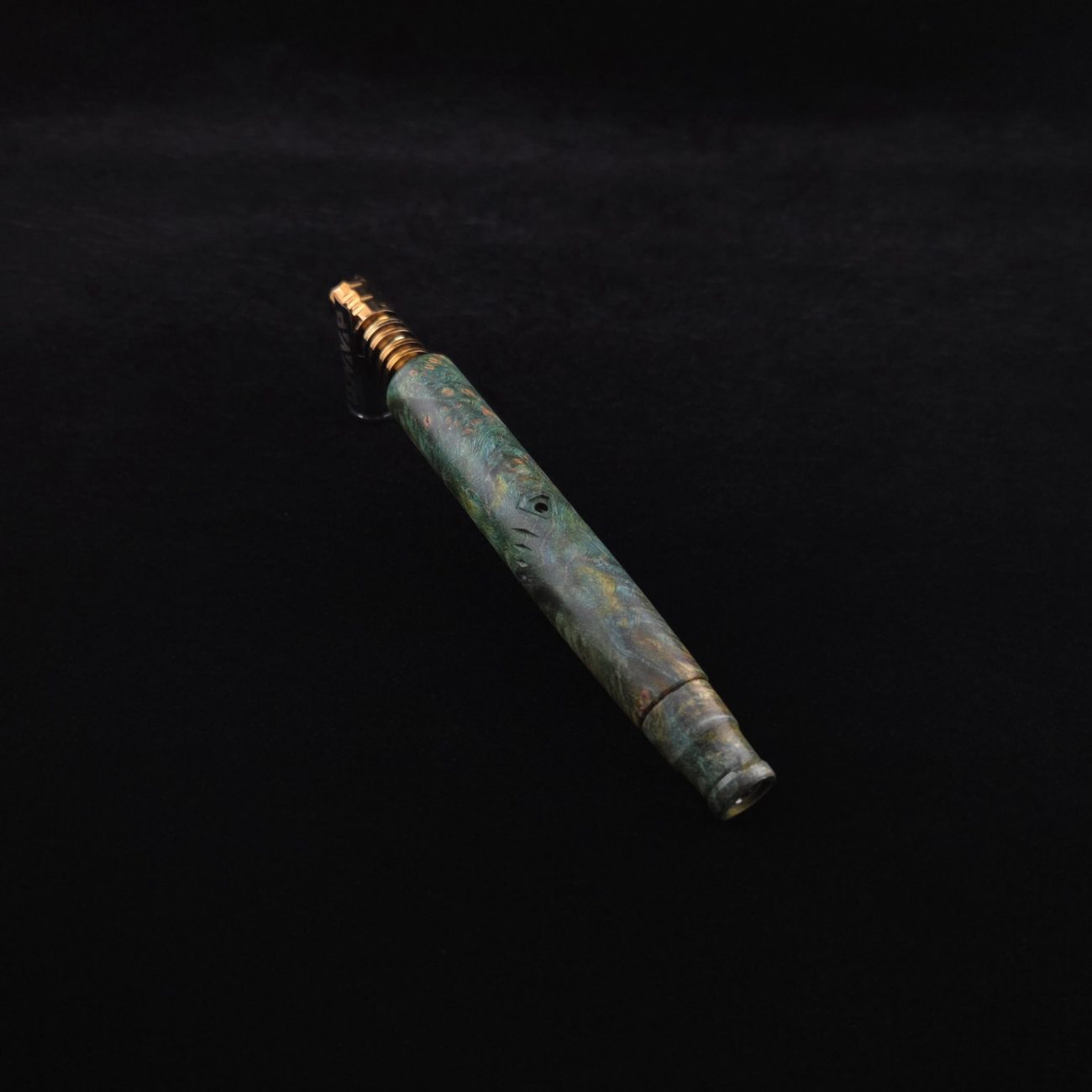 High quality and highly figured maple burl XL length stem for Dynavap components. Along with a specialty book-matched spinning mouthpiece. Cosmic burl coloring in vibrant blues and greens. This stem is our nova design with the straight blunt style taper design. Straight taper refers to 2/3 being straight cut and 1/3 having the taper cut at the mouthpiece end. This is a uniquely designed blunt stem having the nova diamond cut accent lines triangulated around the triangular air-port design drawing attention to the air-port. All of our stems function with or without mouthpiece attached. Stem has been finished with a smooth semi-gloss finish polishing and is all natural.