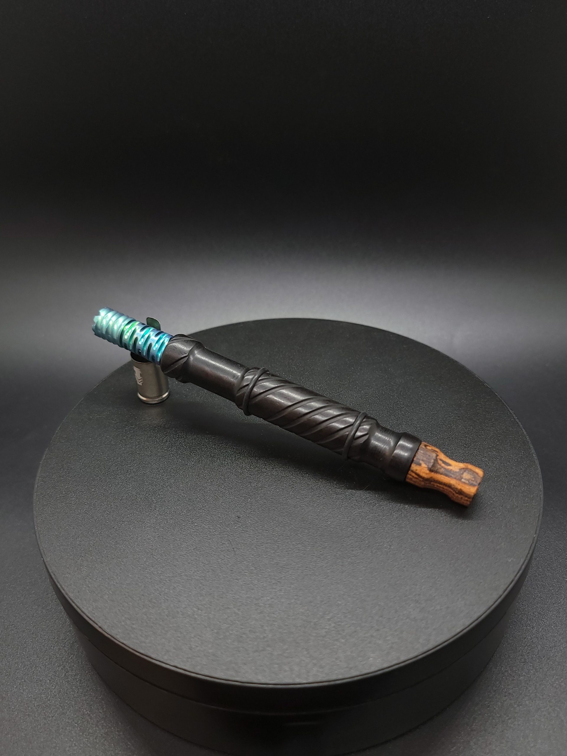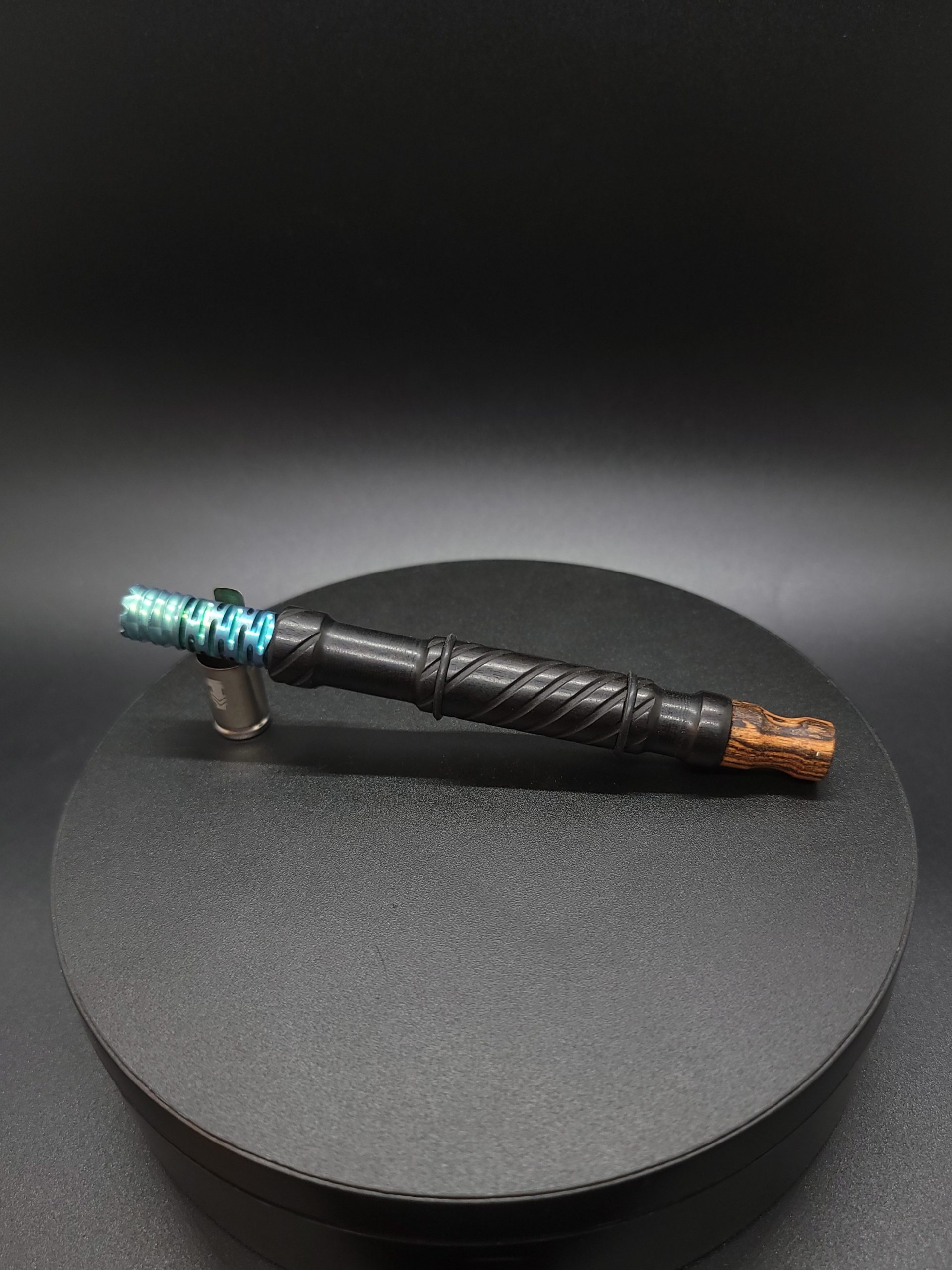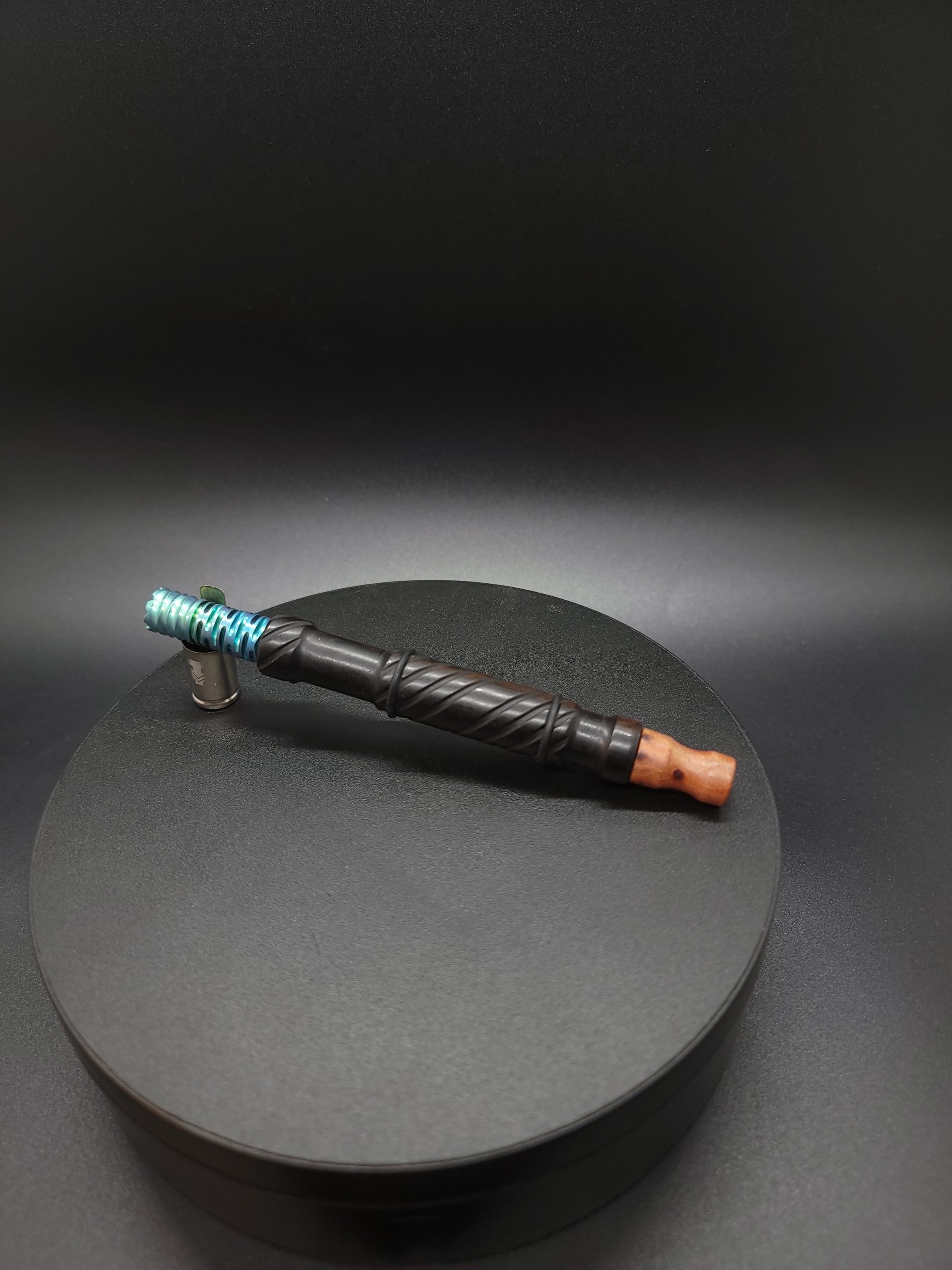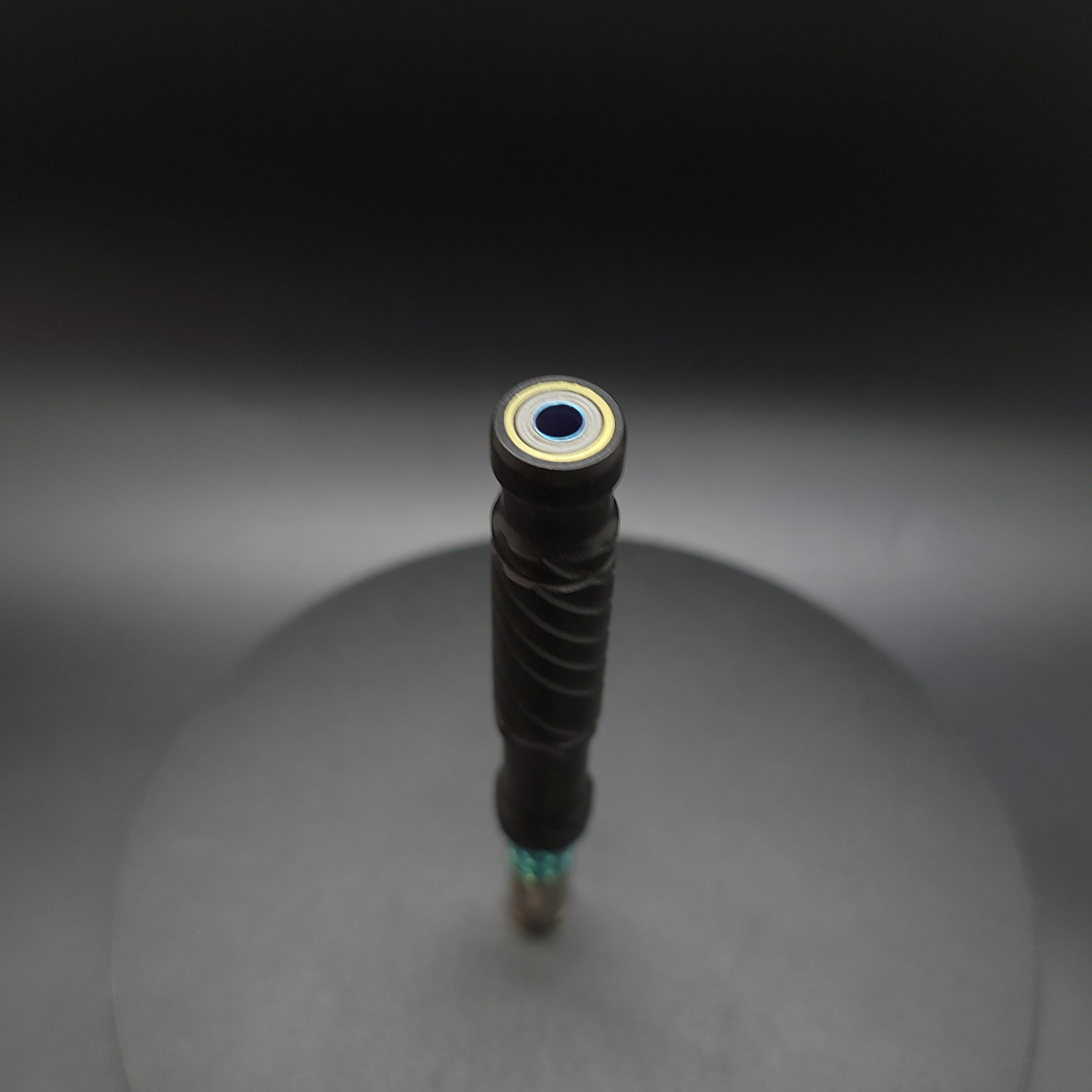 This midsection is made from high quality ebony wood. It has a precision drilled hole that’s been fitted with a gold anodized titanium core. This makes the stem perfectly compatible with the Dynavap parts as well as adding rigidity, making it feel nice when held. Once the stem is created it then gets sanded and polished using our nature based polish/waxes. Everything made in our shop is hand crafted.