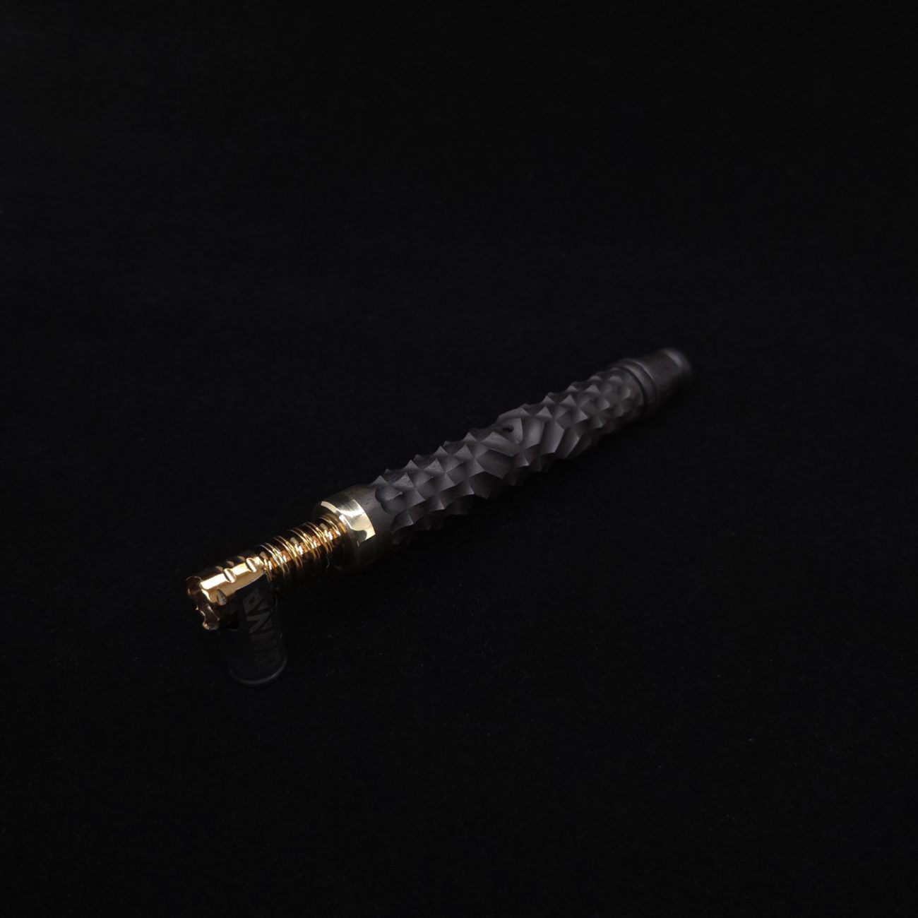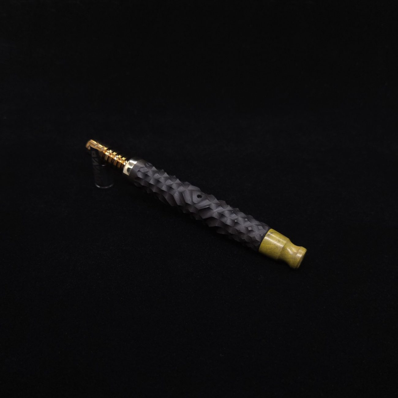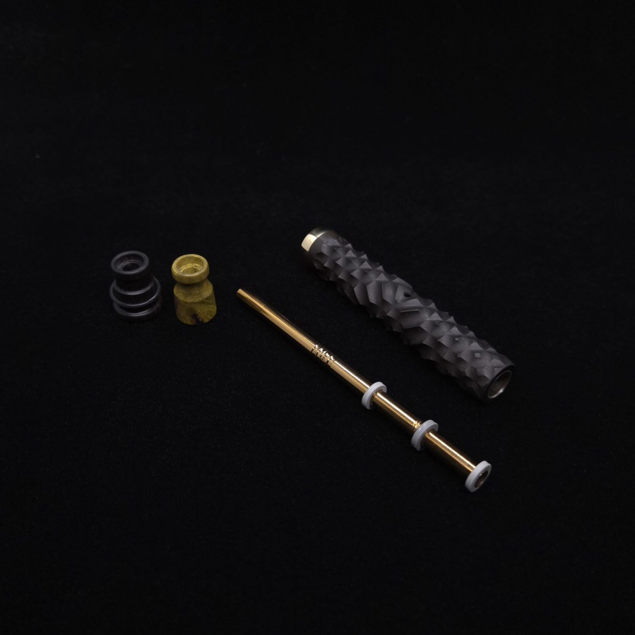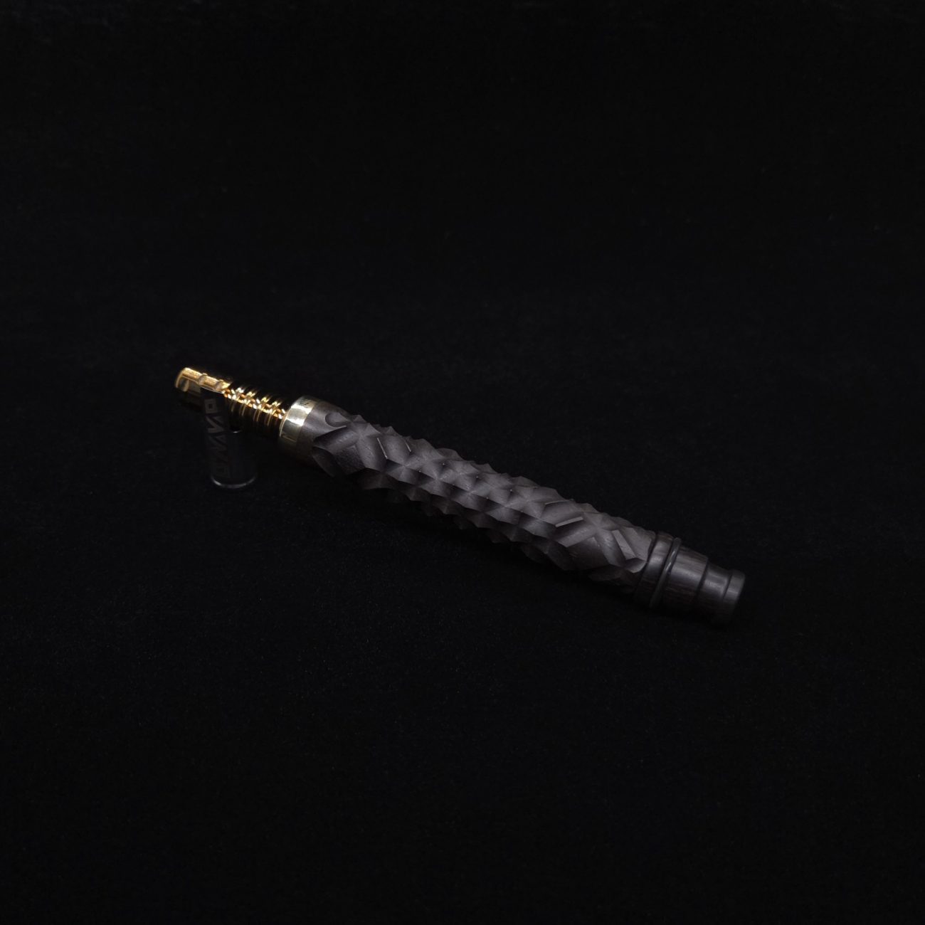 High quality pure black ebony wood XL length stem for Dynavap components. Along with the ebony reaper wpa adaptable mouthpiece as well as a second green buckeye burl m.p. done in our company colors…green/black. This is the high class design variation of our reapers spine stem that we’ve done as a special edition variant that has a 14.5mm brass color at the tip, making it truly high class and unique. Beyond aesthetics, the collar will take on some of the heat transfer, keeping your fingers cool on those occaional high heat sessions. The gold anodized med grade stainless steel condenser has the same o-rings and spaced grooves as the Dynavap titanium xl condenser, but does have a total of 6 grooves where the larger middle o-ring goes. It also matches the gold colored brass collar nicely. This is to allow for any length differences there may be in any mouthpiece you use. That way it will fit snug no matter the m.p. you use. This condenser differs from the XL Dynavap condenser in that when using the mouthpiece it will reach all the way to the inside of the Dynavap tip, making for a stronger draw from the tip to the mouthpiece. Mouthpiece has an o-ring groove where you attach one of the included o-rings for use with a wpa. This is also another of our stem designs that has an amazing detailed complex cut that’s usually reserved for metal, but we’ve applied it to certain wood/resin stems that can hold such detailed cuts. The design has pointed sections cut in across the length of the stem with the concave airport centered and easy to locate. All of our stems do function with or without mouthpiece attached. You do have the option of using any Dynavap condenser as well. Stem has been finished with a satin finish polishing and is all natural.